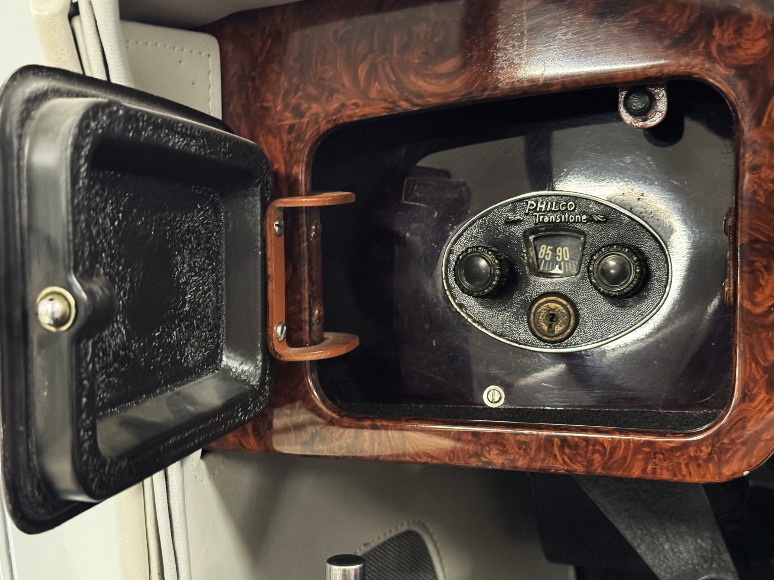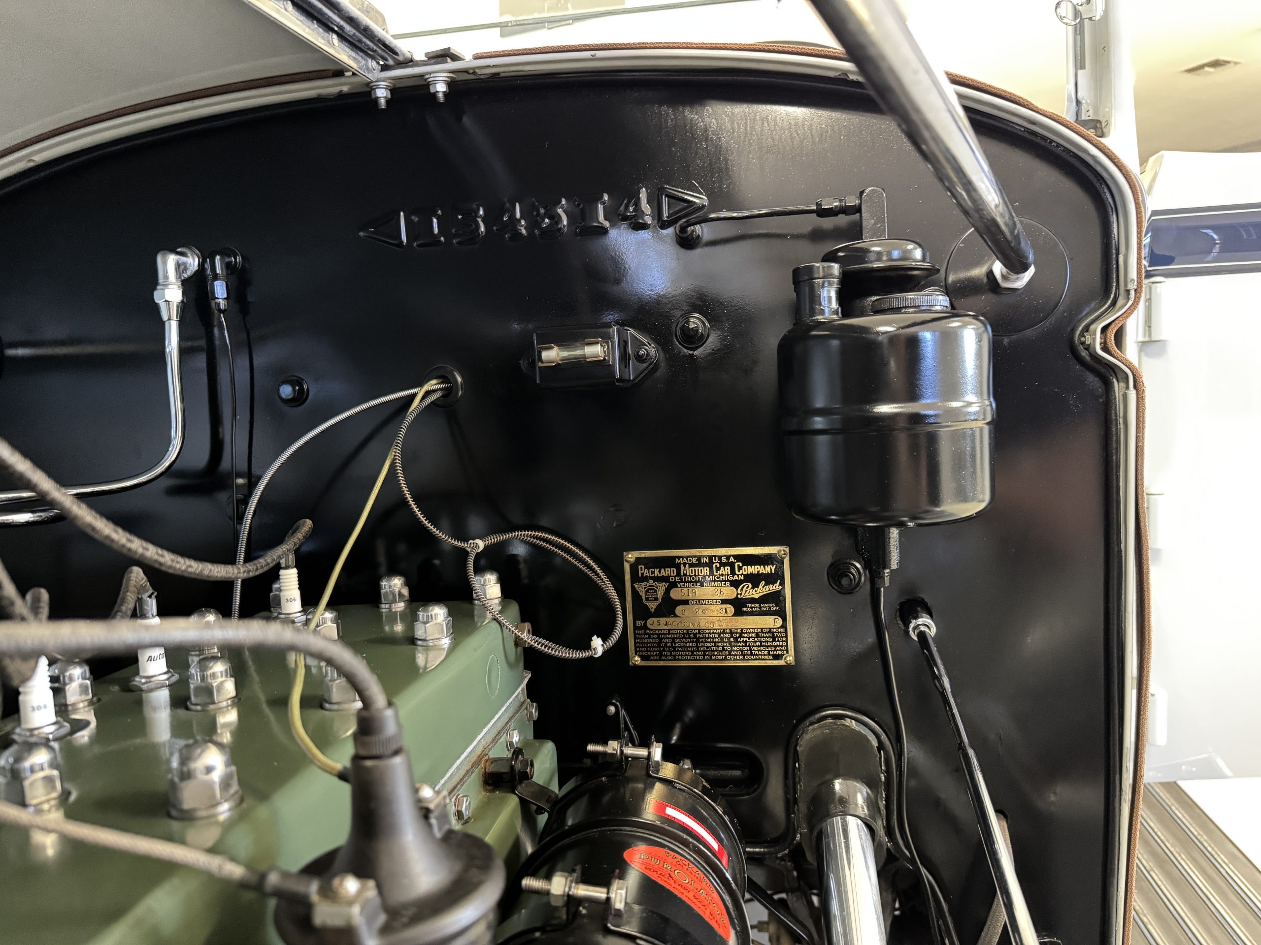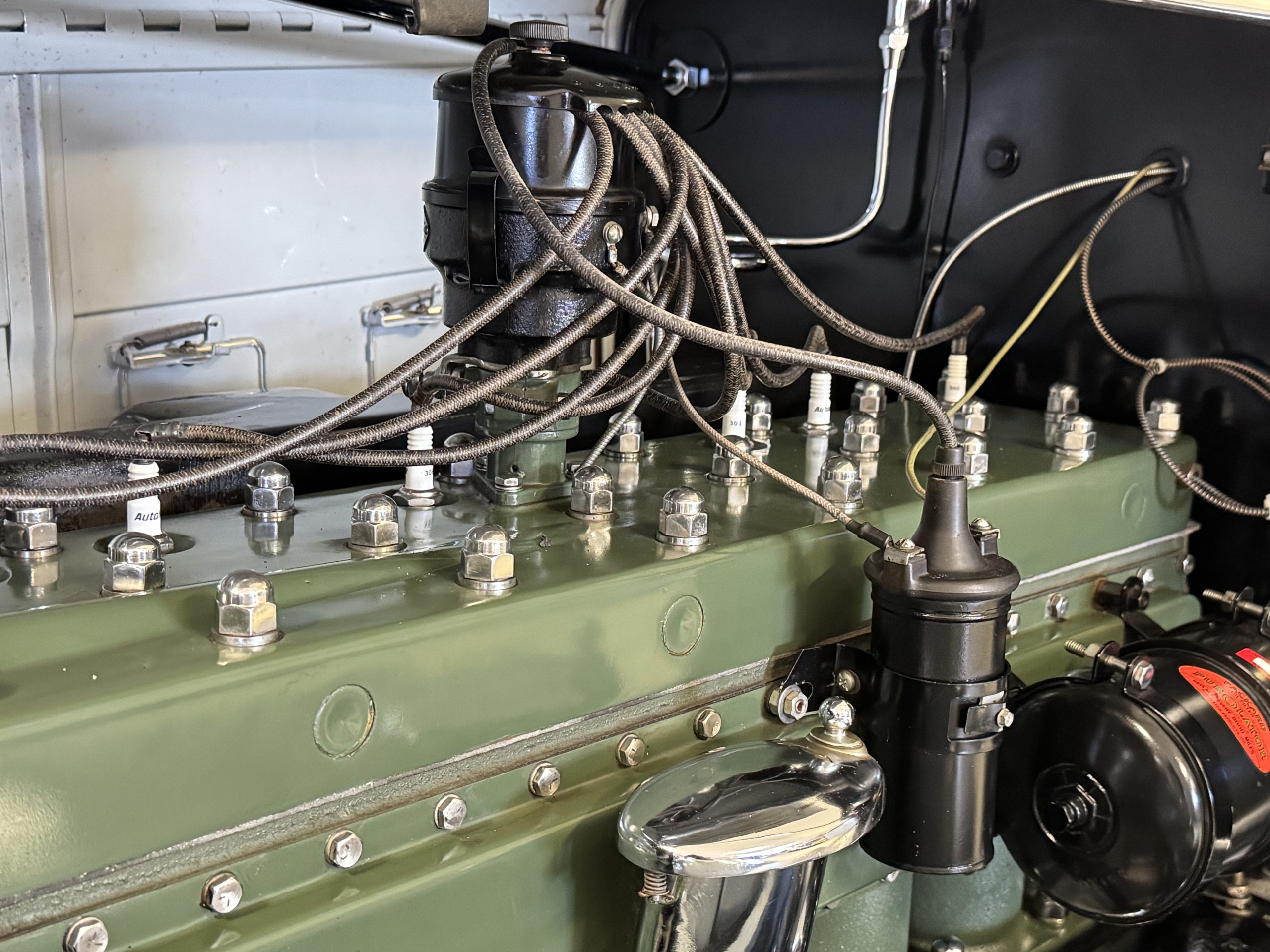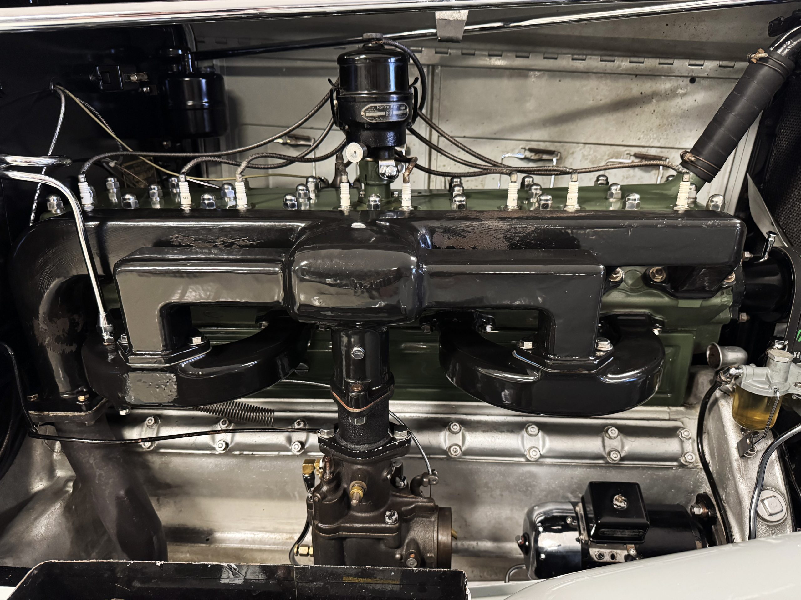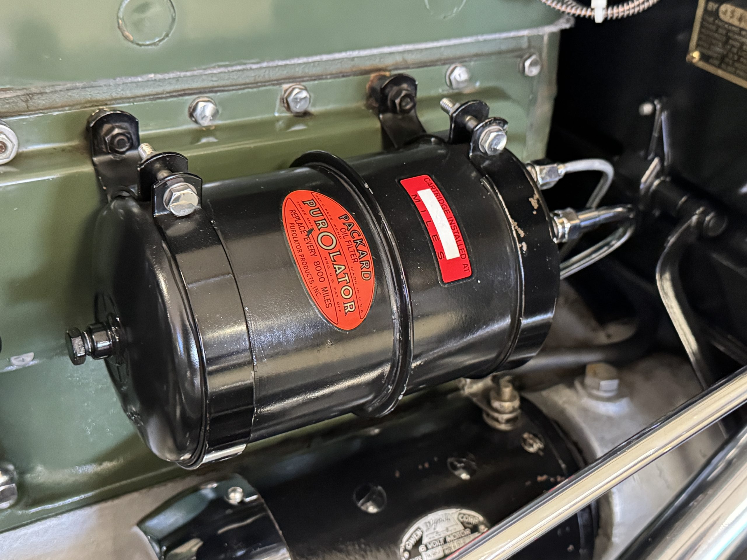 Power is supplied by Packard’s 384.8 cubic inch L-head inline eight-cylinder engine, delivering 135 horsepower through a four-speed manual transmission. The Packard drives really well with plenty of power, smooth shifting and comfortable suspension. The 903 chassis features vacuum-assisted clutch, adjustable ride control, and four-wheel mechanical drum brakes, technological innovations that made the Deluxe Eight one of the most advanced American cars of its time. With a 142⅛-inch wheelbase, the Packard delivers a remarkably smooth and composed ride. Recent servicing in September 2025 included a new battery, spark plugs, fuel pump, filter, and line, along with a tank cleaning, ensuring reliable operation.
