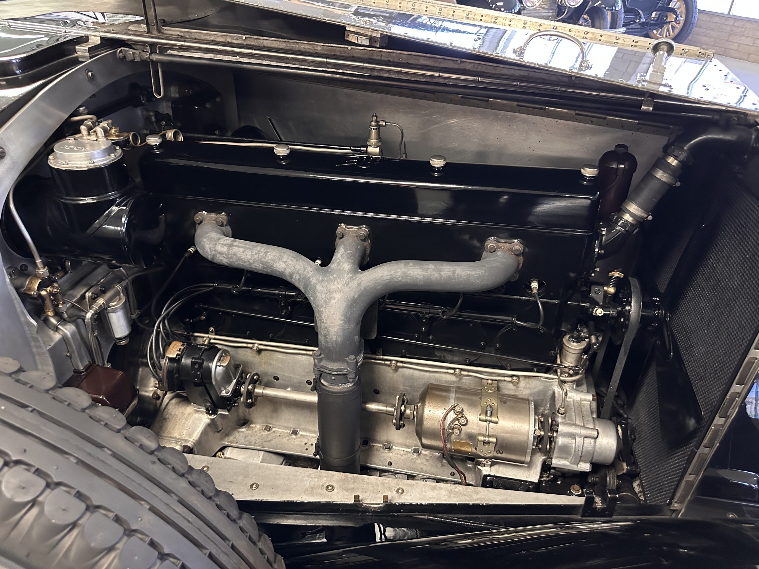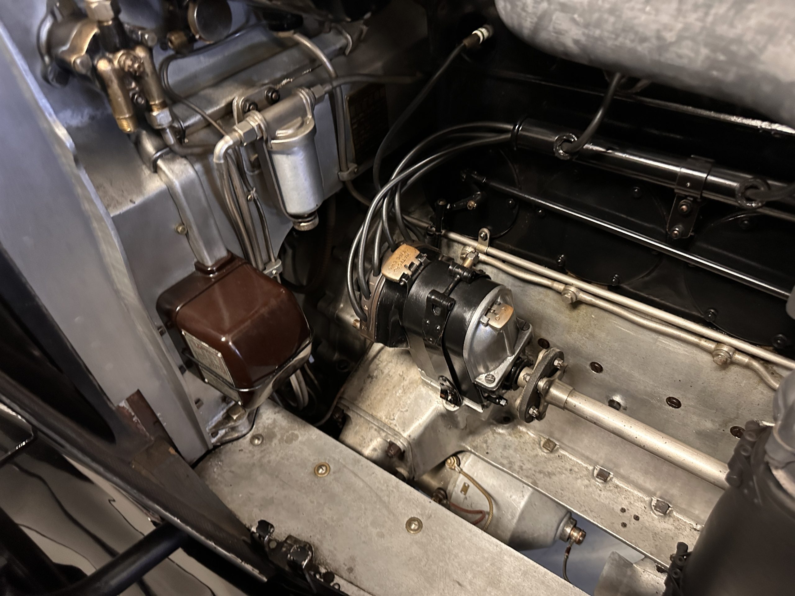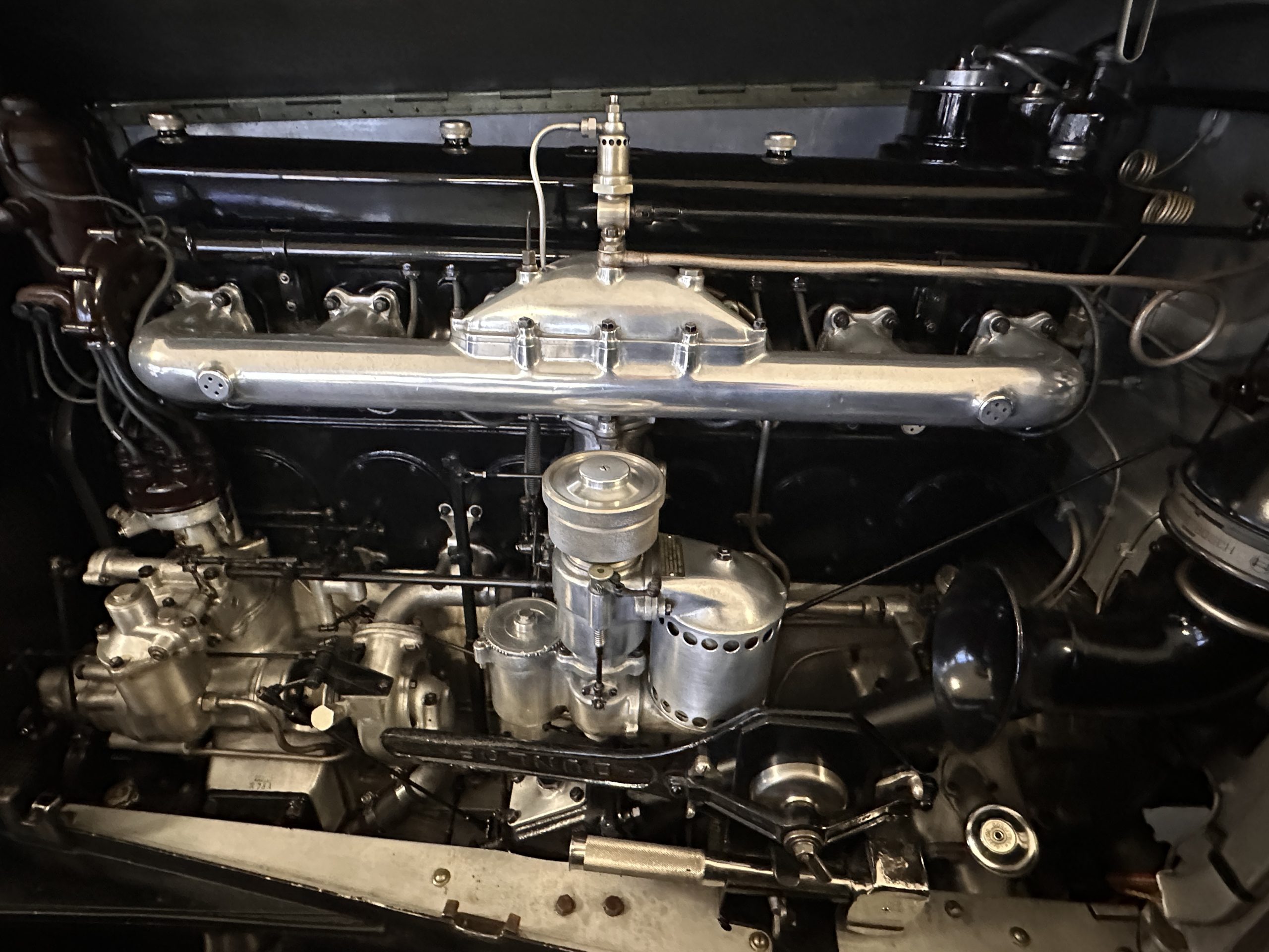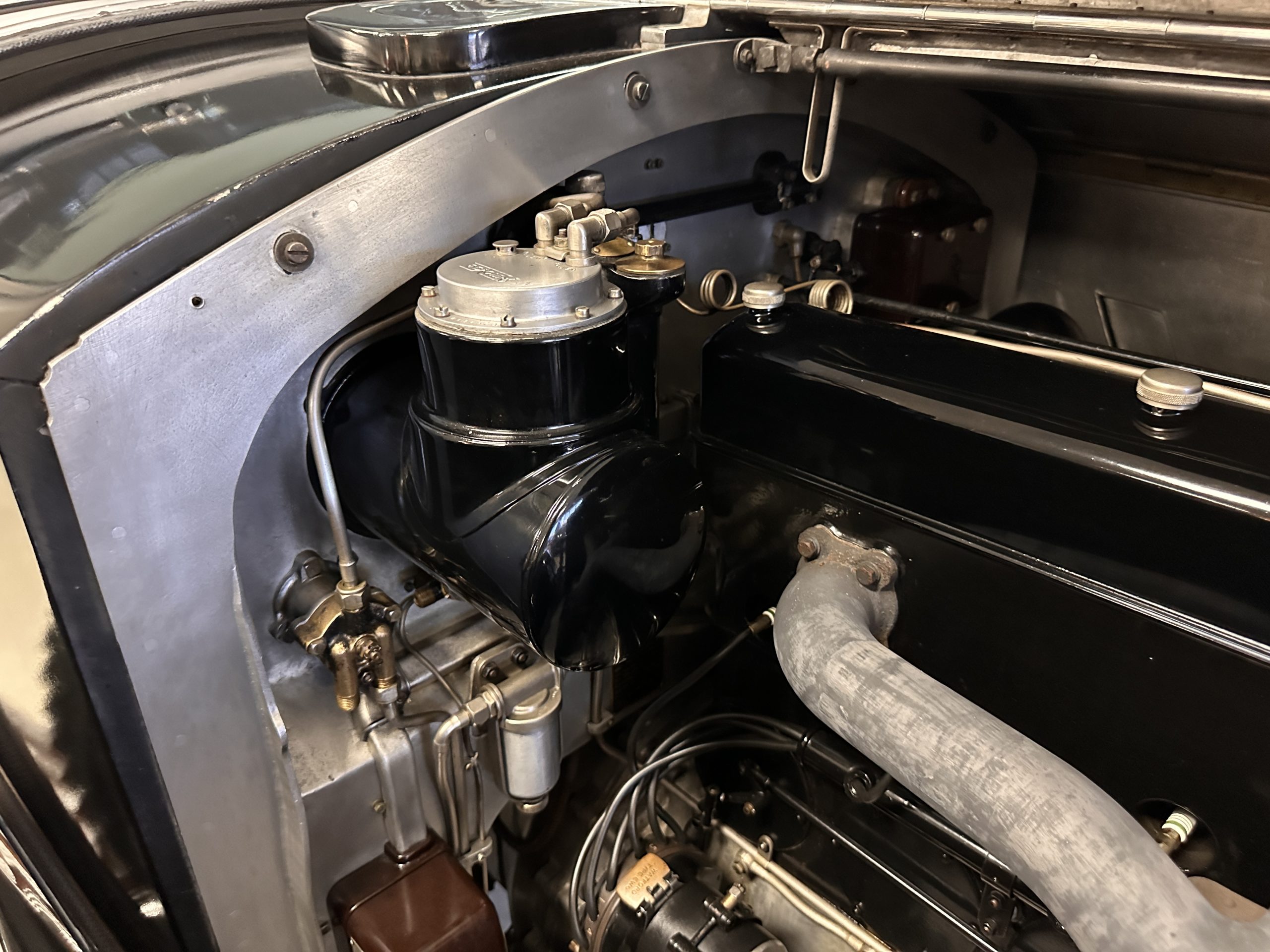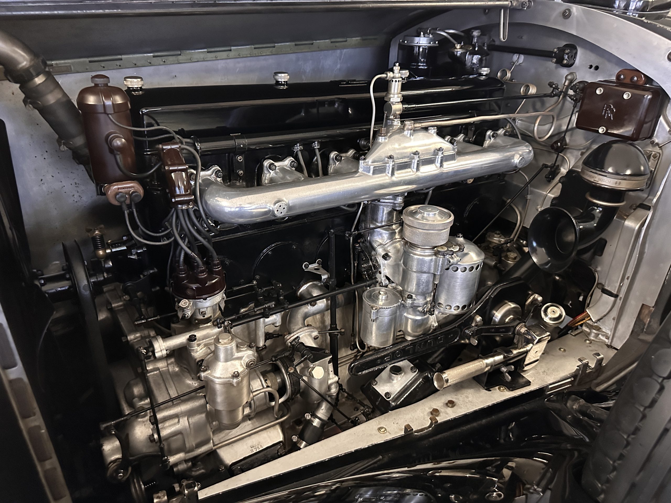The engine compartment is home to the massive 7.7 liter inline-six engine that is the ultimate of refinement. This is the original engine (No. R75A) with matching numbered components. The later AJS Series engine delivered smoother power and better performance and is coupled with a four-speed manual transmission, which includes synchromesh on third and fourth gears. The engine compartment is beautifully detailed and includes the Dunlap wheel wrench and hammer. The drivetrain is quiet and powerful and performed well even in the 100-degree Fahrenheit weather in Phoenix.