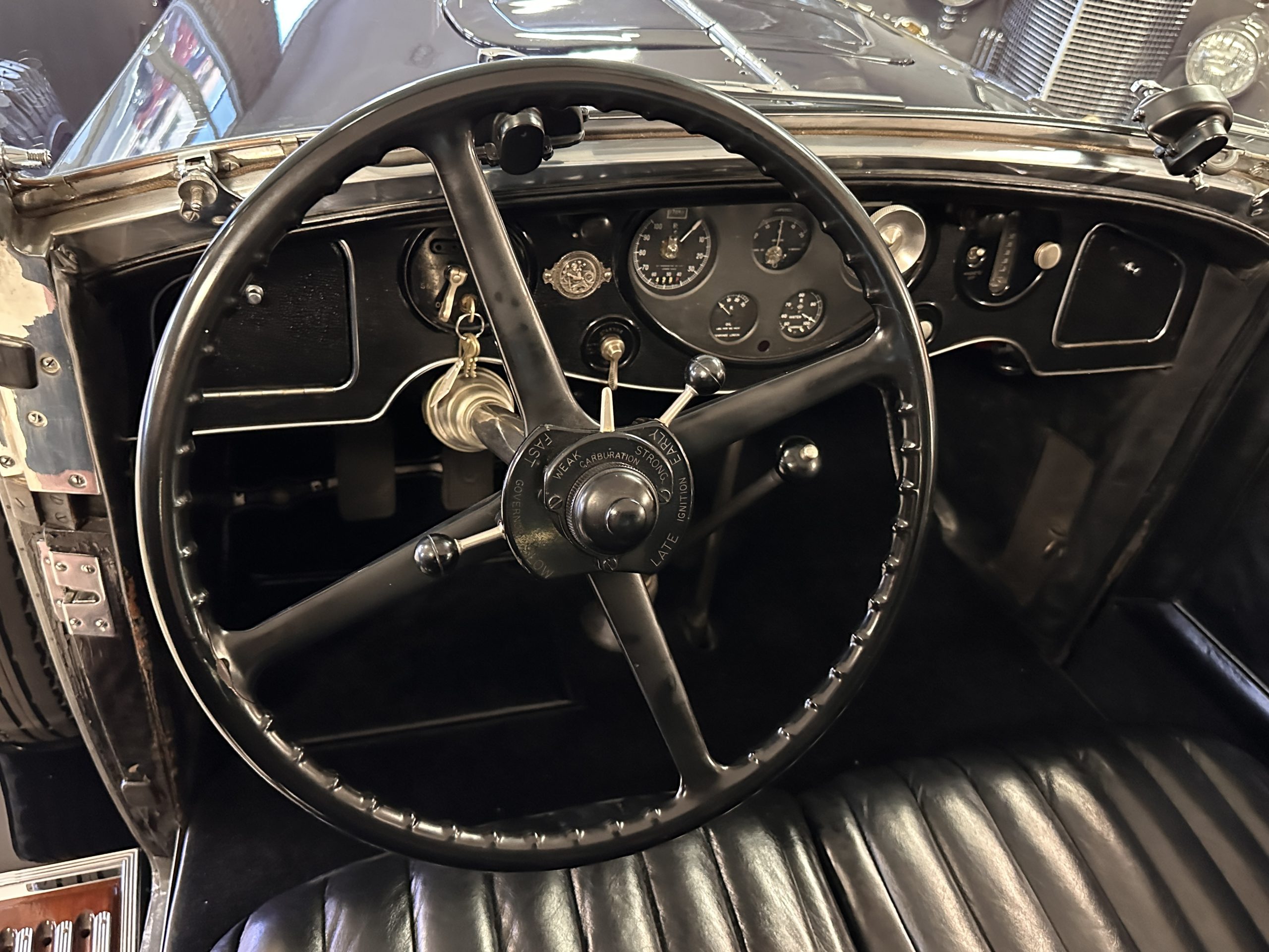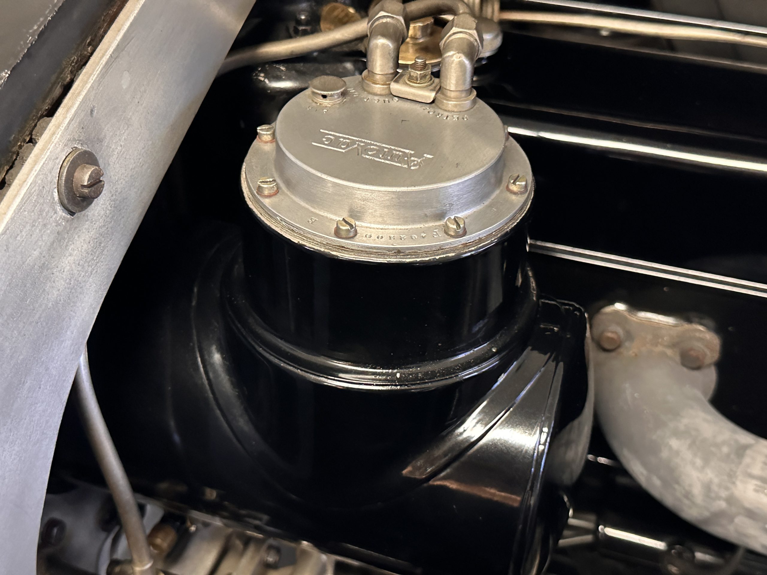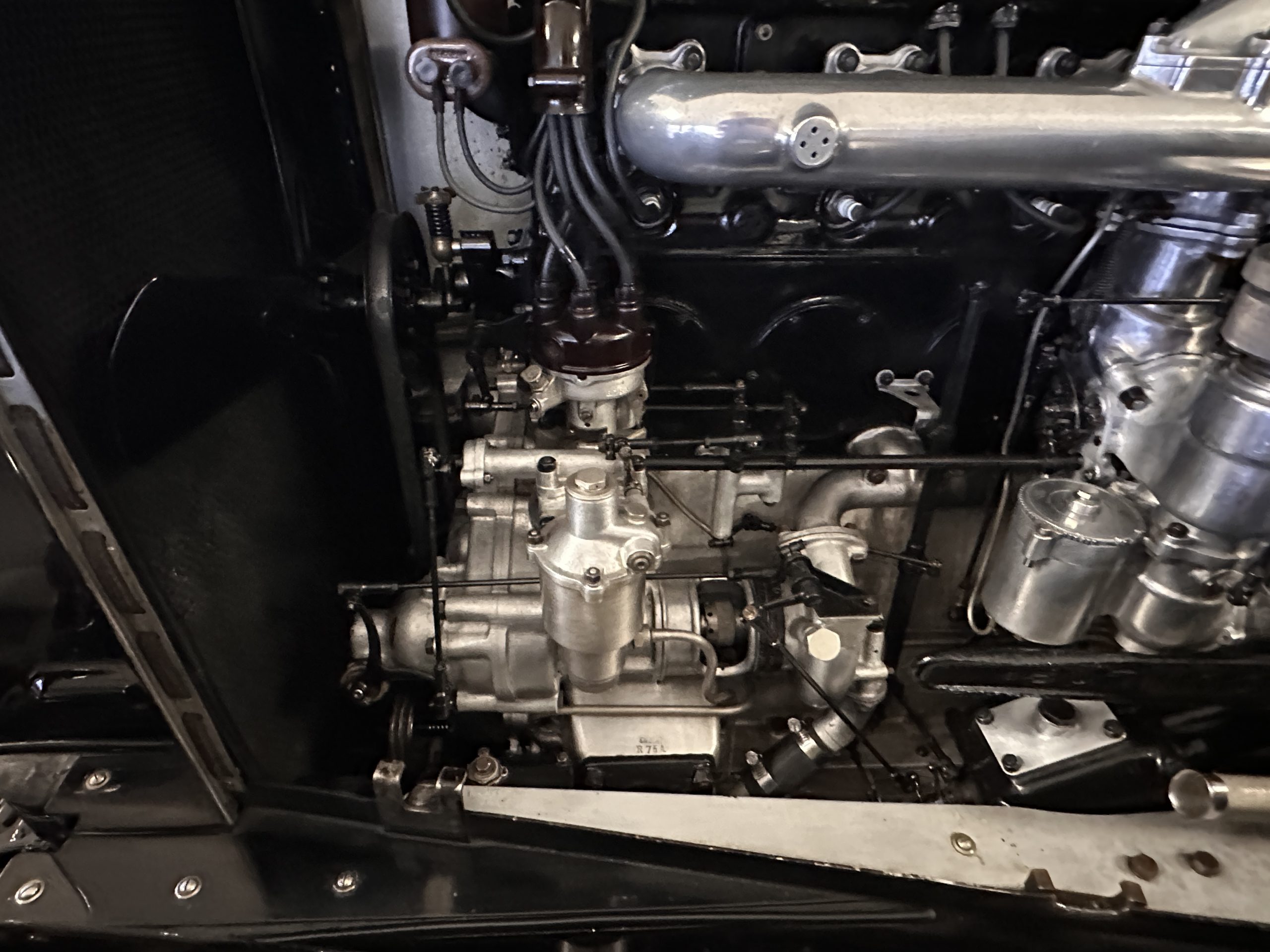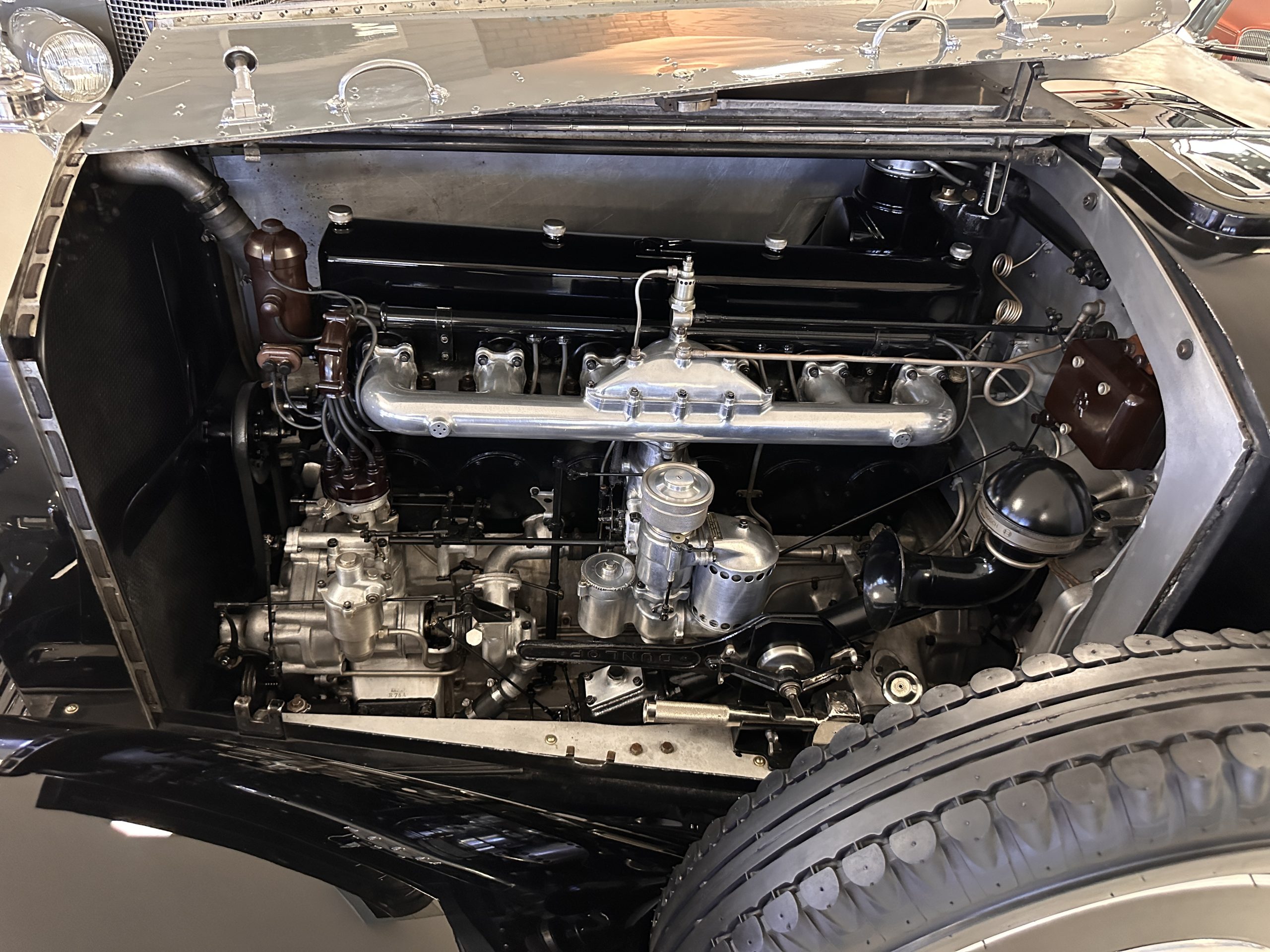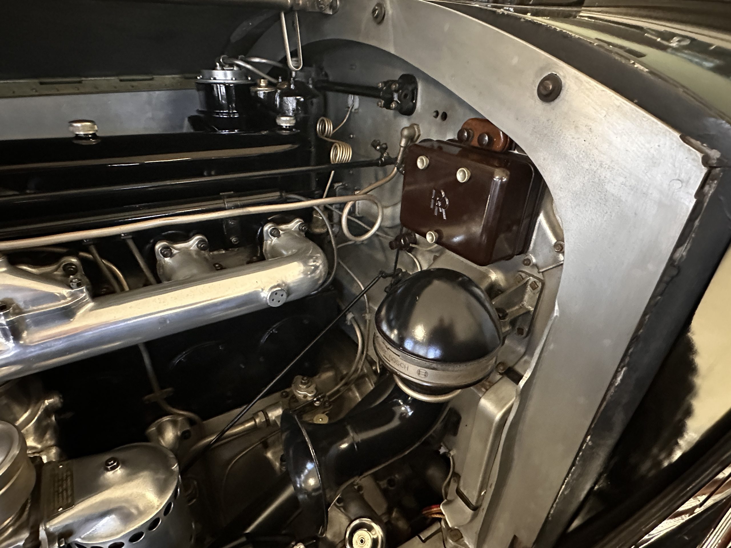 The engine compartment is home to the massive 7.7 liter inline-six engine that is the ultimate of refinement. This is the original engine (No. R75A) with matching numbered components. The later AJS Series engine delivered smoother power and better performance and is coupled with a four-speed manual transmission, which includes synchromesh on third and fourth gears. The engine compartment is beautifully detailed and includes the Dunlap wheel wrench and hammer. The drivetrain is quiet and powerful and performed well even in the 100-degree Fahrenheit weather in Phoenix.