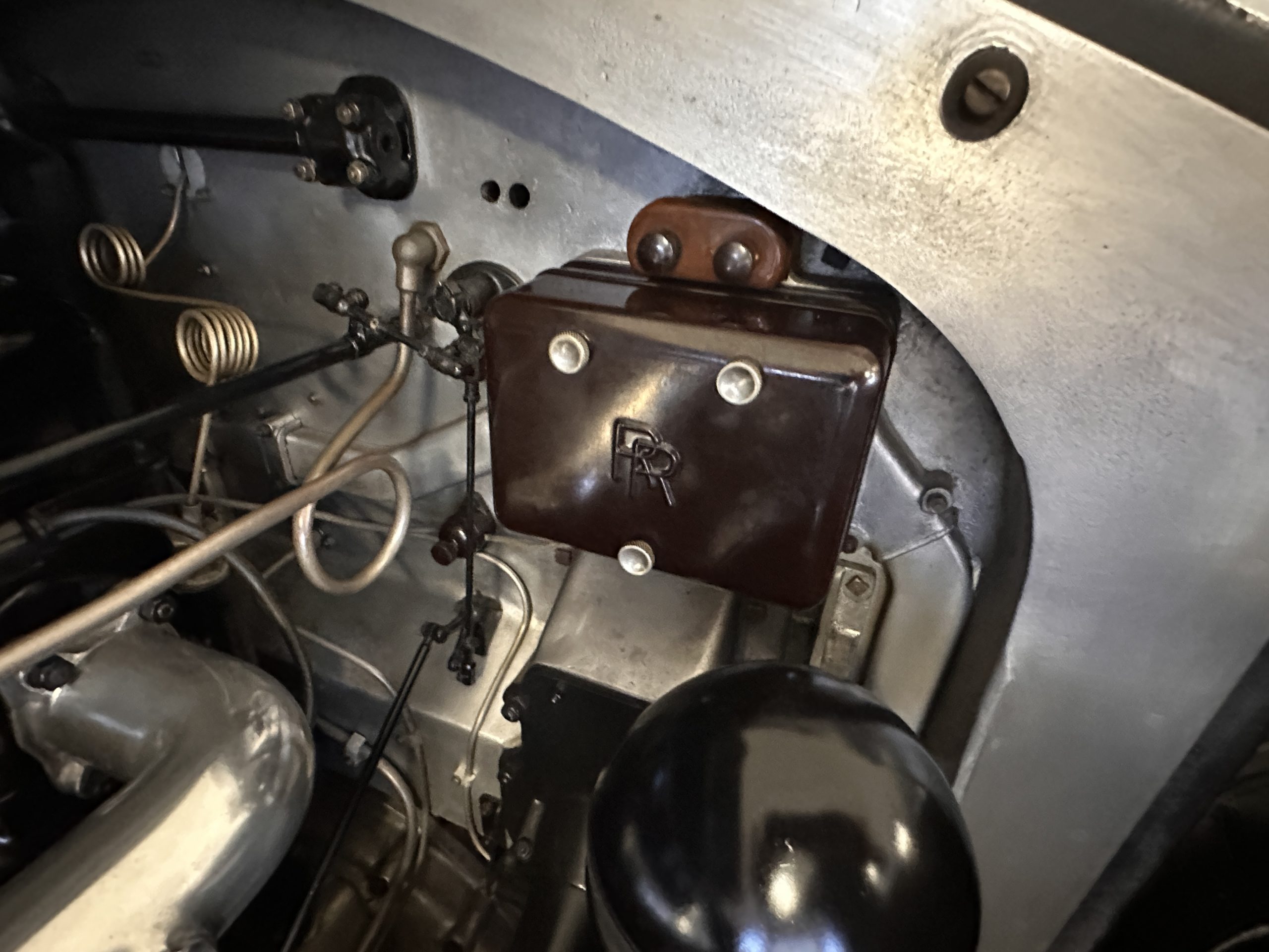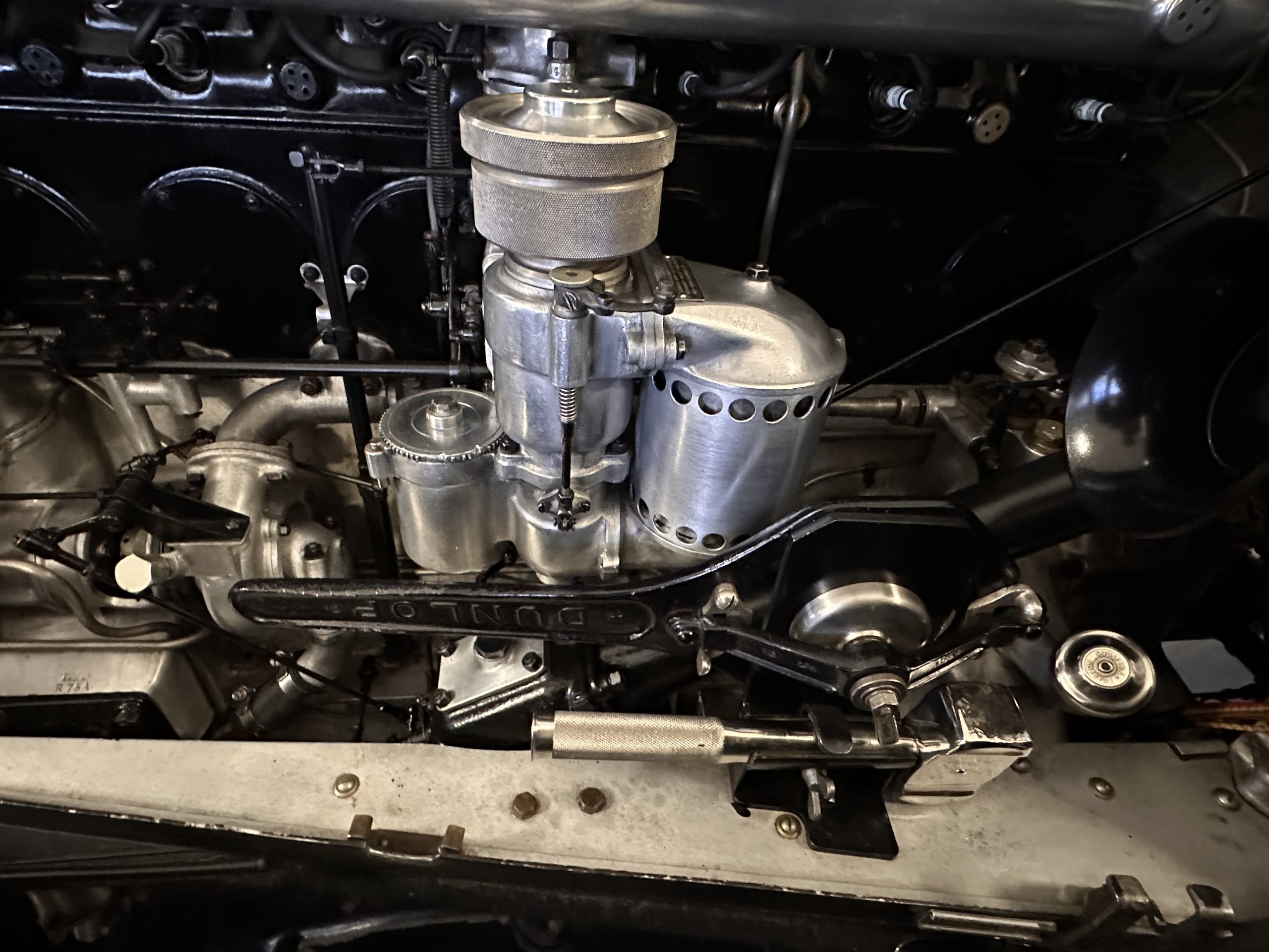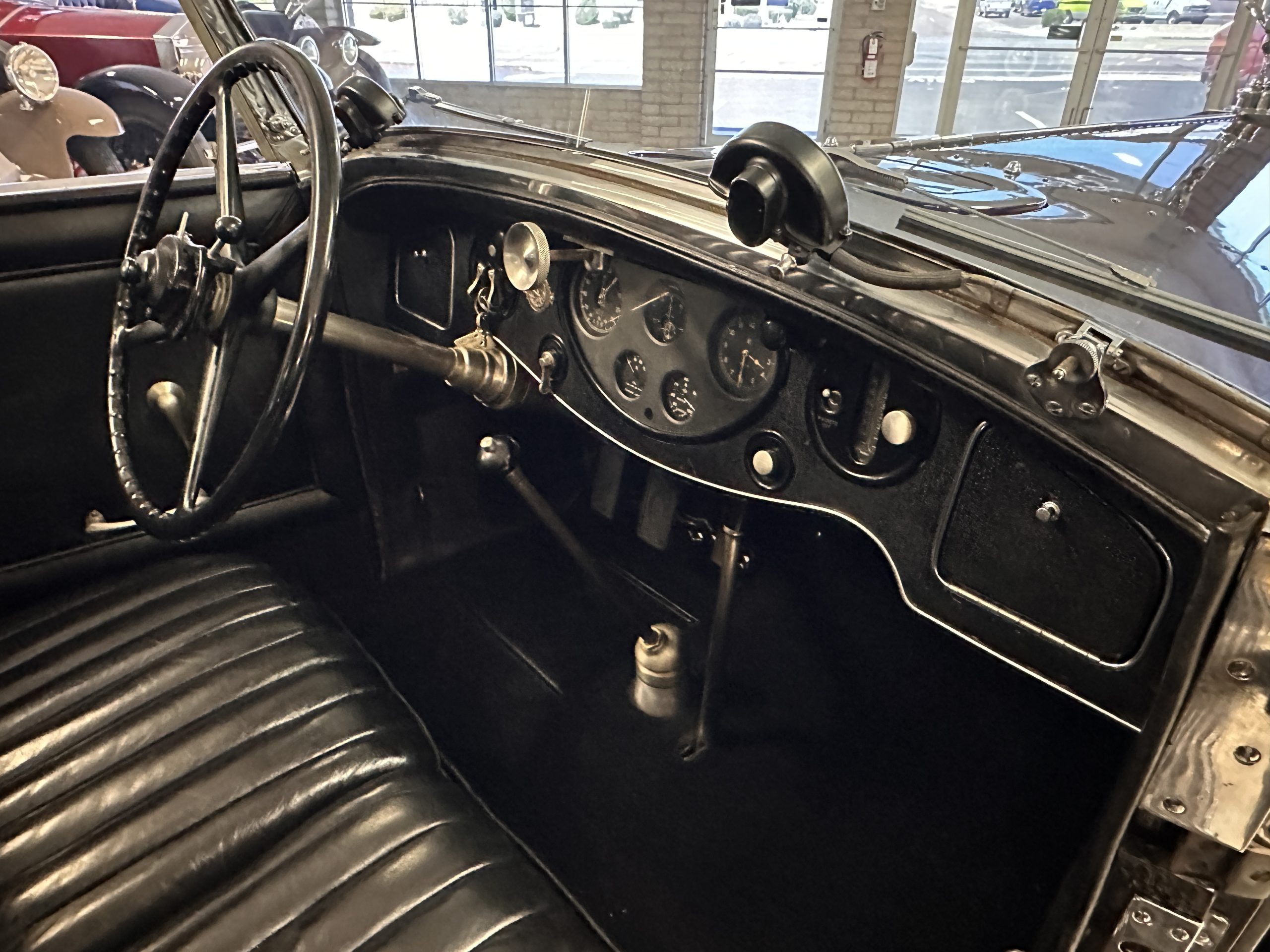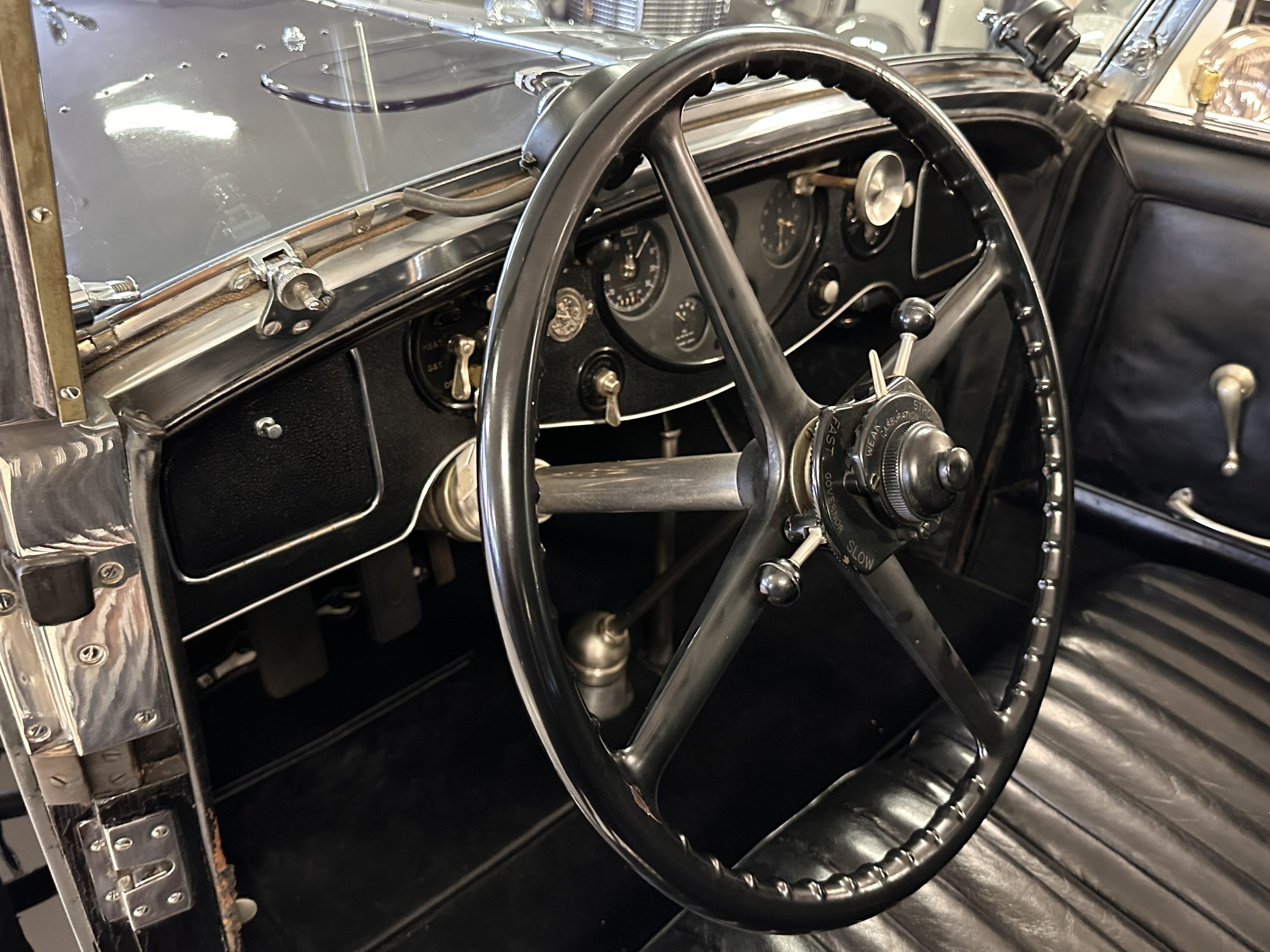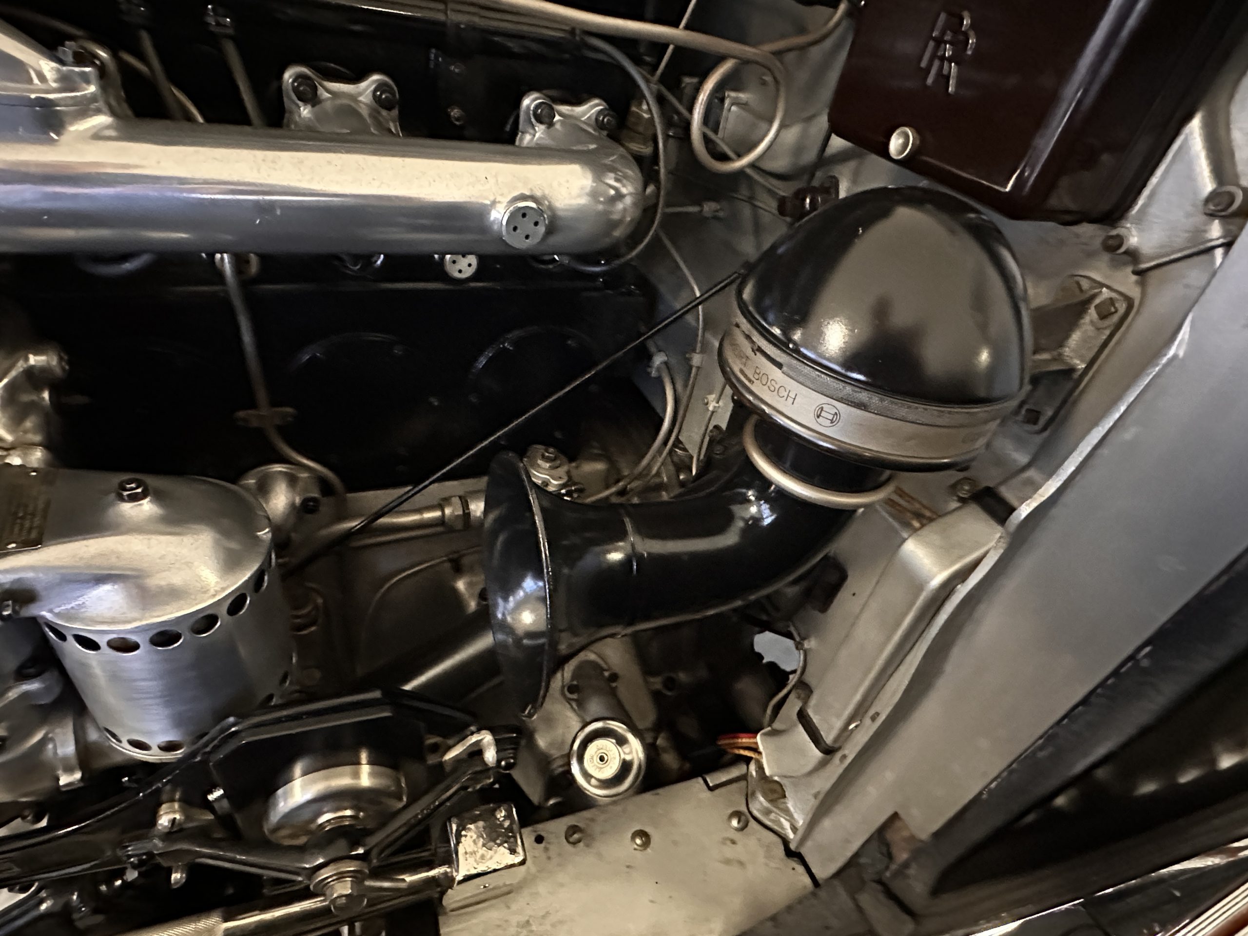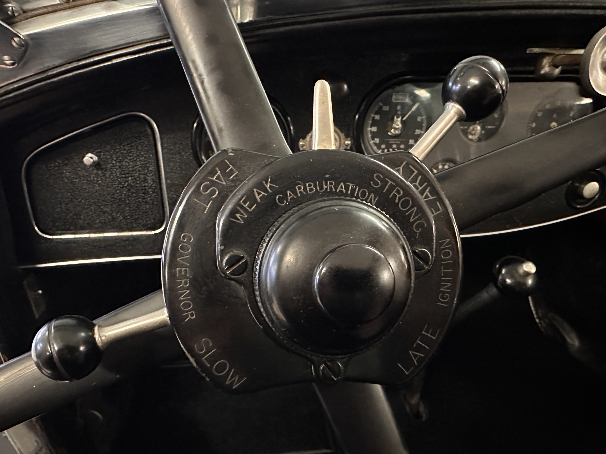 The engine compartment is home to the massive 7.7 liter inline-six engine that is the ultimate of refinement. This is the original engine (No. R75A) with matching numbered components. The later AJS Series engine delivered smoother power and better performance and is coupled with a four-speed manual transmission, which includes synchromesh on third and fourth gears. The engine compartment is beautifully detailed and includes the Dunlap wheel wrench and hammer. The drivetrain is quiet and powerful and performed well even in the 100-degree Fahrenheit weather in Phoenix.