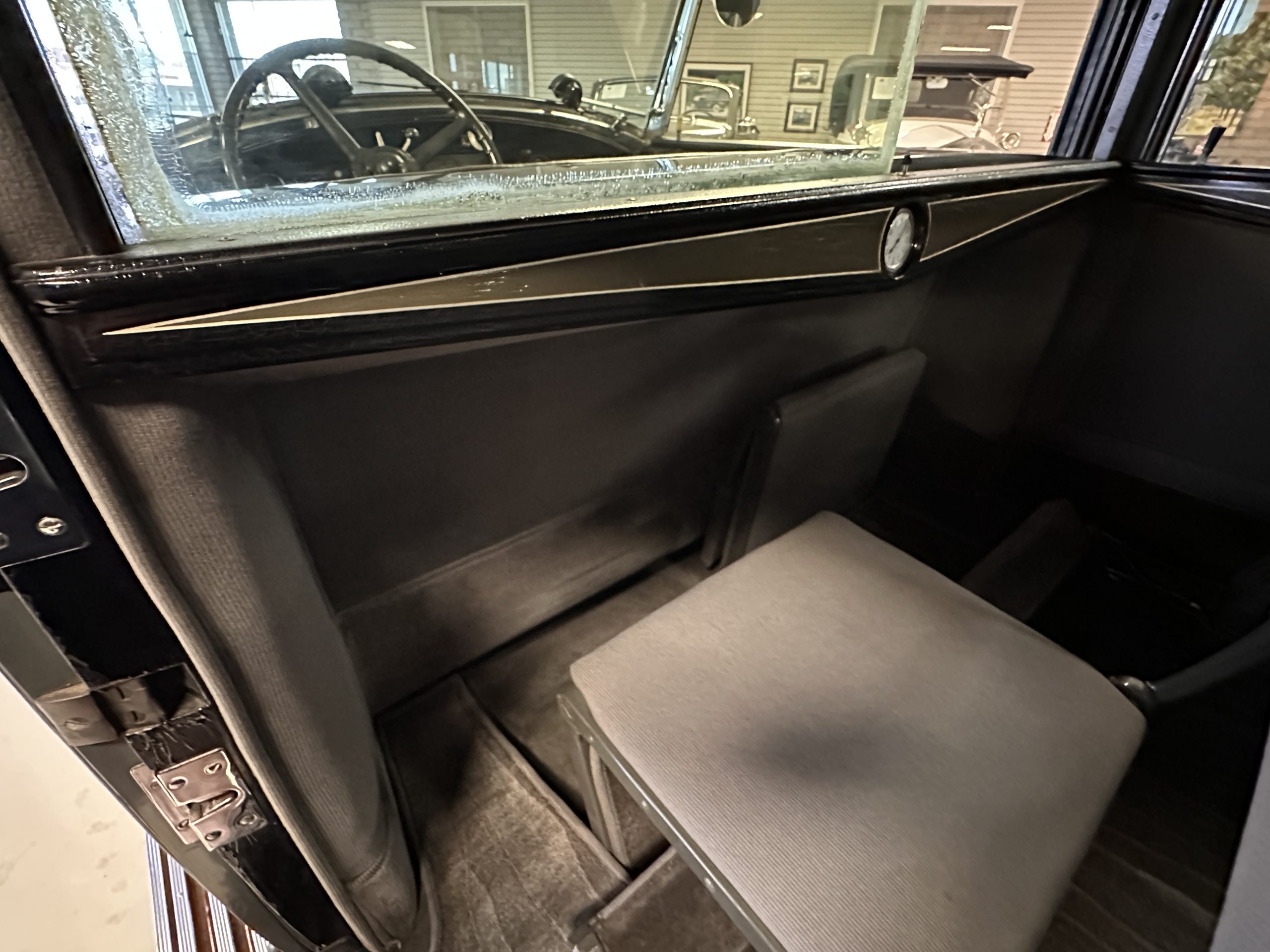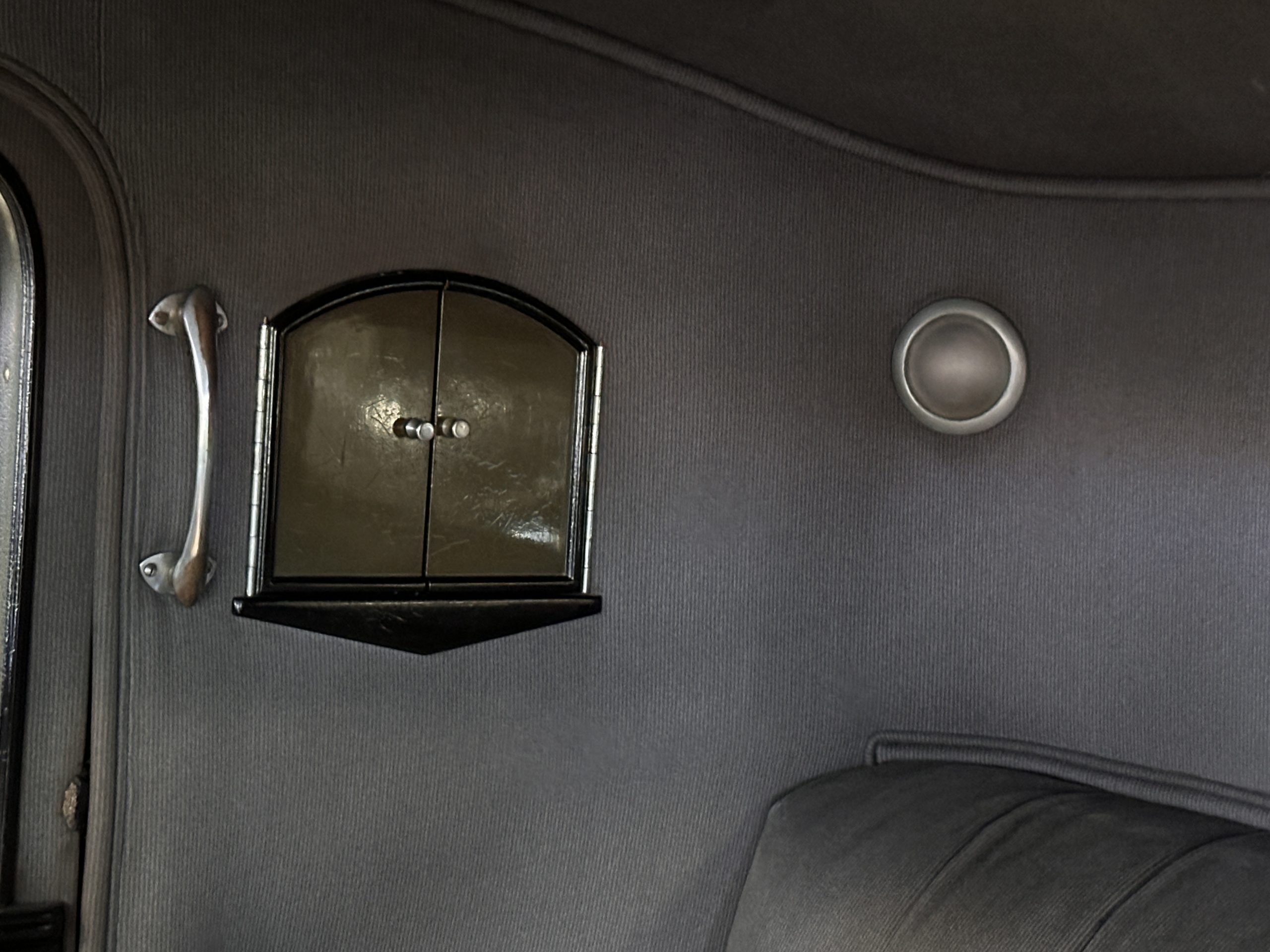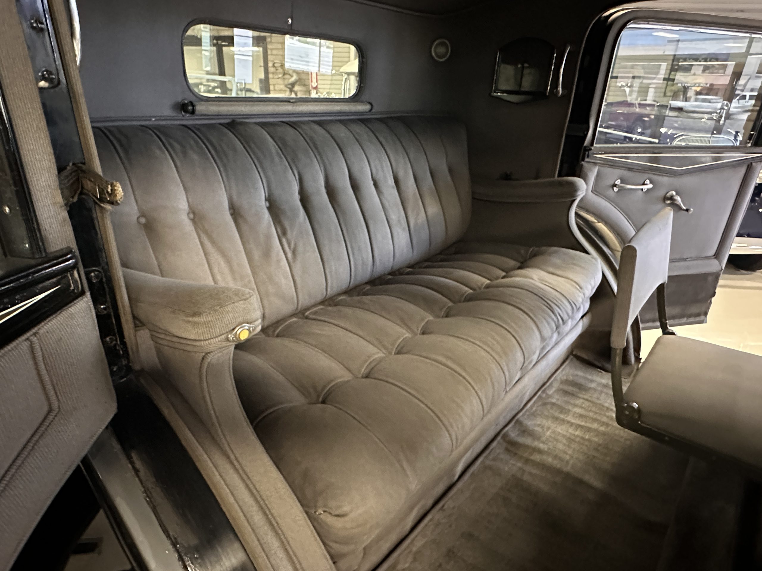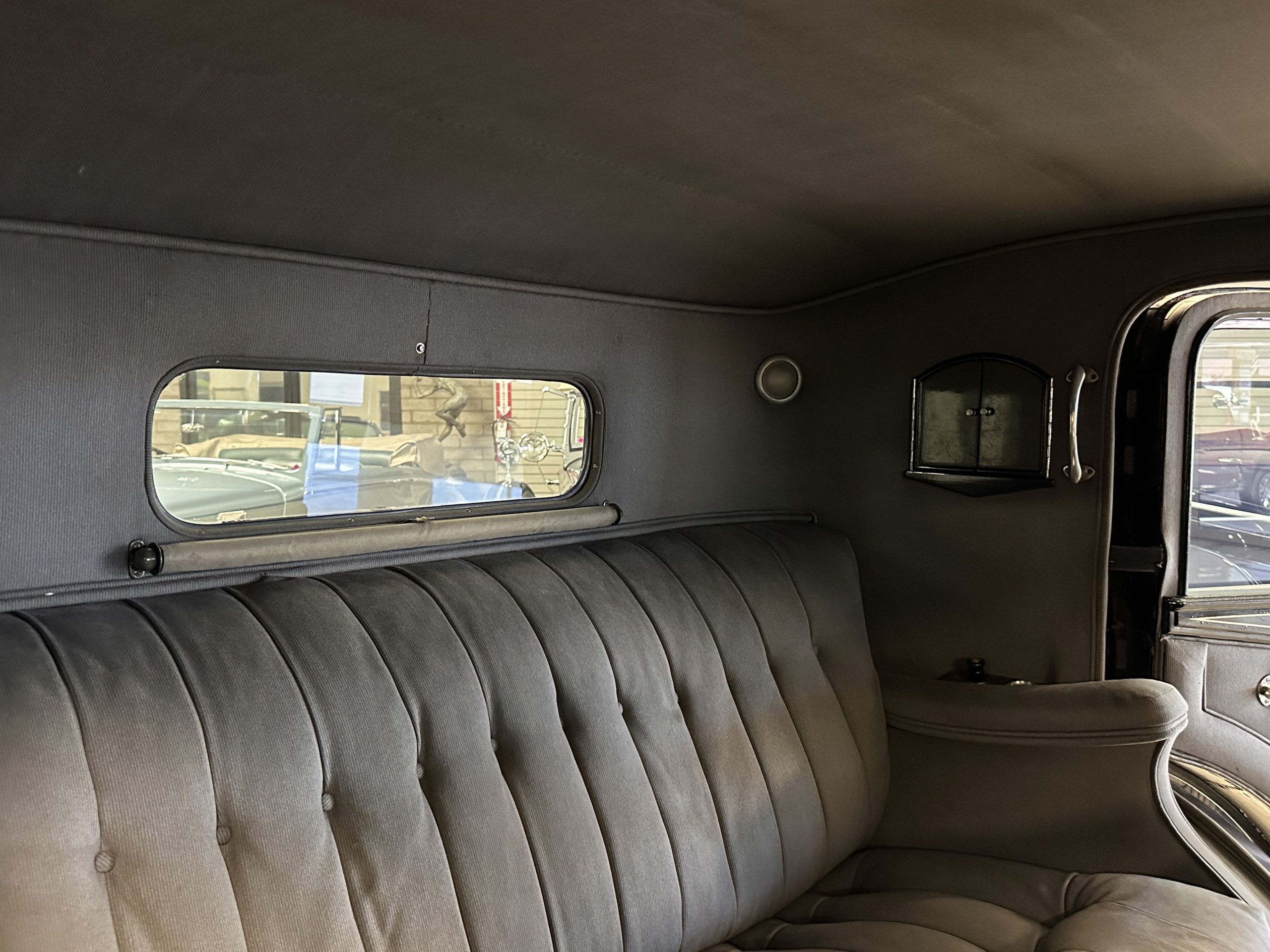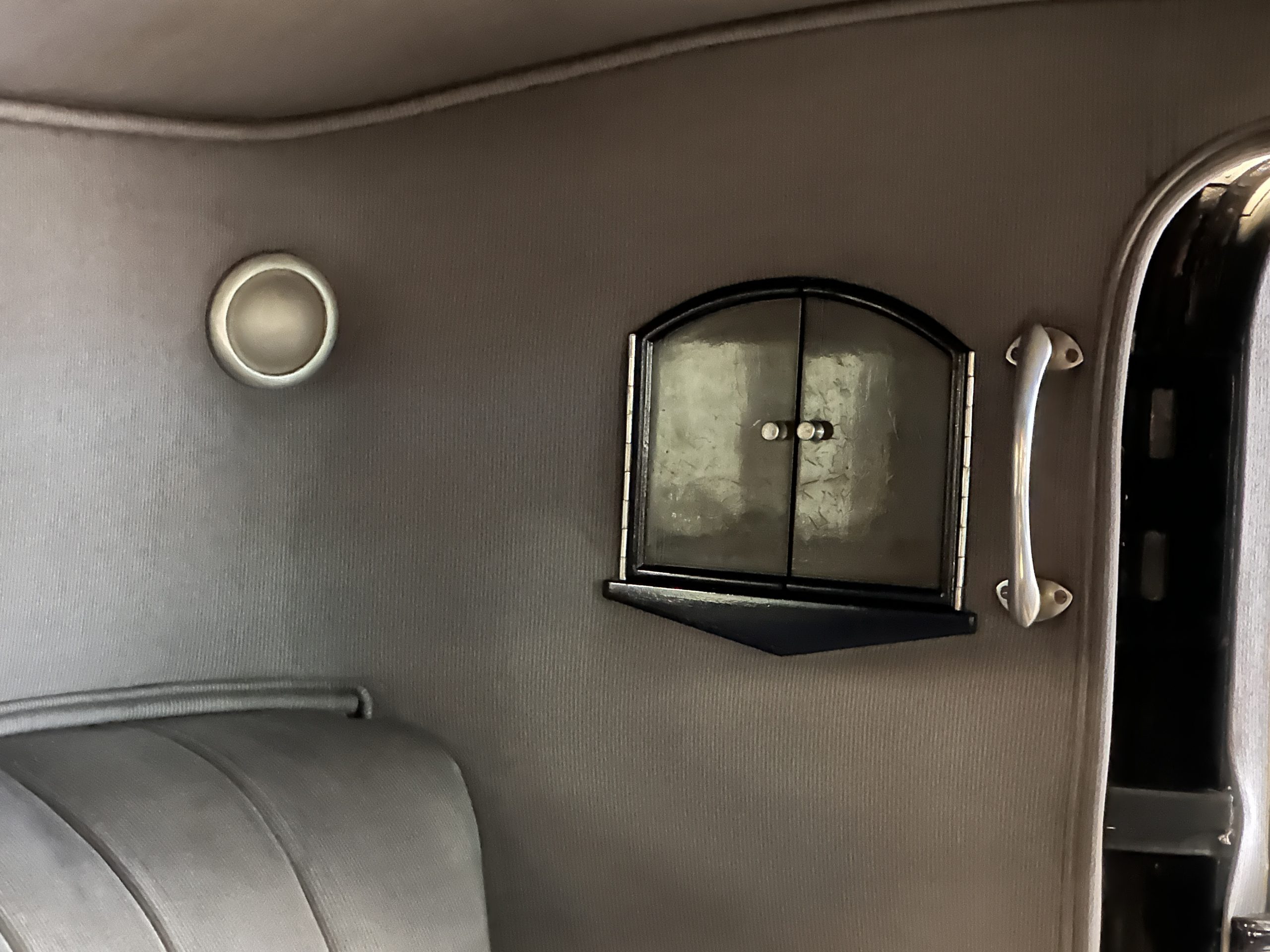 The passenger compartment is in spectacular original condition. The wood appears to be a unique black and taupe painted finish in a simple and elegant art deco design. The grey wool broadcloth is in gorgeous original condition with German Silver finished door and window handles. There are twin jump seats allowing for five passengers in the rear compartment with the chauffeurs sliding window providing any needed privacy. Twin vanities and a shade for the rear window complete the formality of the interior. Overall, this is a fantastic original interior that is sure to win awards for preservation.