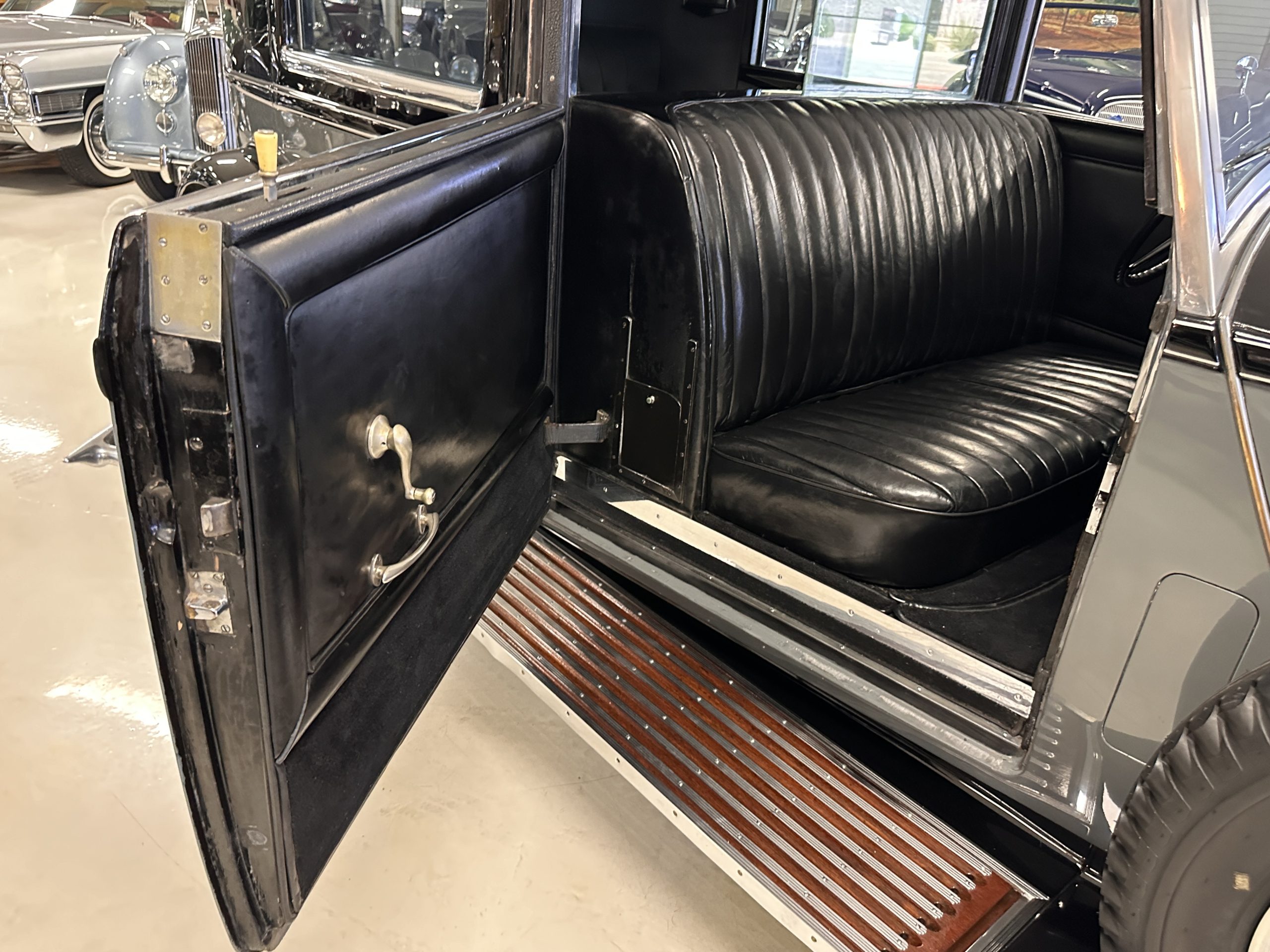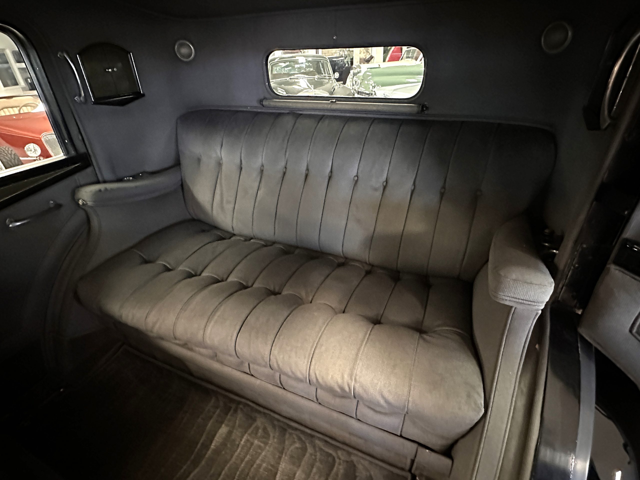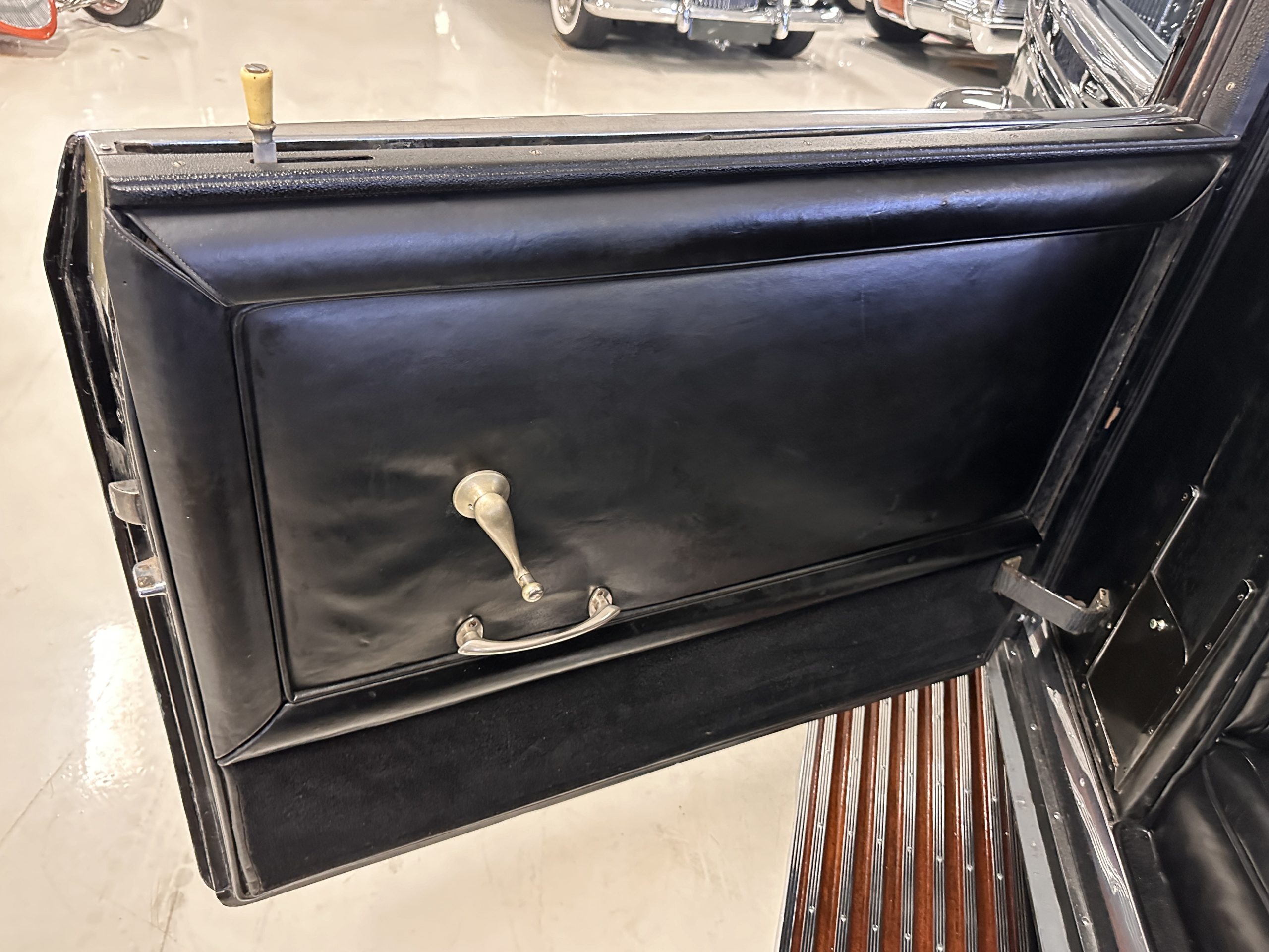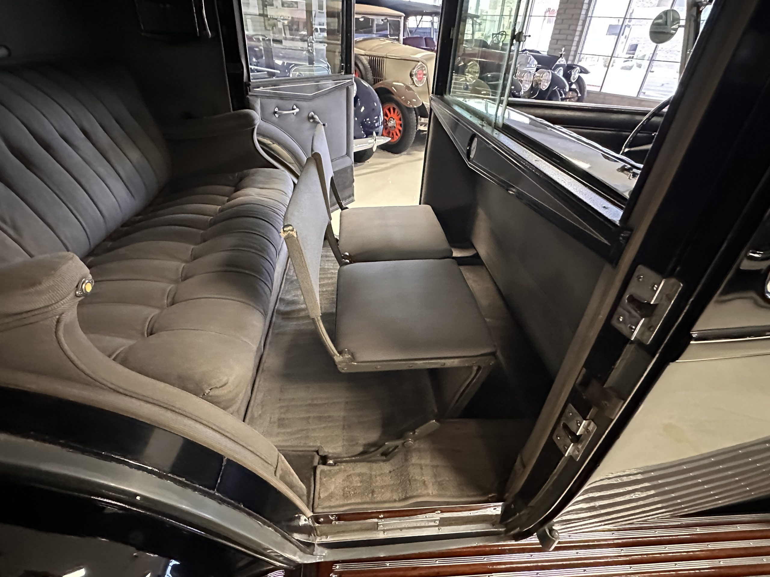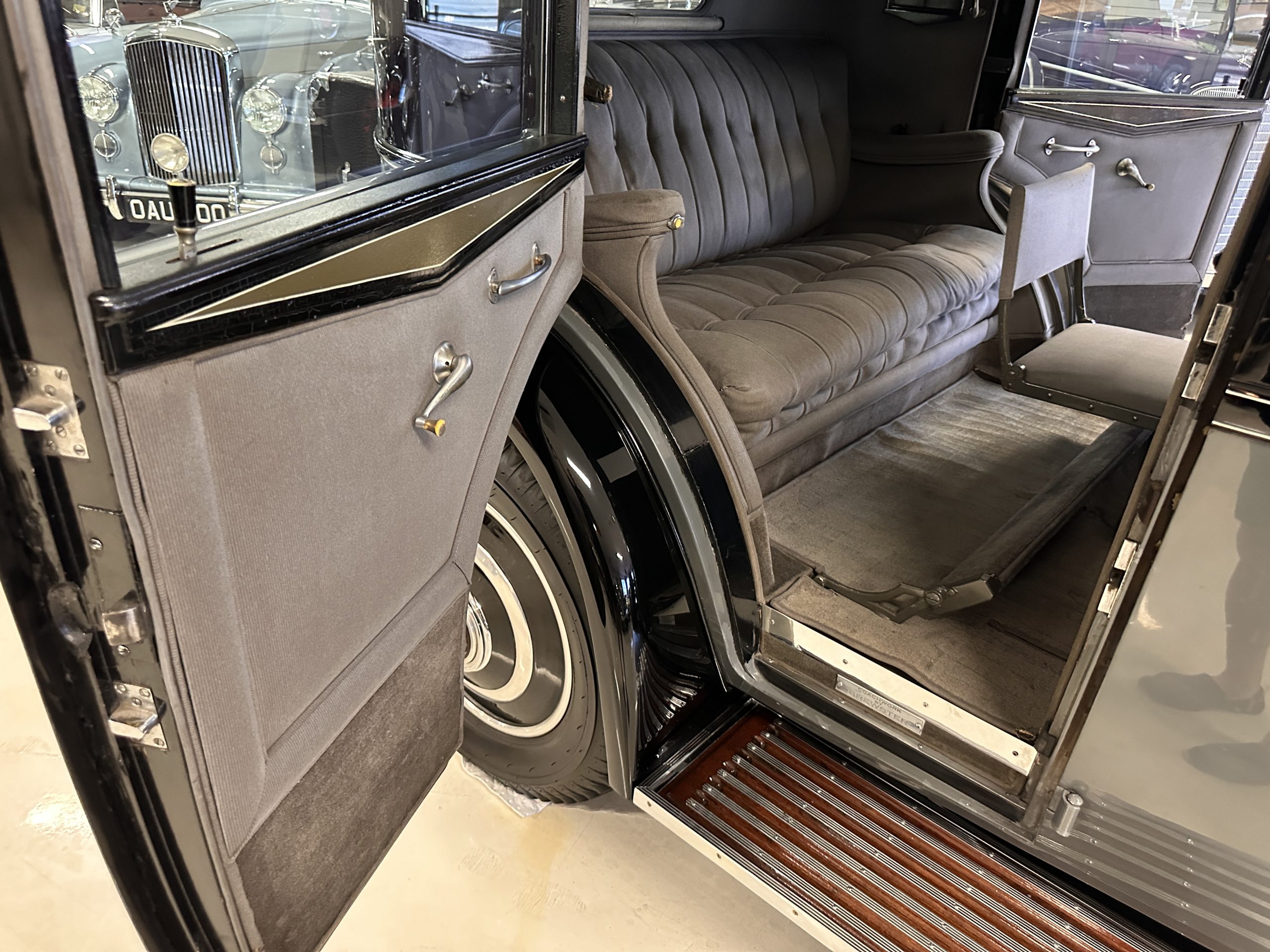 The passenger compartment is in spectacular original condition. The wood appears to be a unique black and taupe painted finish in a simple and elegant art deco design. The grey wool broadcloth is in gorgeous original condition with German Silver finished door and window handles. There are twin jump seats allowing for five passengers in the rear compartment with the chauffeurs sliding window providing any needed privacy. Twin vanities and a shade for the rear window complete the formality of the interior. Overall, this is a fantastic original interior that is sure to win awards for preservation.