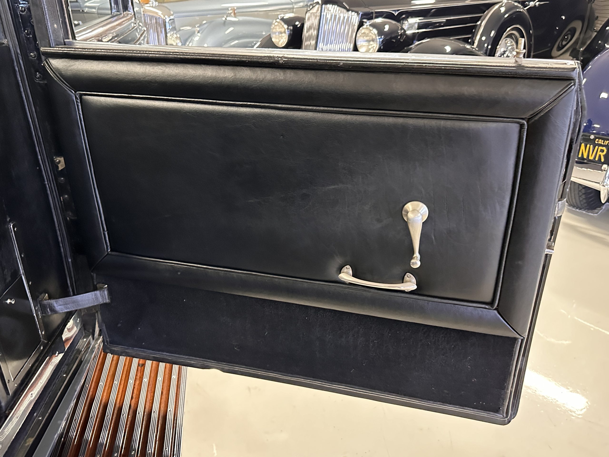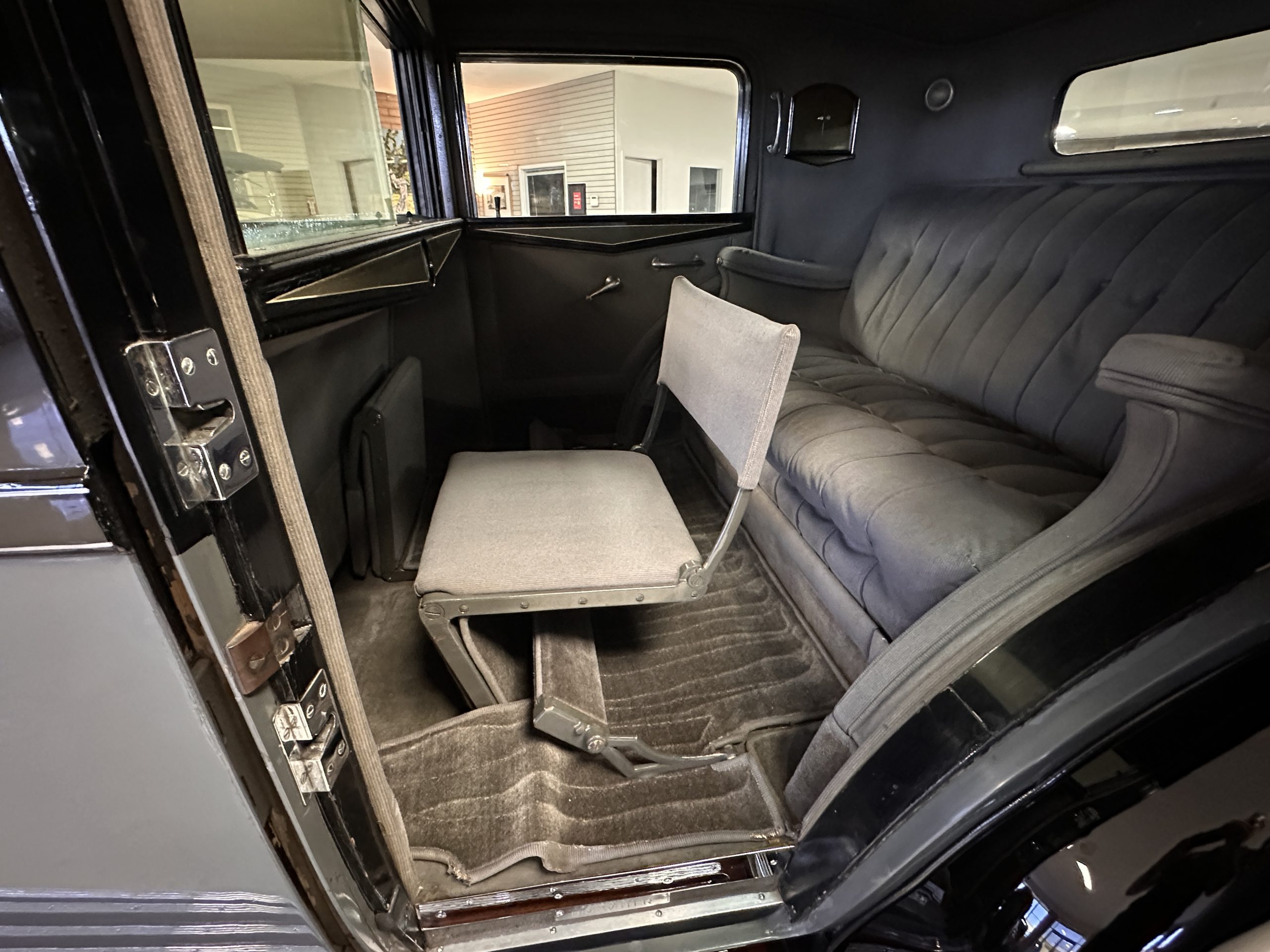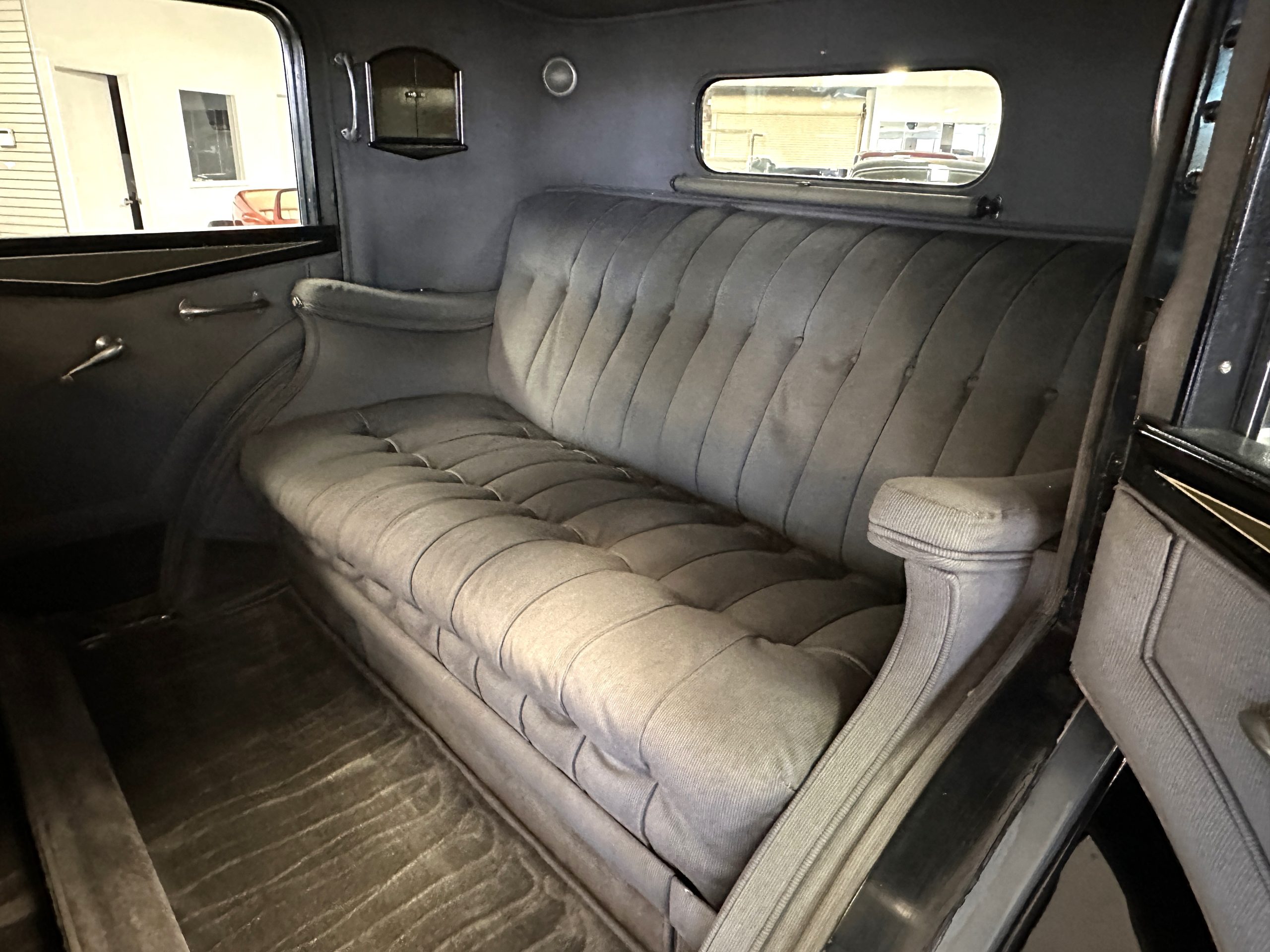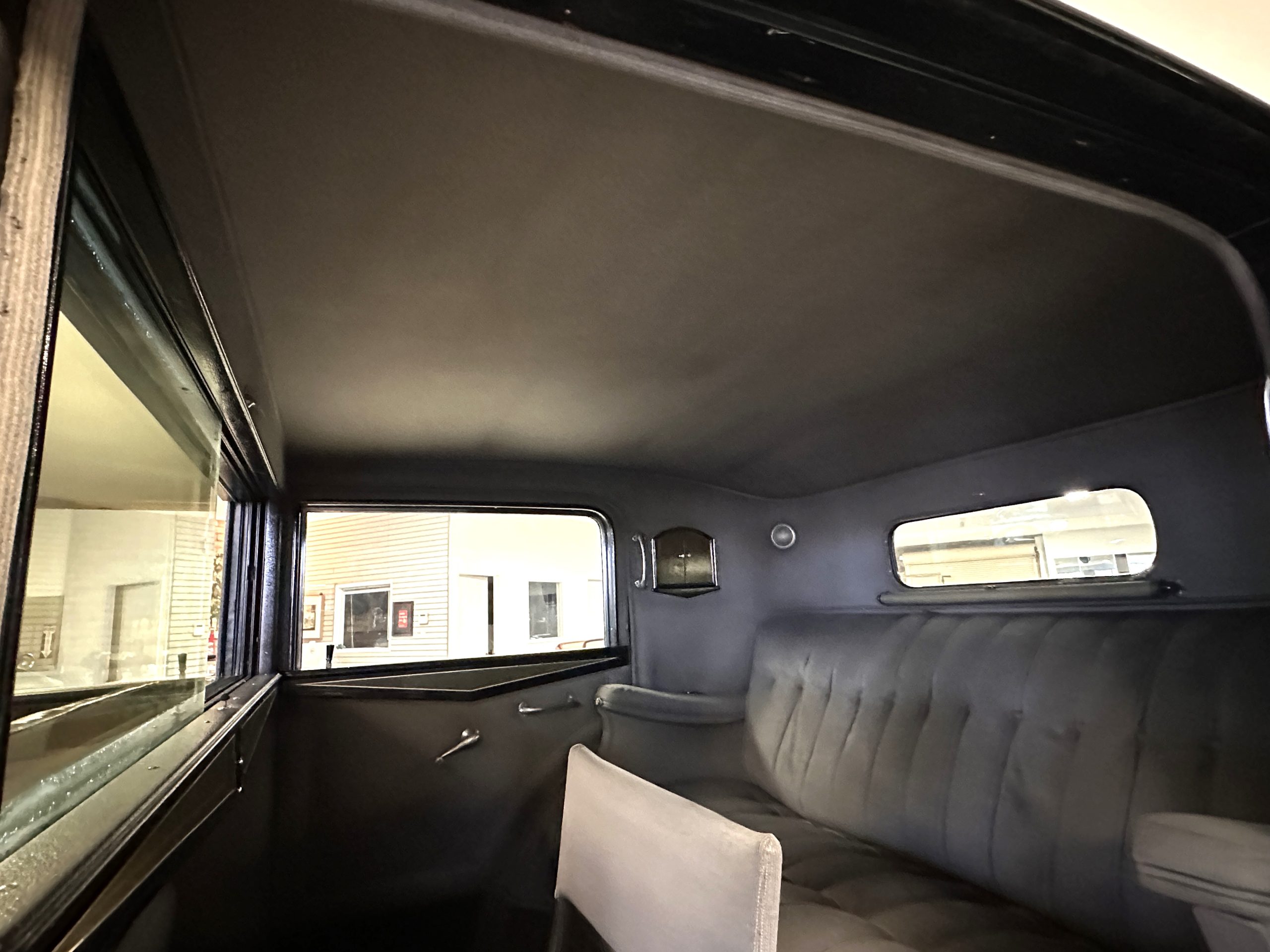 The passenger compartment is in spectacular original condition. The wood appears to be a unique black and taupe painted finish in a simple and elegant art deco design. The grey wool broadcloth is in gorgeous original condition with German Silver finished door and window handles. There are twin jump seats allowing for five passengers in the rear compartment with the chauffeurs sliding window providing any needed privacy. Twin vanities and a shade for the rear window complete the formality of the interior. Overall, this is a fantastic original interior that is sure to win awards for preservation.