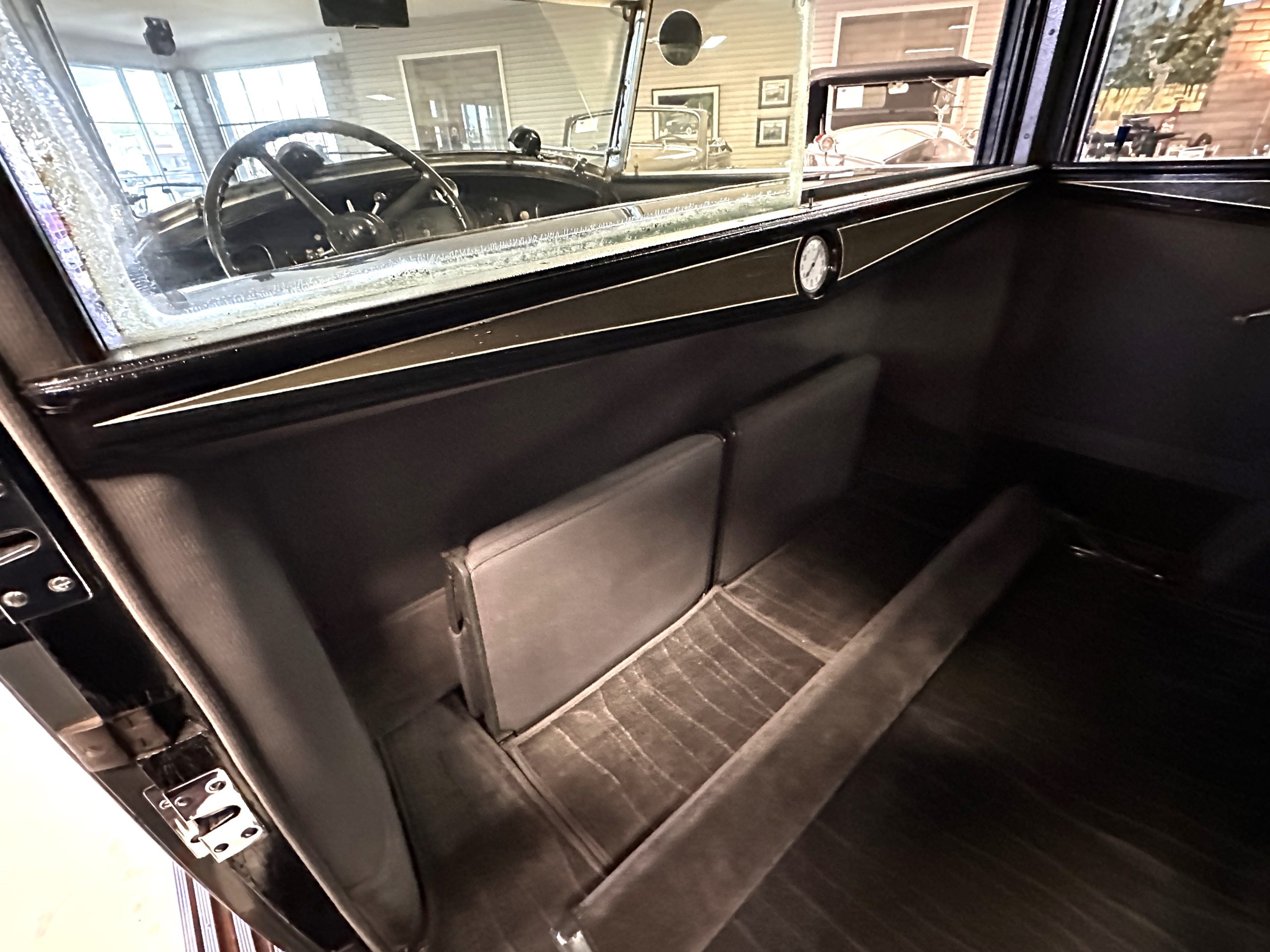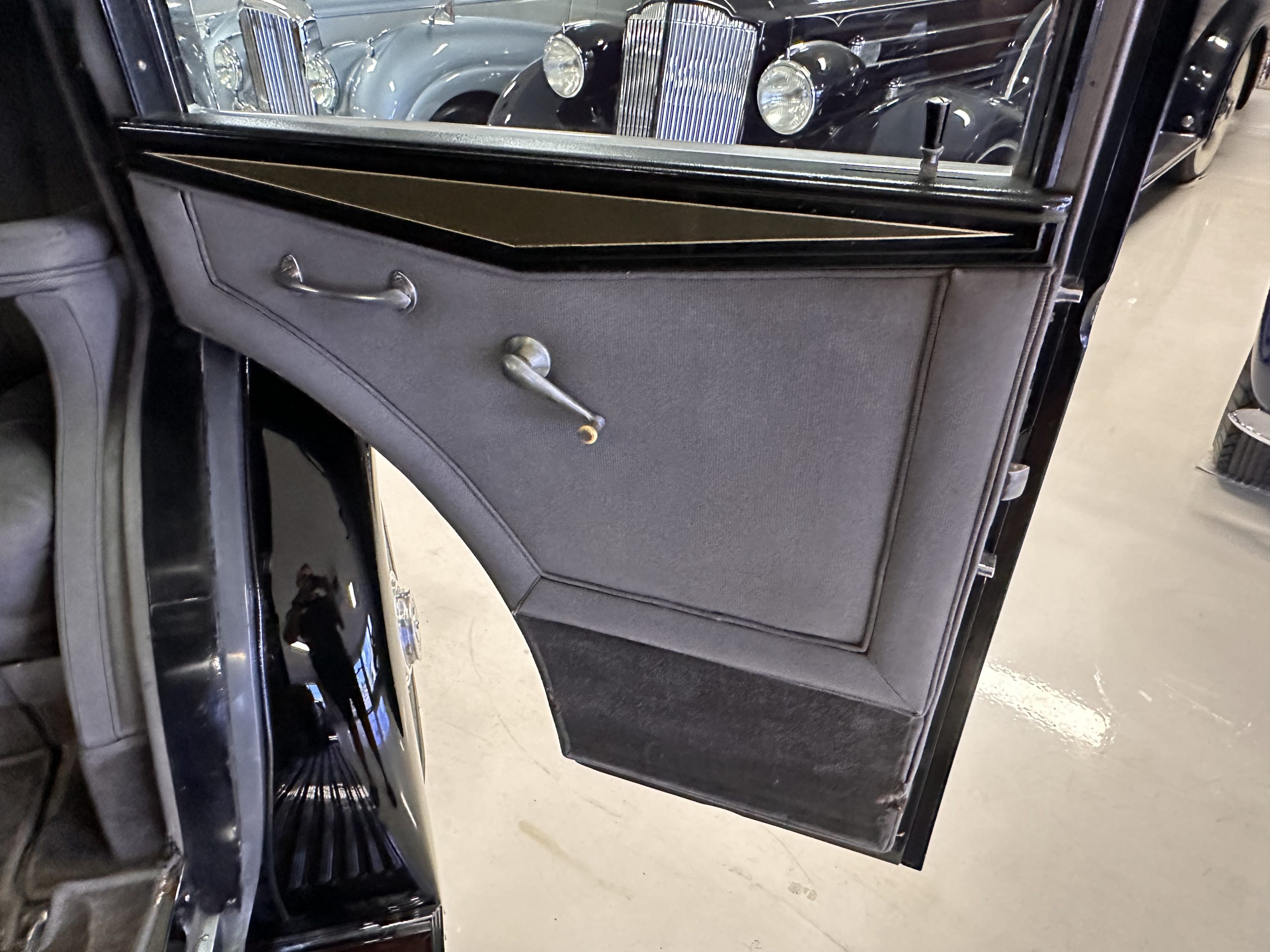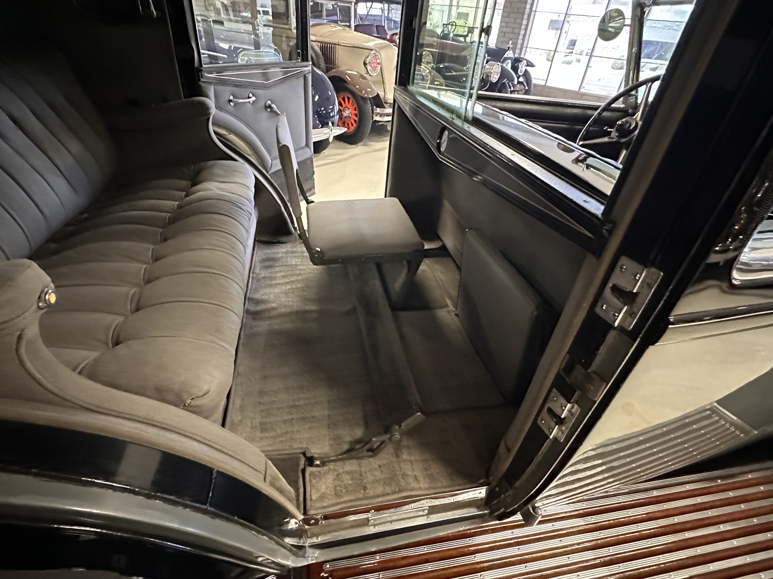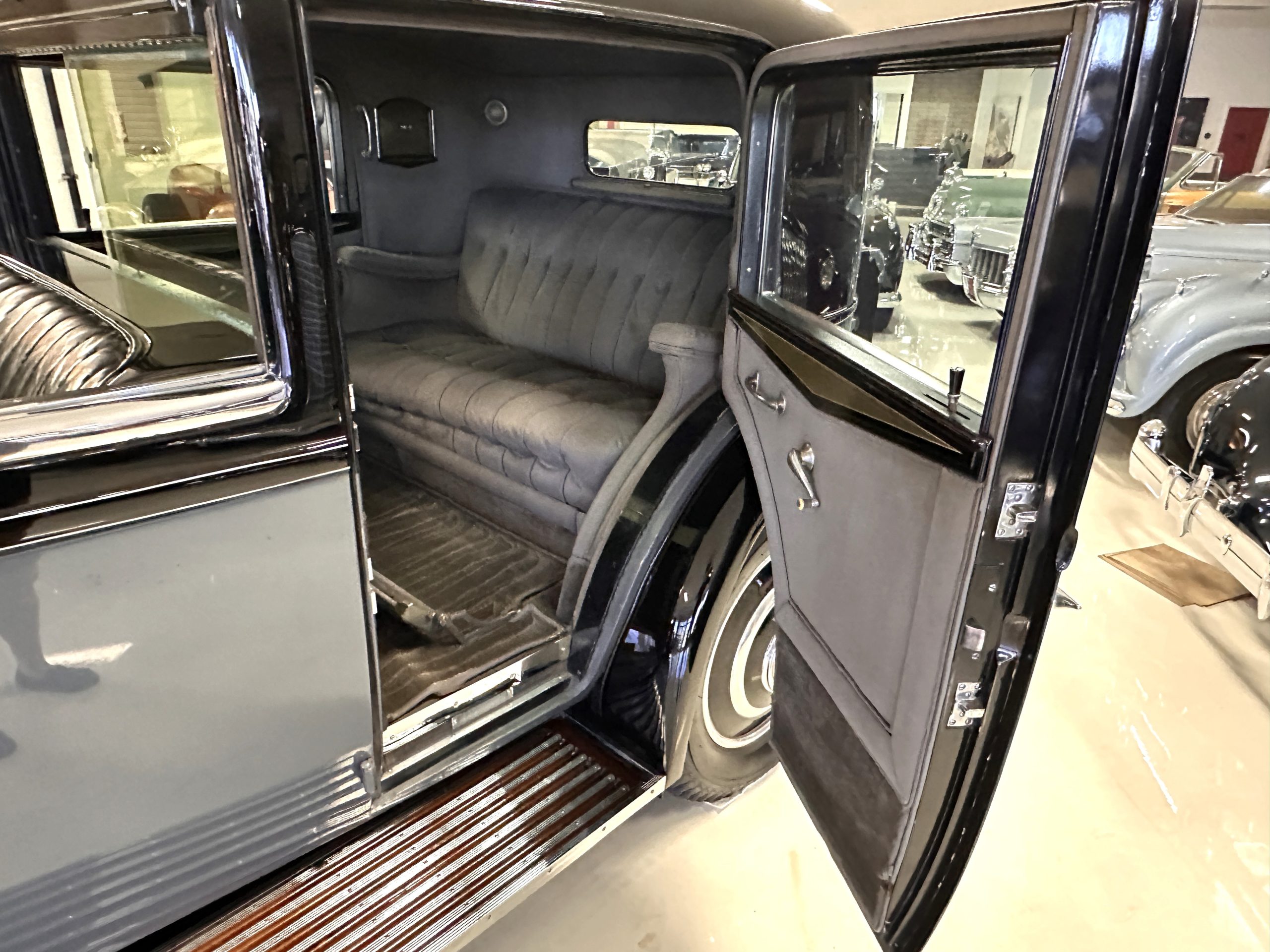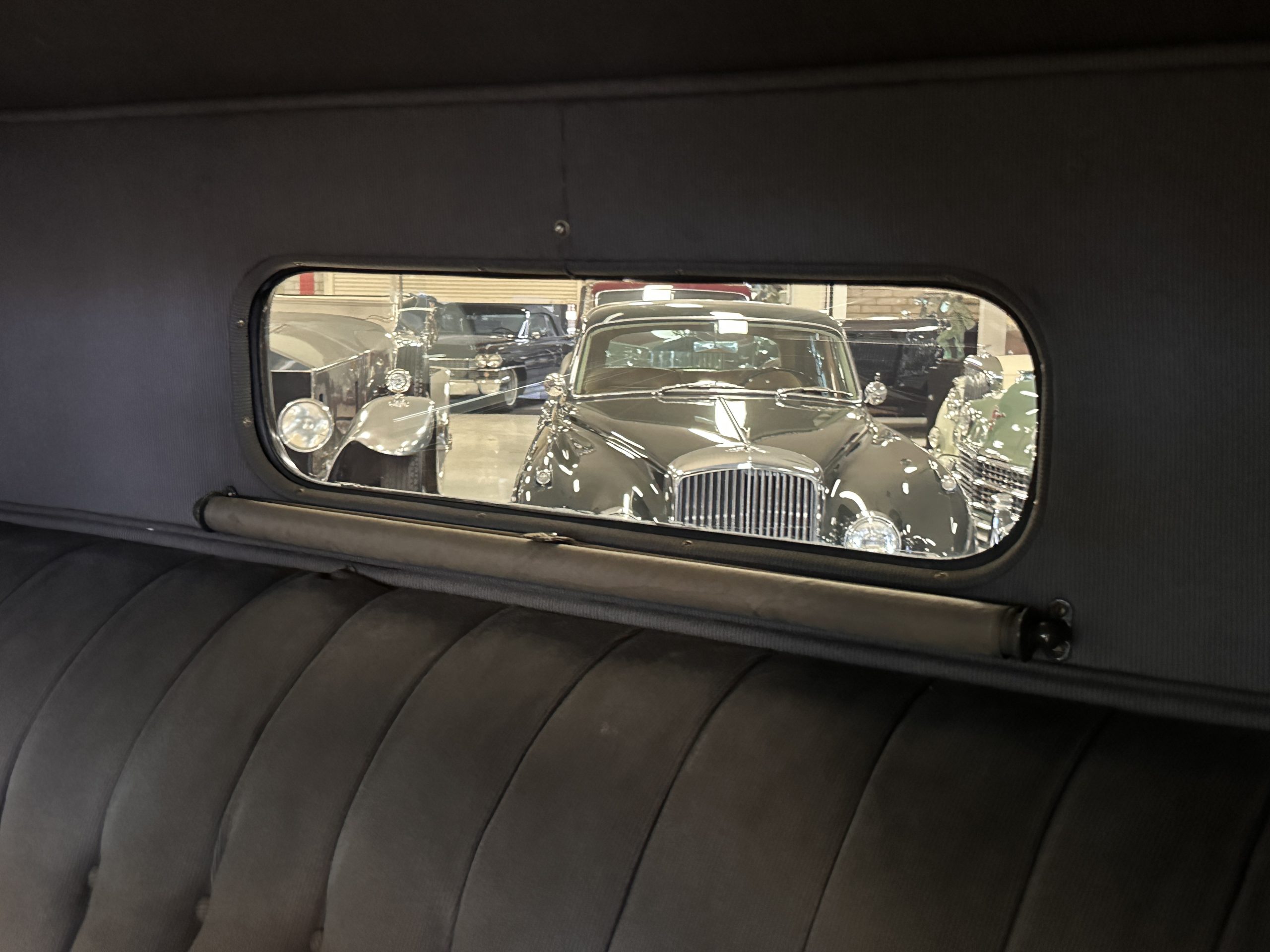The passenger compartment is in spectacular original condition. The wood appears to be a unique black and taupe painted finish in a simple and elegant art deco design. The grey wool broadcloth is in gorgeous original condition with German Silver finished door and window handles. There are twin jump seats allowing for five passengers in the rear compartment with the chauffeurs sliding window providing any needed privacy. Twin vanities and a shade for the rear window complete the formality of the interior. Overall, this is a fantastic original interior that is sure to win awards for preservation.