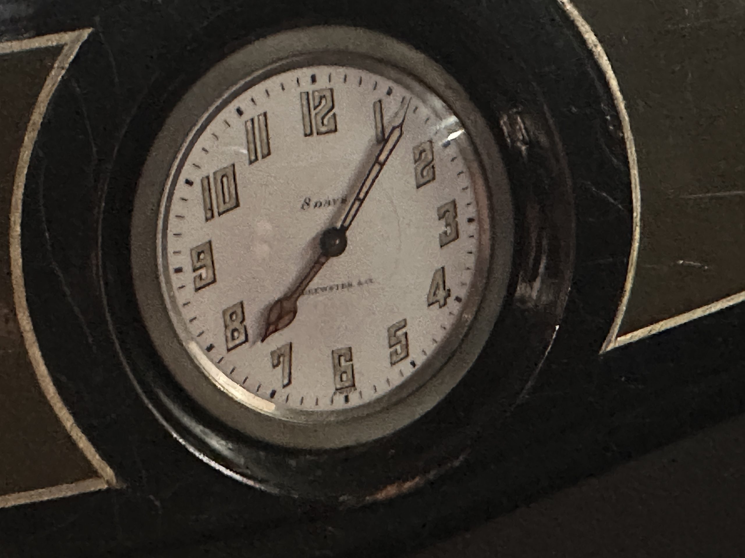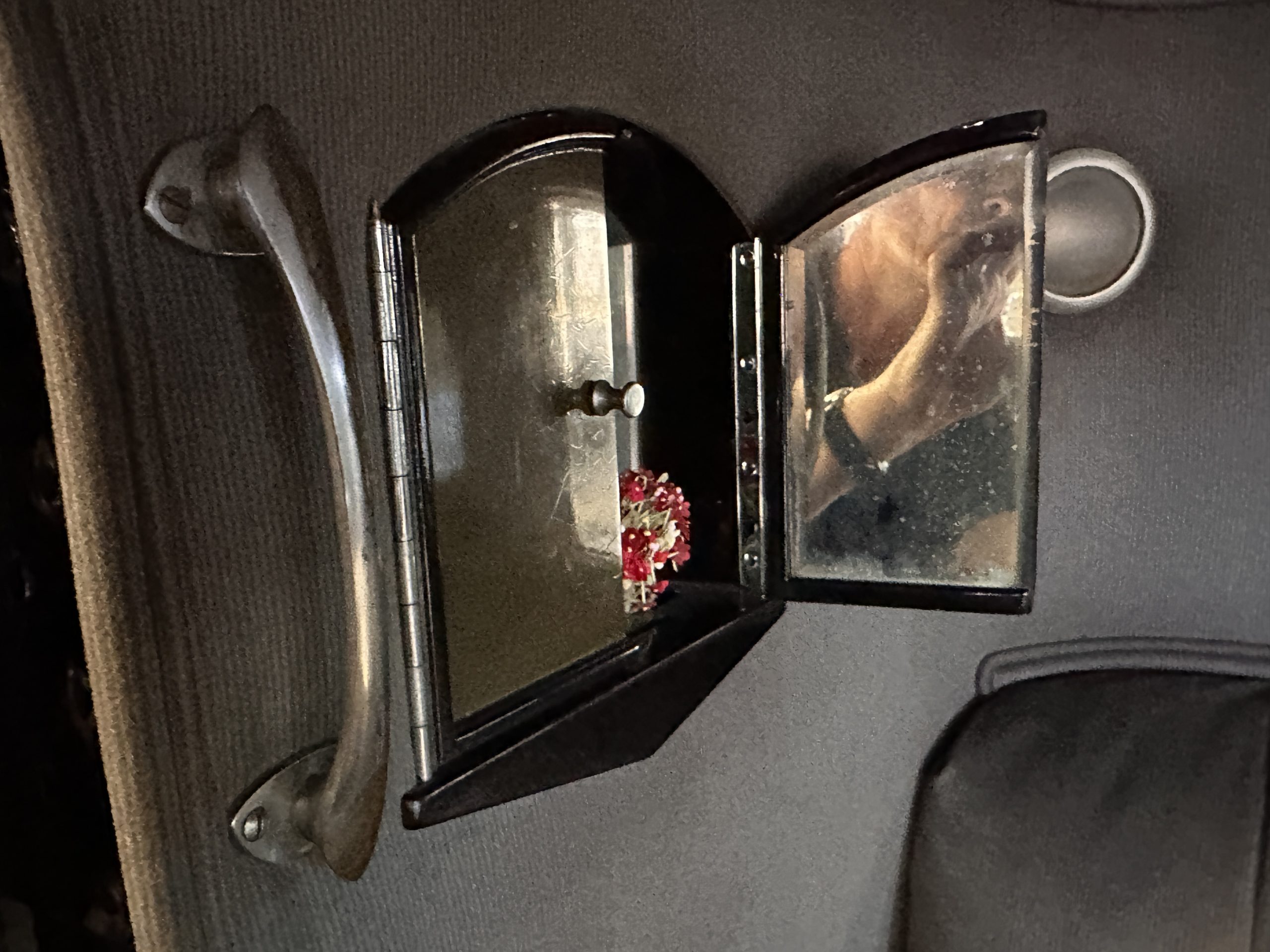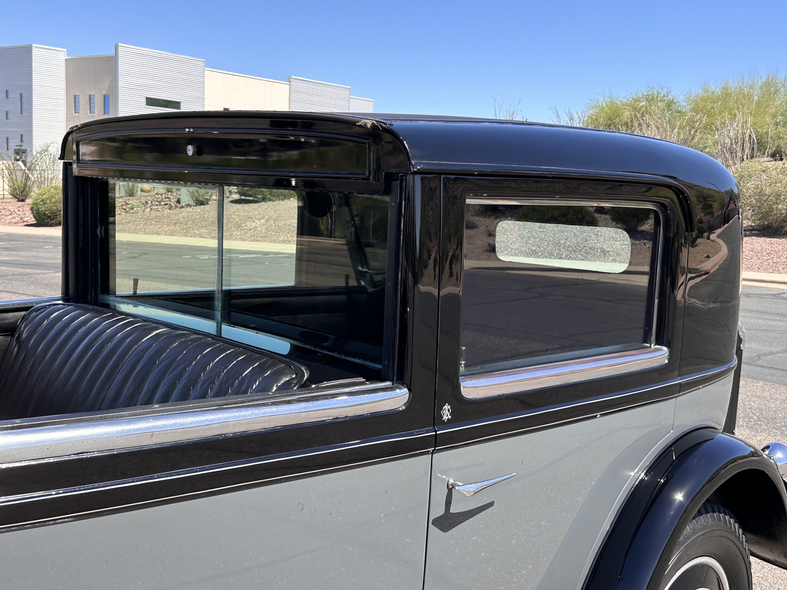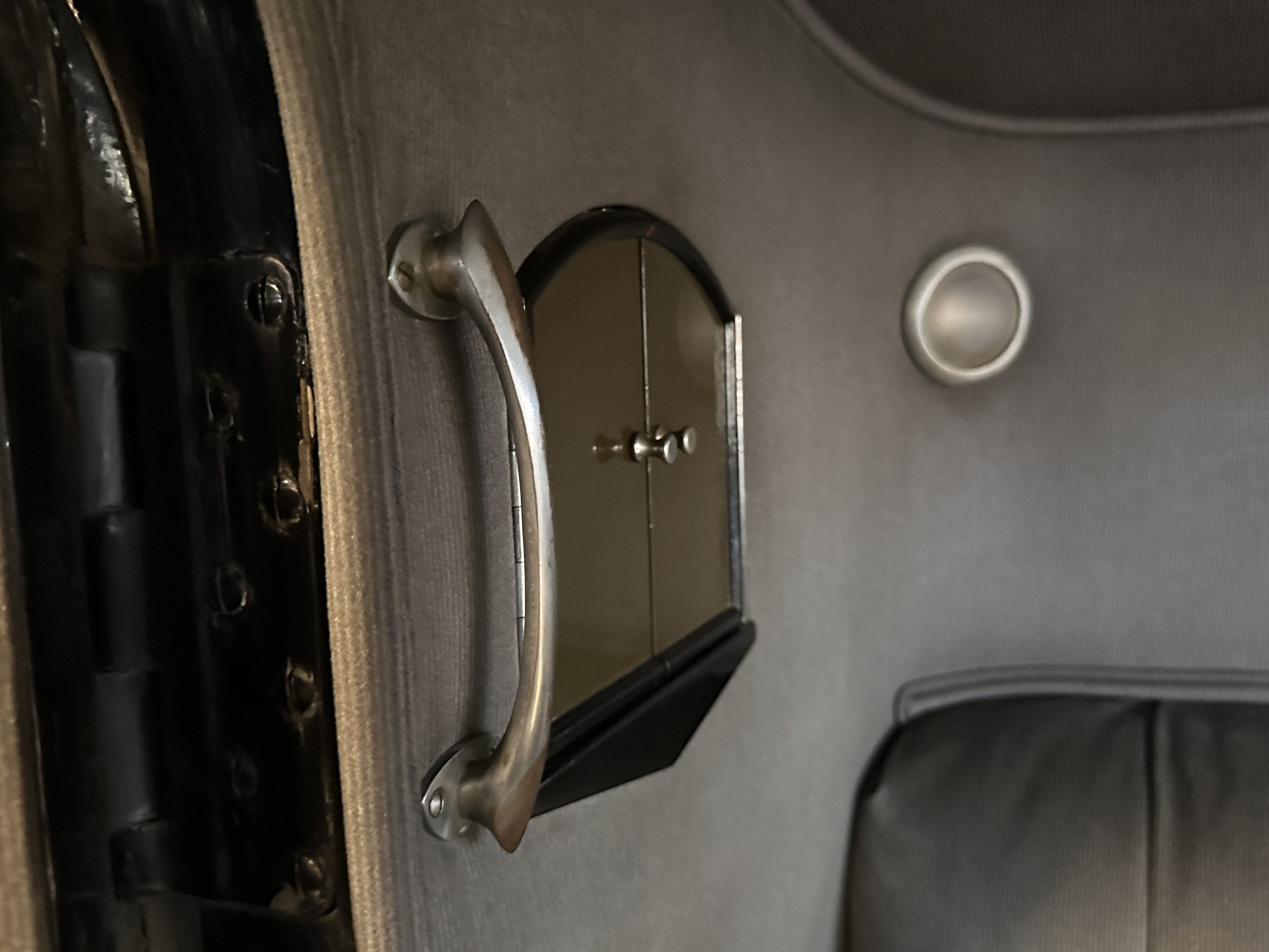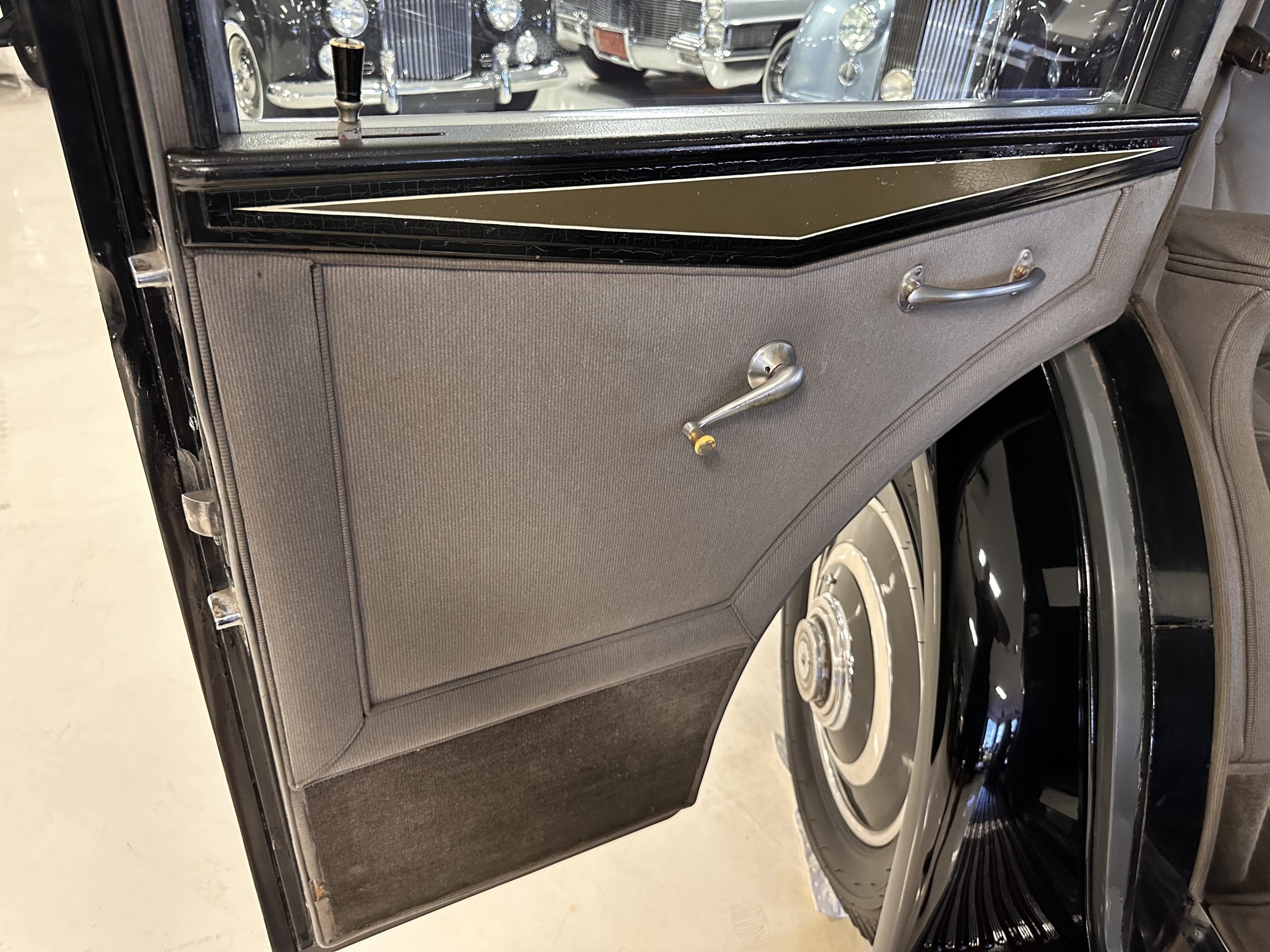 The passenger compartment is in spectacular original condition. The wood appears to be a unique black and taupe painted finish in a simple and elegant art deco design. The grey wool broadcloth is in gorgeous original condition with German Silver finished door and window handles. There are twin jump seats allowing for five passengers in the rear compartment with the chauffeurs sliding window providing any needed privacy. Twin vanities and a shade for the rear window complete the formality of the interior. Overall, this is a fantastic original interior that is sure to win awards for preservation.
