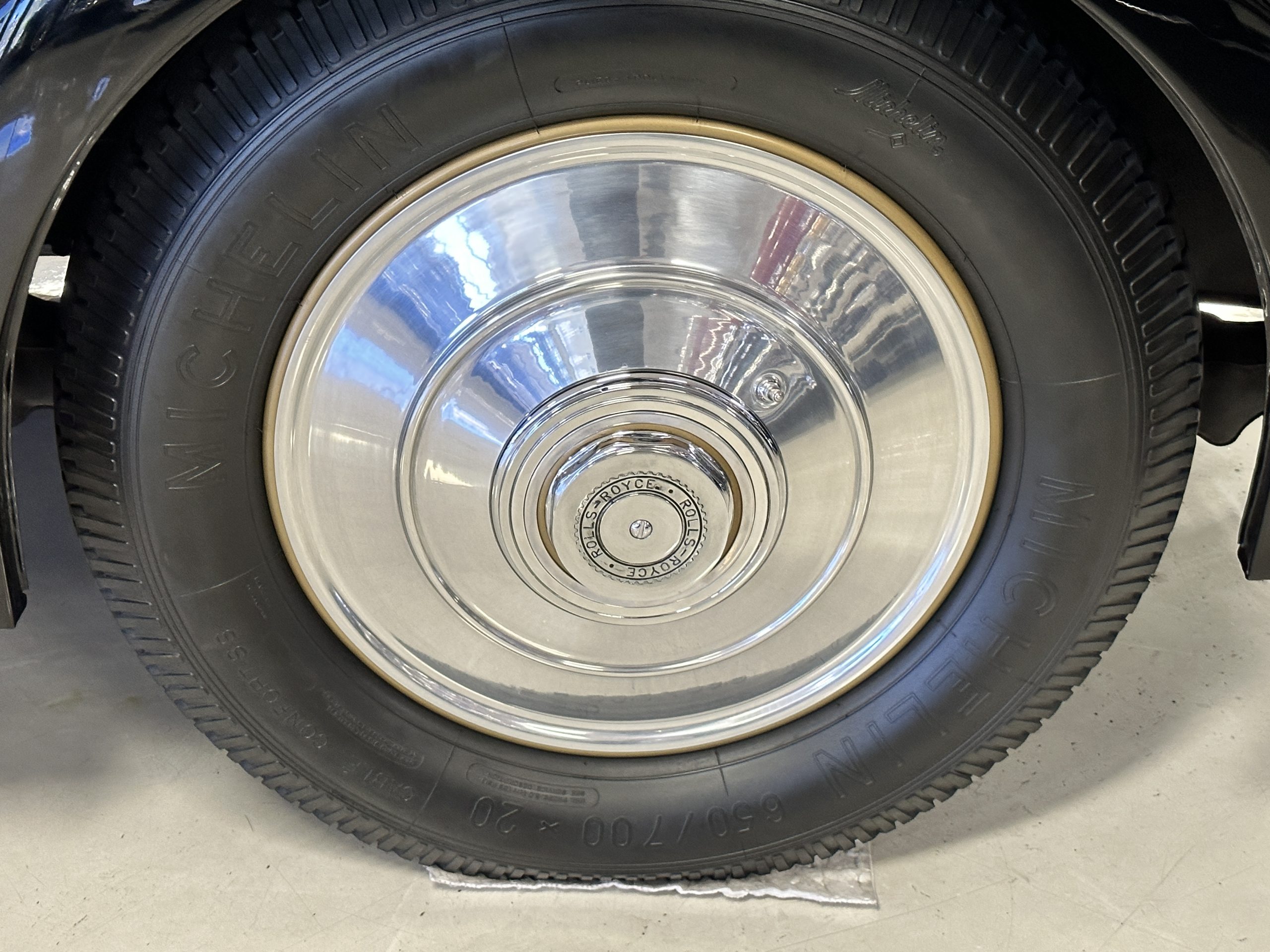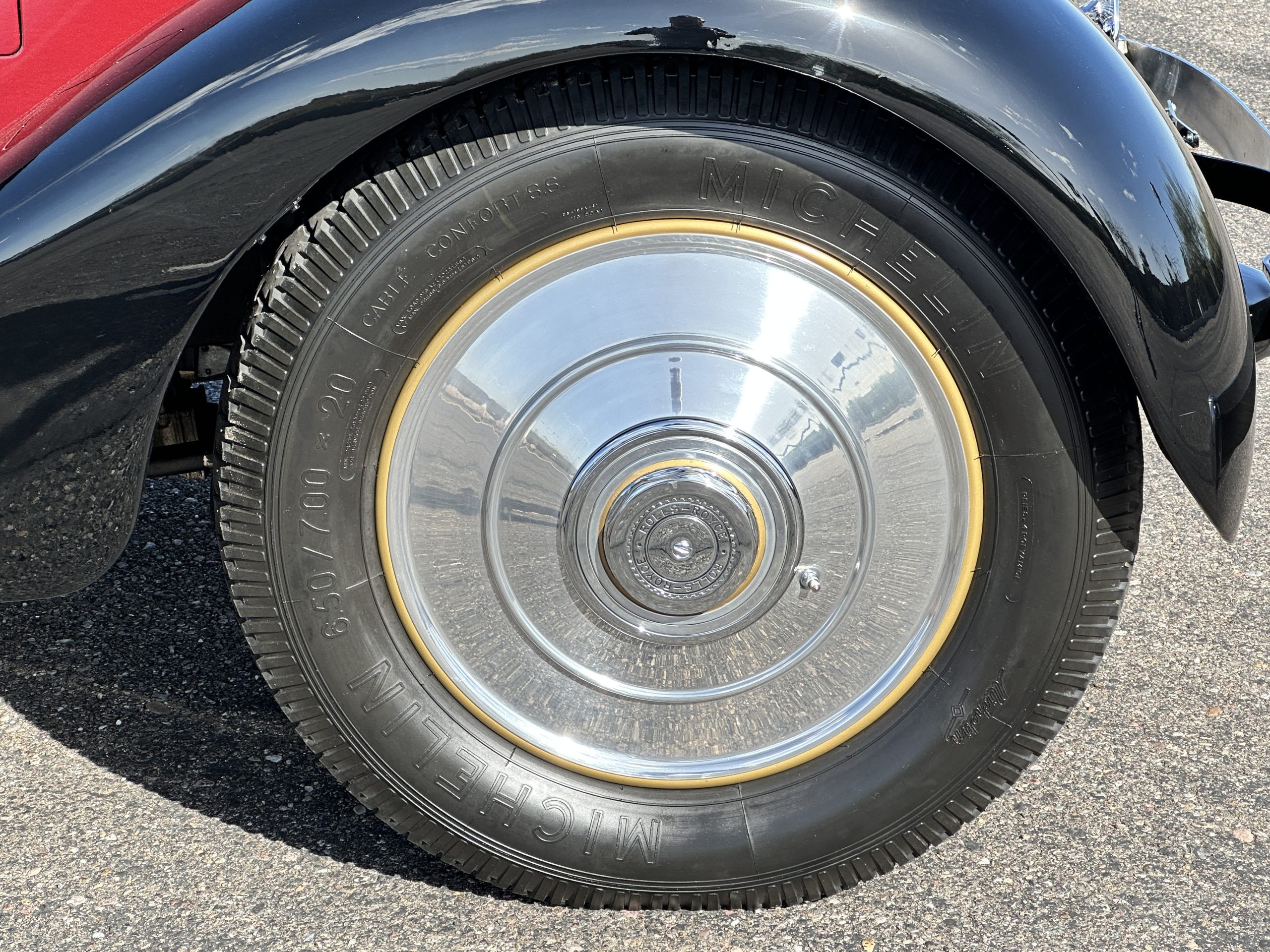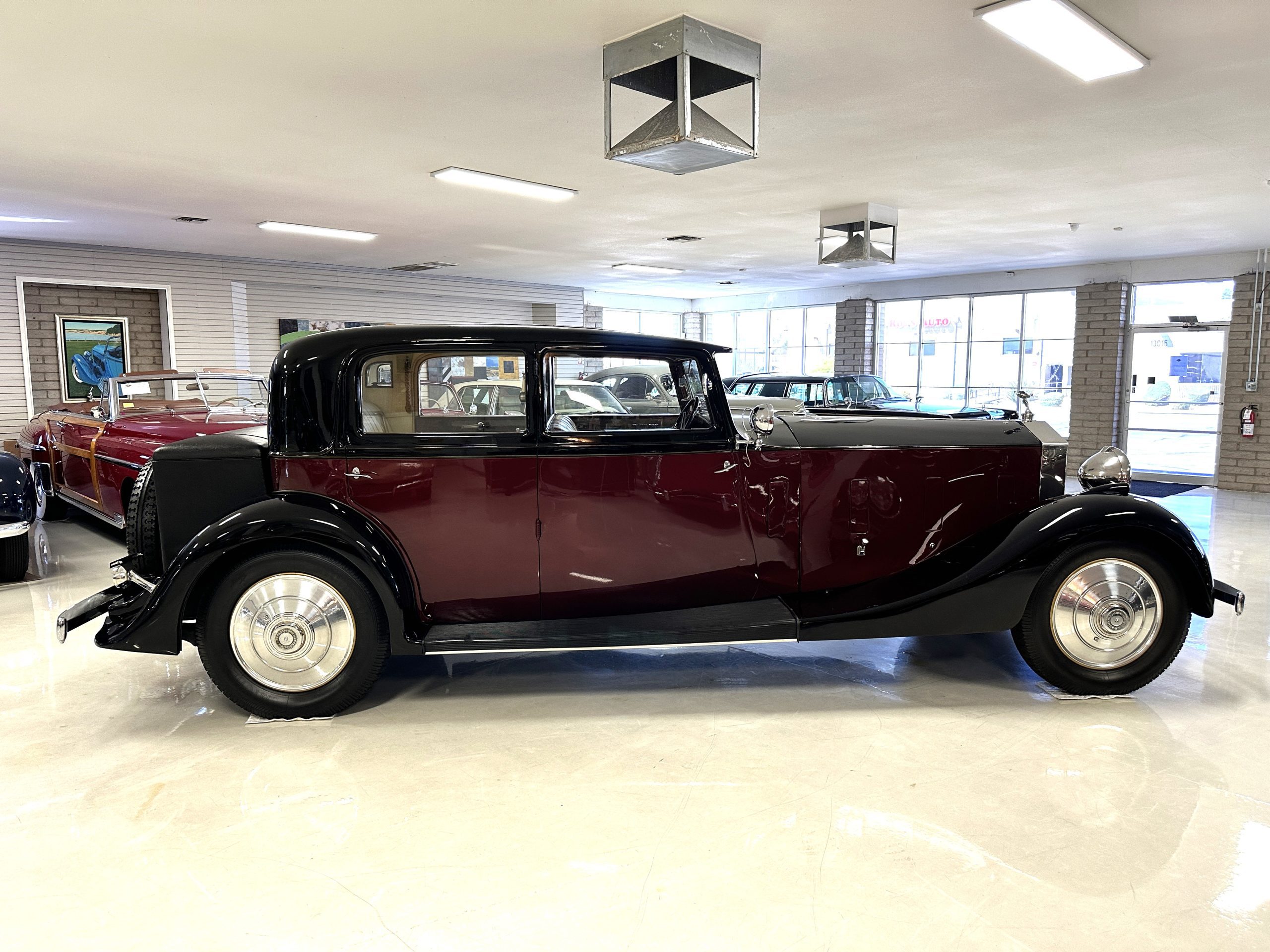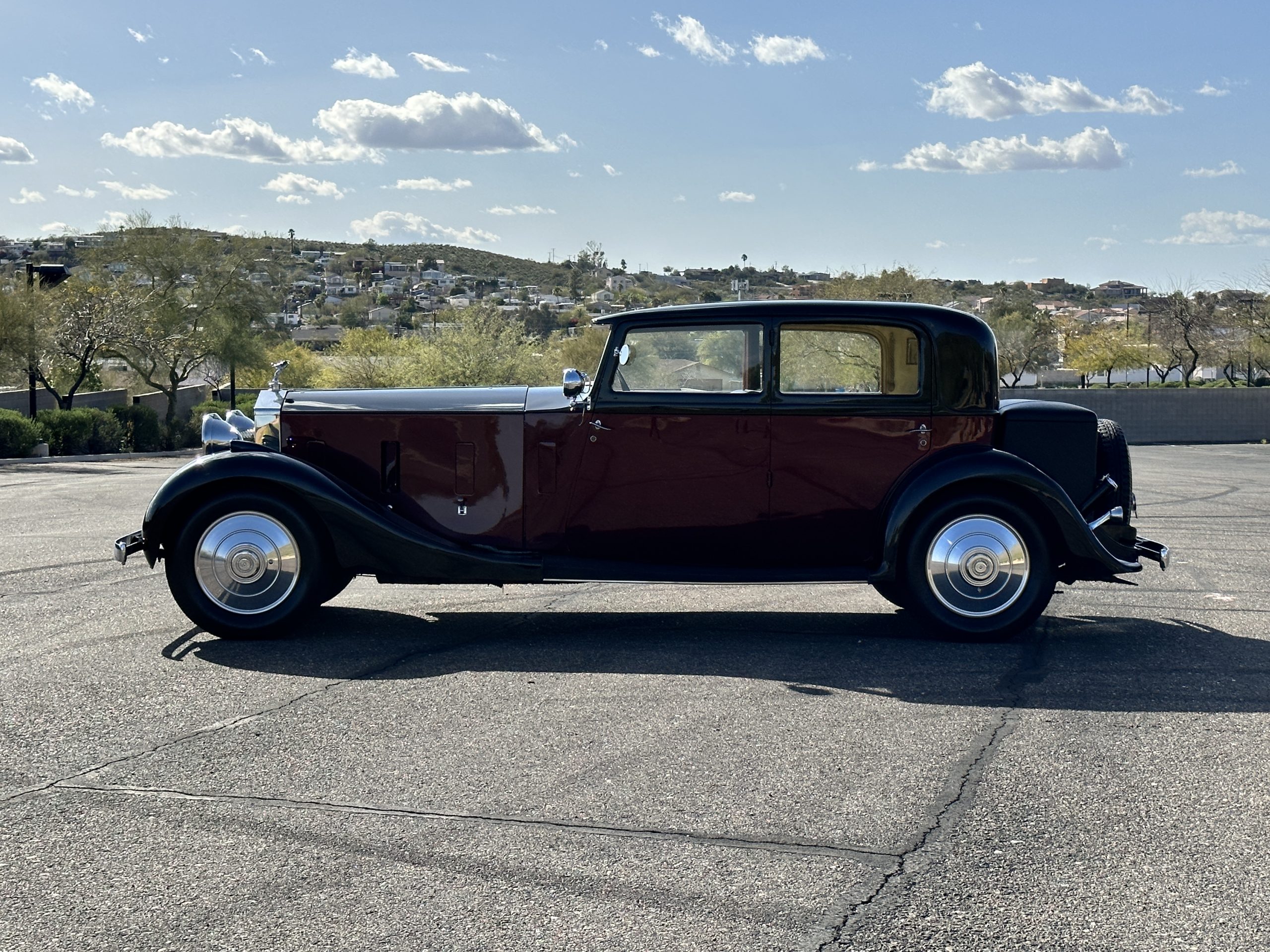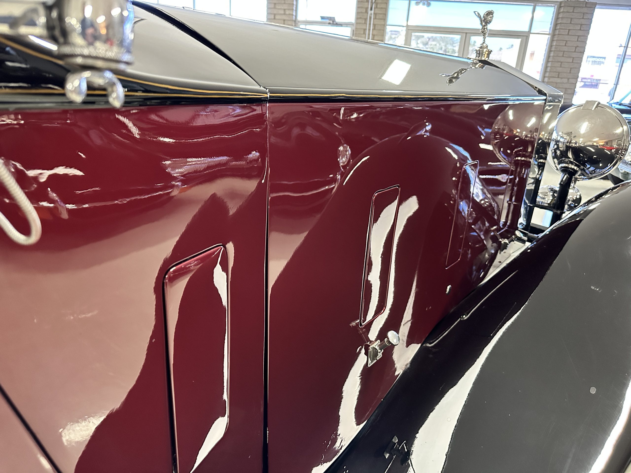 The livery is in two tone Black and Burgundy that is in very good condition with excellent shine and luster. High use areas, such as near the hood and doors show some wear, but overall it is simply stunning. The Burgundy has a very slight luminescence that is only perceptible with direct sunlight, when it surprisingly comes to life. The chrome and stainless are in excellent condition. The polished Llamar wheel discs are new as are the new black walled Michelin tires. The everflex covered trunk is a fantastic look, making this elegant motorcar appear more as a sportscar. The distance from the windshield to the front of the iconic Rolls-Royce grill is about six feet, which is nearly the same length of the passenger compartment. The height of the center of the windshield is about 11 inches. These design proportions really hint towards a racy and sexy sports saloon. Thrupp & Maberly really got the design right.