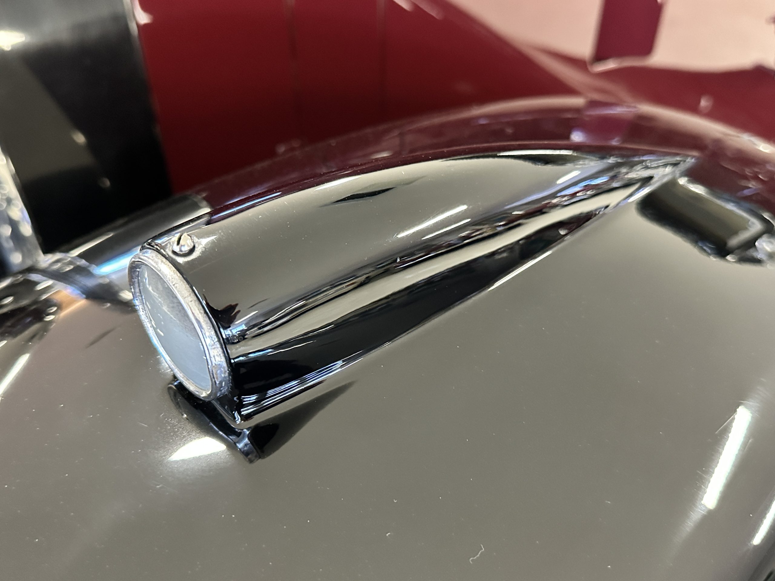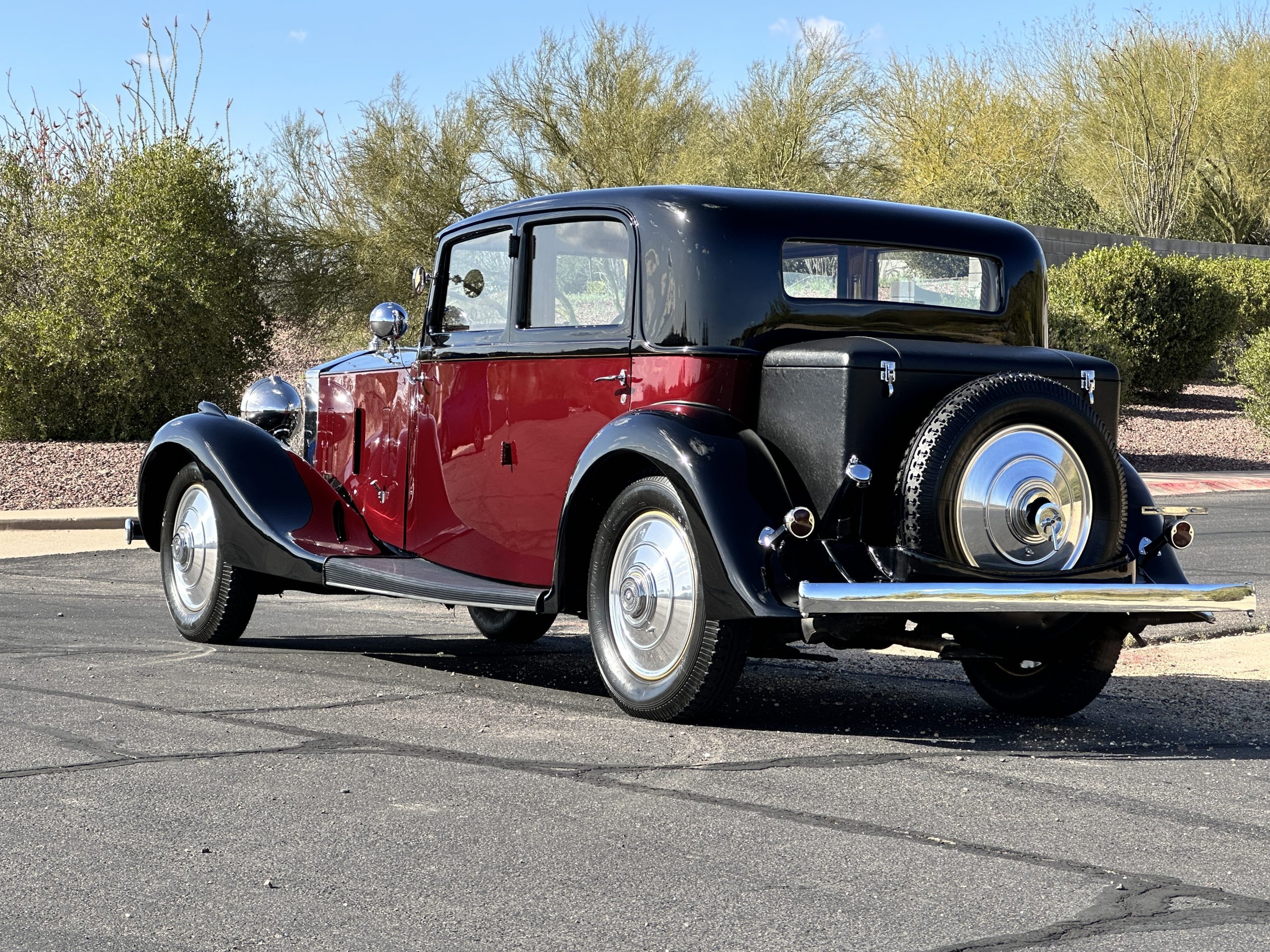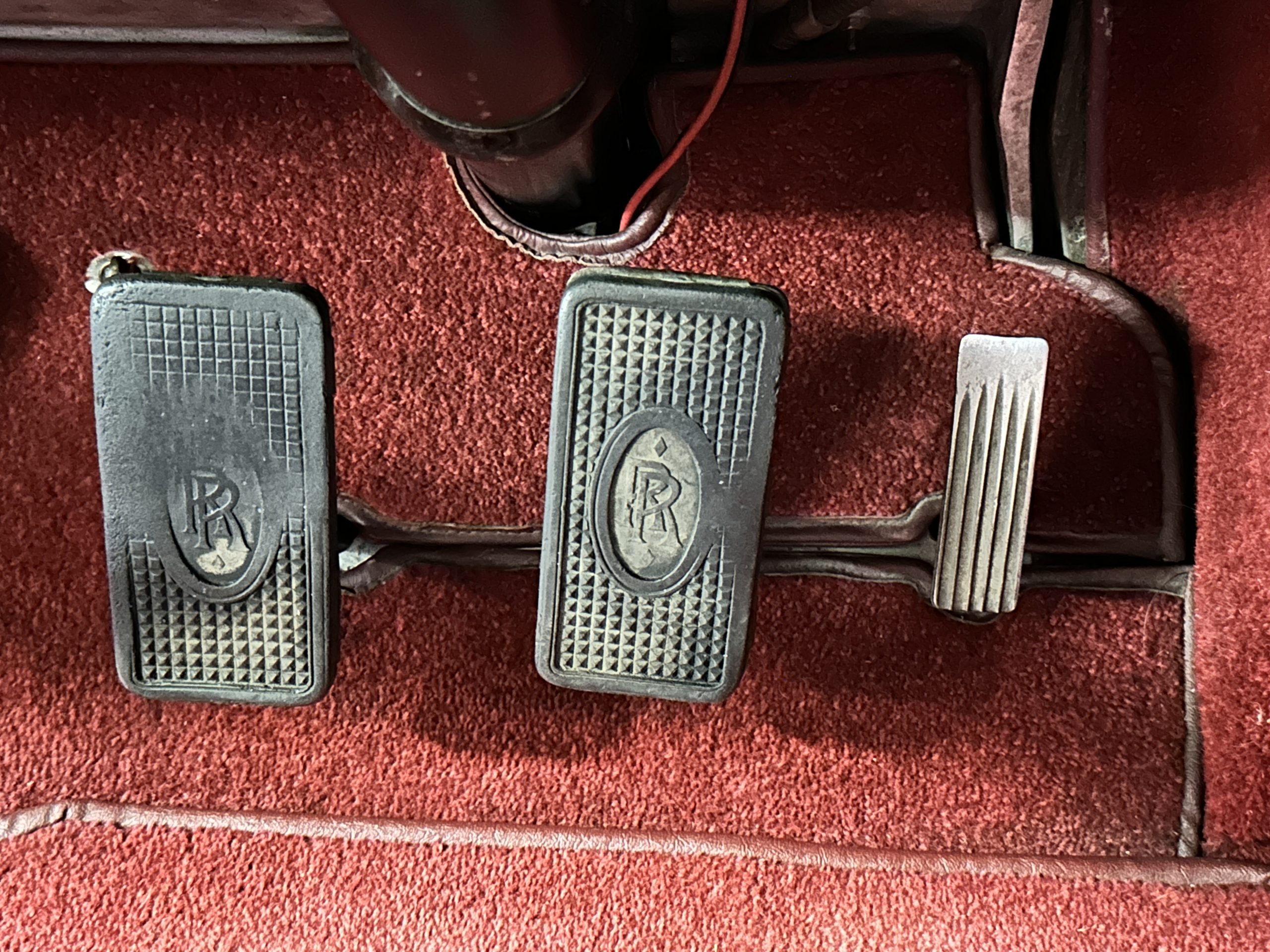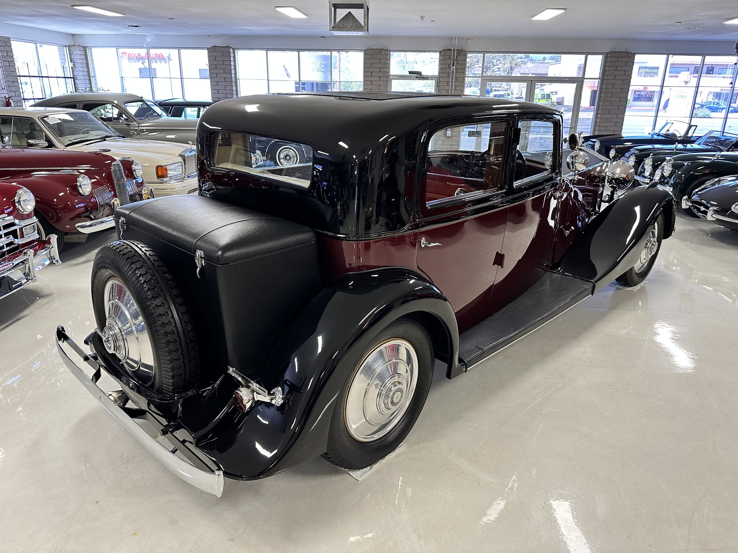 The livery is in two tone Black and Burgundy that is in very good condition with excellent shine and luster. High use areas, such as near the hood and doors show some wear, but overall it is simply stunning. The Burgundy has a very slight luminescence that is only perceptible with direct sunlight, when it surprisingly comes to life. The chrome and stainless are in excellent condition. The polished Llamar wheel discs are new as are the new black walled Michelin tires. The everflex covered trunk is a fantastic look, making this elegant motorcar appear more as a sportscar. The distance from the windshield to the front of the iconic Rolls-Royce grill is about six feet, which is nearly the same length of the passenger compartment. The height of the center of the windshield is about 11 inches. These design proportions really hint towards a racy and sexy sports saloon. Thrupp & Maberly really got the design right.