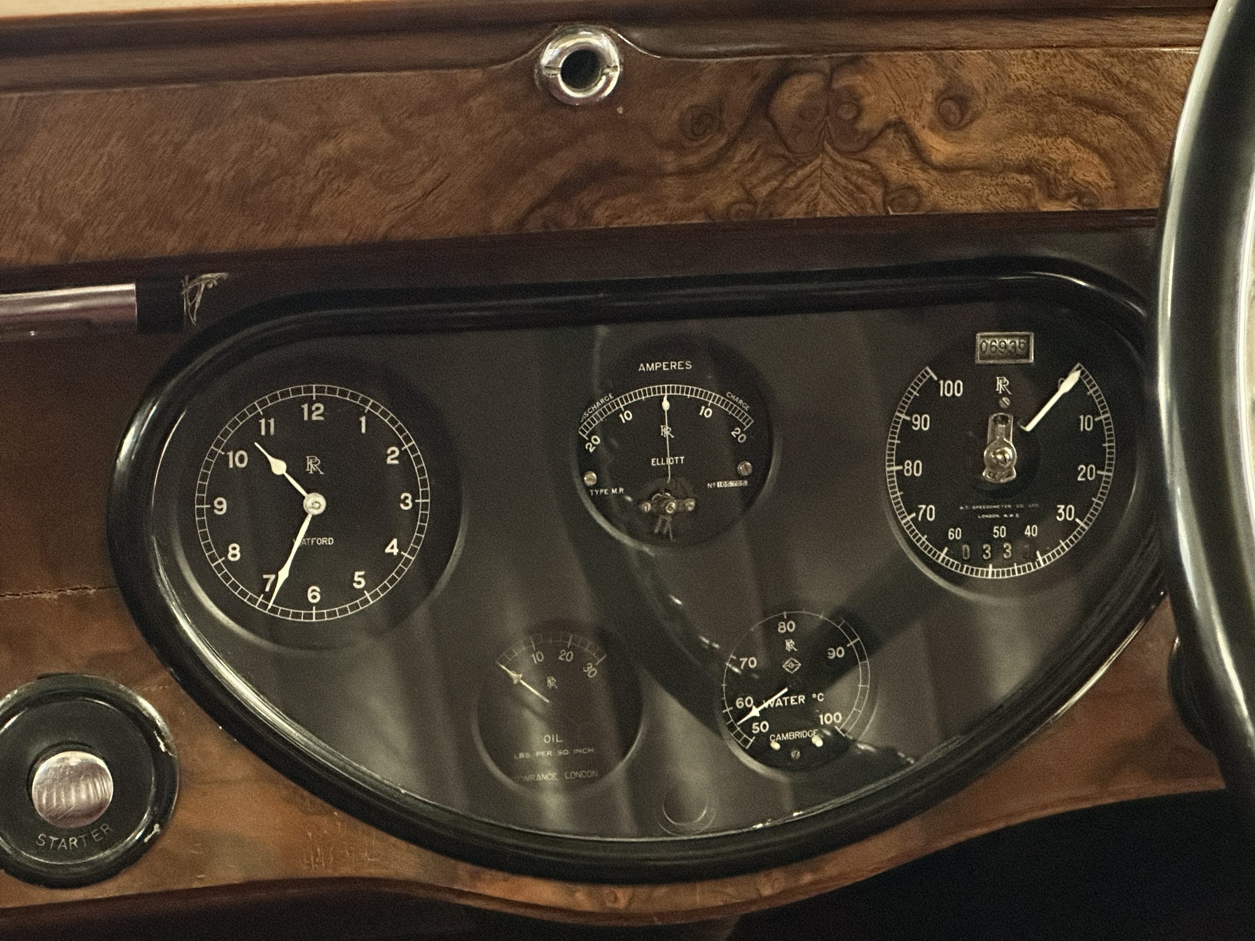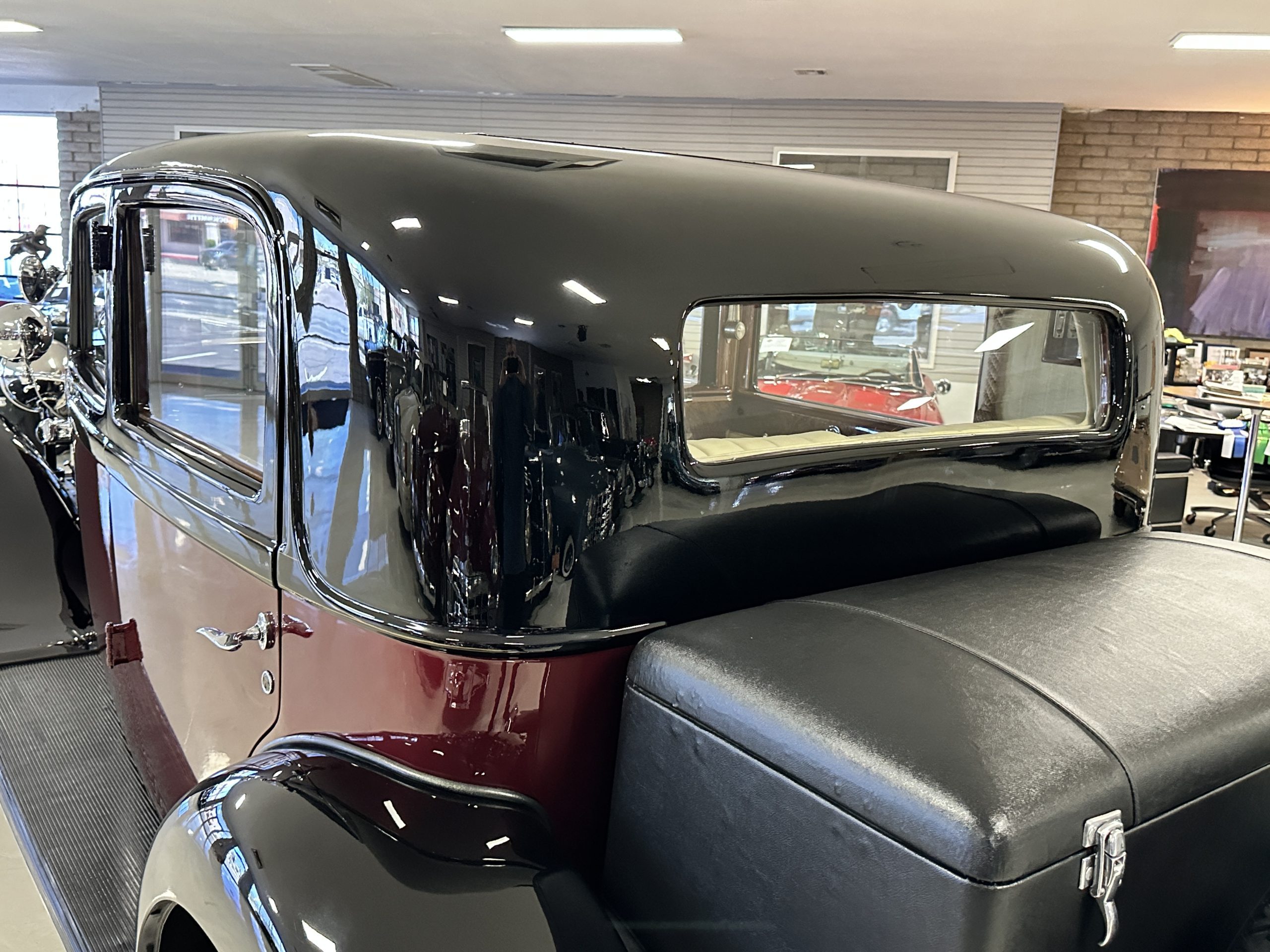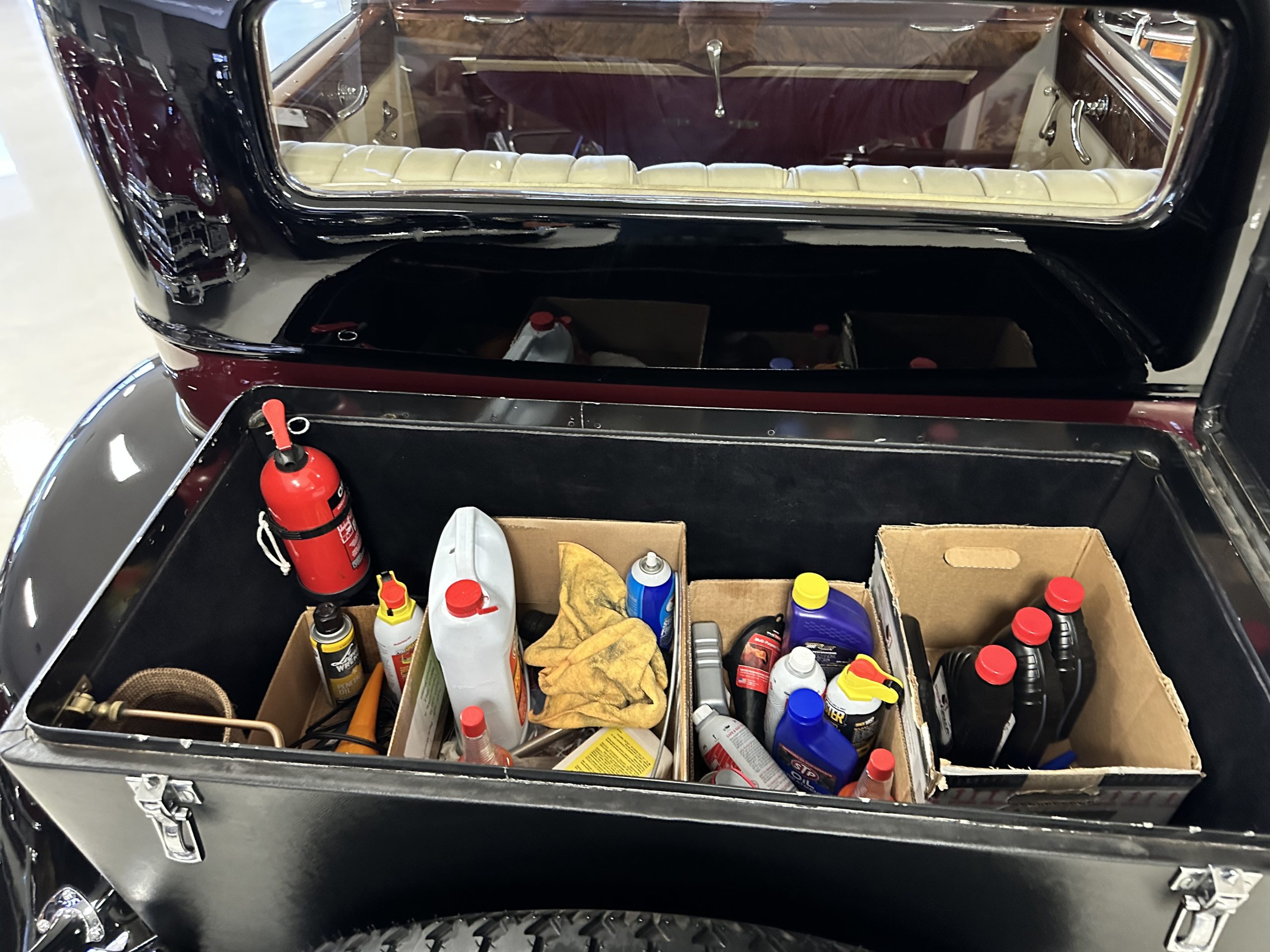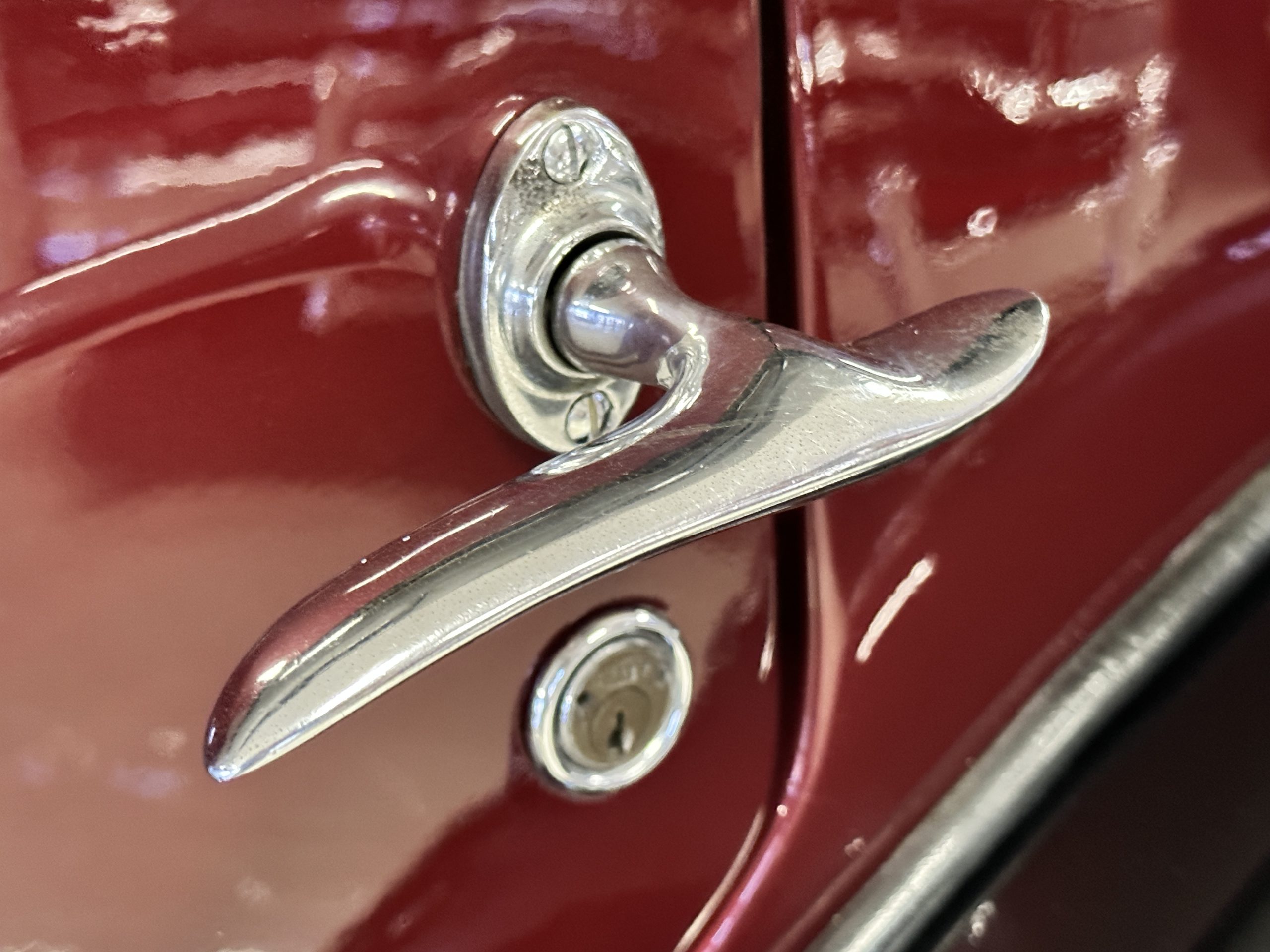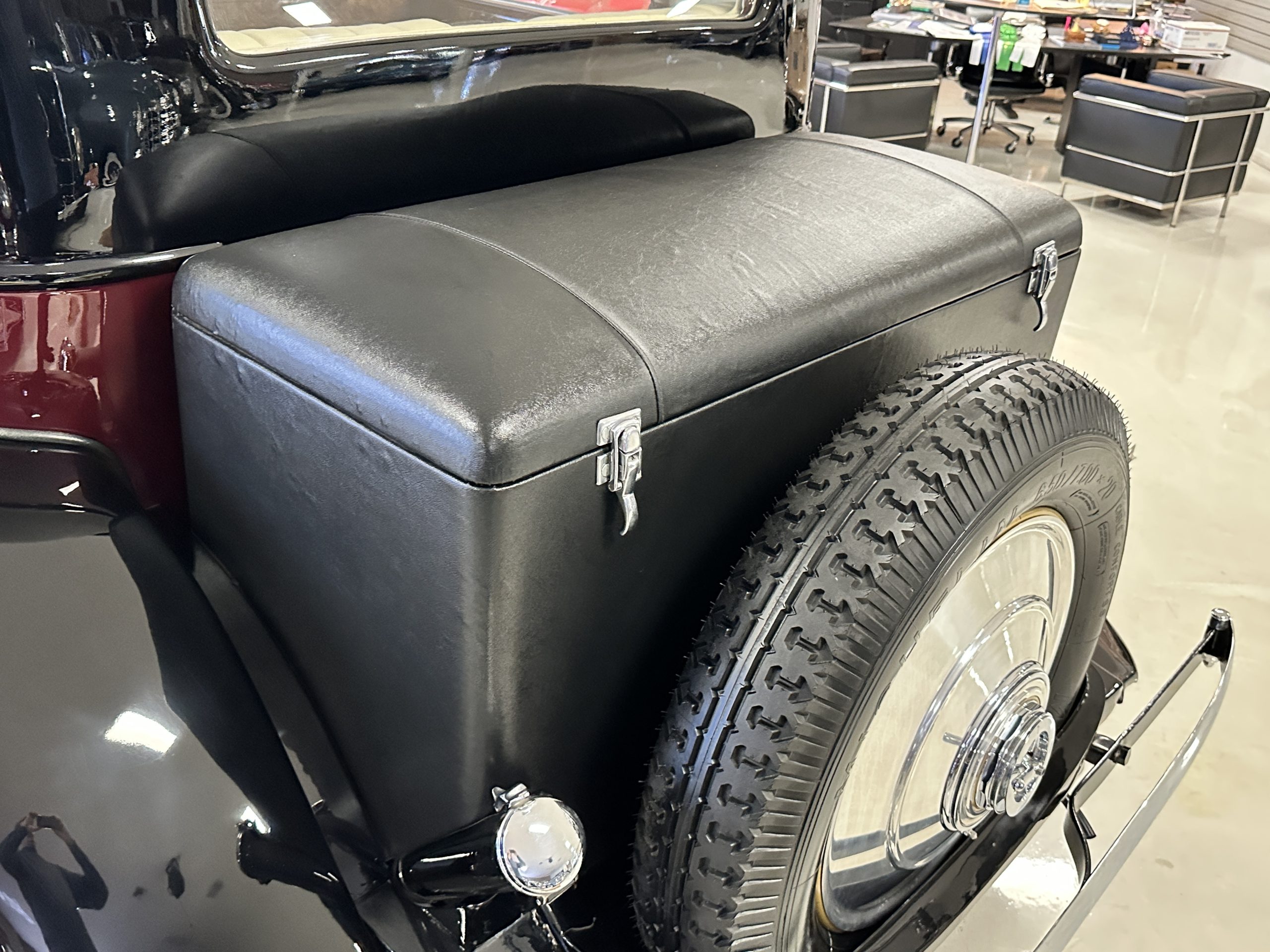 The livery is in two tone Black and Burgundy that is in very good condition with excellent shine and luster. High use areas, such as near the hood and doors show some wear, but overall it is simply stunning. The Burgundy has a very slight luminescence that is only perceptible with direct sunlight, when it surprisingly comes to life. The chrome and stainless are in excellent condition. The polished Llamar wheel discs are new as are the new black walled Michelin tires. The everflex covered trunk is a fantastic look, making this elegant motorcar appear more as a sportscar. The distance from the windshield to the front of the iconic Rolls-Royce grill is about six feet, which is nearly the same length of the passenger compartment. The height of the center of the windshield is about 11 inches. These design proportions really hint towards a racy and sexy sports saloon. Thrupp & Maberly really got the design right.