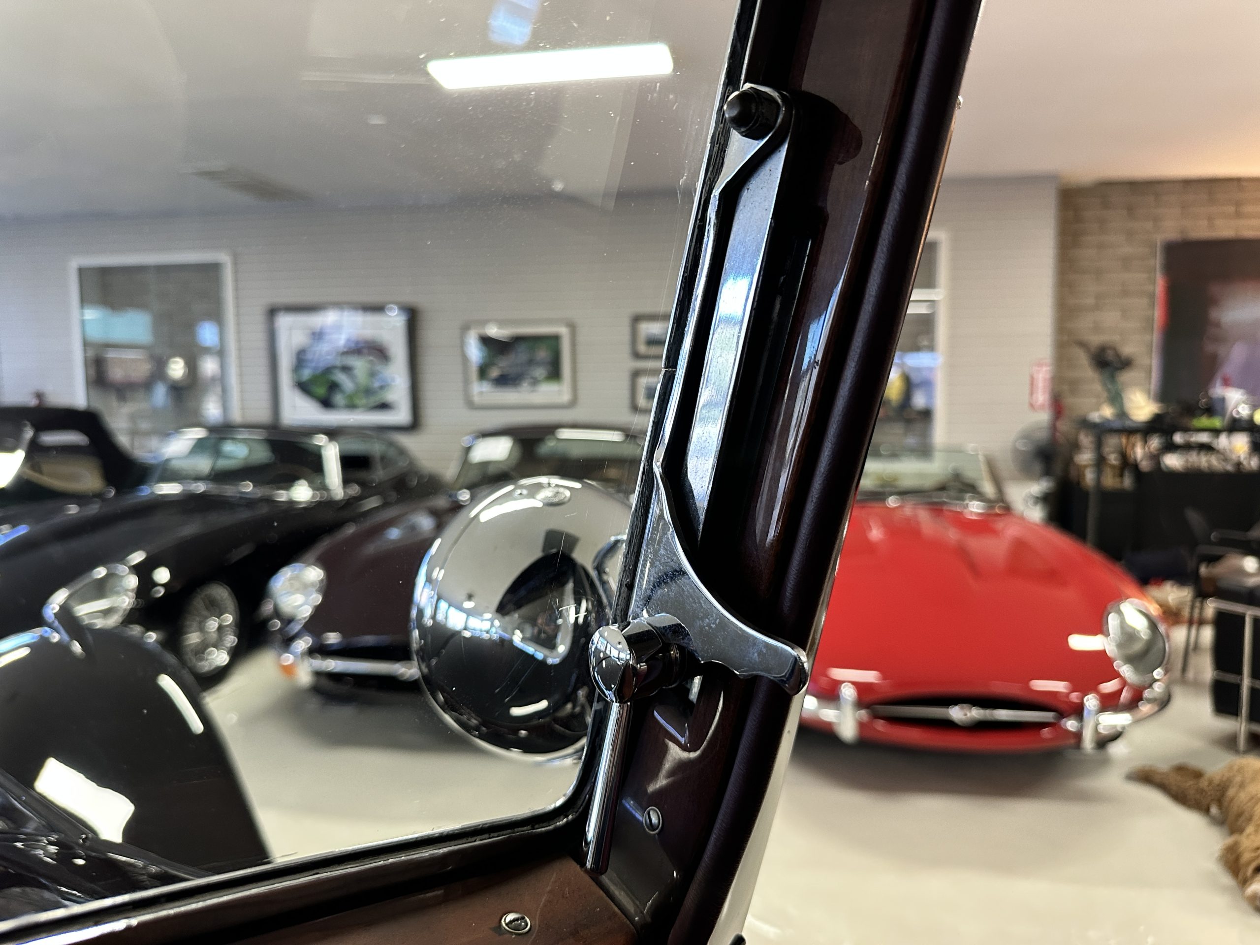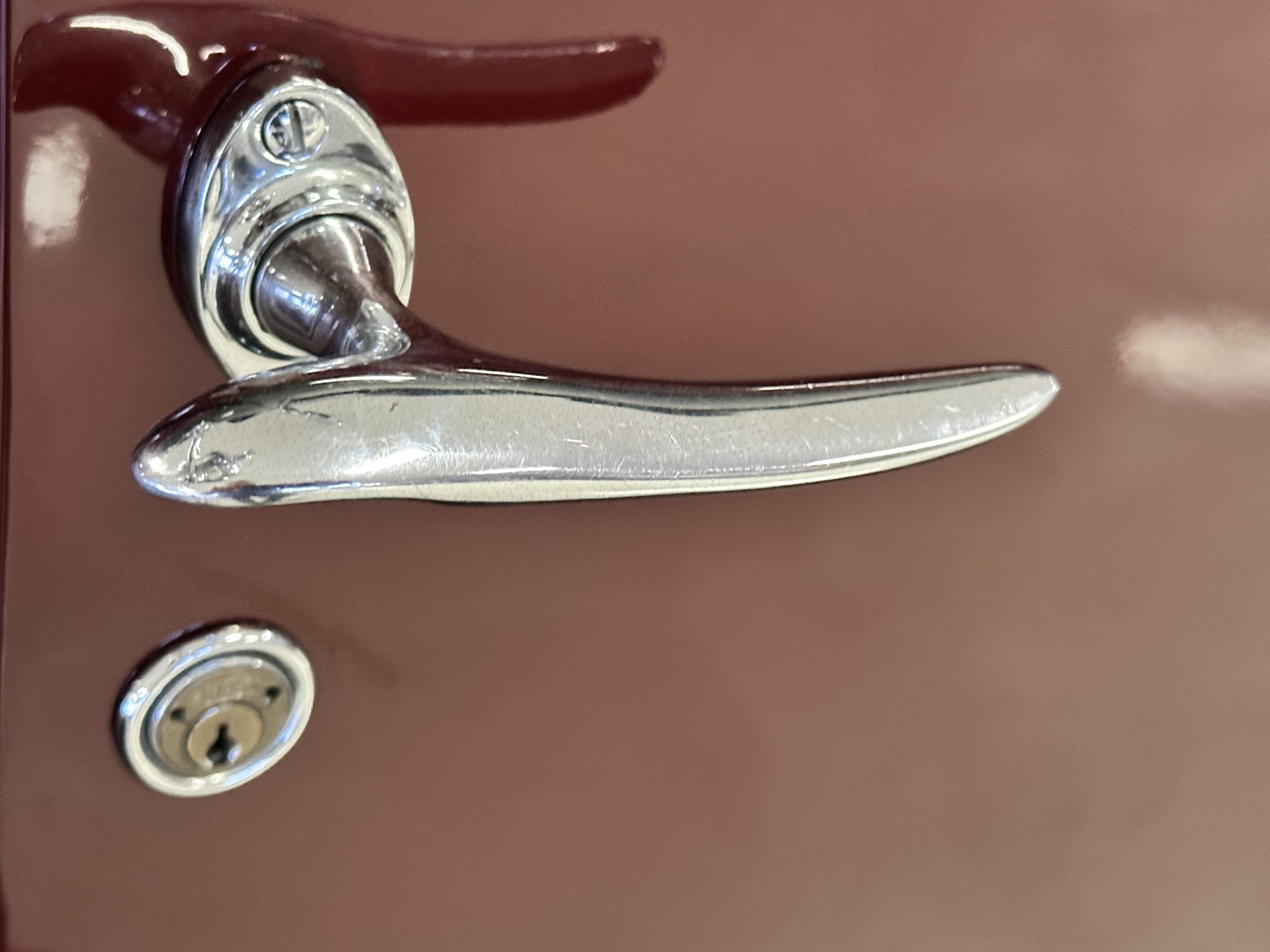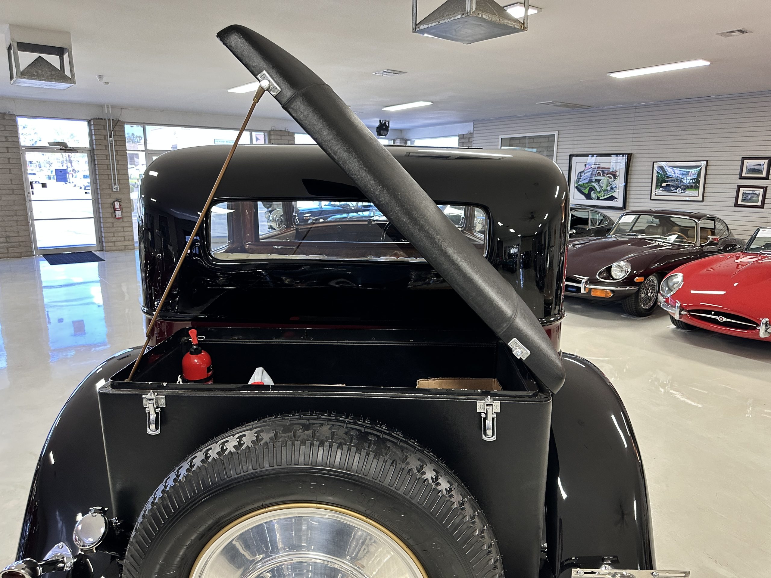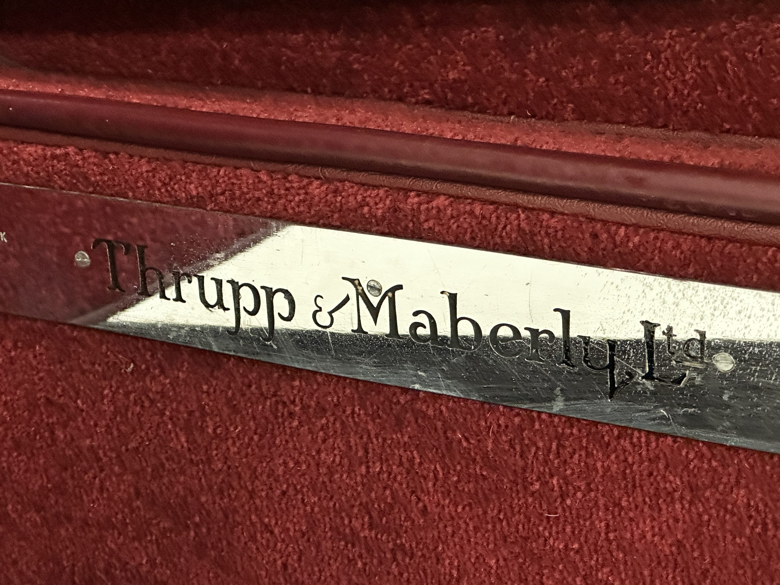 The livery is in two tone Black and Burgundy that is in very good condition with excellent shine and luster. High use areas, such as near the hood and doors show some wear, but overall it is simply stunning. The Burgundy has a very slight luminescence that is only perceptible with direct sunlight, when it surprisingly comes to life. The chrome and stainless are in excellent condition. The polished Llamar wheel discs are new as are the new black walled Michelin tires. The everflex covered trunk is a fantastic look, making this elegant motorcar appear more as a sportscar. The distance from the windshield to the front of the iconic Rolls-Royce grill is about six feet, which is nearly the same length of the passenger compartment. The height of the center of the windshield is about 11 inches. These design proportions really hint towards a racy and sexy sports saloon. Thrupp & Maberly really got the design right.