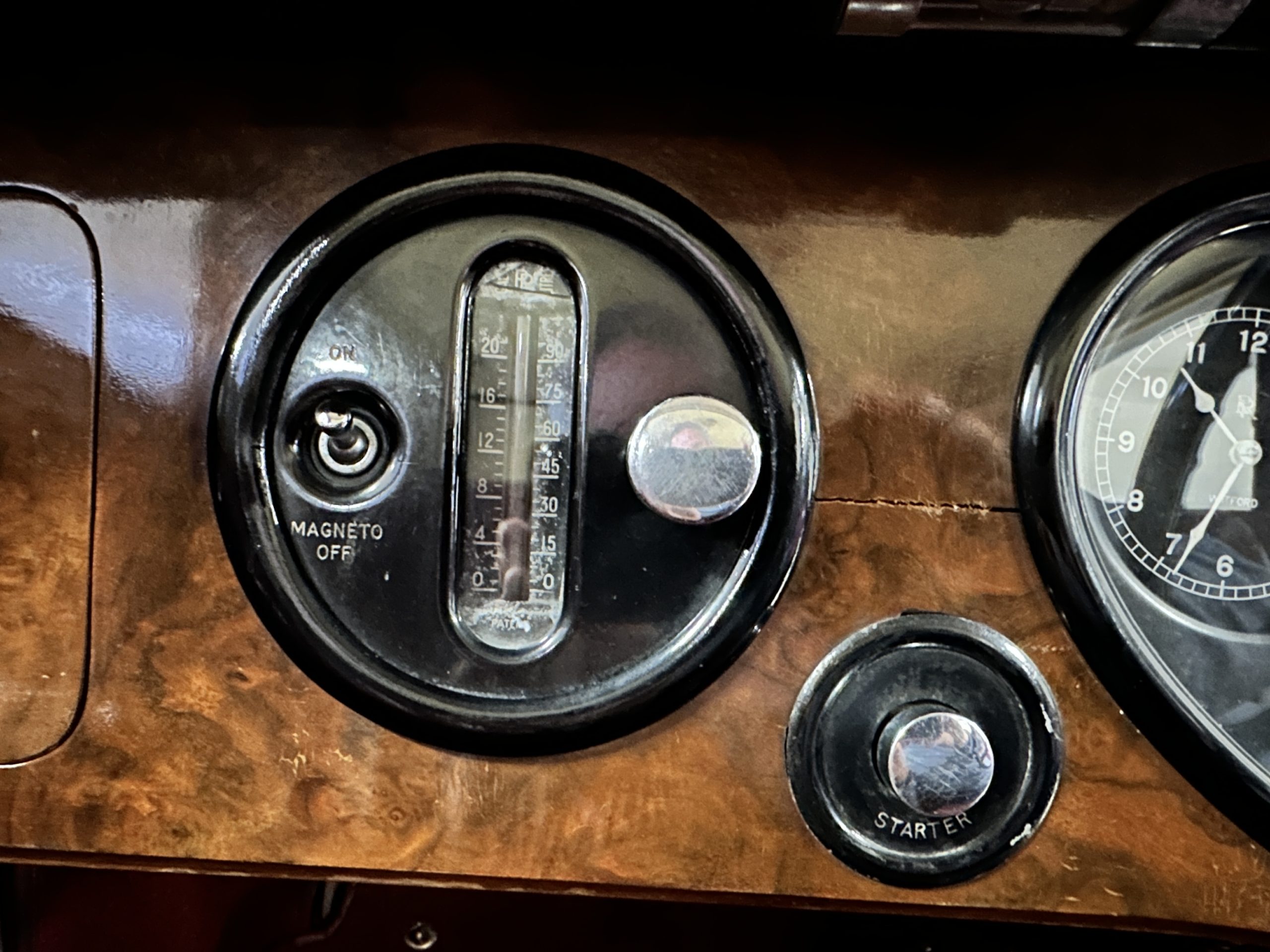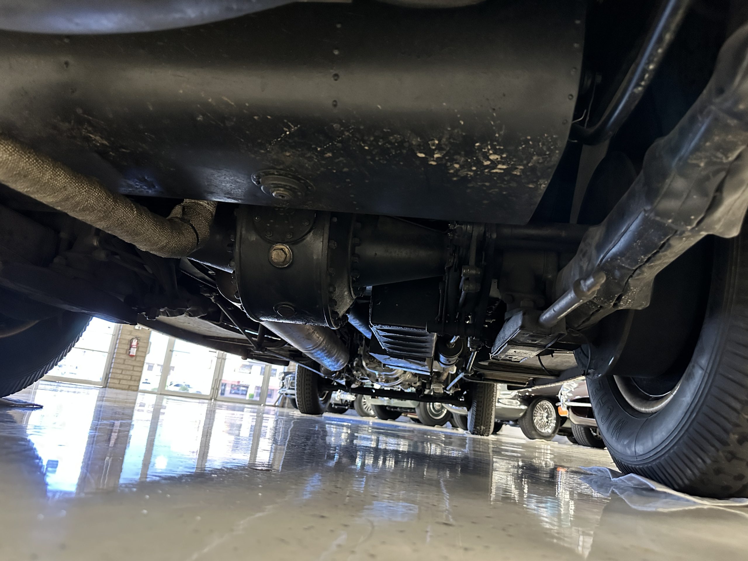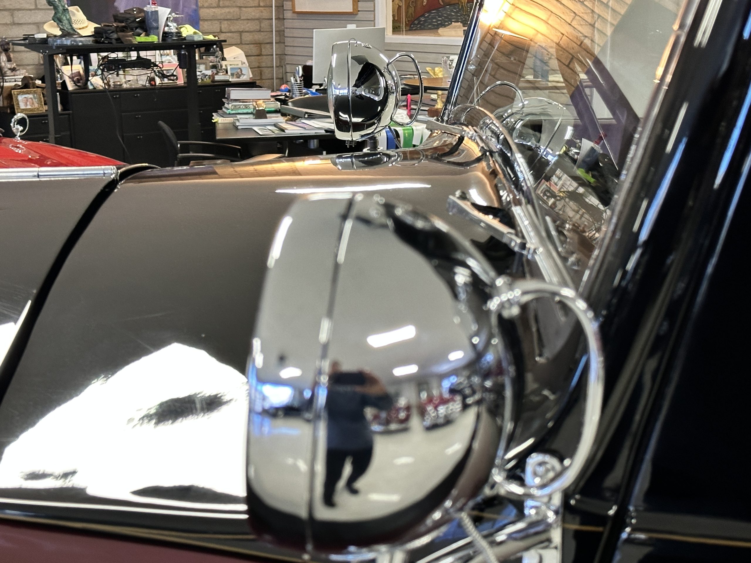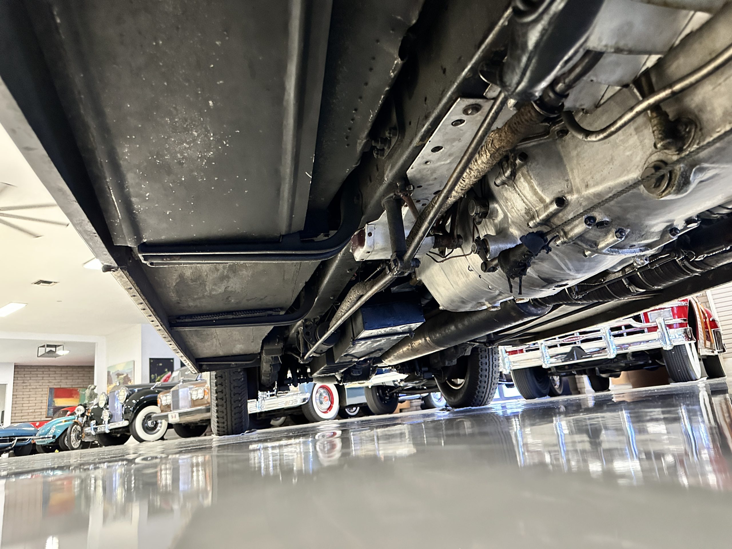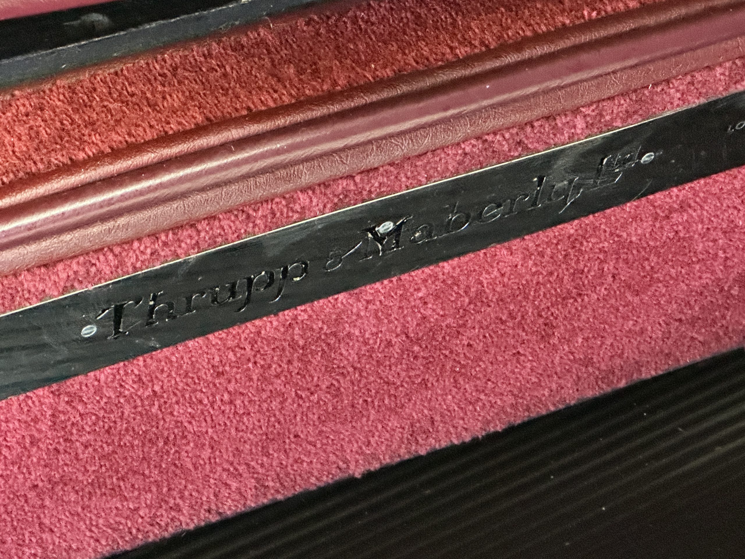 The livery is in two tone Black and Burgundy that is in very good condition with excellent shine and luster. High use areas, such as near the hood and doors show some wear, but overall it is simply stunning. The Burgundy has a very slight luminescence that is only perceptible with direct sunlight, when it surprisingly comes to life. The chrome and stainless are in excellent condition. The polished Llamar wheel discs are new as are the new black walled Michelin tires. The everflex covered trunk is a fantastic look, making this elegant motorcar appear more as a sportscar. The distance from the windshield to the front of the iconic Rolls-Royce grill is about six feet, which is nearly the same length of the passenger compartment. The height of the center of the windshield is about 11 inches. These design proportions really hint towards a racy and sexy sports saloon. Thrupp & Maberly really got the design right.