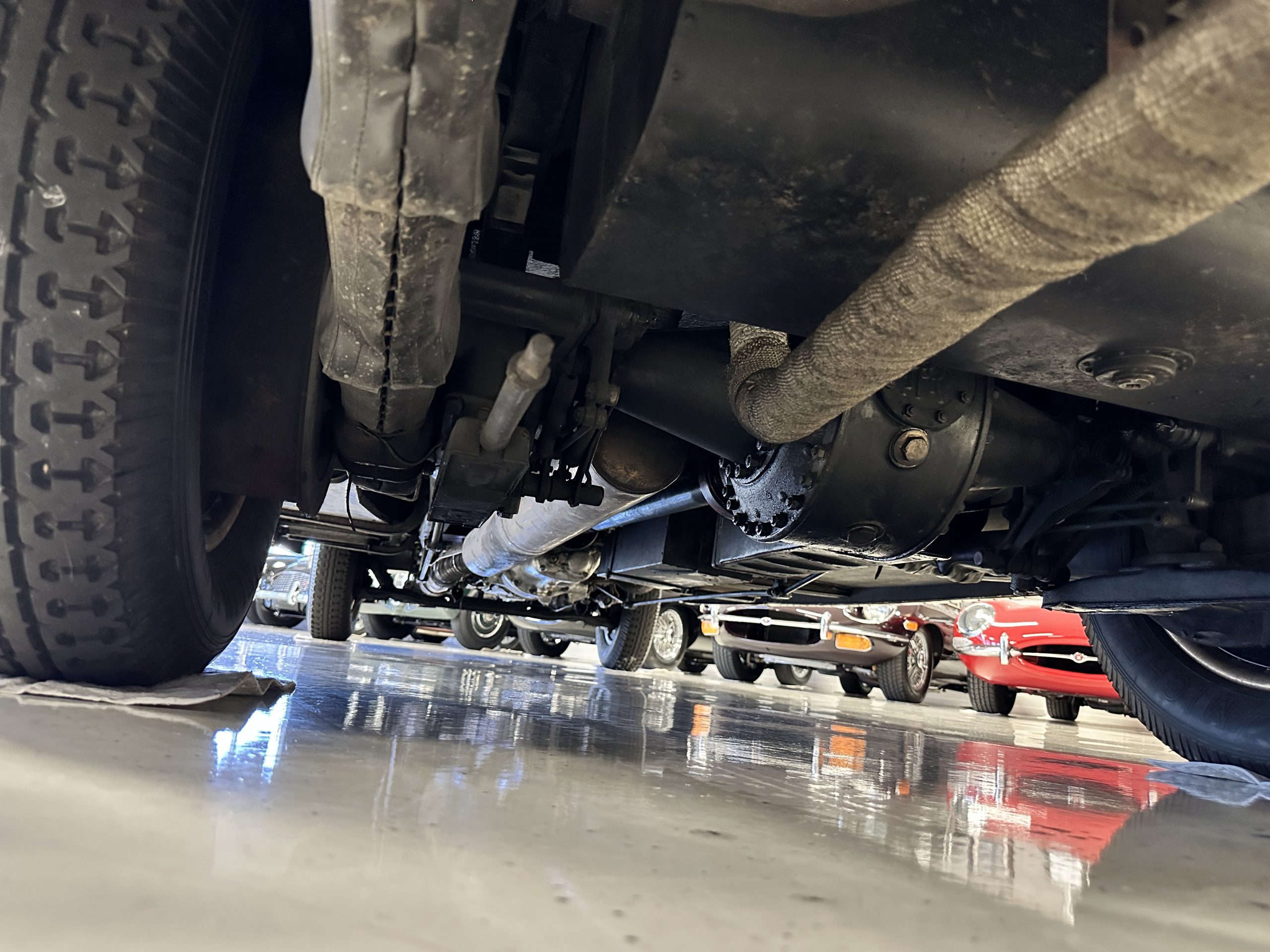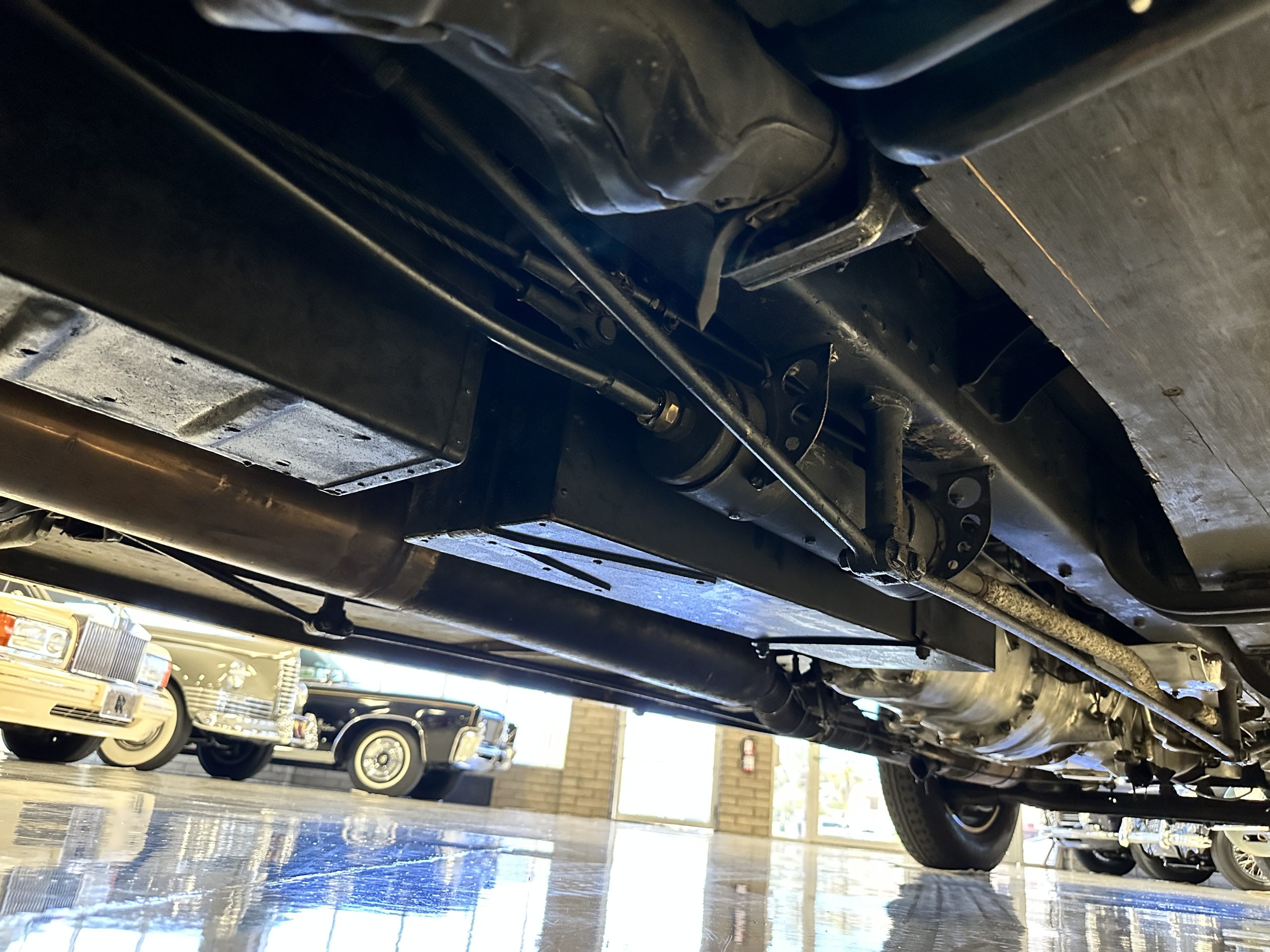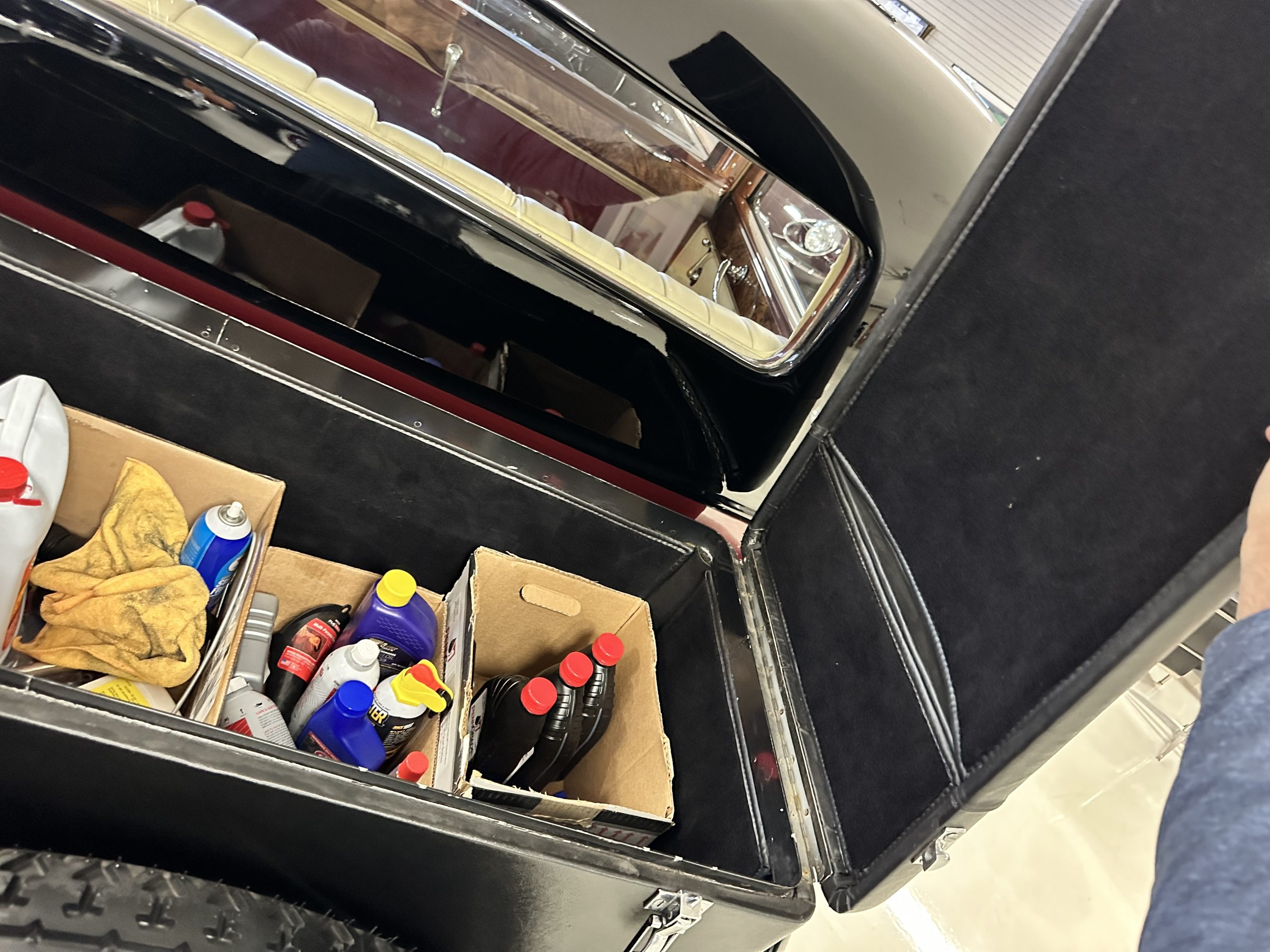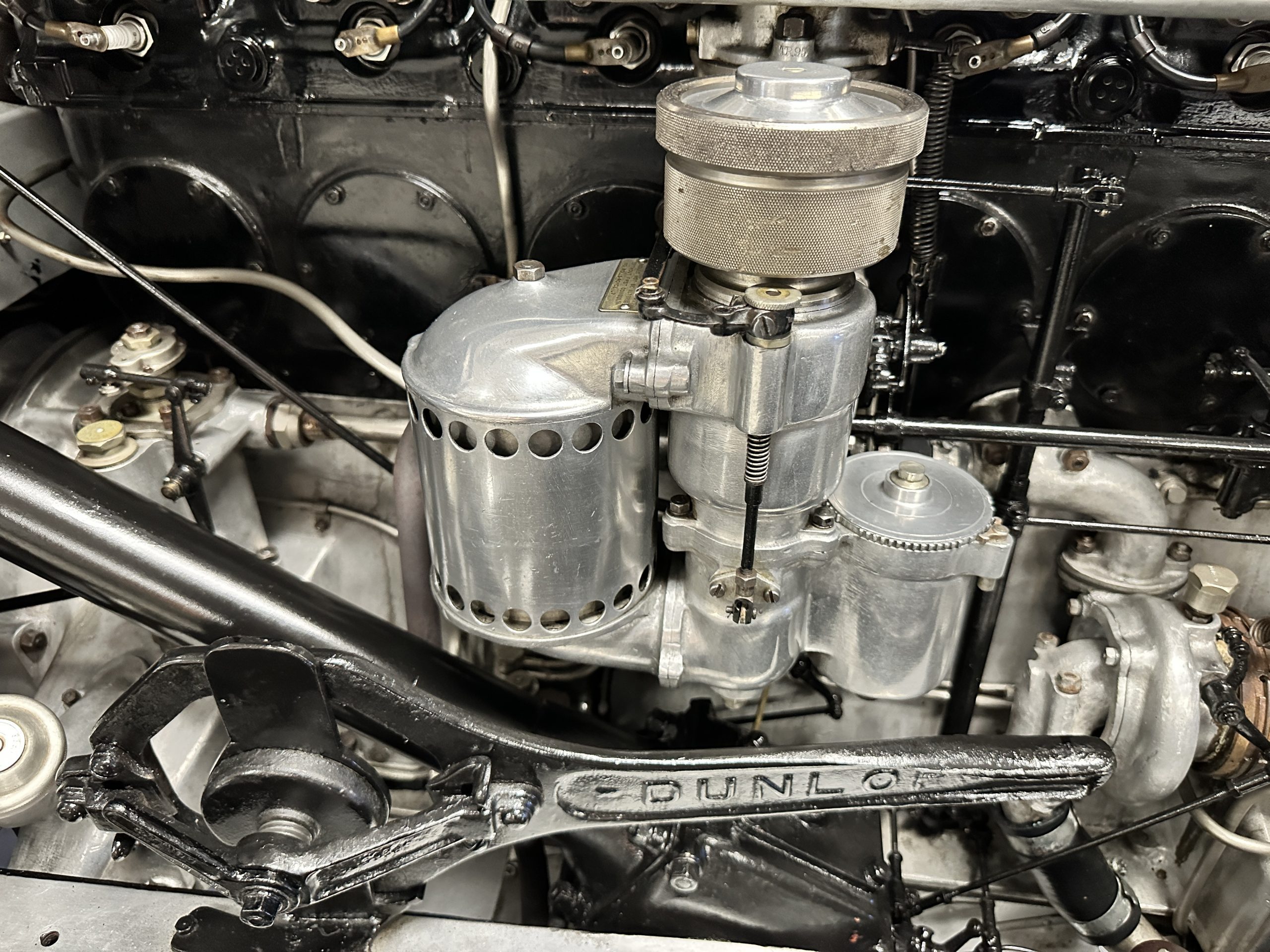The livery is in two tone Black and Burgundy that is in very good condition with excellent shine and luster. High use areas, such as near the hood and doors show some wear, but overall it is simply stunning. The Burgundy has a very slight luminescence that is only perceptible with direct sunlight, when it surprisingly comes to life. The chrome and stainless are in excellent condition. The polished Llamar wheel discs are new as are the new black walled Michelin tires. The everflex covered trunk is a fantastic look, making this elegant motorcar appear more as a sportscar. The distance from the windshield to the front of the iconic Rolls-Royce grill is about six feet, which is nearly the same length of the passenger compartment. The height of the center of the windshield is about 11 inches. These design proportions really hint towards a racy and sexy sports saloon. Thrupp & Maberly really got the design right.