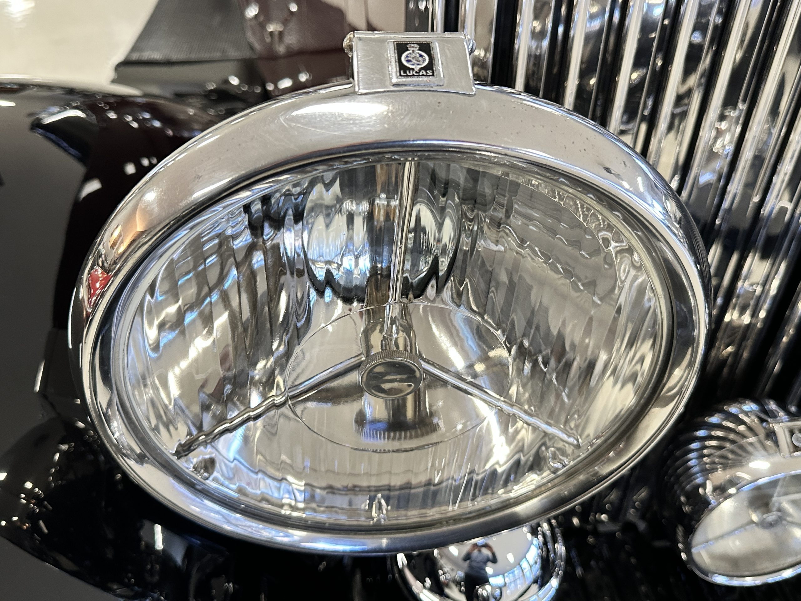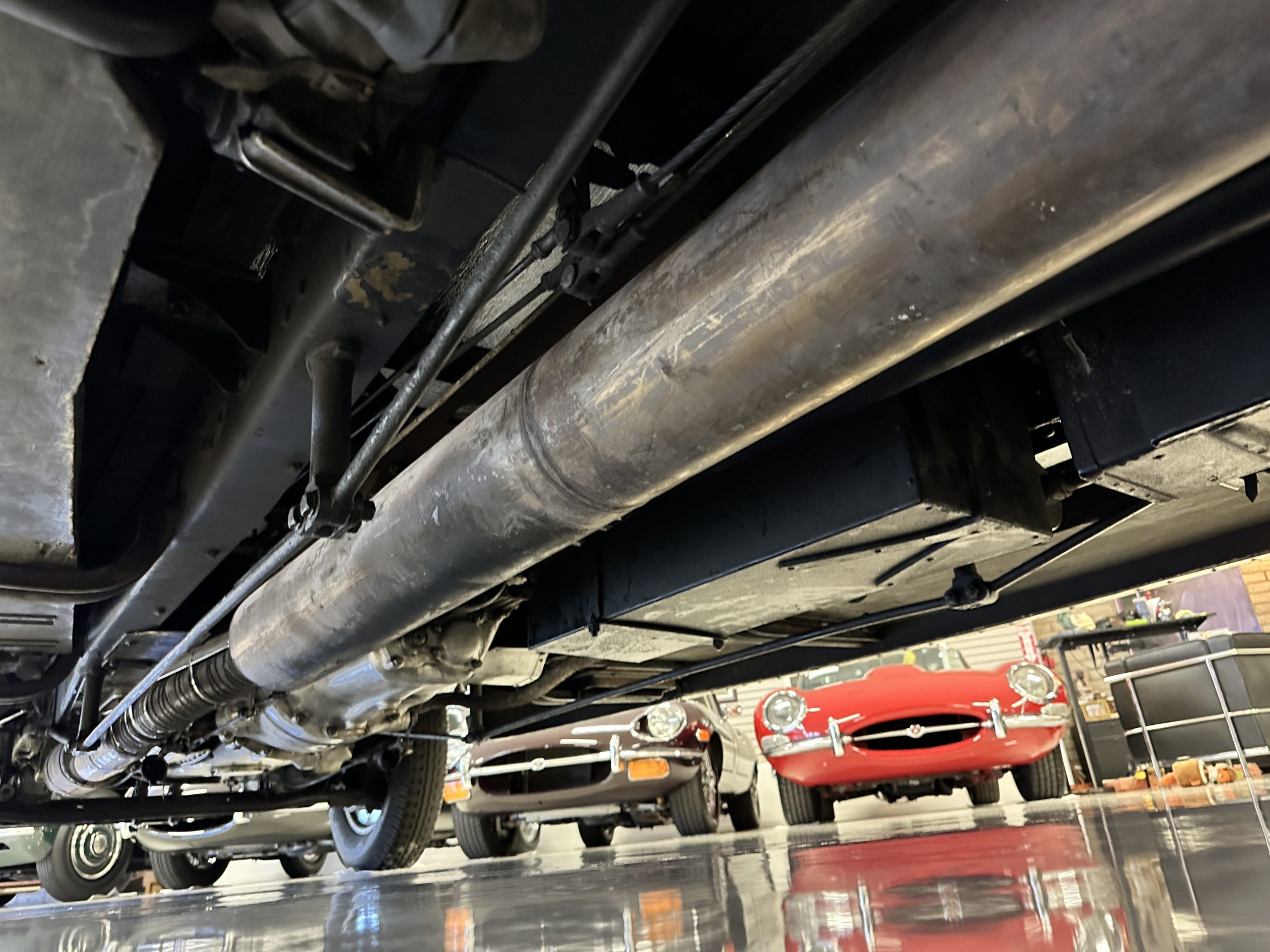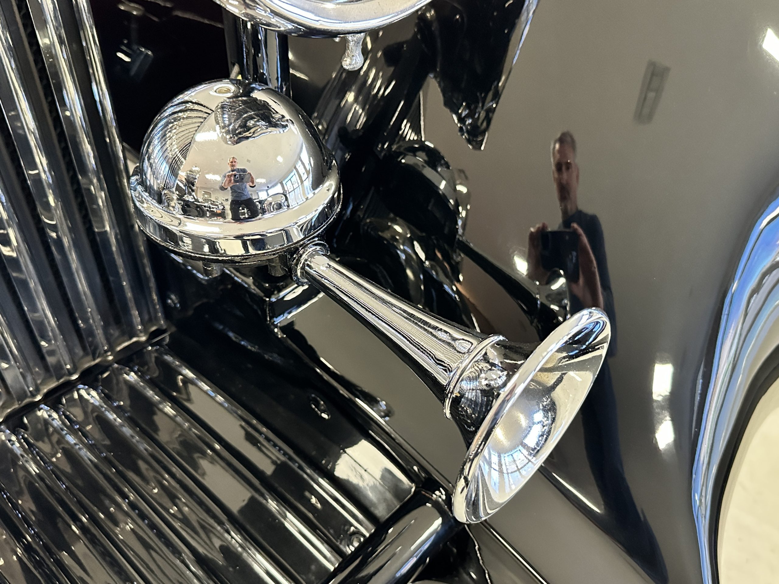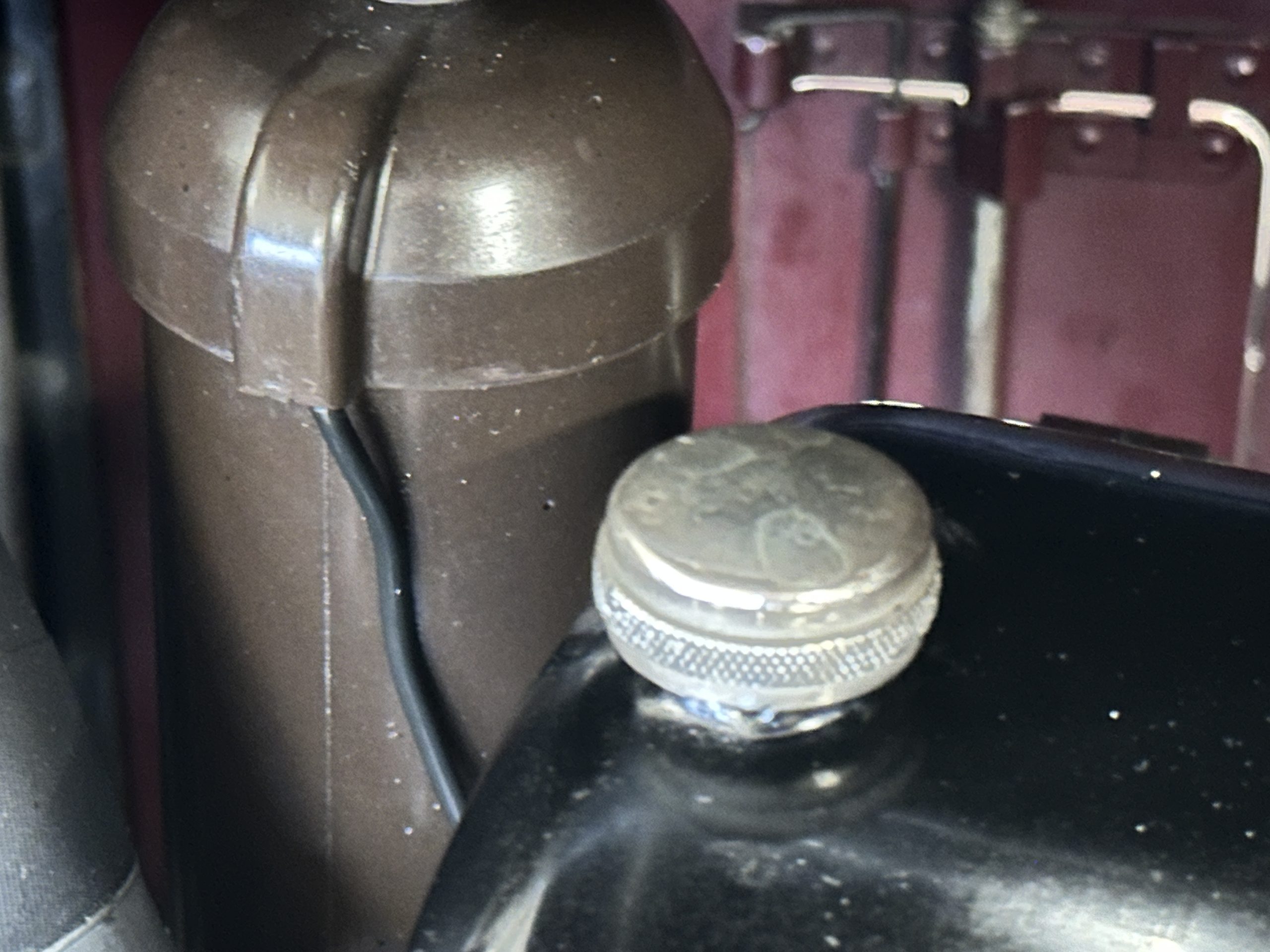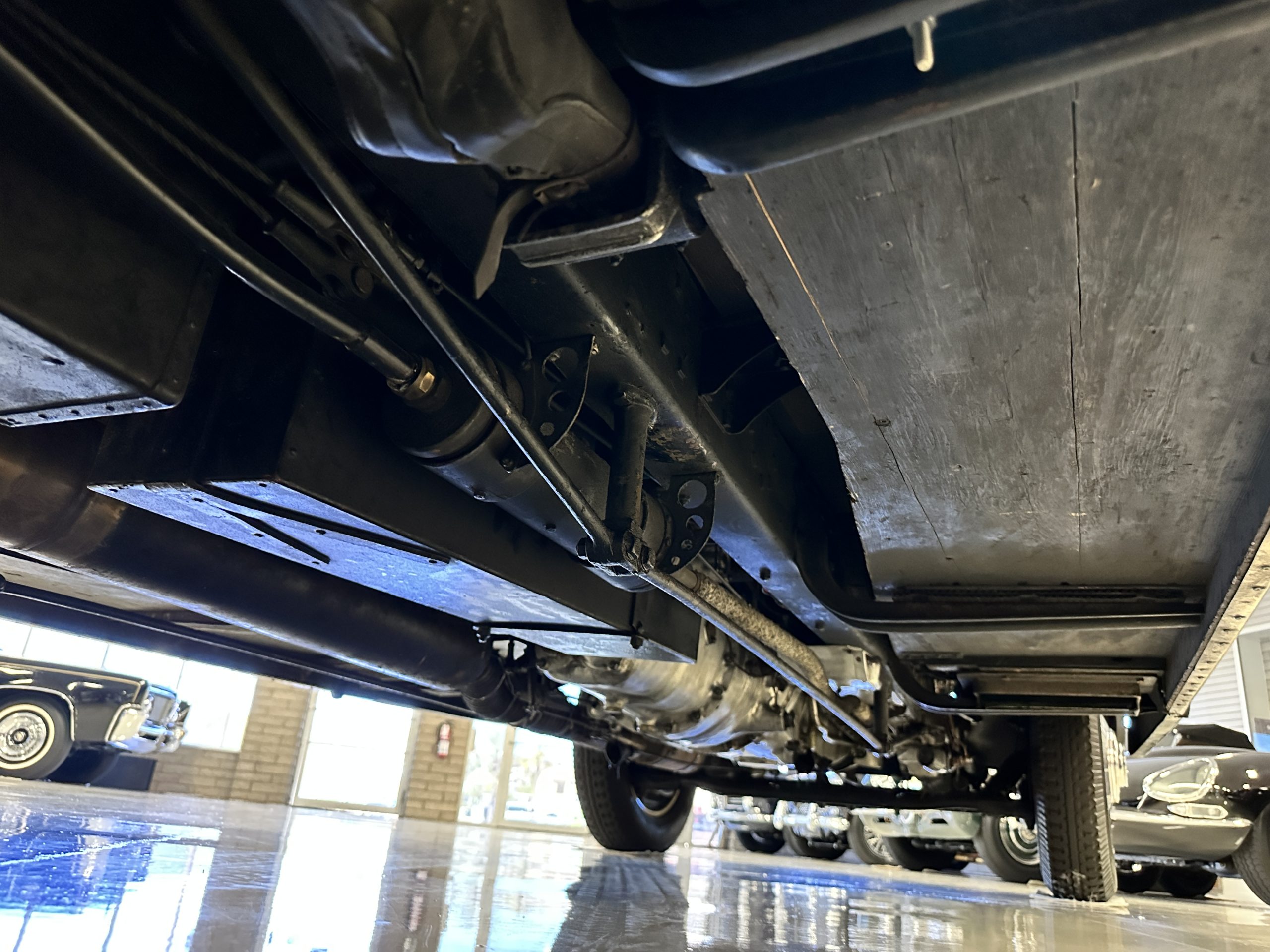 The livery is in two tone Black and Burgundy that is in very good condition with excellent shine and luster. High use areas, such as near the hood and doors show some wear, but overall it is simply stunning. The Burgundy has a very slight luminescence that is only perceptible with direct sunlight, when it surprisingly comes to life. The chrome and stainless are in excellent condition. The polished Llamar wheel discs are new as are the new black walled Michelin tires. The everflex covered trunk is a fantastic look, making this elegant motorcar appear more as a sportscar. The distance from the windshield to the front of the iconic Rolls-Royce grill is about six feet, which is nearly the same length of the passenger compartment. The height of the center of the windshield is about 11 inches. These design proportions really hint towards a racy and sexy sports saloon. Thrupp & Maberly really got the design right.