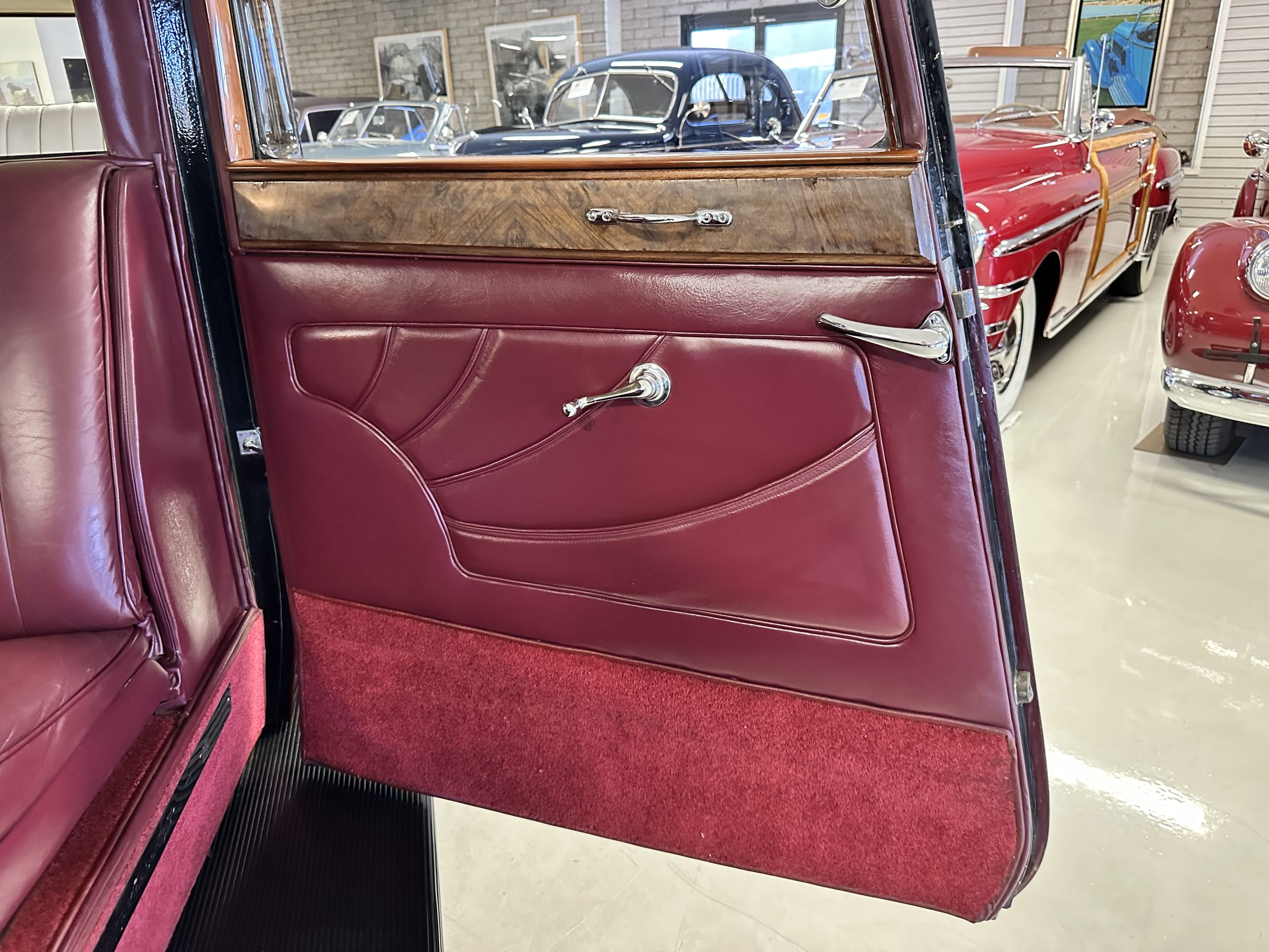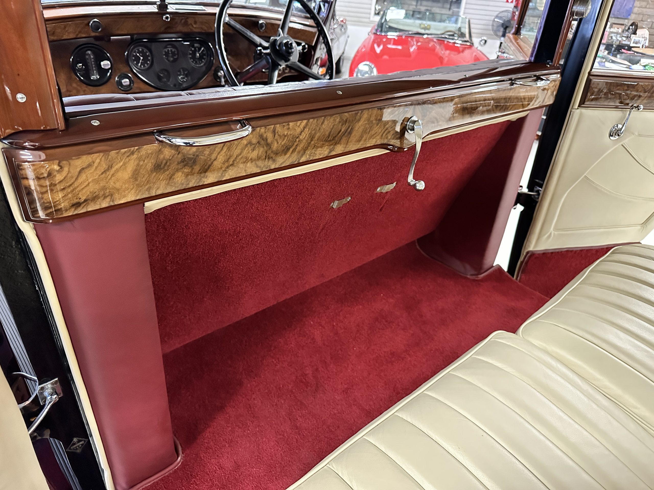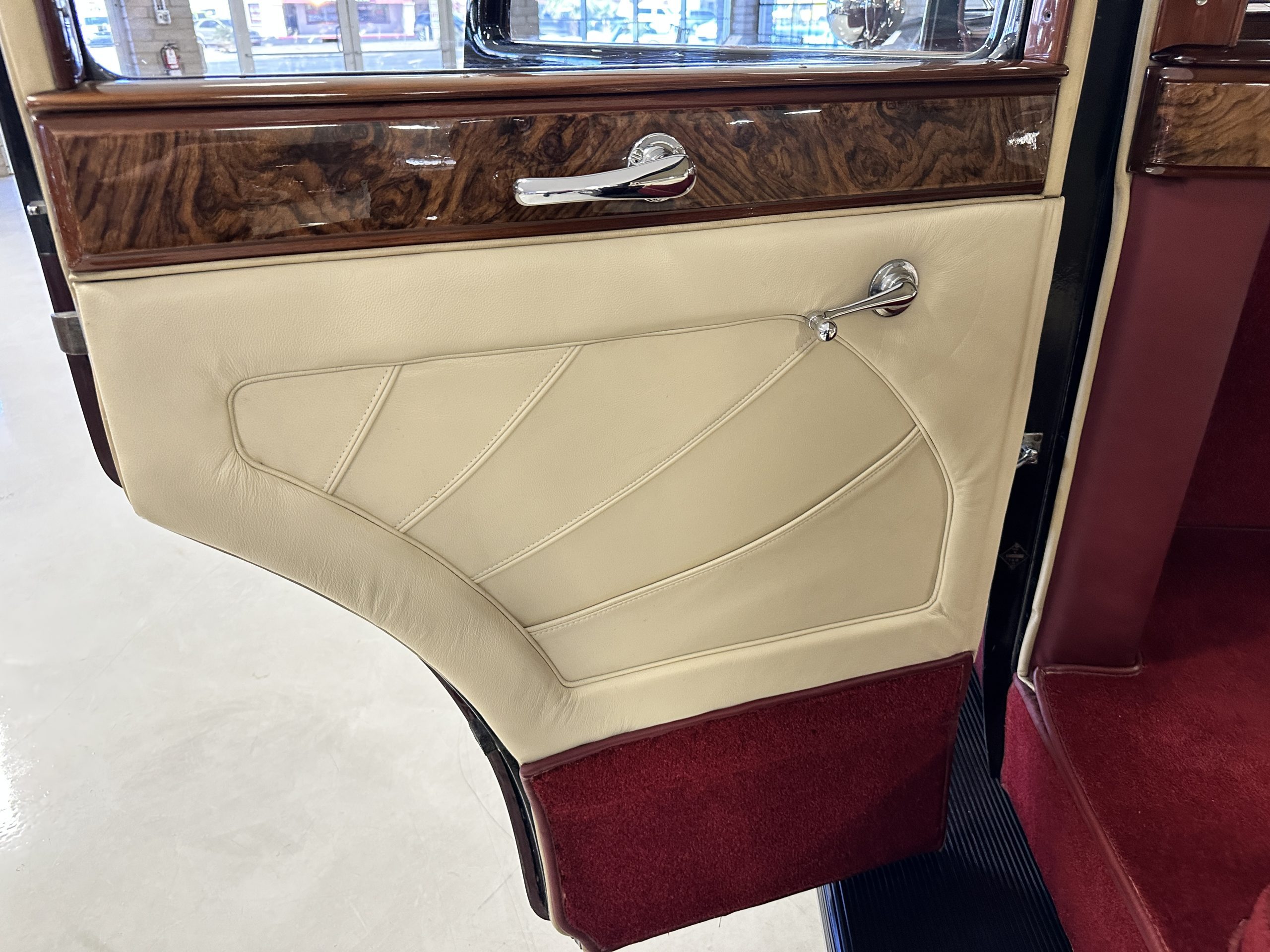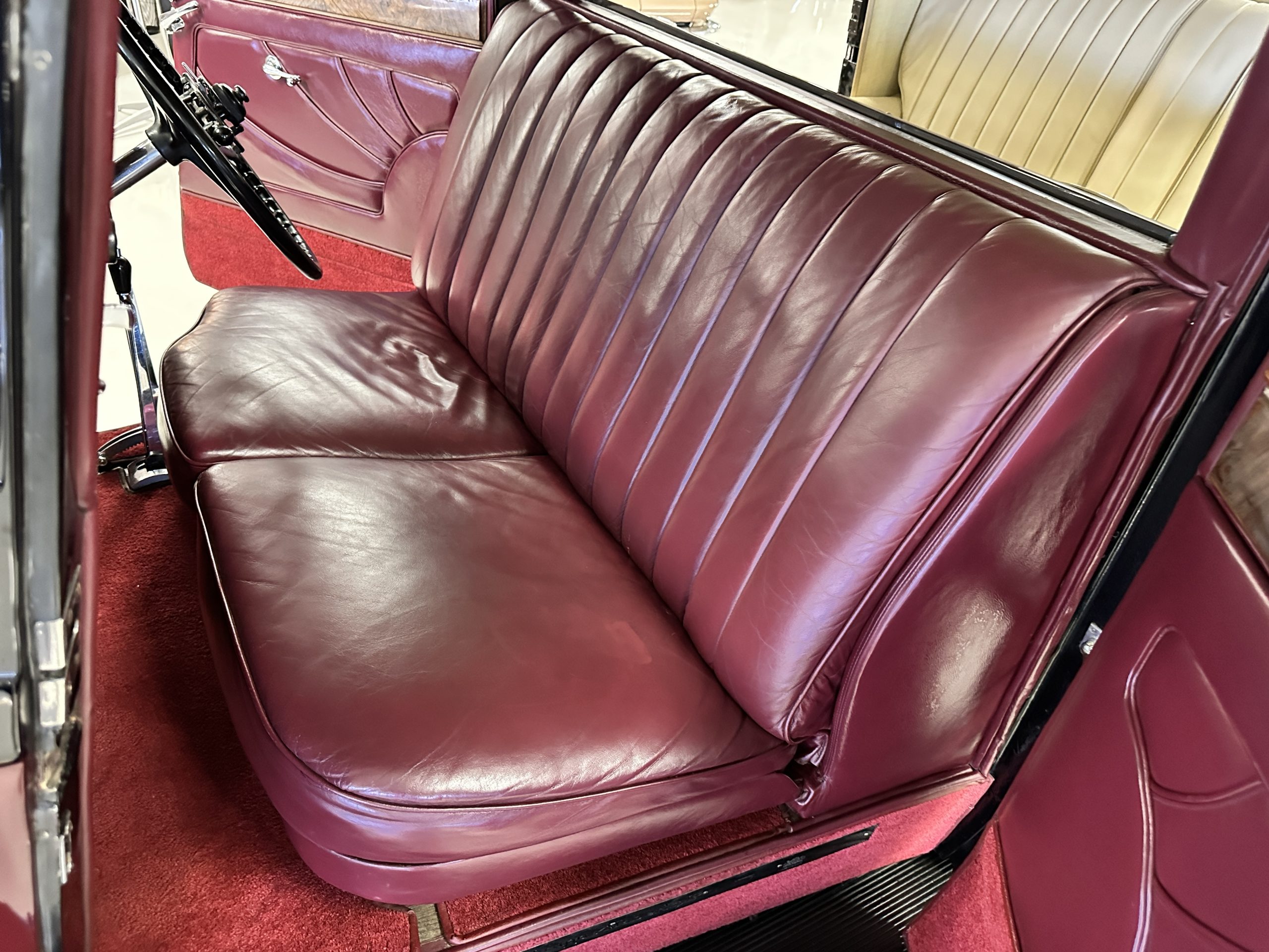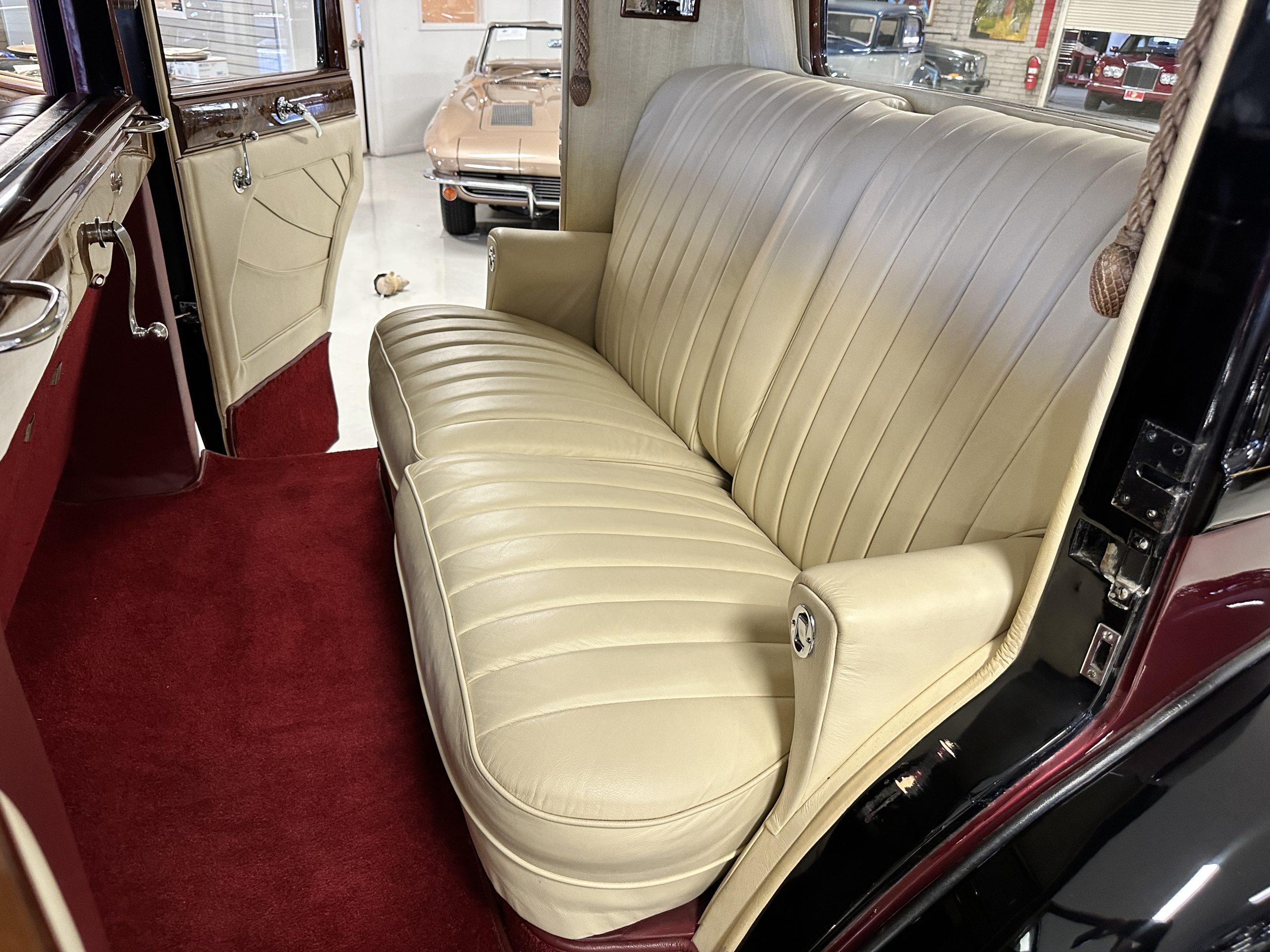 The interior is in overall excellent condition with its soft and supple Burgundy pleated Leather for the chauffeurs compartment, complemented with Burgundy Wilton wool carpeting and gorgeous burl wood and straight grained wood. There is some milking in the finish of the wood only in the front door cap panels. The Burgundy leather front door panels feature a starburst design that is reminiscent of art deco. The dashboard has a beautiful display of instruments and switches, including a wonderful Bakelite cigar lighter. The rear passenger compartment features soft and supple Cream Leather pleated hides and cream silk headlining. The Burgundy Wilton wool carpeting is nearly as new. The wood in the rear compartment is nearly perfect as well and is simply stunning. 160MS also features beautiful grab handles and mirrored vanities with cigar lighters. The rear door panels are Cream leather and also feature the stunning starburst design.