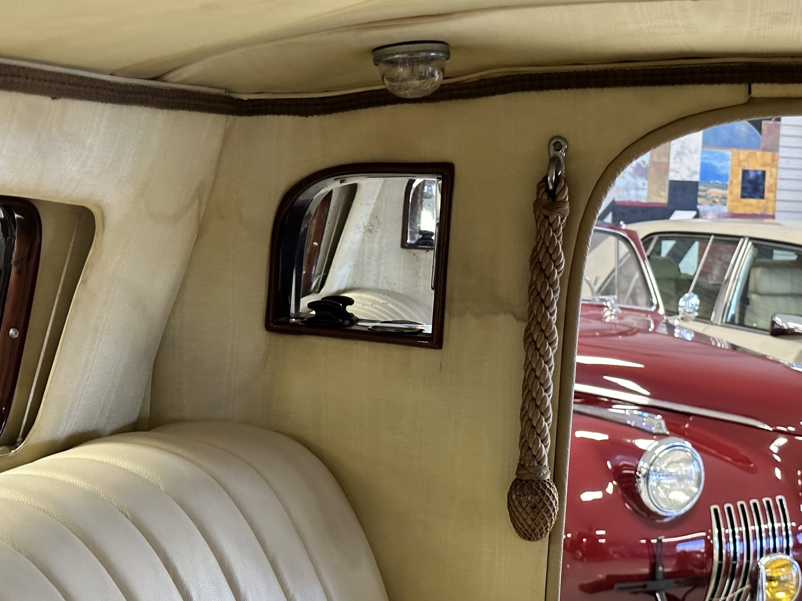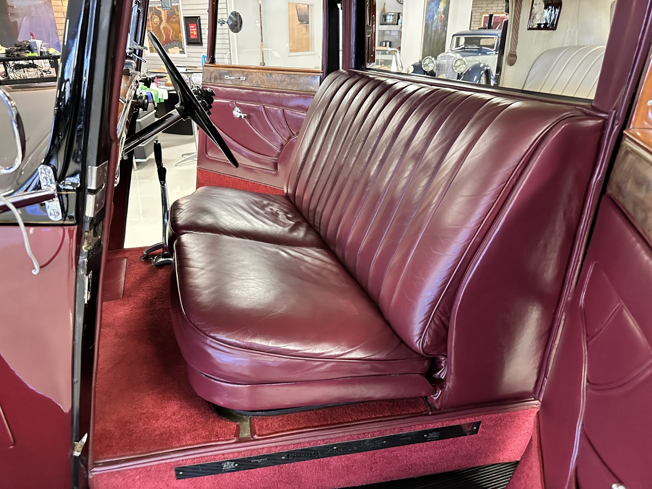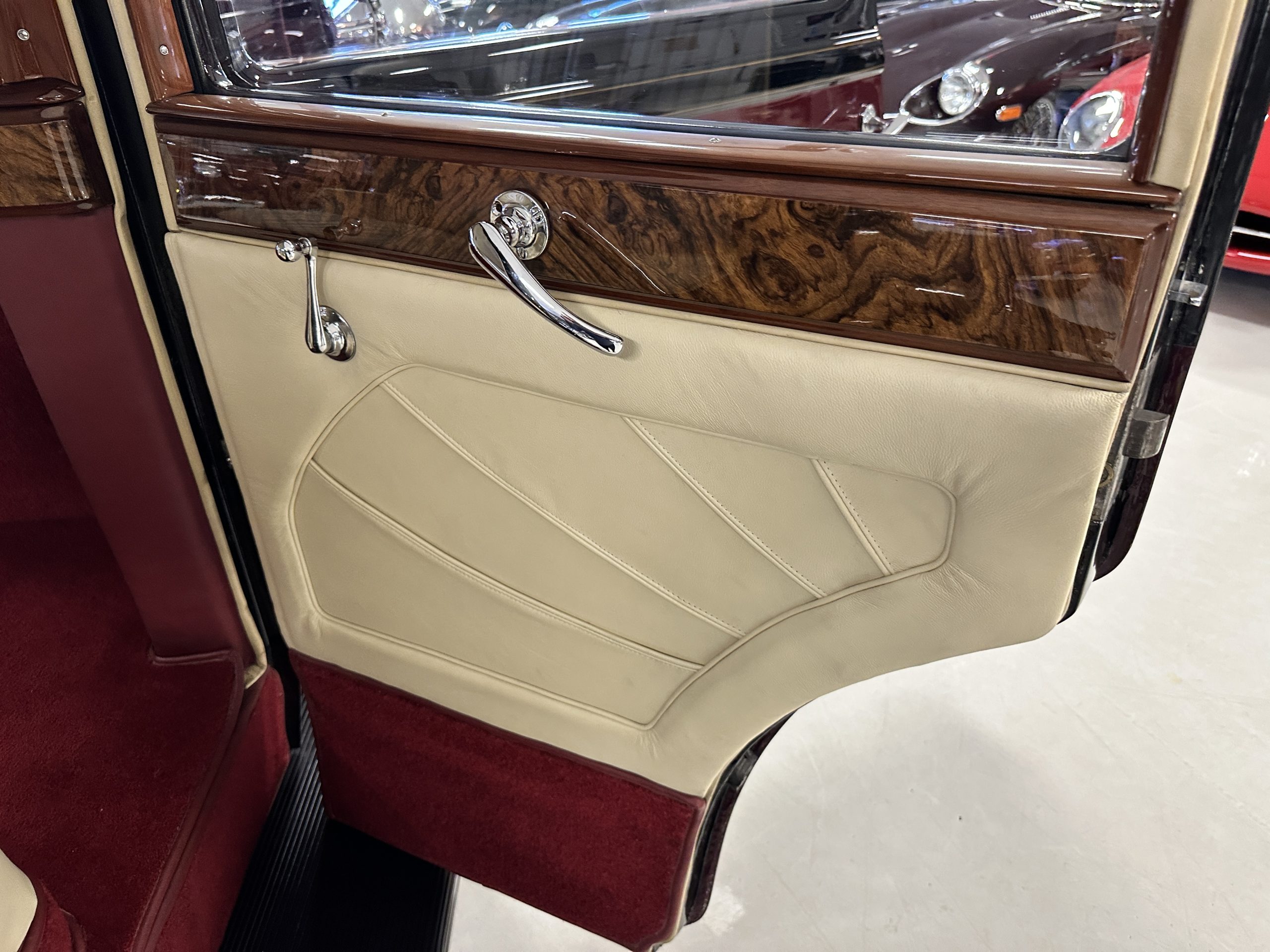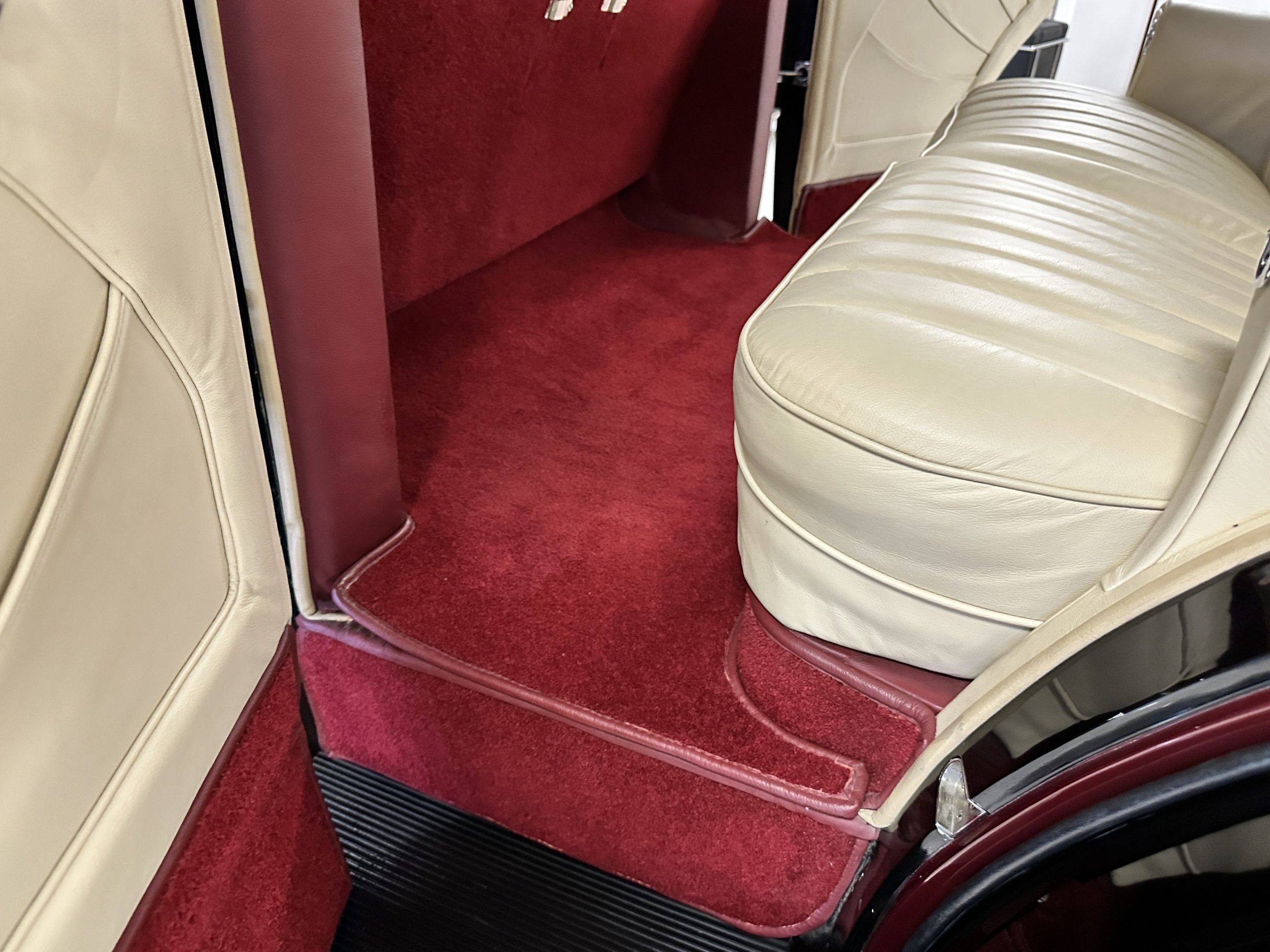 The interior is in overall excellent condition with its soft and supple Burgundy pleated Leather for the chauffeurs compartment, complemented with Burgundy Wilton wool carpeting and gorgeous burl wood and straight grained wood. There is some milking in the finish of the wood only in the front door cap panels. The Burgundy leather front door panels feature a starburst design that is reminiscent of art deco. The dashboard has a beautiful display of instruments and switches, including a wonderful Bakelite cigar lighter. The rear passenger compartment features soft and supple Cream Leather pleated hides and cream silk headlining. The Burgundy Wilton wool carpeting is nearly as new. The wood in the rear compartment is nearly perfect as well and is simply stunning. 160MS also features beautiful grab handles and mirrored vanities with cigar lighters. The rear door panels are Cream leather and also feature the stunning starburst design.