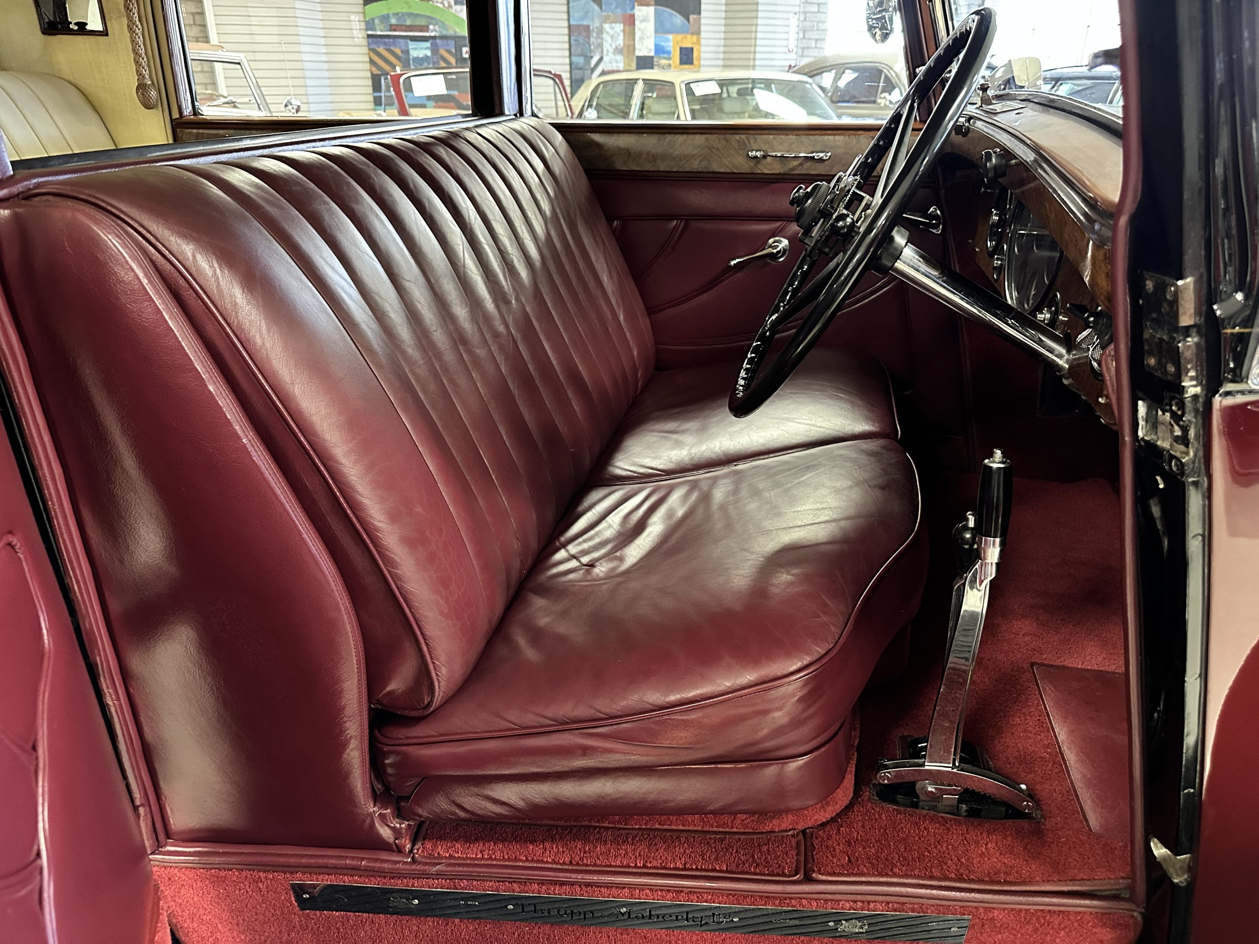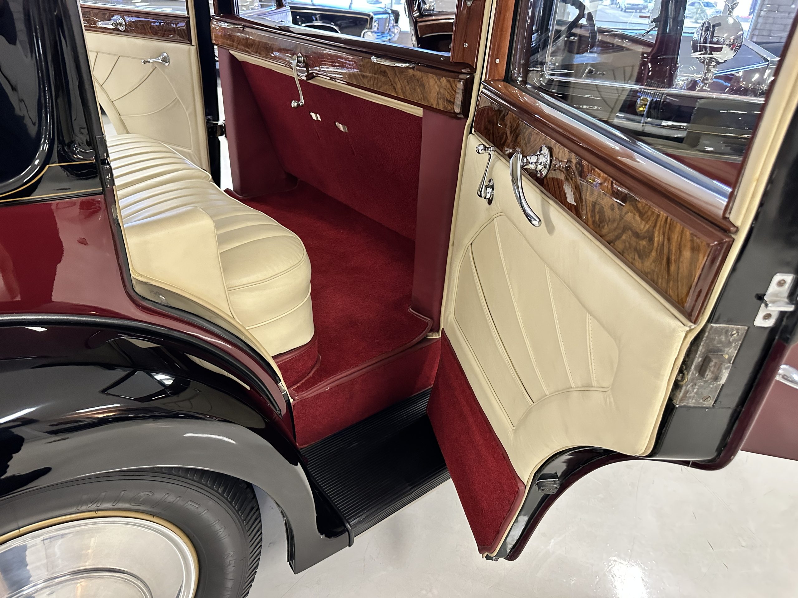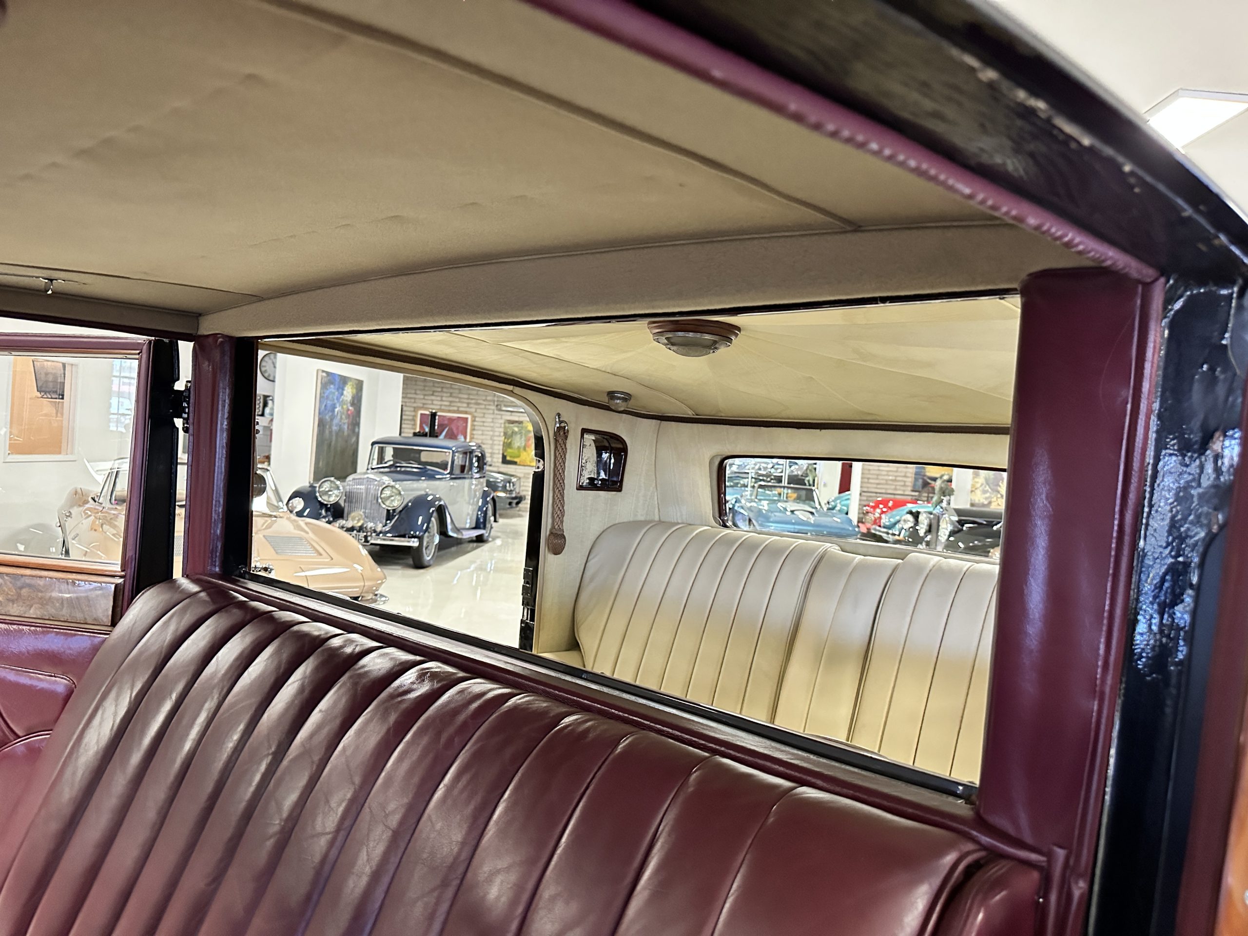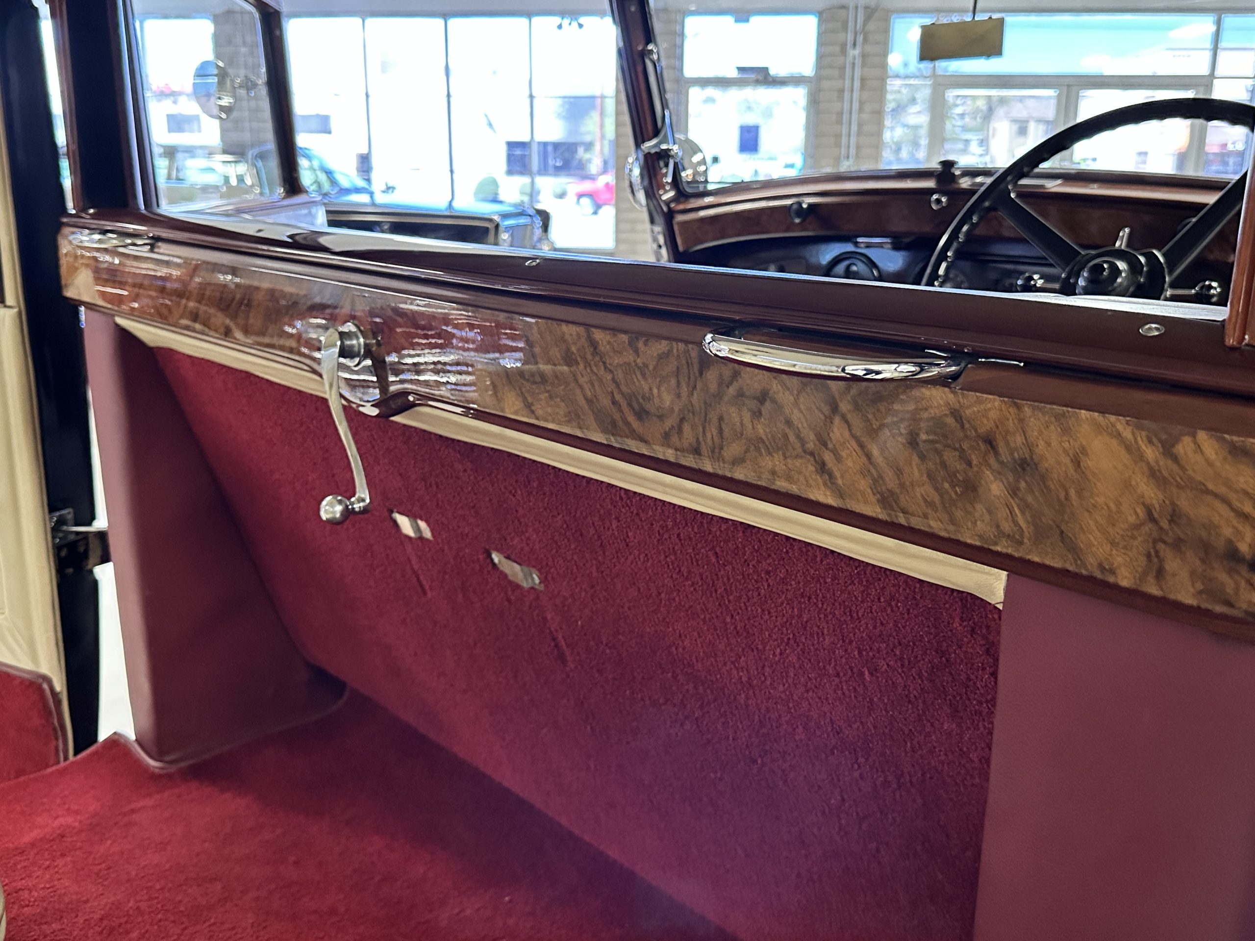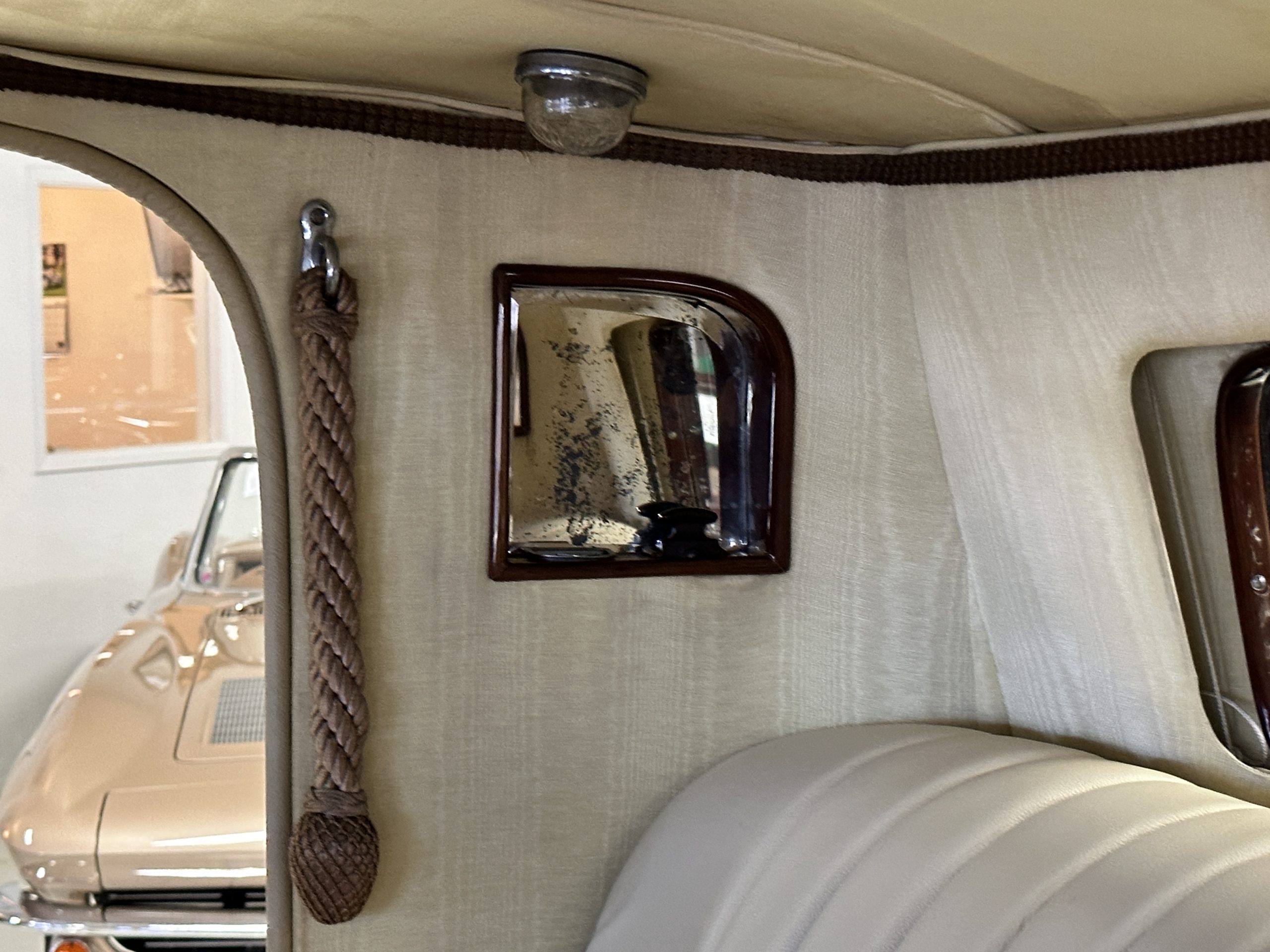 The interior is in overall excellent condition with its soft and supple Burgundy pleated Leather for the chauffeurs compartment, complemented with Burgundy Wilton wool carpeting and gorgeous burl wood and straight grained wood. There is some milking in the finish of the wood only in the front door cap panels. The Burgundy leather front door panels feature a starburst design that is reminiscent of art deco. The dashboard has a beautiful display of instruments and switches, including a wonderful Bakelite cigar lighter. The rear passenger compartment features soft and supple Cream Leather pleated hides and cream silk headlining. The Burgundy Wilton wool carpeting is nearly as new. The wood in the rear compartment is nearly perfect as well and is simply stunning. 160MS also features beautiful grab handles and mirrored vanities with cigar lighters. The rear door panels are Cream leather and also feature the stunning starburst design.