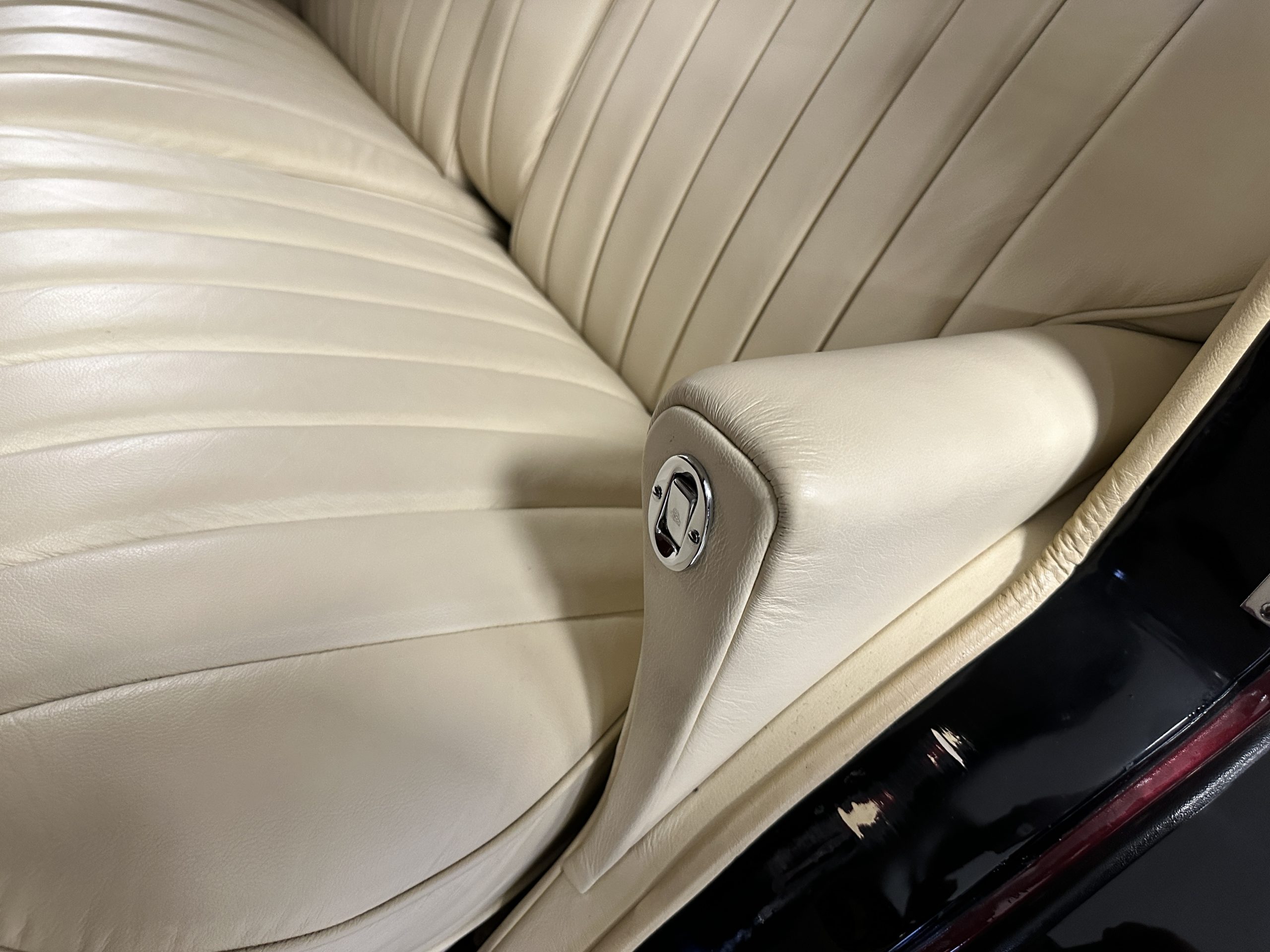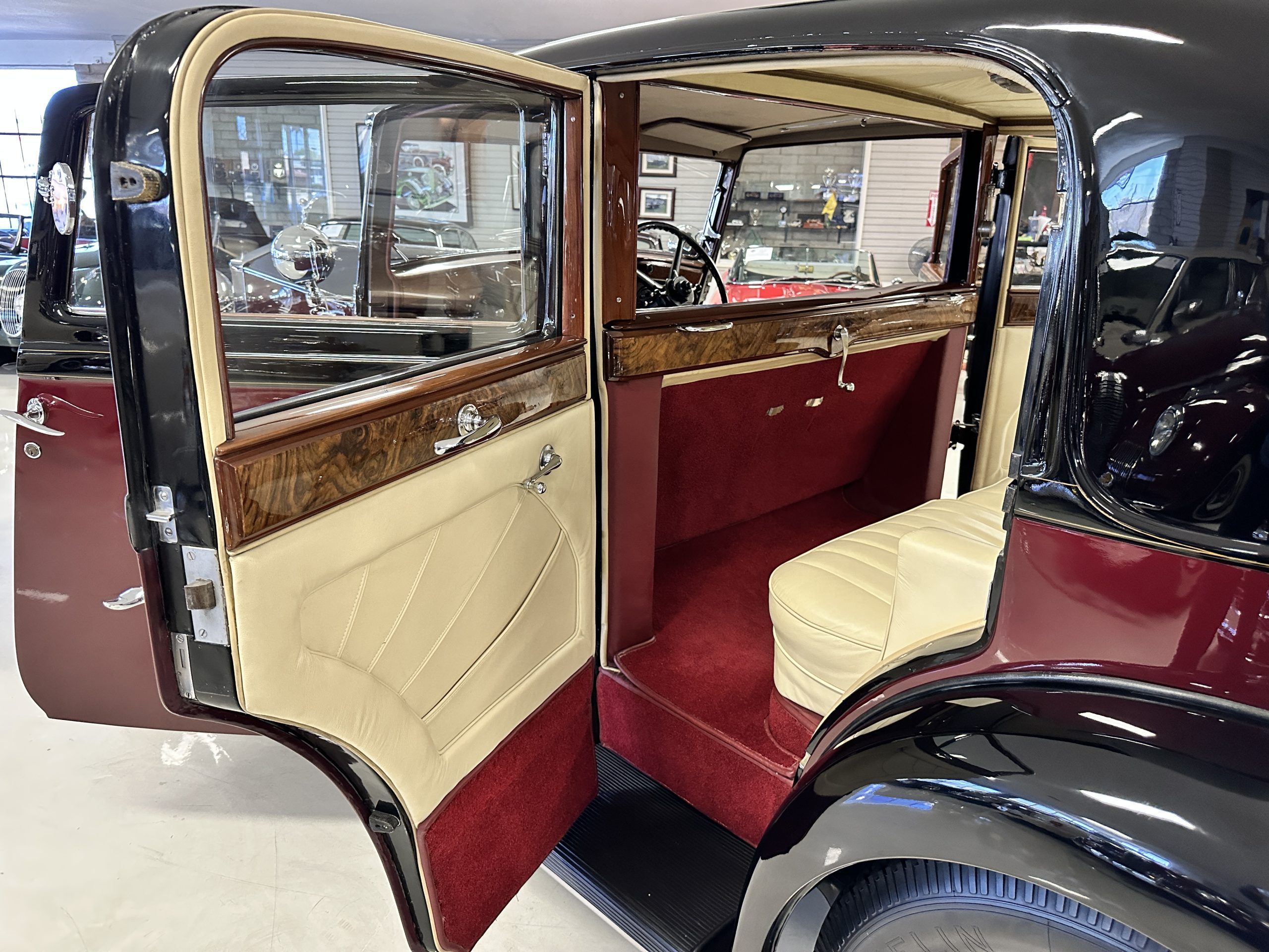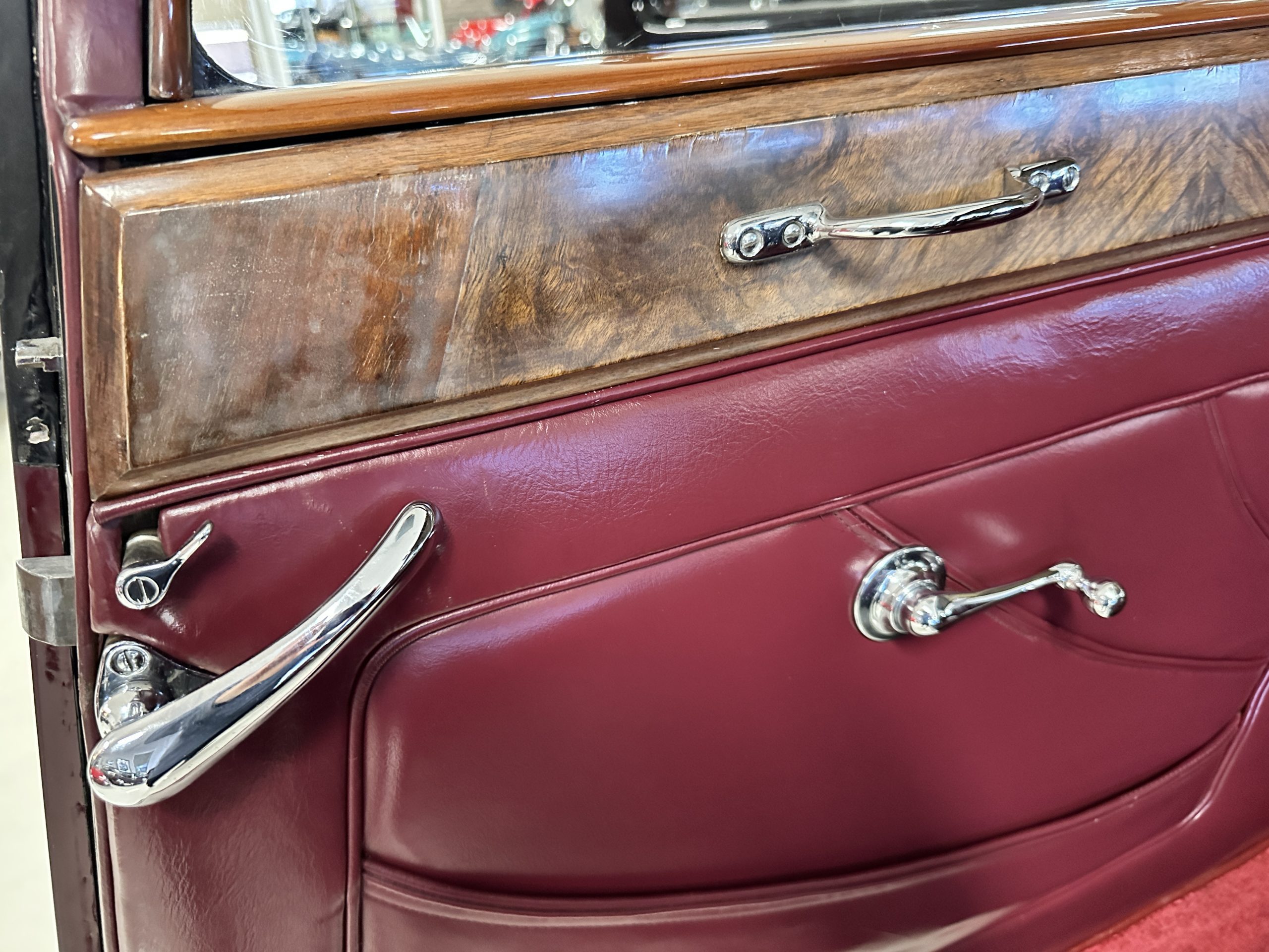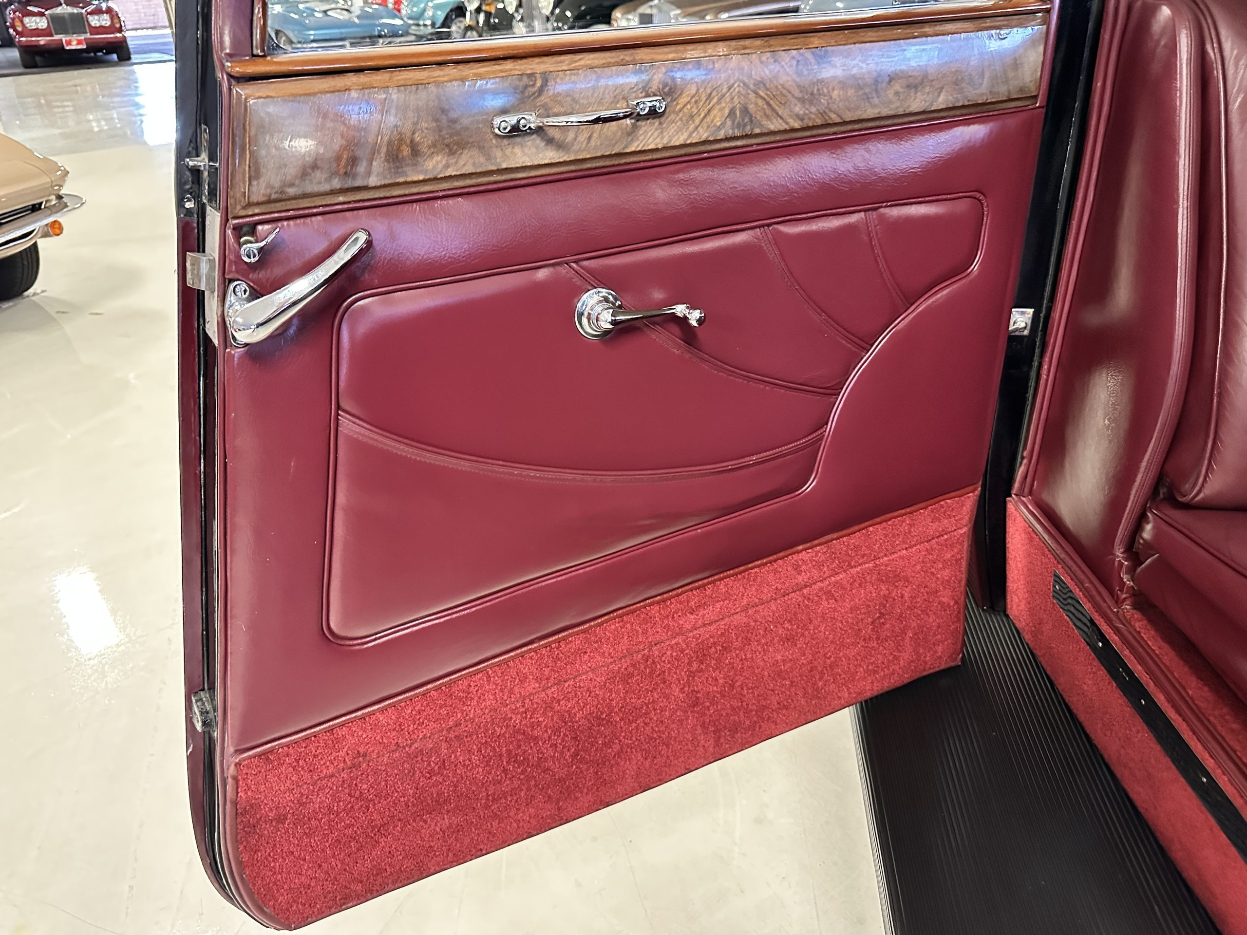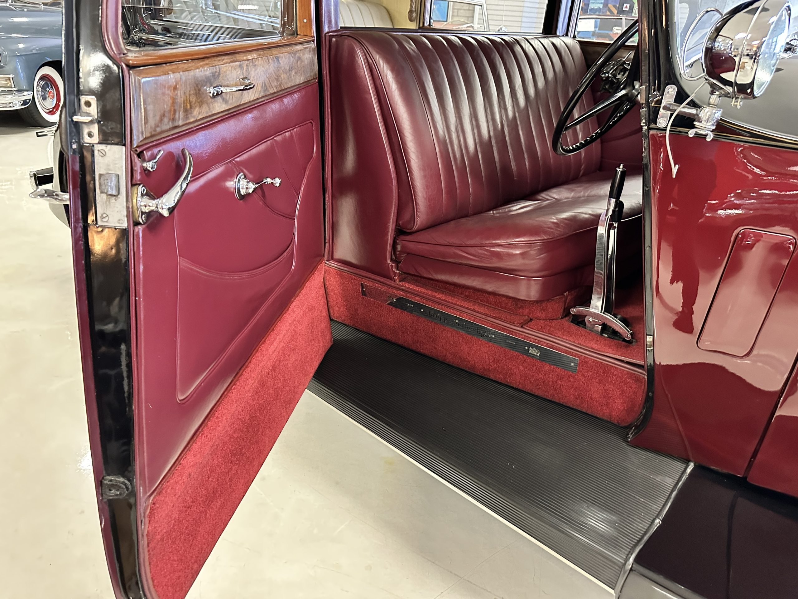 The interior is in overall excellent condition with its soft and supple Burgundy pleated Leather for the chauffeurs compartment, complemented with Burgundy Wilton wool carpeting and gorgeous burl wood and straight grained wood. There is some milking in the finish of the wood only in the front door cap panels. The Burgundy leather front door panels feature a starburst design that is reminiscent of art deco. The dashboard has a beautiful display of instruments and switches, including a wonderful Bakelite cigar lighter. The rear passenger compartment features soft and supple Cream Leather pleated hides and cream silk headlining. The Burgundy Wilton wool carpeting is nearly as new. The wood in the rear compartment is nearly perfect as well and is simply stunning. 160MS also features beautiful grab handles and mirrored vanities with cigar lighters. The rear door panels are Cream leather and also feature the stunning starburst design.
