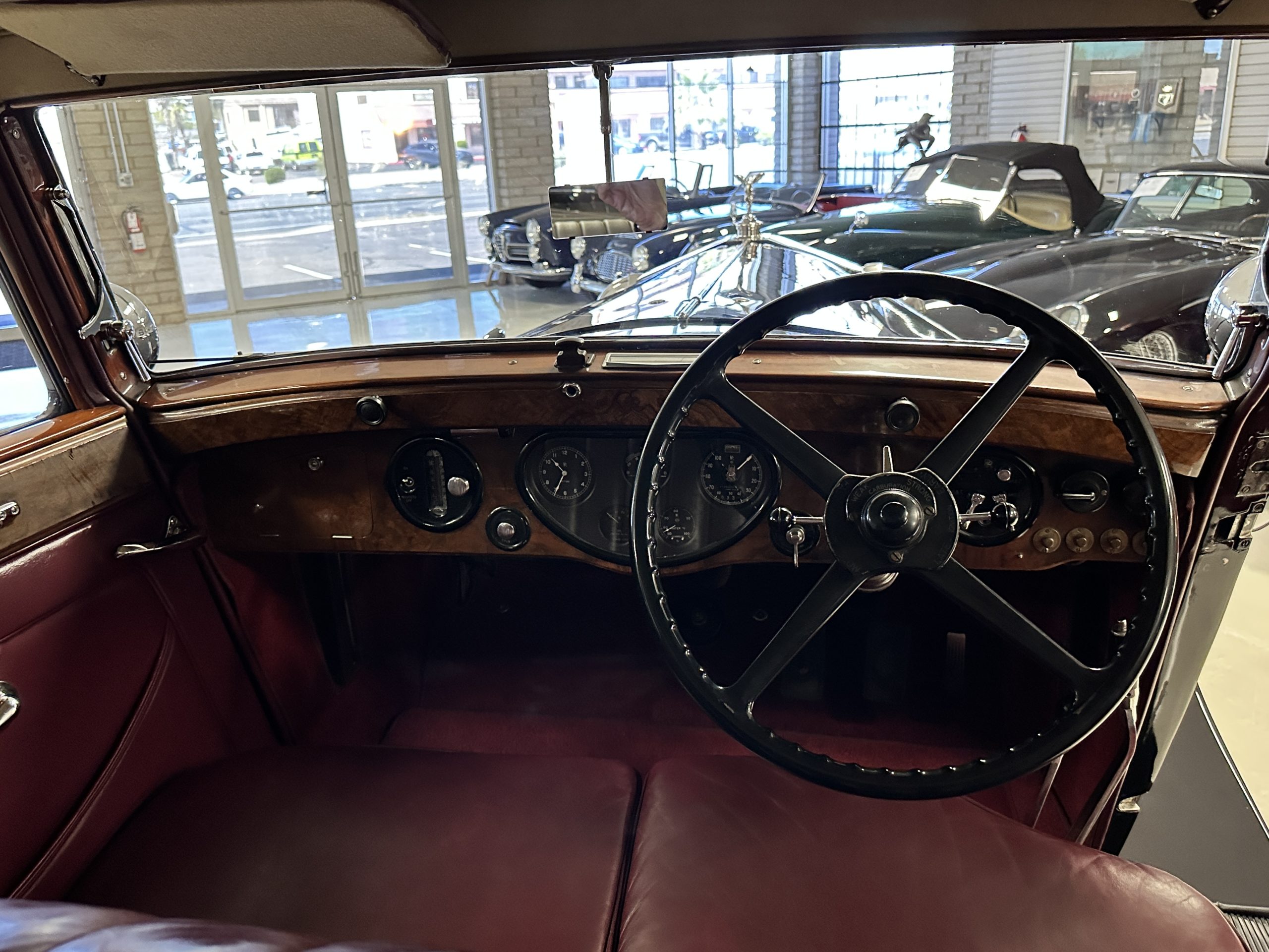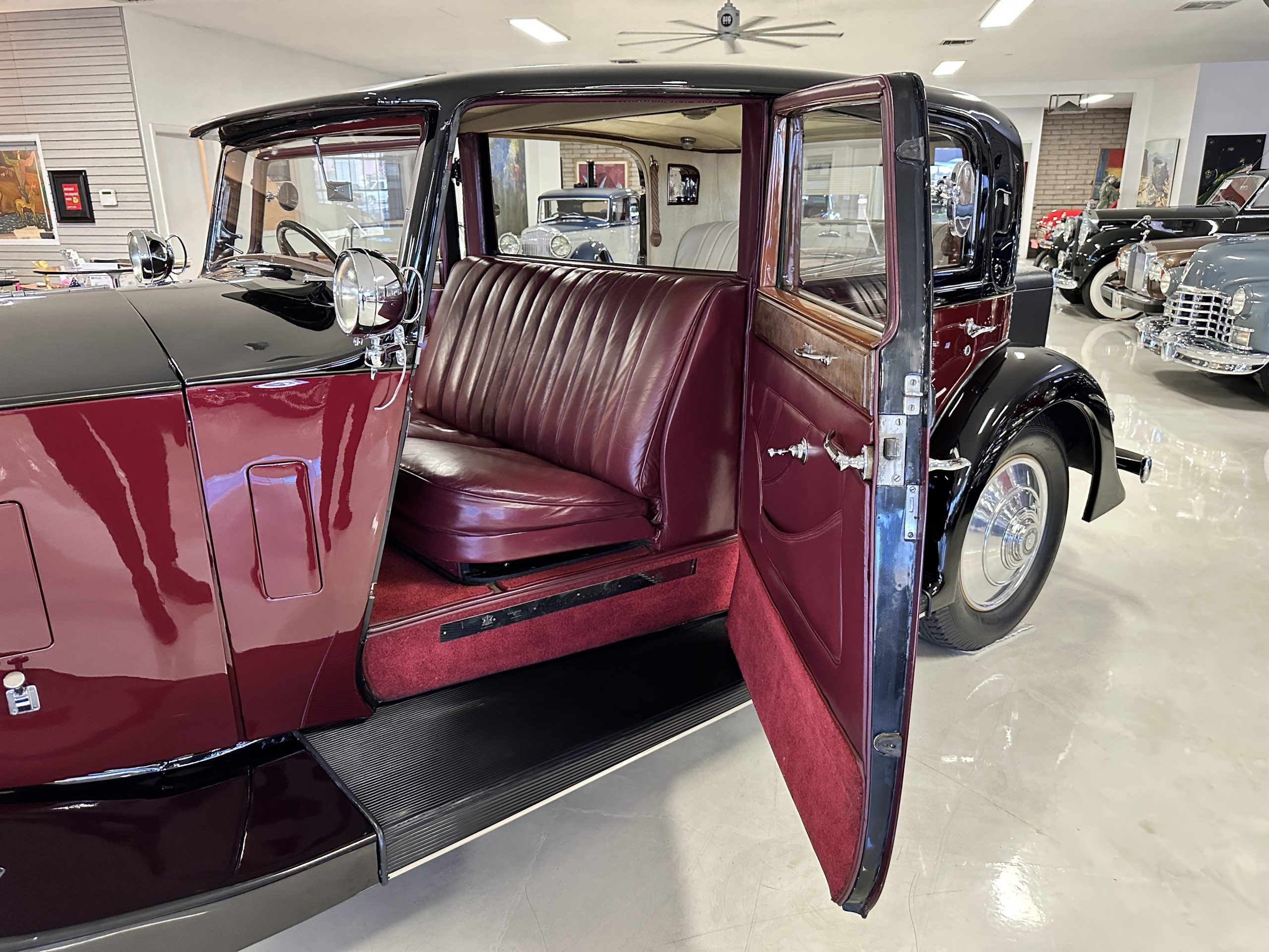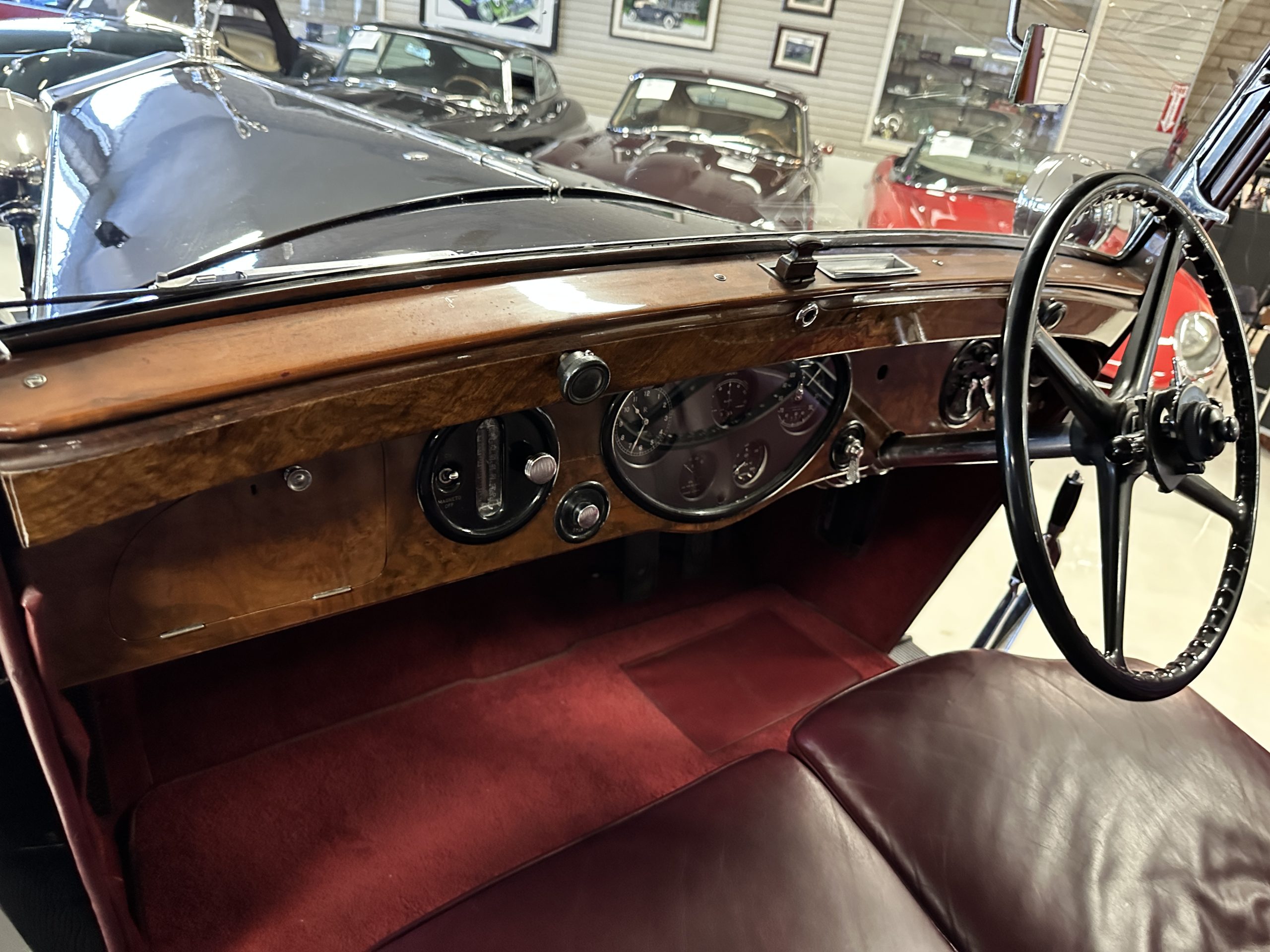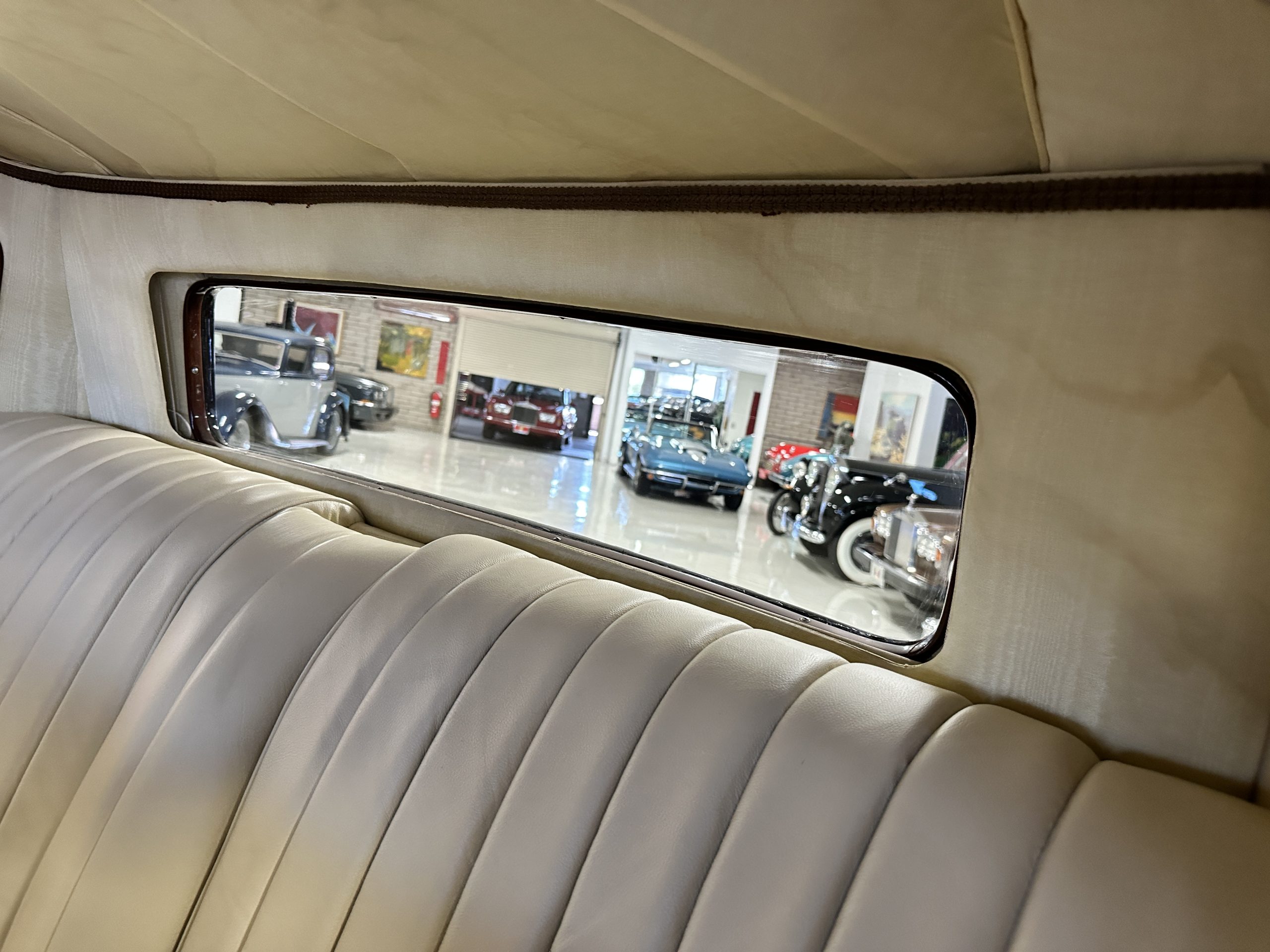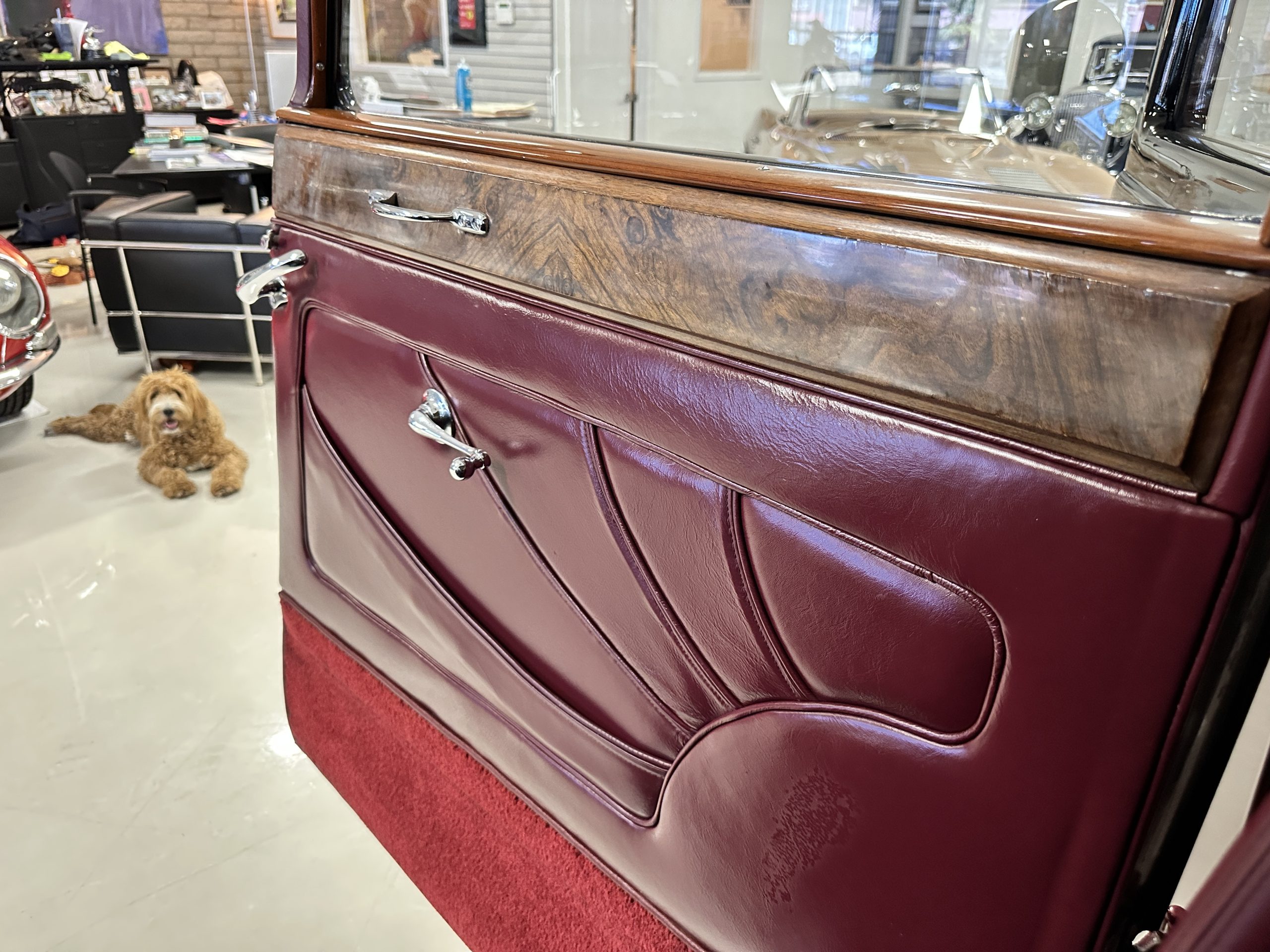 The interior is in overall excellent condition with its soft and supple Burgundy pleated Leather for the chauffeurs compartment, complemented with Burgundy Wilton wool carpeting and gorgeous burl wood and straight grained wood. There is some milking in the finish of the wood only in the front door cap panels. The Burgundy leather front door panels feature a starburst design that is reminiscent of art deco. The dashboard has a beautiful display of instruments and switches, including a wonderful Bakelite cigar lighter. The rear passenger compartment features soft and supple Cream Leather pleated hides and cream silk headlining. The Burgundy Wilton wool carpeting is nearly as new. The wood in the rear compartment is nearly perfect as well and is simply stunning. 160MS also features beautiful grab handles and mirrored vanities with cigar lighters. The rear door panels are Cream leather and also feature the stunning starburst design.