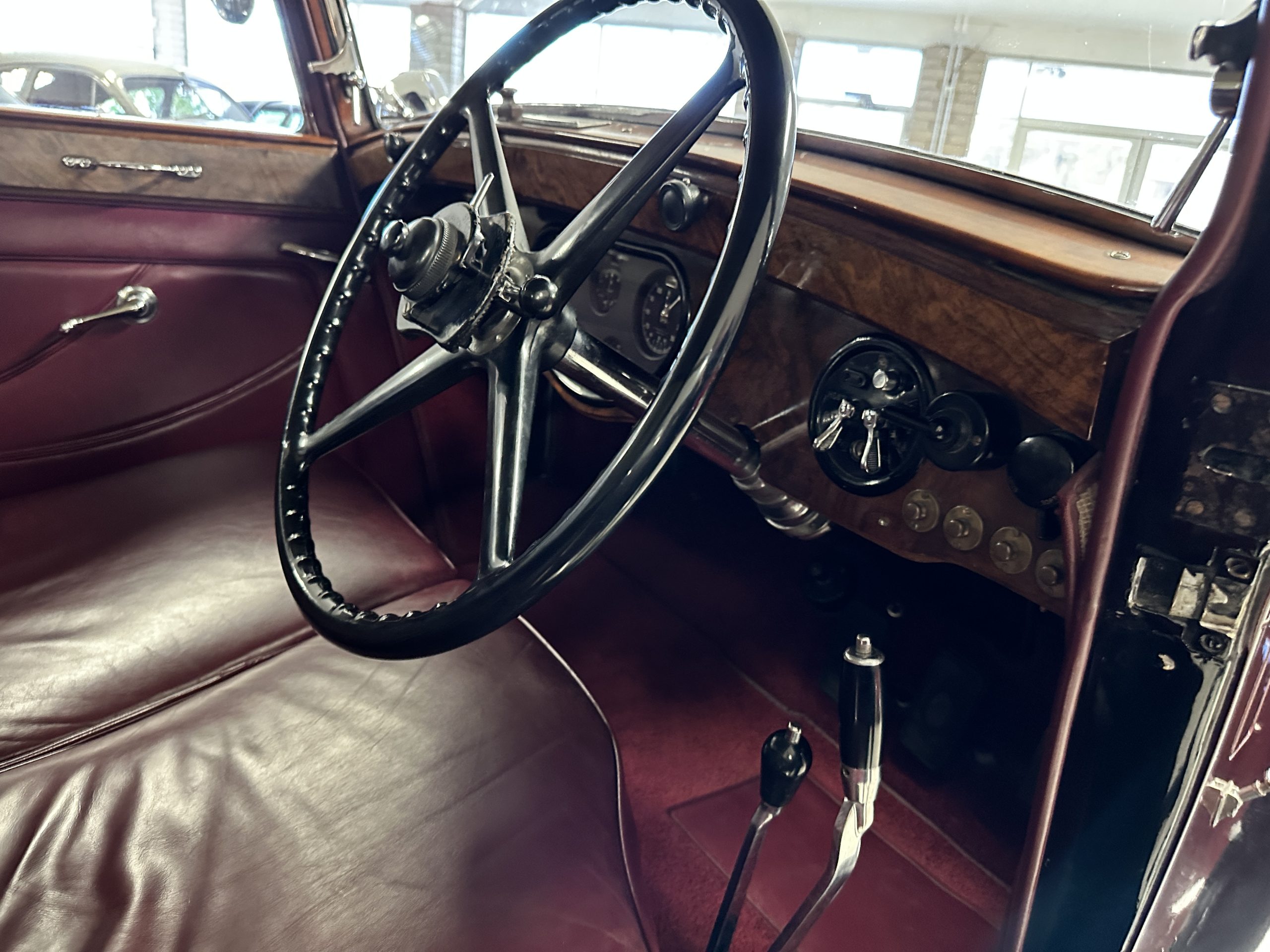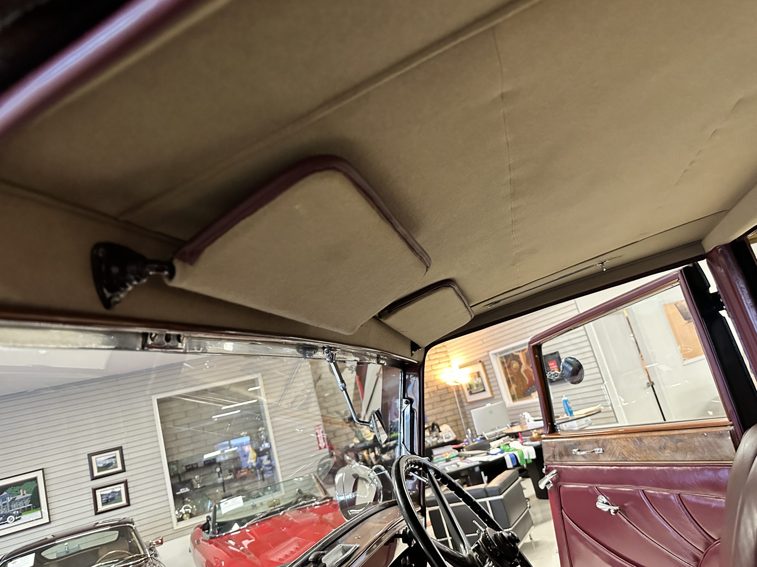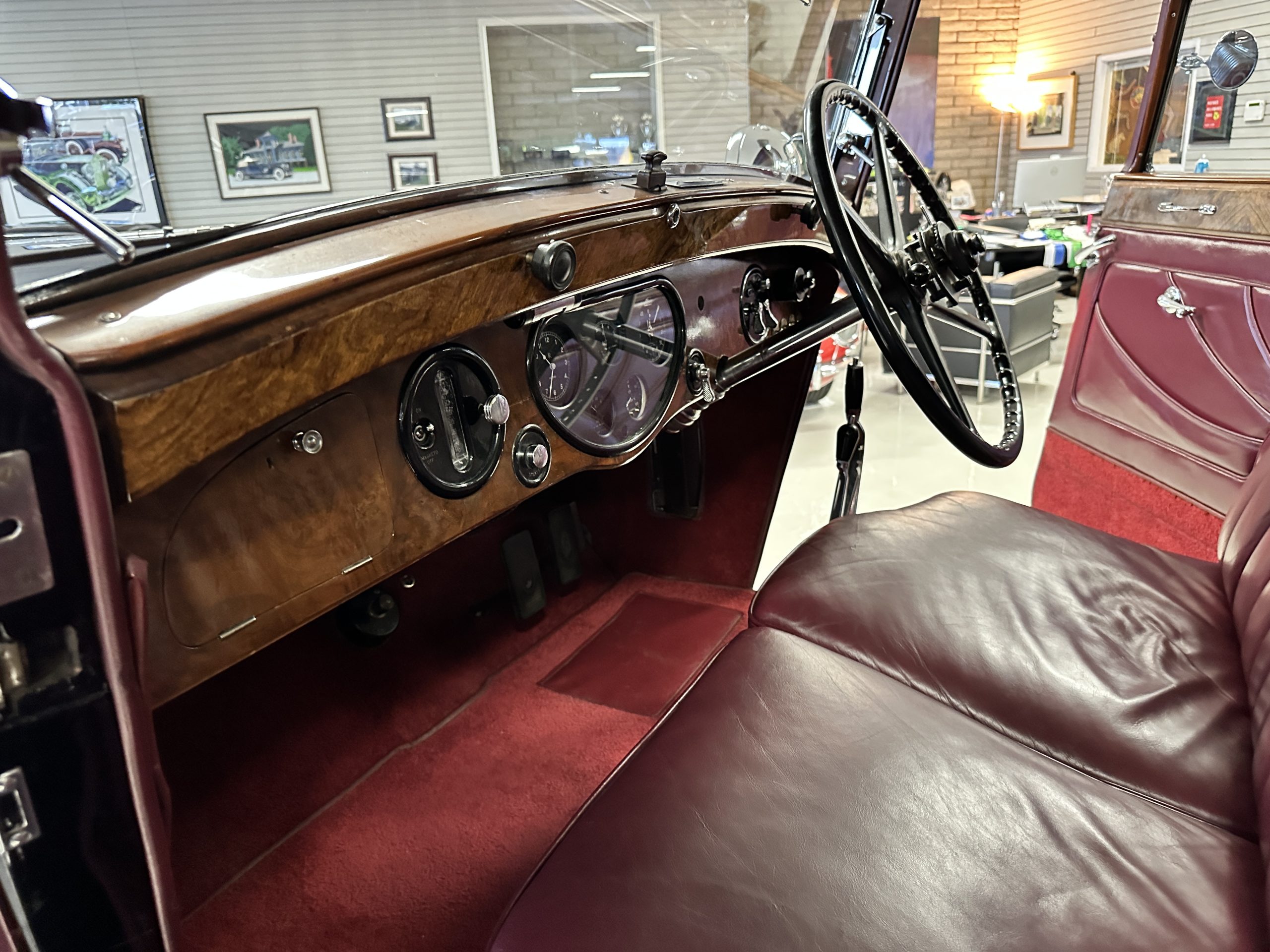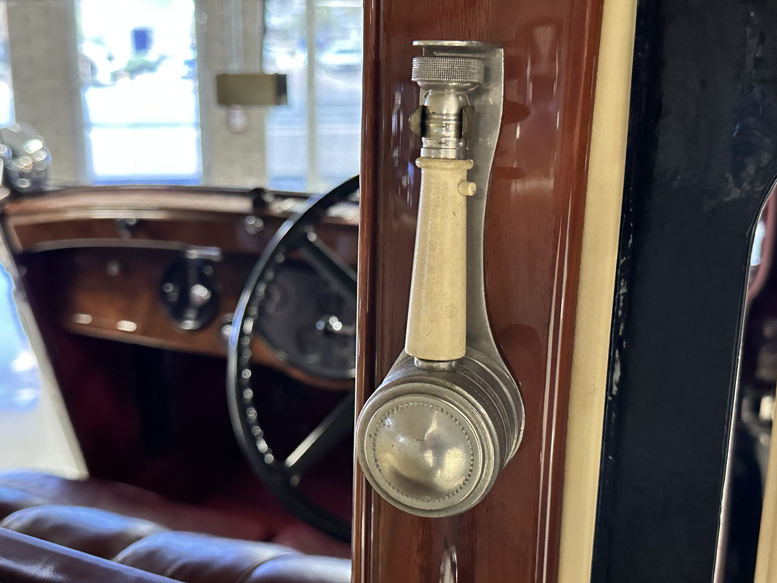 The interior is in overall excellent condition with its soft and supple Burgundy pleated Leather for the chauffeurs compartment, complemented with Burgundy Wilton wool carpeting and gorgeous burl wood and straight grained wood. There is some milking in the finish of the wood only in the front door cap panels. The Burgundy leather front door panels feature a starburst design that is reminiscent of art deco. The dashboard has a beautiful display of instruments and switches, including a wonderful Bakelite cigar lighter. The rear passenger compartment features soft and supple Cream Leather pleated hides and cream silk headlining. The Burgundy Wilton wool carpeting is nearly as new. The wood in the rear compartment is nearly perfect as well and is simply stunning. 160MS also features beautiful grab handles and mirrored vanities with cigar lighters. The rear door panels are Cream leather and also feature the stunning starburst design.