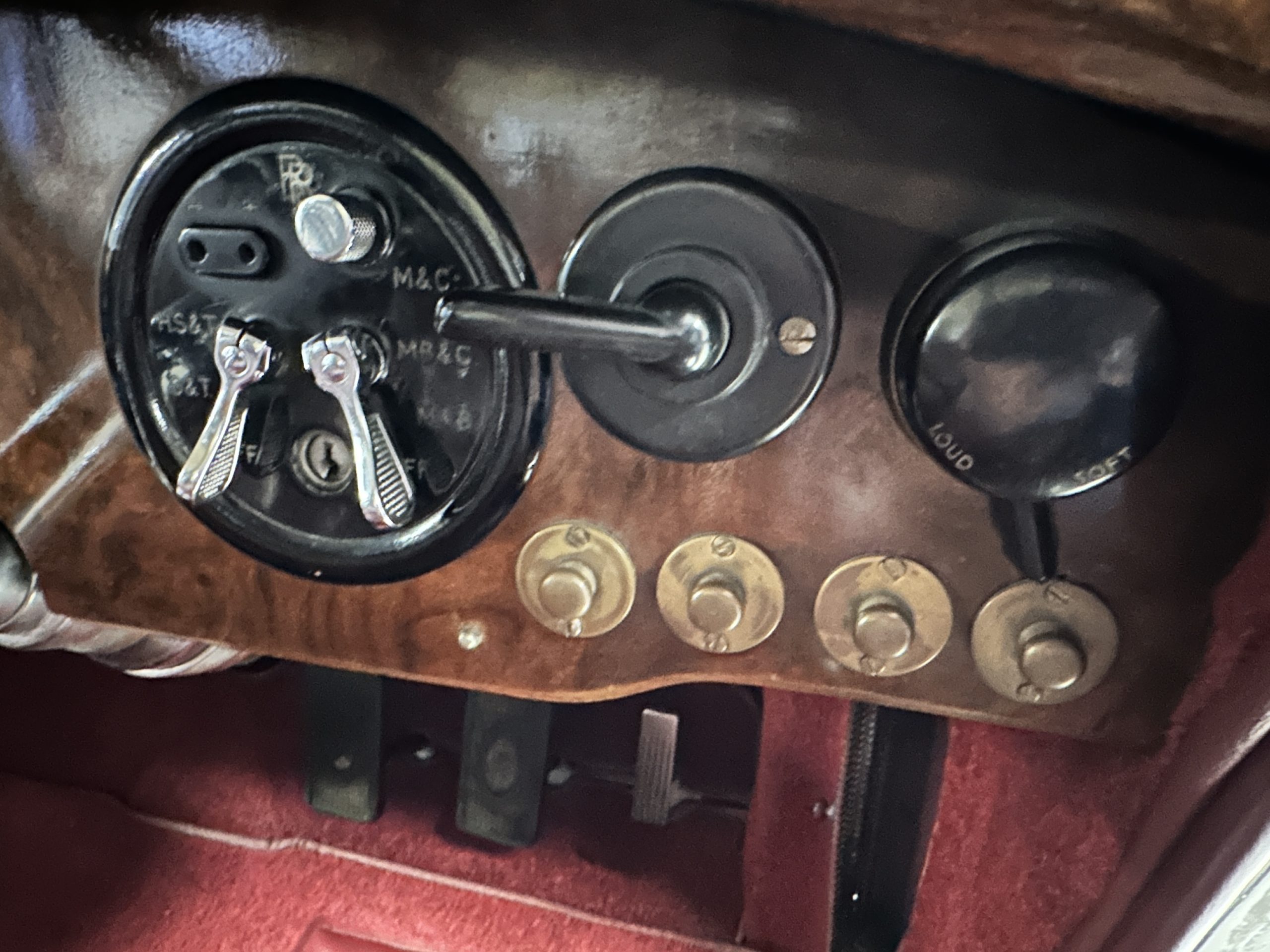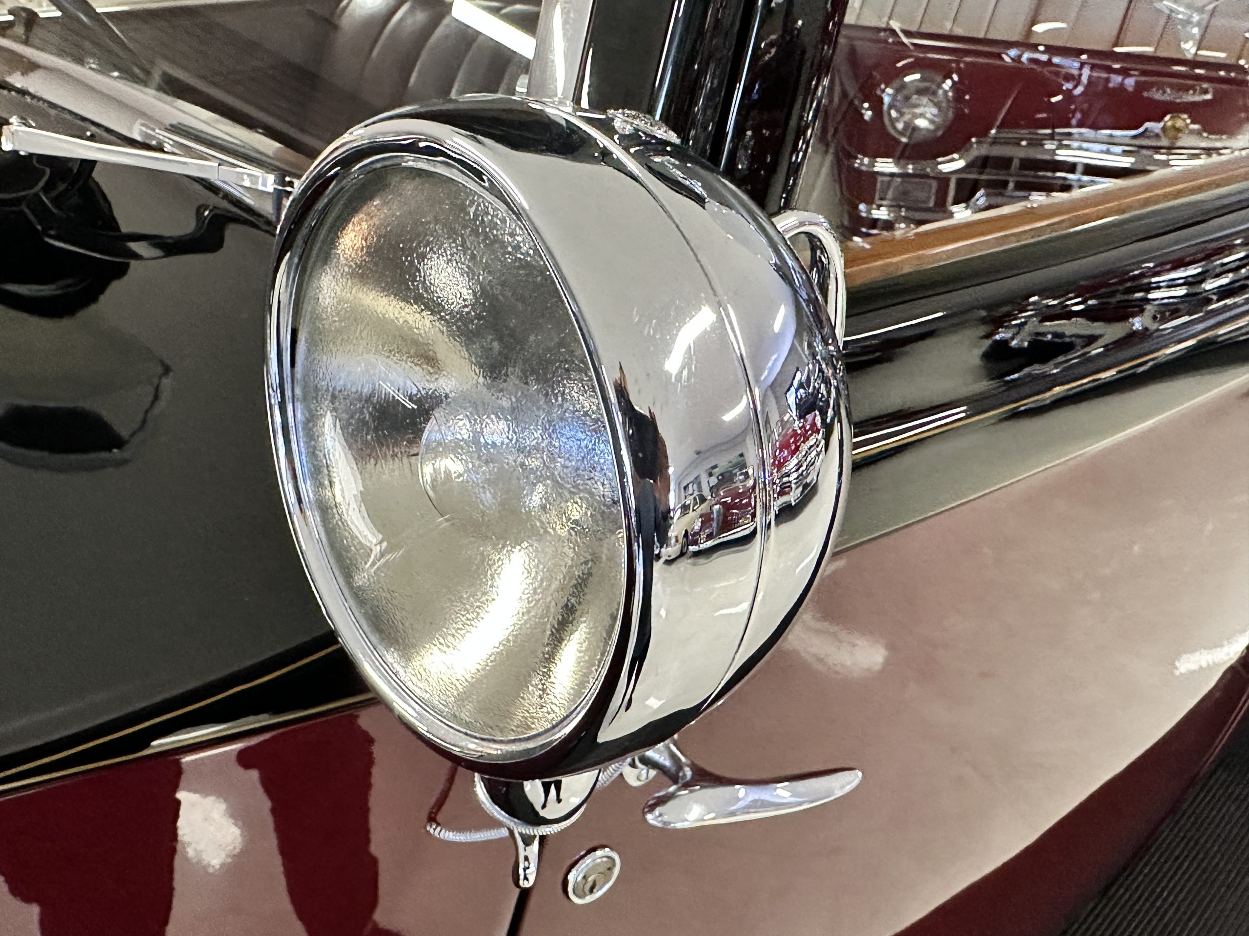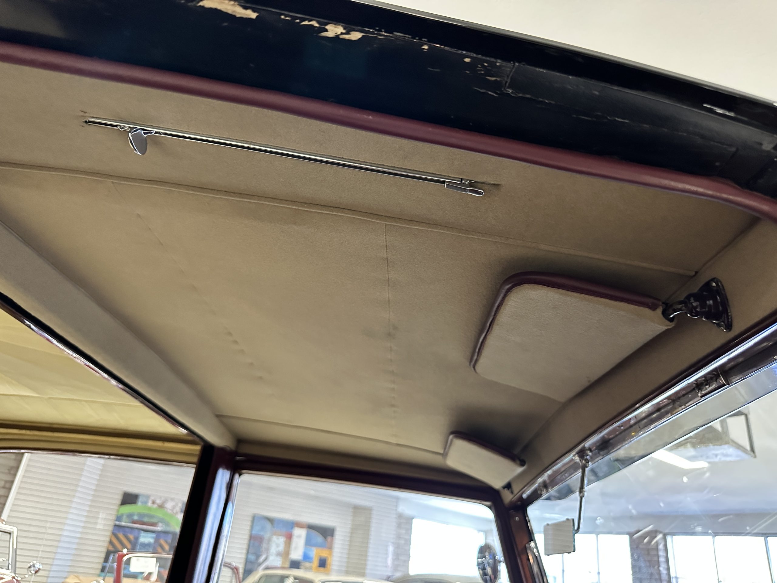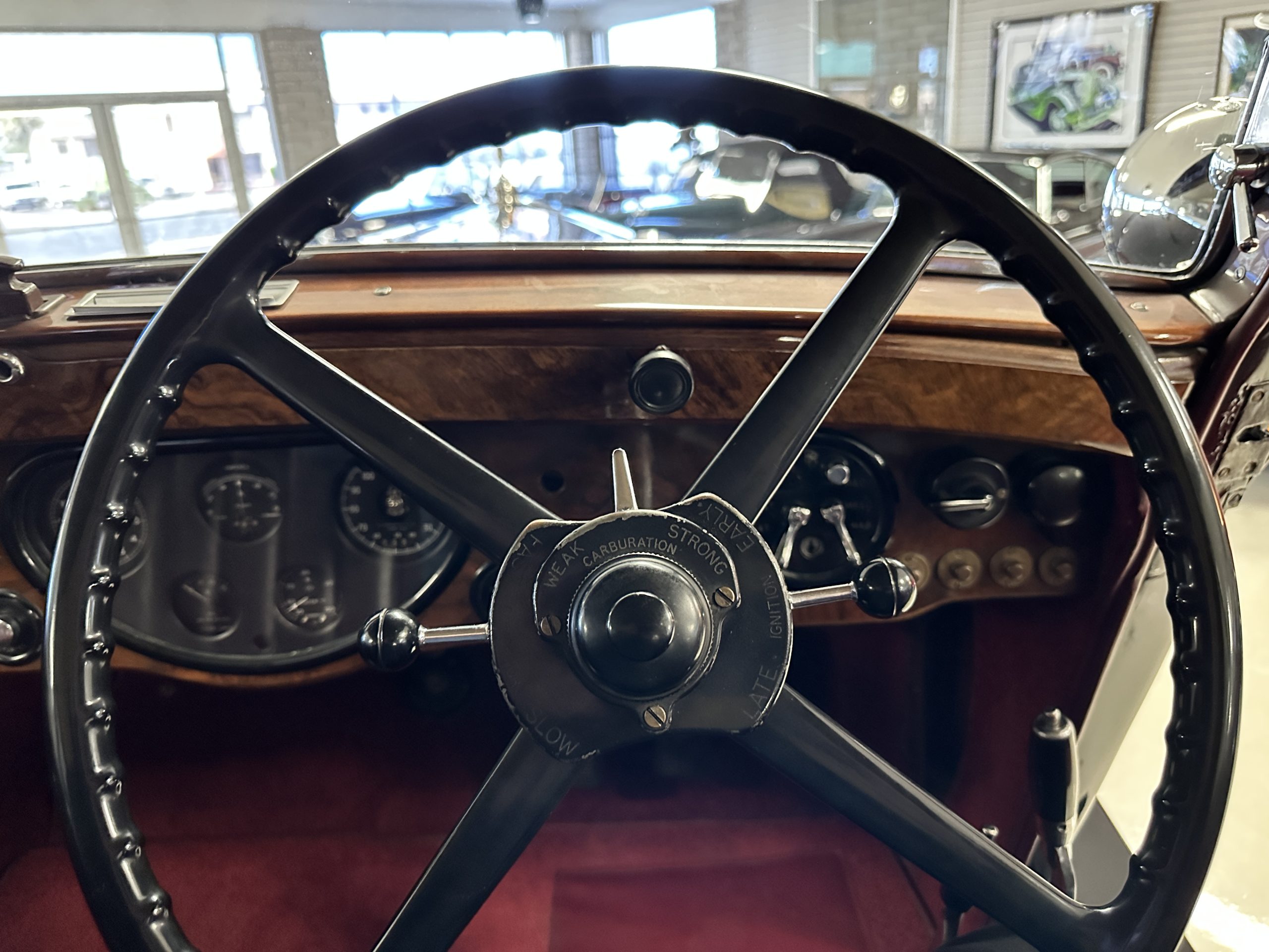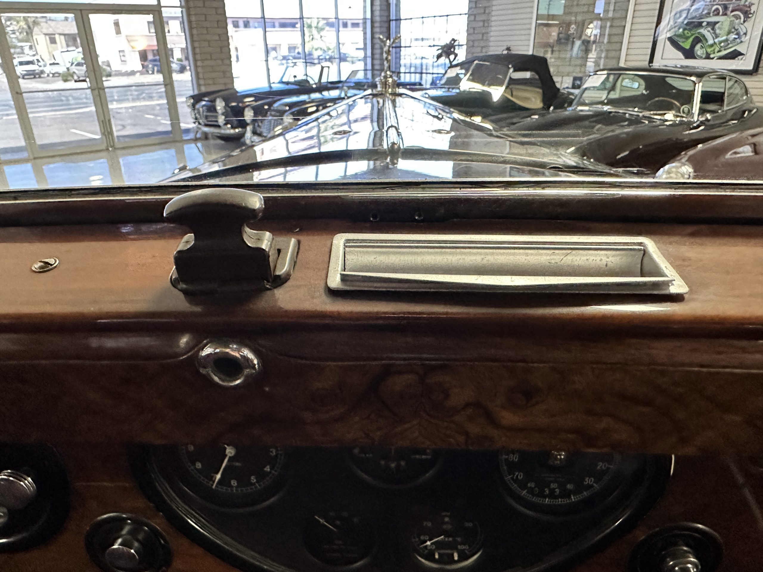The interior is in overall excellent condition with its soft and supple Burgundy pleated Leather for the chauffeurs compartment, complemented with Burgundy Wilton wool carpeting and gorgeous burl wood and straight grained wood. There is some milking in the finish of the wood only in the front door cap panels. The Burgundy leather front door panels feature a starburst design that is reminiscent of art deco. The dashboard has a beautiful display of instruments and switches, including a wonderful Bakelite cigar lighter. The rear passenger compartment features soft and supple Cream Leather pleated hides and cream silk headlining. The Burgundy Wilton wool carpeting is nearly as new. The wood in the rear compartment is nearly perfect as well and is simply stunning. 160MS also features beautiful grab handles and mirrored vanities with cigar lighters. The rear door panels are Cream leather and also feature the stunning starburst design.