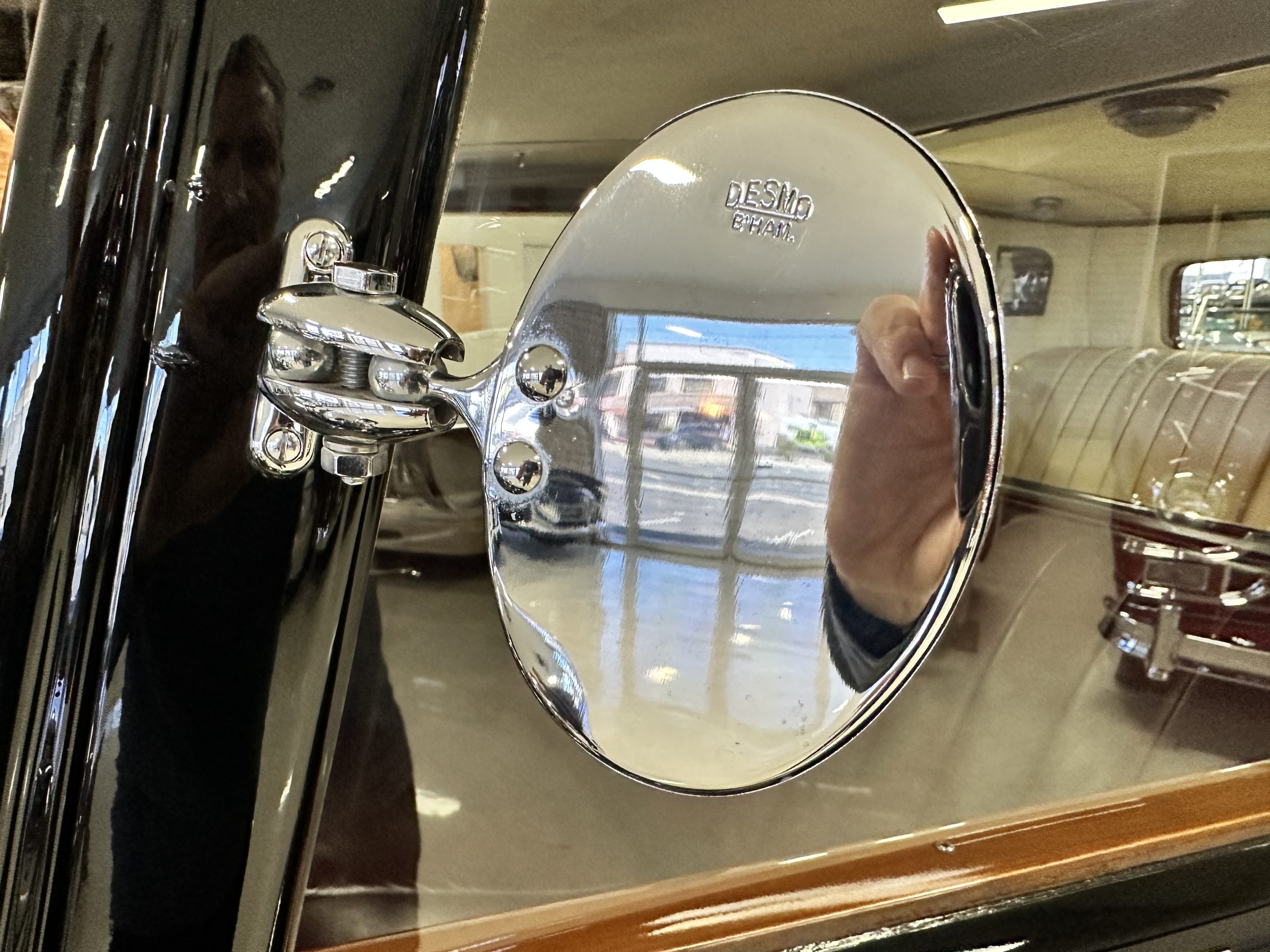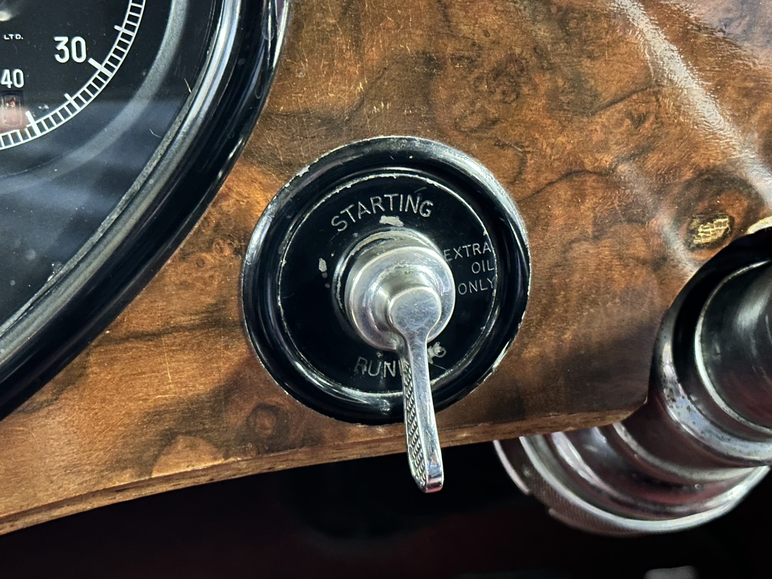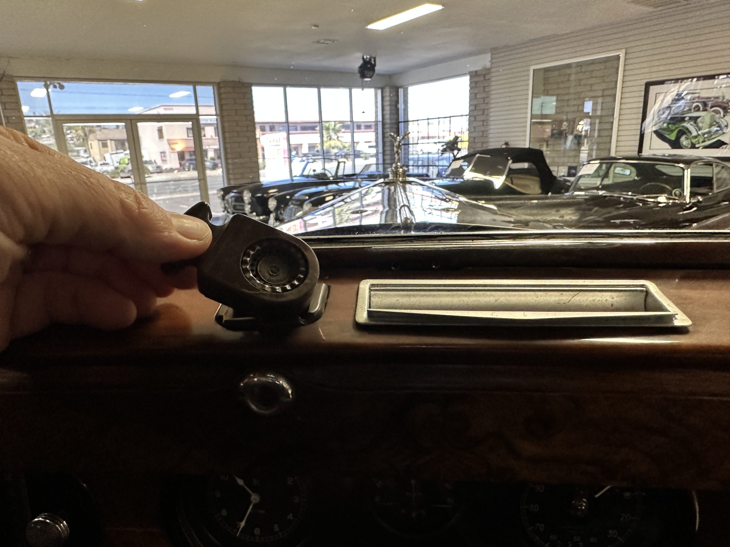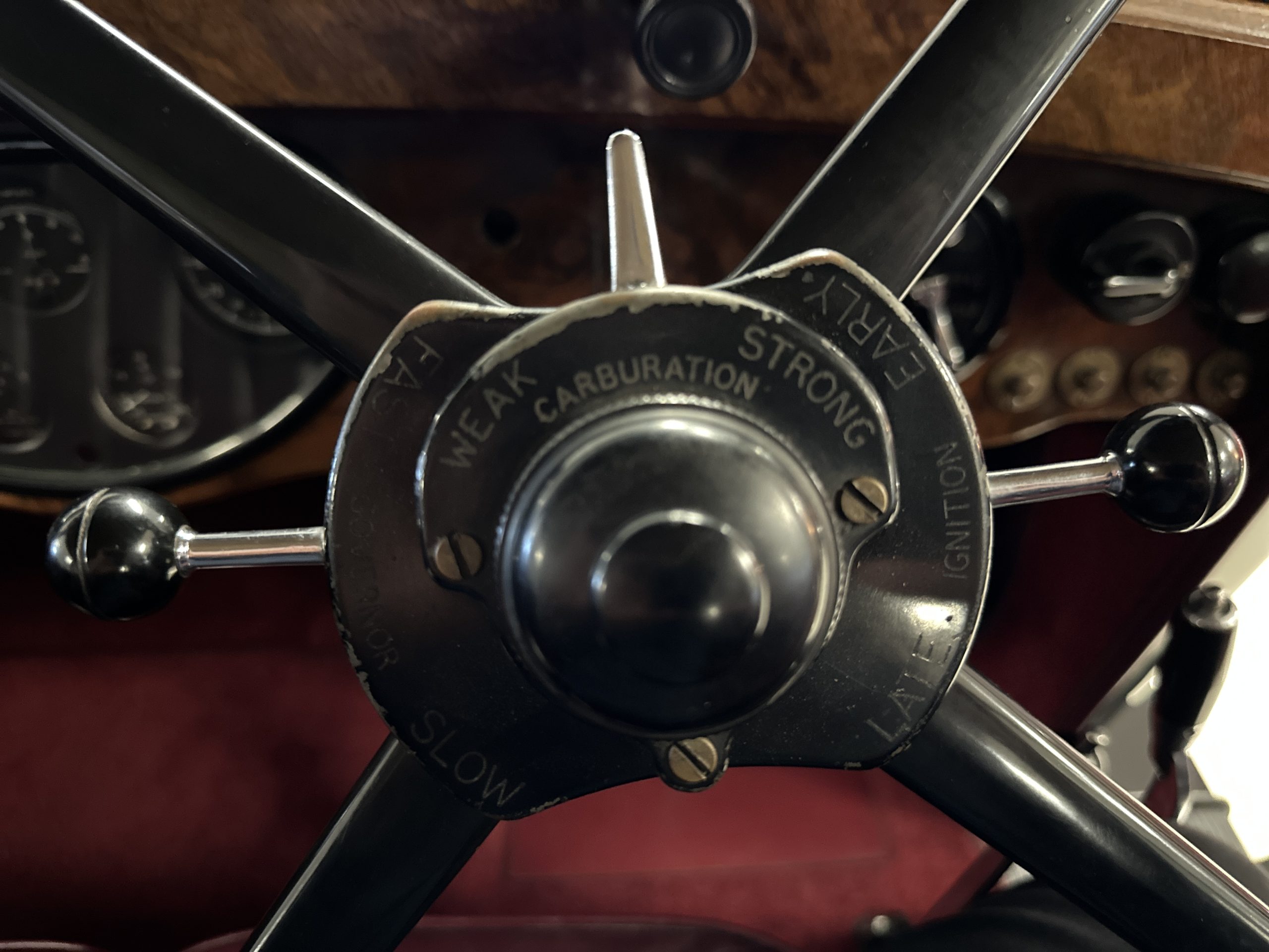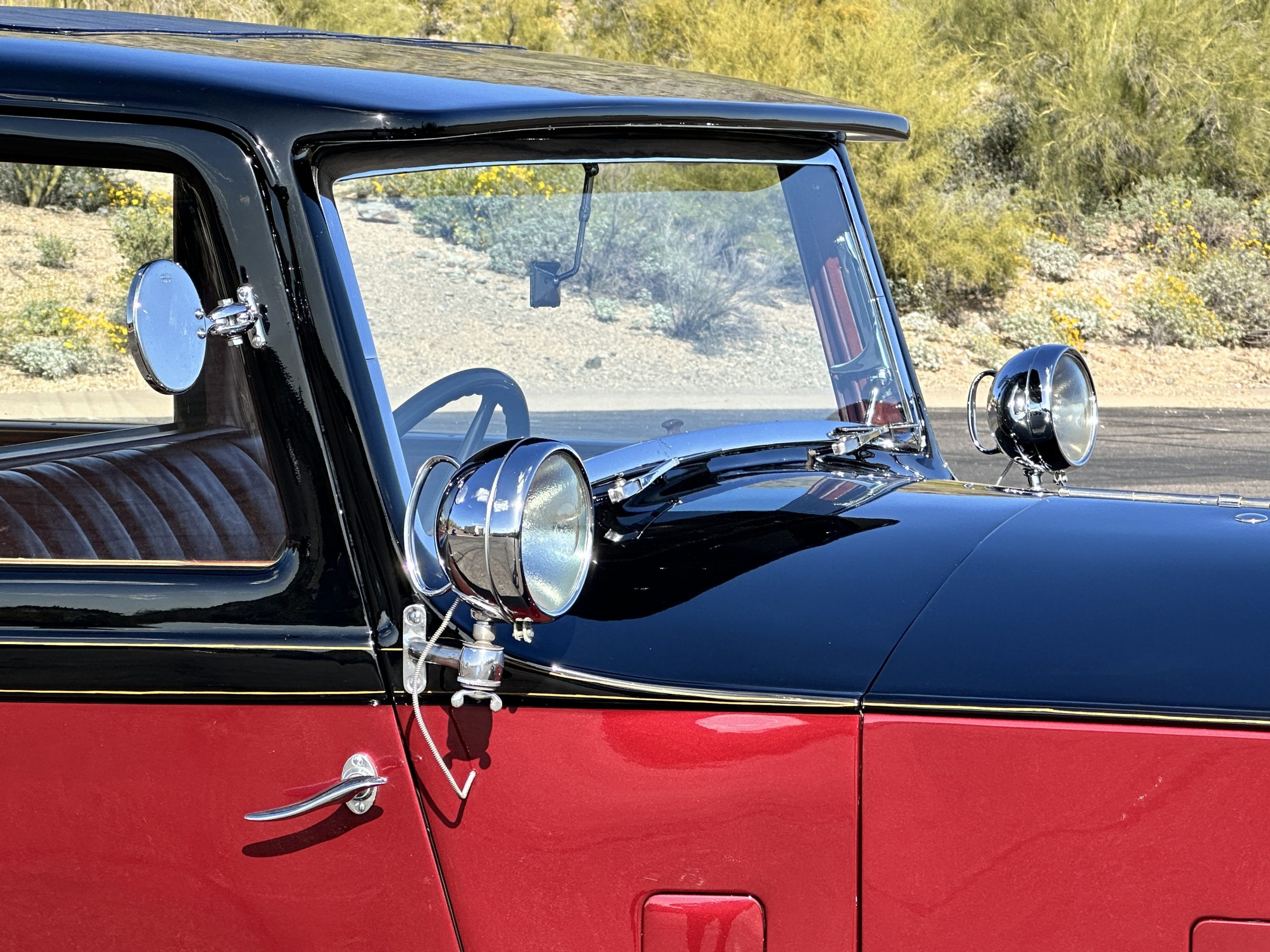 The interior is in overall excellent condition with its soft and supple Burgundy pleated Leather for the chauffeurs compartment, complemented with Burgundy Wilton wool carpeting and gorgeous burl wood and straight grained wood. There is some milking in the finish of the wood only in the front door cap panels. The Burgundy leather front door panels feature a starburst design that is reminiscent of art deco. The dashboard has a beautiful display of instruments and switches, including a wonderful Bakelite cigar lighter. The rear passenger compartment features soft and supple Cream Leather pleated hides and cream silk headlining. The Burgundy Wilton wool carpeting is nearly as new. The wood in the rear compartment is nearly perfect as well and is simply stunning. 160MS also features beautiful grab handles and mirrored vanities with cigar lighters. The rear door panels are Cream leather and also feature the stunning starburst design.