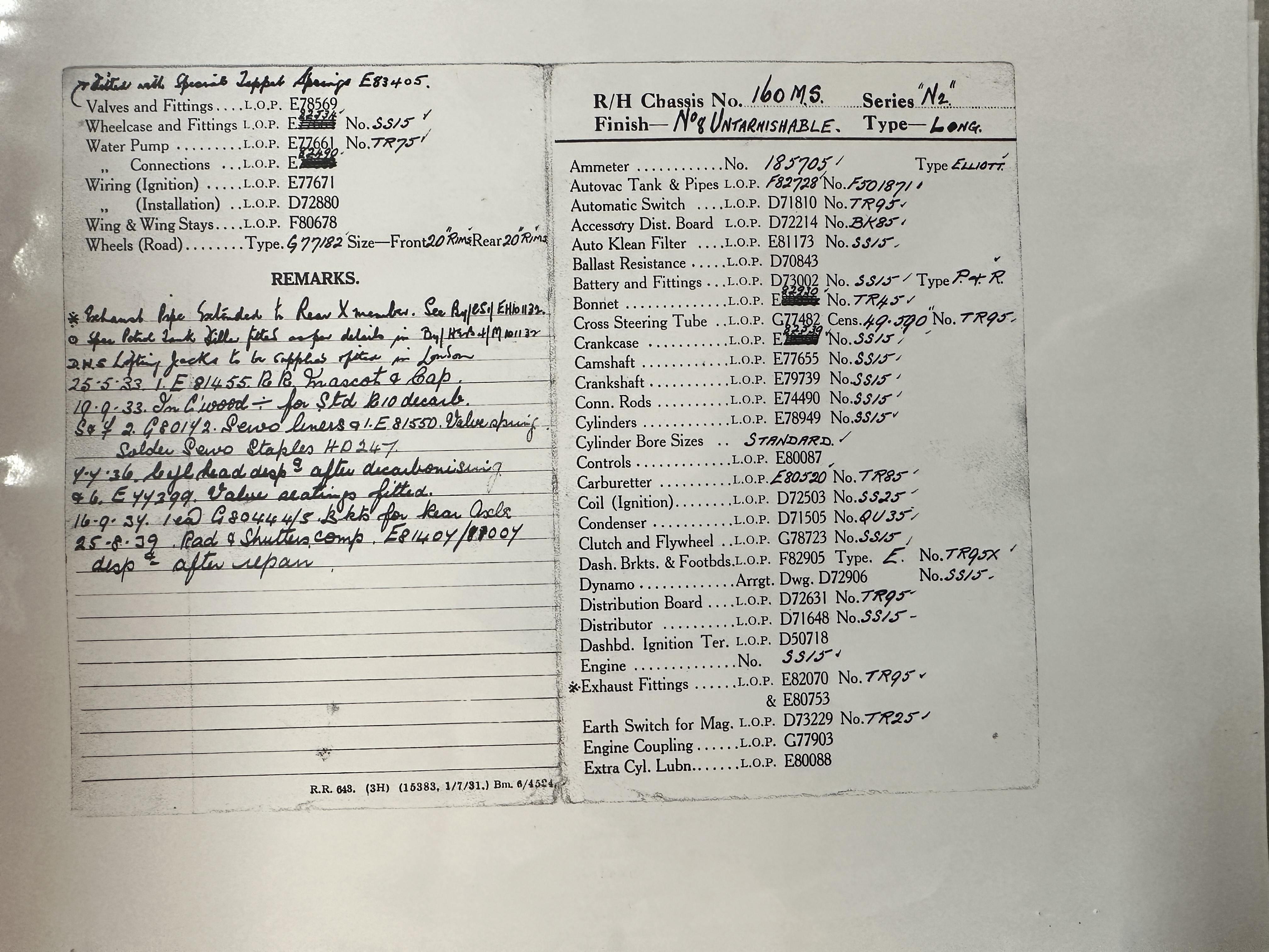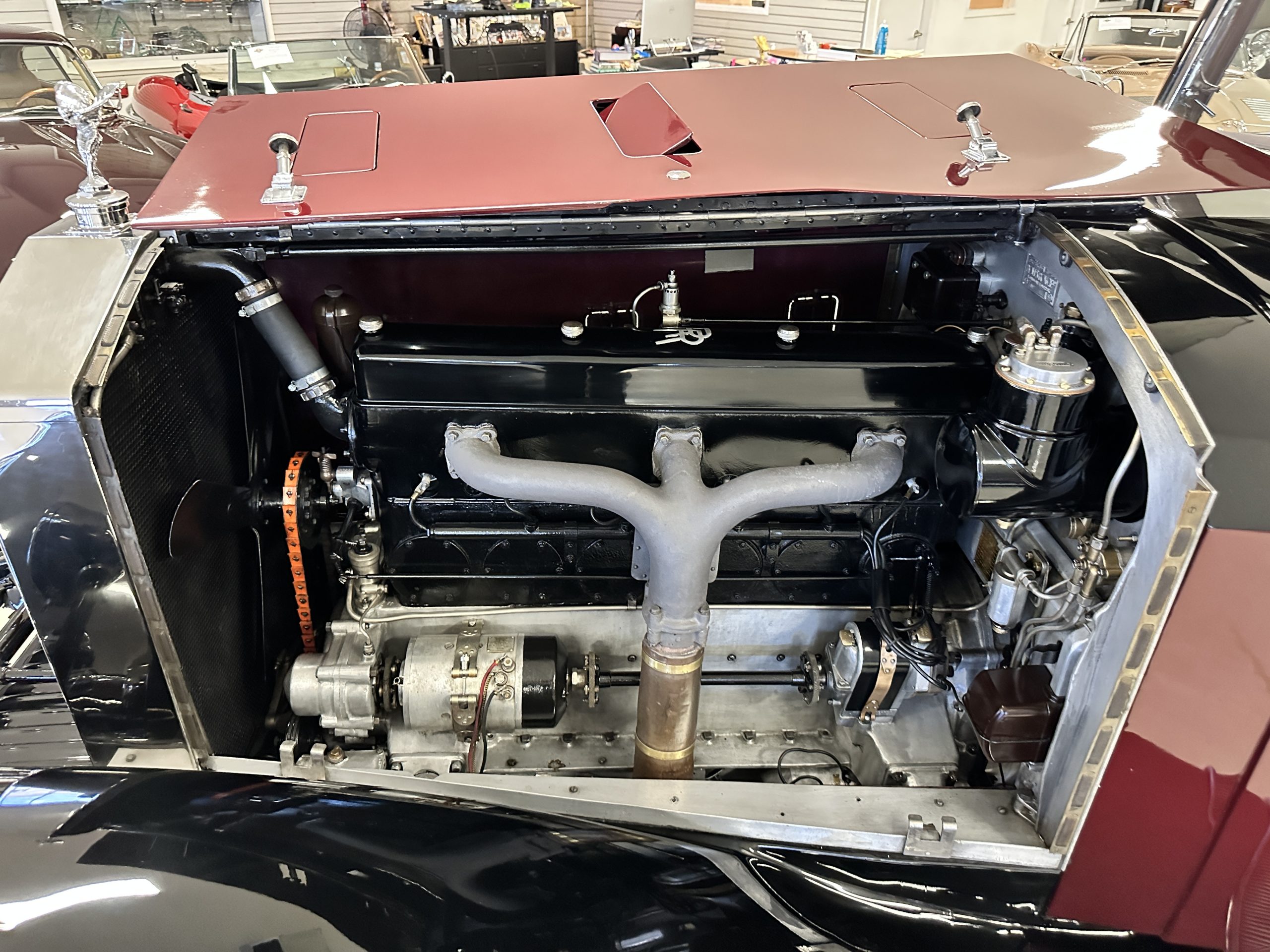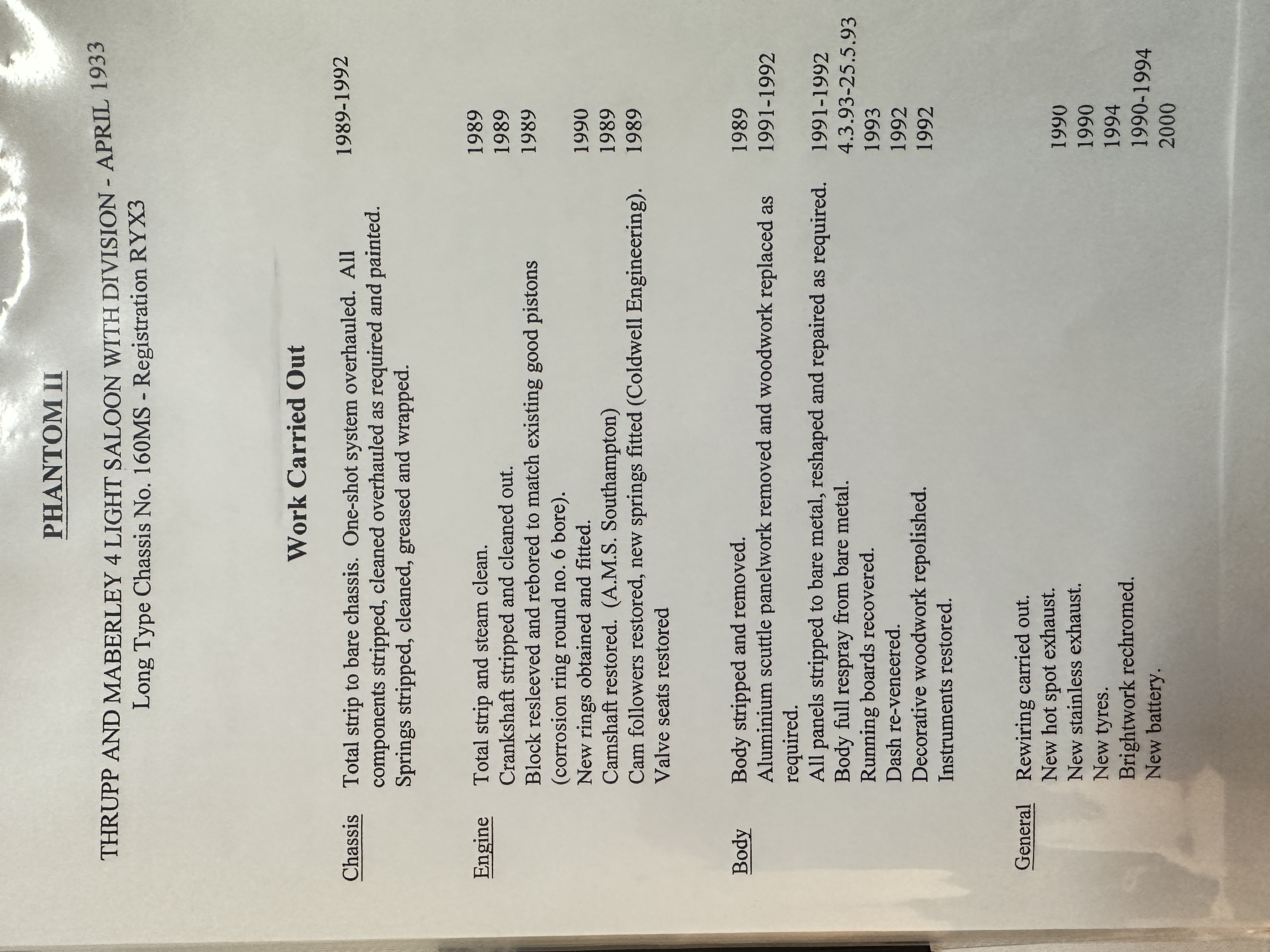 By 1991 through 1994, 160MS was owned by Peter Vernon Kell of Surry. Mr. Kell commissioned a comprehensive restoration down to its bare chassis. In 2001, Mr. Kell commissioned Derek Skilton of East Sussex to re-trim the interior. The engine had a lower end engine rebuild, radiator restored, and the chassis re-wired in 2004 by the Rolls-Royce specialist at McKenzie Guppy Ltd in Dorset. By 2020, Mr. James Rice acquired the Phantom II from Vintage & Prestige Cars in Northampton, England and had it shipped to Beverly Hills, CA. Mr. Rice commissioned a top engine rebuild, new Llamar wheel discs and a new clutch installed in 2023. 160MS is now ready for touring or concours events.