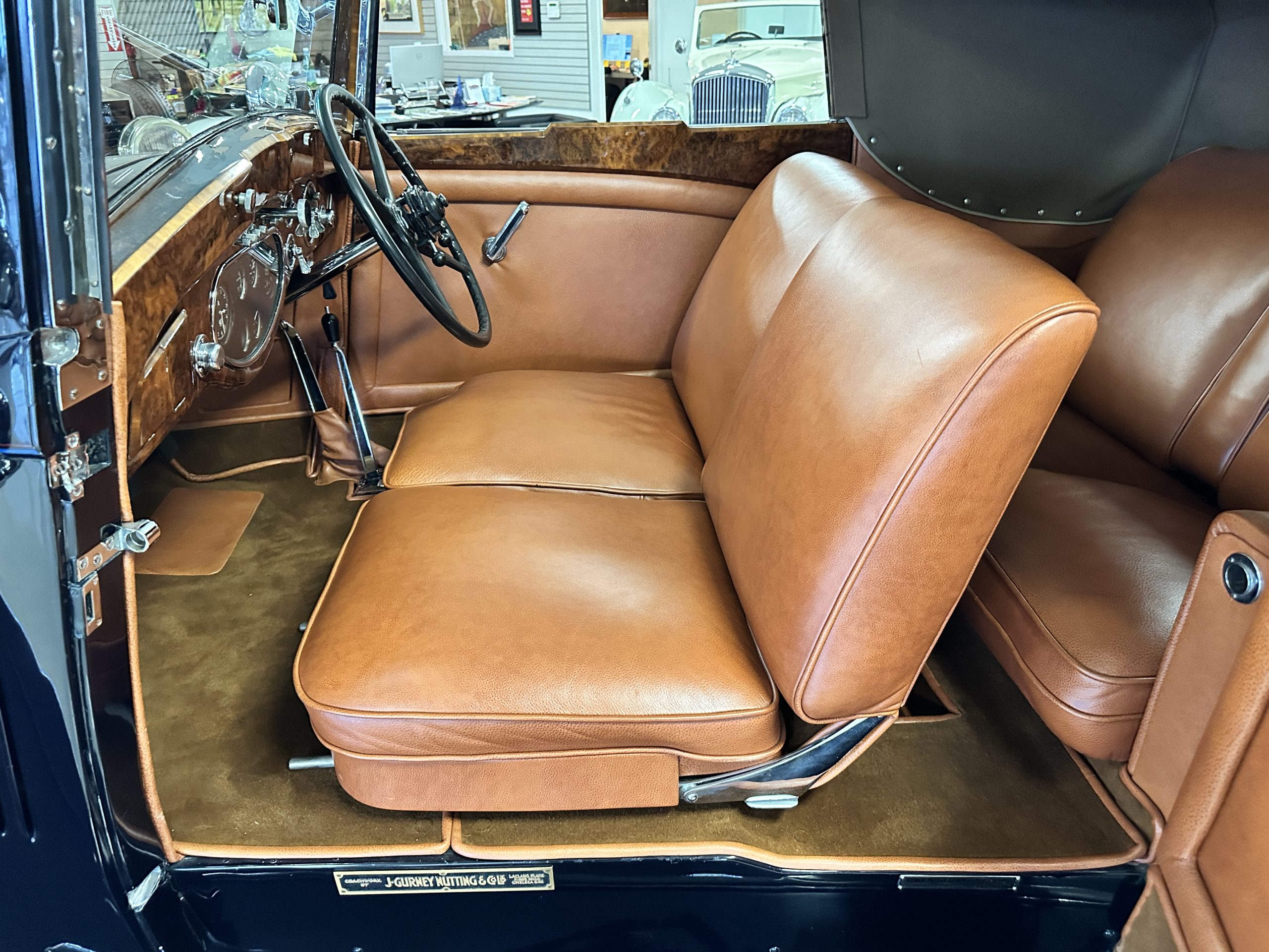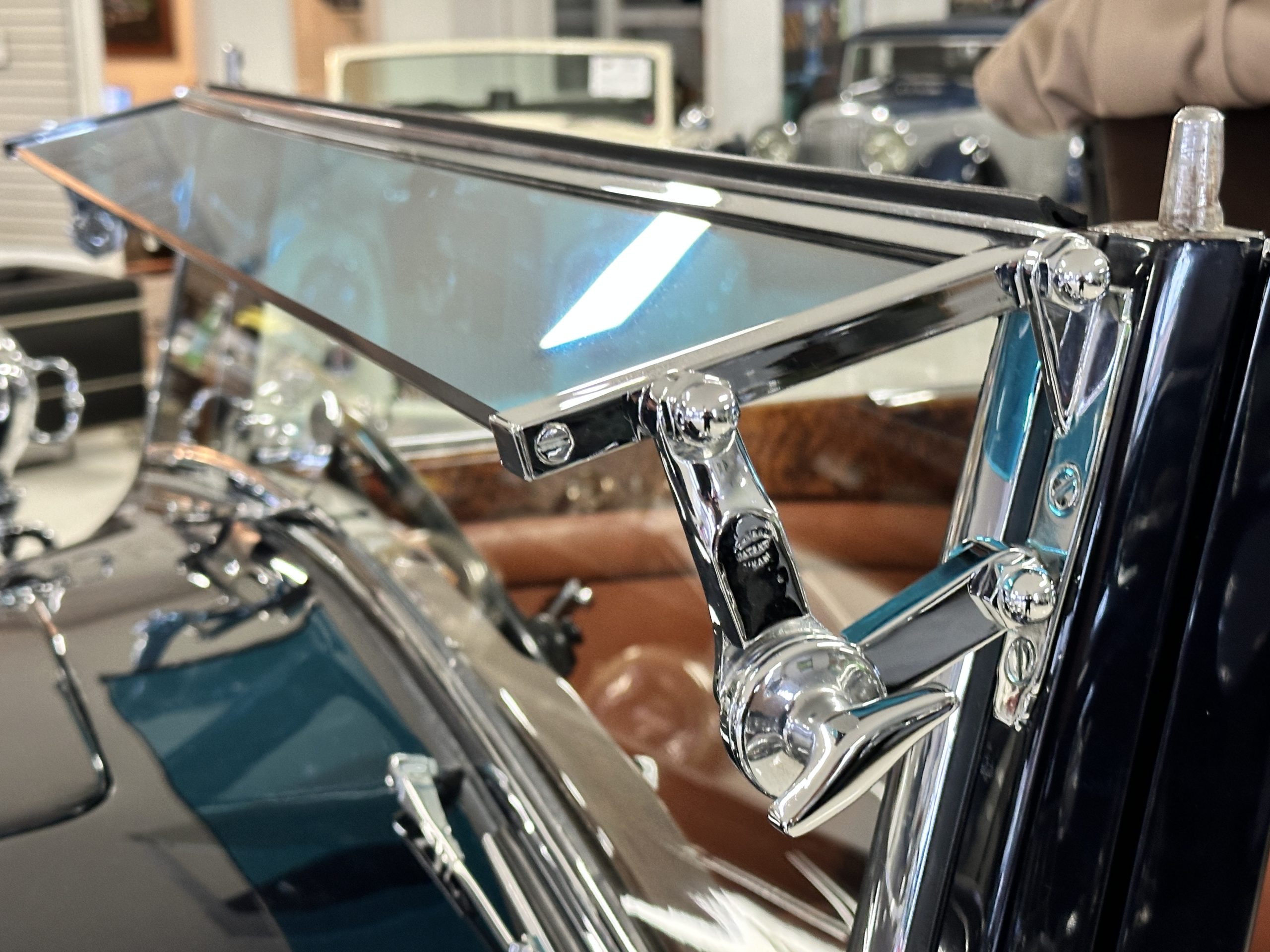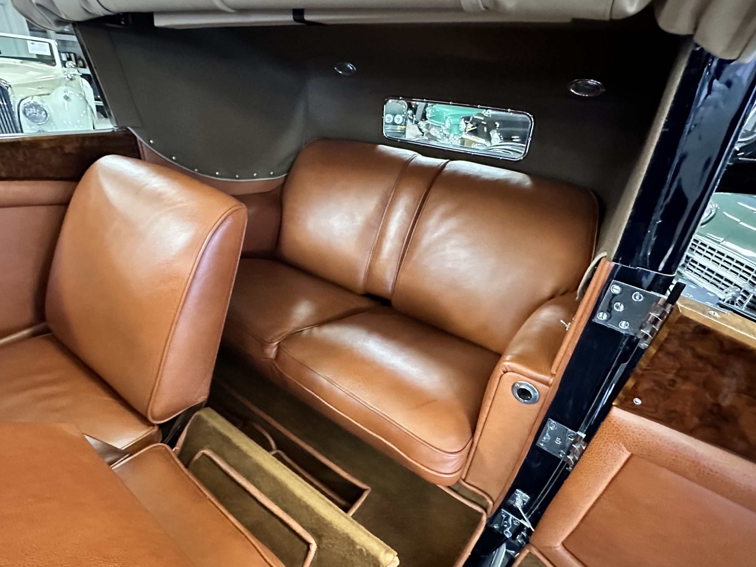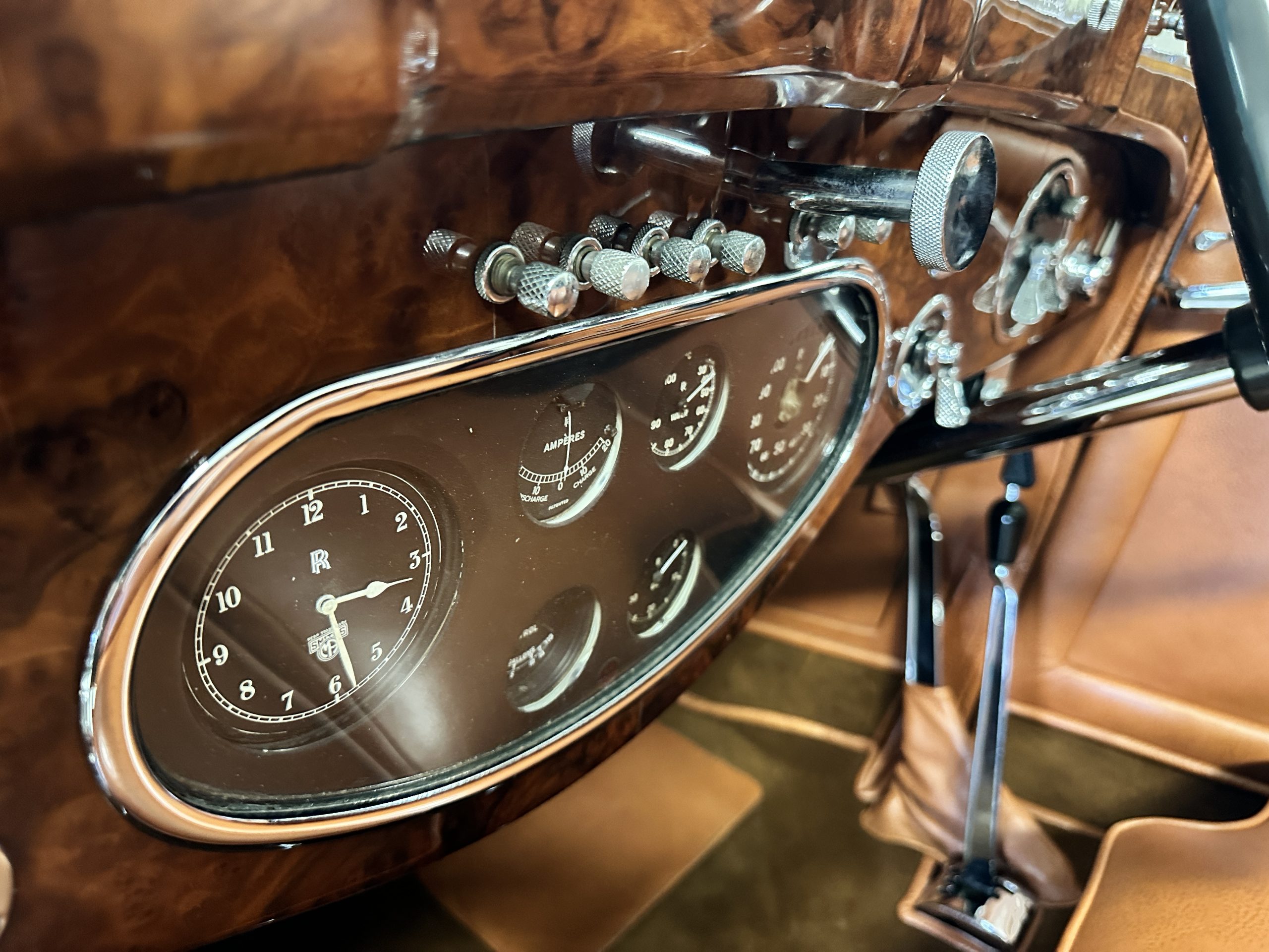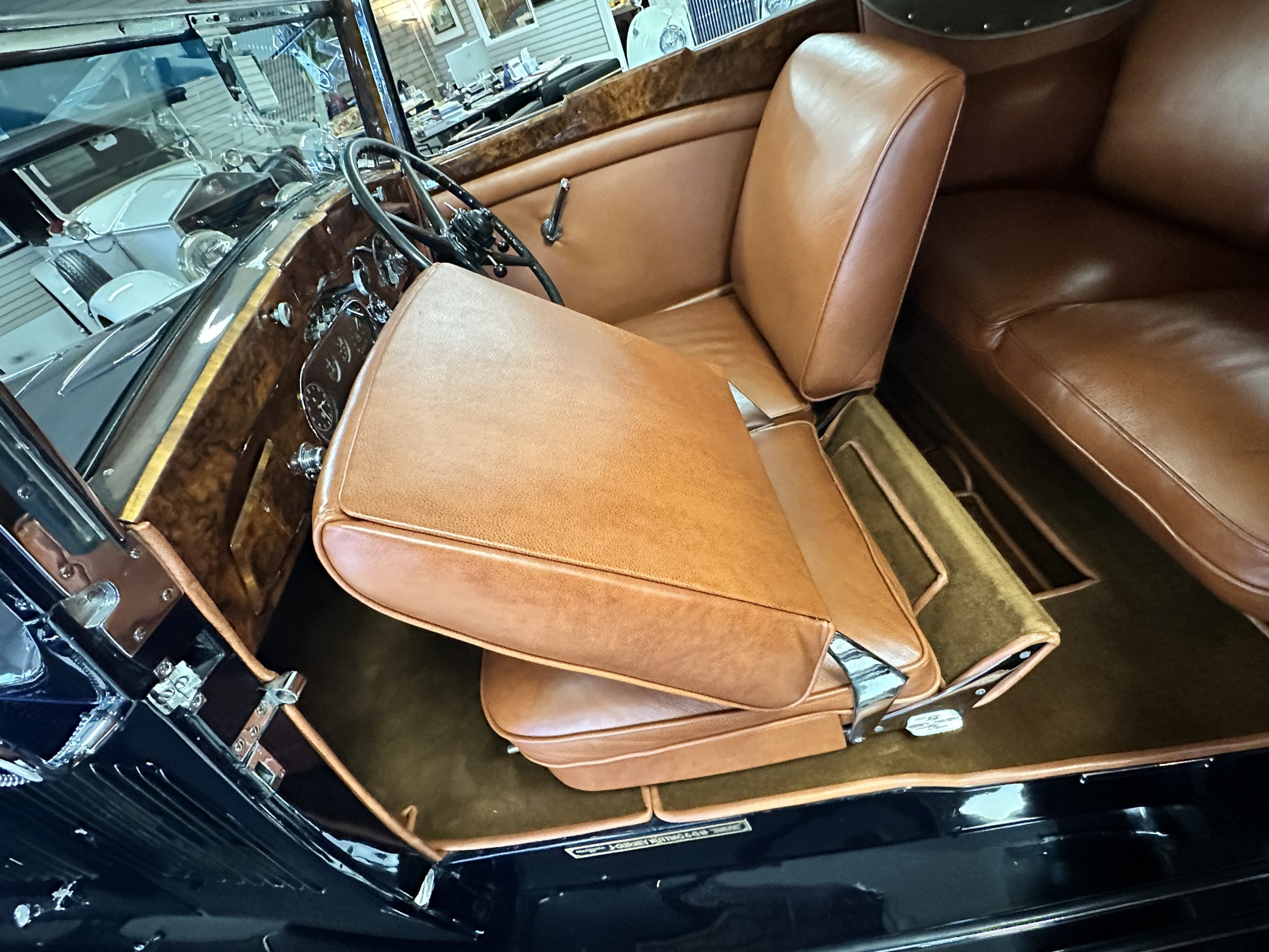 The livery is featured in a beautiful deep blue that appears black except for in the sunlight. The dark blue is complemented by red and royal blue twin pinstripes, polished aluminum ACE wheel discs and the classic tan Haartz canvas three-position convertible top. The paint is in beautiful condition with excellent shine and luster. There is normal slight wear in the high use areas near the hood and door jambs, otherwise the Rolls presents very well. The chrome and stainless-steel trim are in excellent condition. Attached to the short and rakish windshield posts are dual pillar mounted Grebel spotlights a beautiful blue tinted glass sun visor. In front of the iconic and massive Rolls-Royce grill is a Lucas center light. All of the accessories are in as-new condition, reflecting the care 82PY received while in the noted collections. The Dunlap Forte tires are exhibiting some age cracking. Overall, the exterior is in concours condition with few visible deductions only noticeable upon very close inspection.
