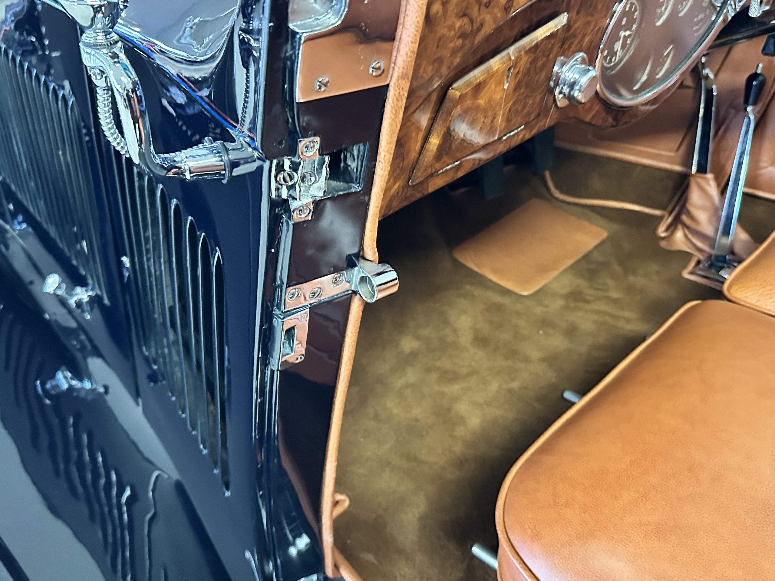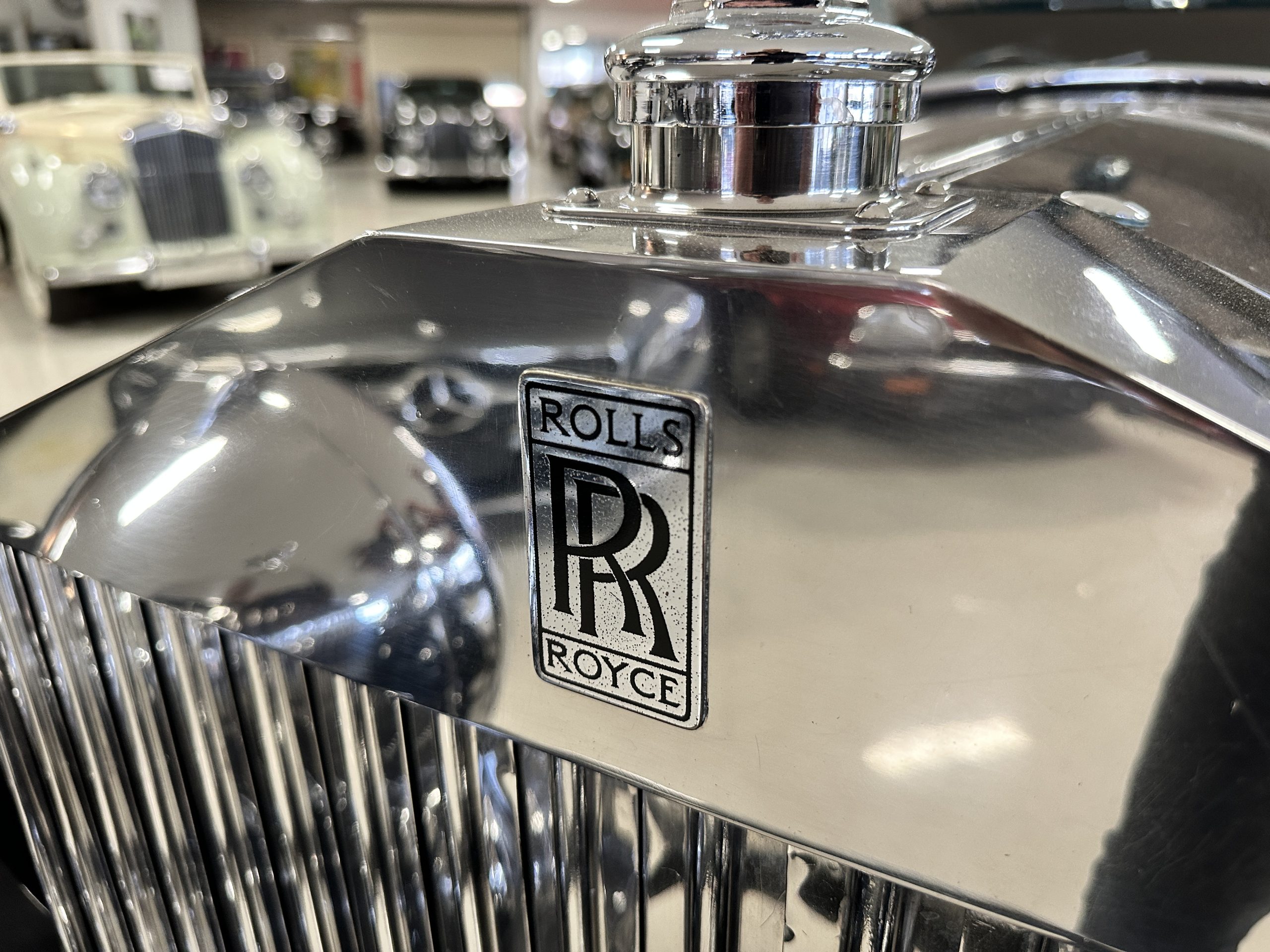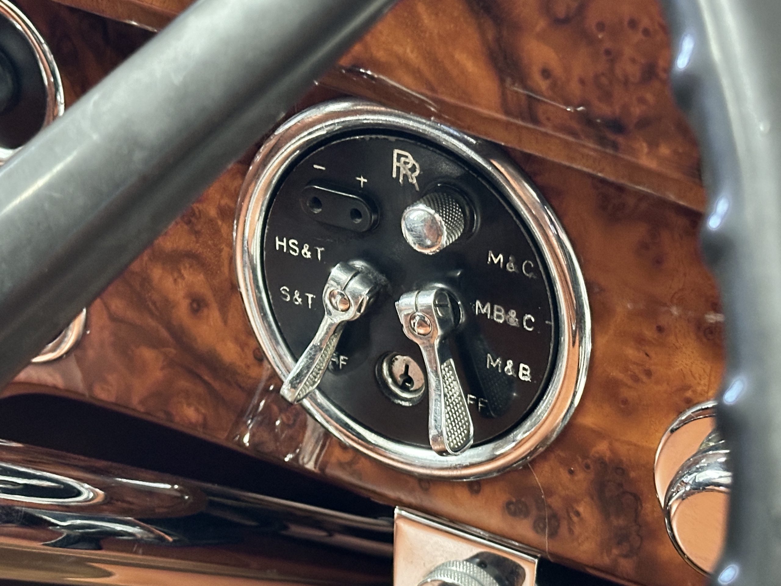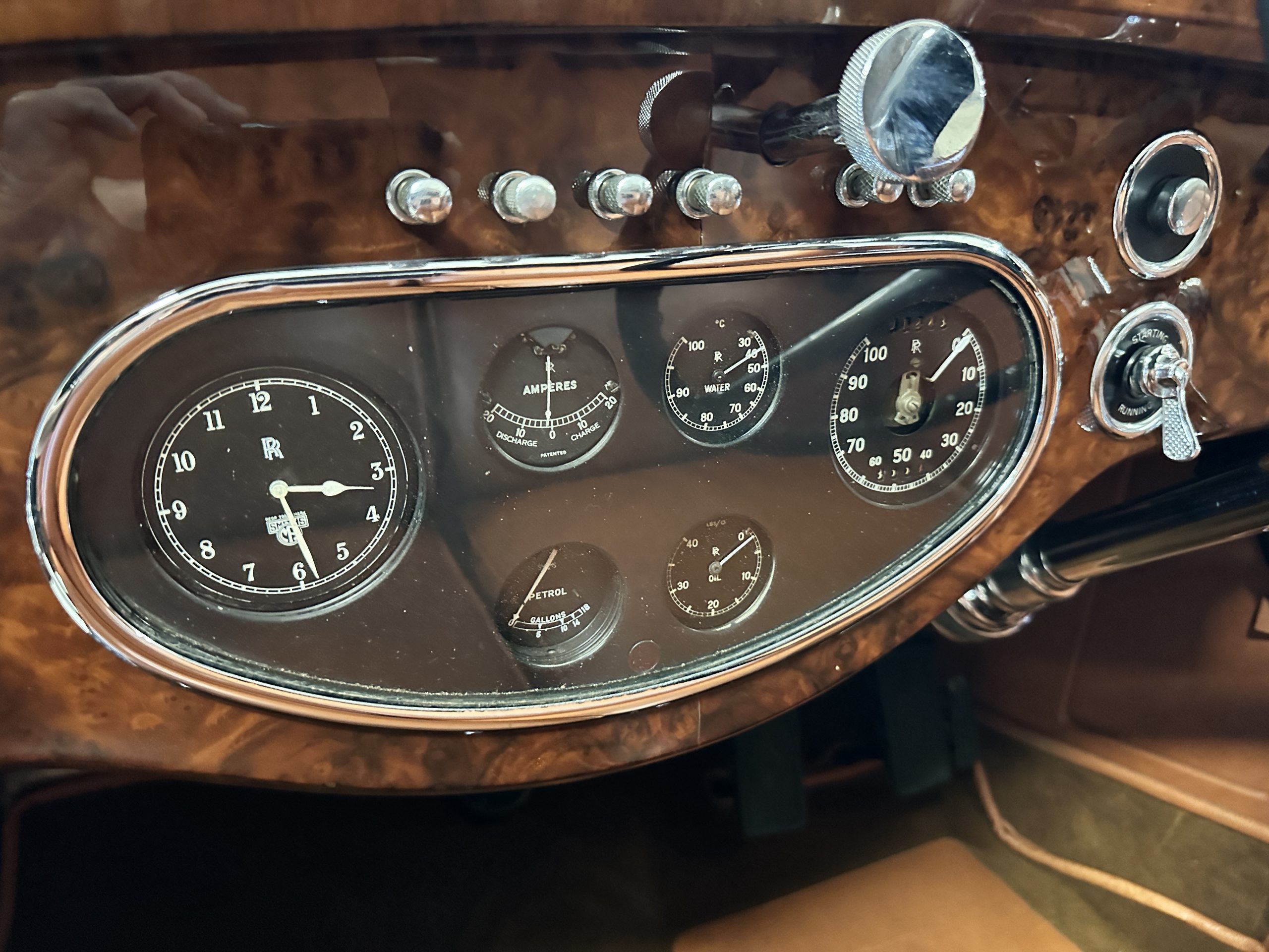 The livery is featured in a beautiful deep blue that appears black except for in the sunlight. The dark blue is complemented by red and royal blue twin pinstripes, polished aluminum ACE wheel discs and the classic tan Haartz canvas three-position convertible top. The paint is in beautiful condition with excellent shine and luster. There is normal slight wear in the high use areas near the hood and door jambs, otherwise the Rolls presents very well. The chrome and stainless-steel trim are in excellent condition. Attached to the short and rakish windshield posts are dual pillar mounted Grebel spotlights a beautiful blue tinted glass sun visor. In front of the iconic and massive Rolls-Royce grill is a Lucas center light. All of the accessories are in as-new condition, reflecting the care 82PY received while in the noted collections. The Dunlap Forte tires are exhibiting some age cracking. Overall, the exterior is in concours condition with few visible deductions only noticeable upon very close inspection.