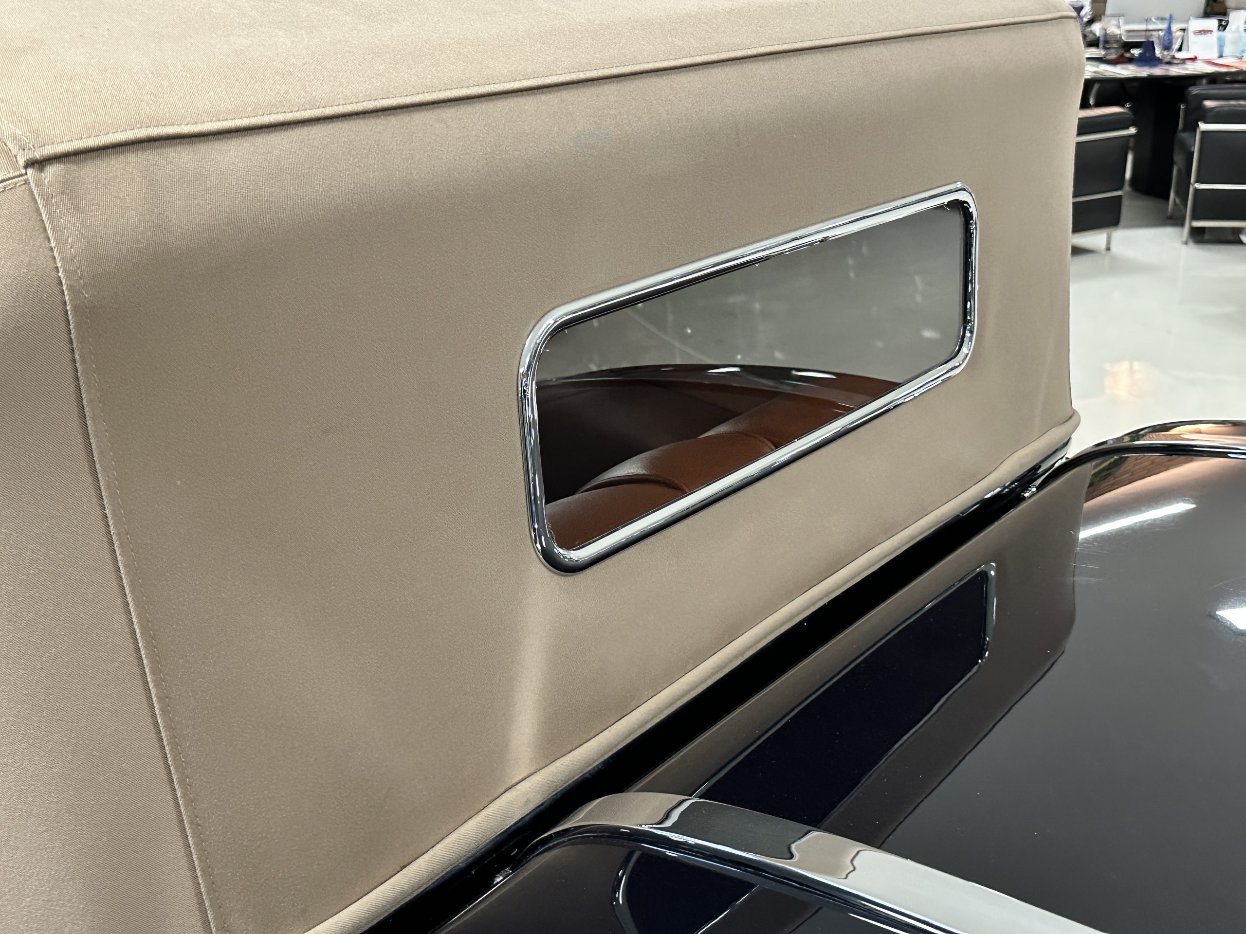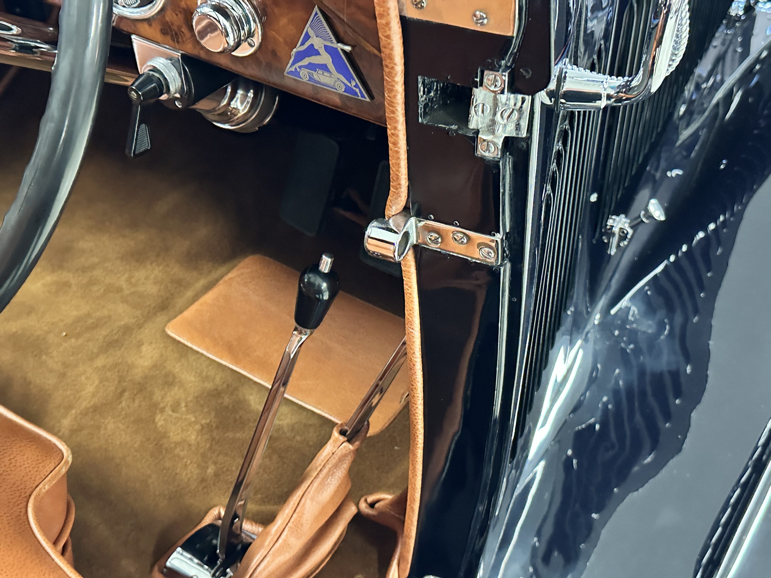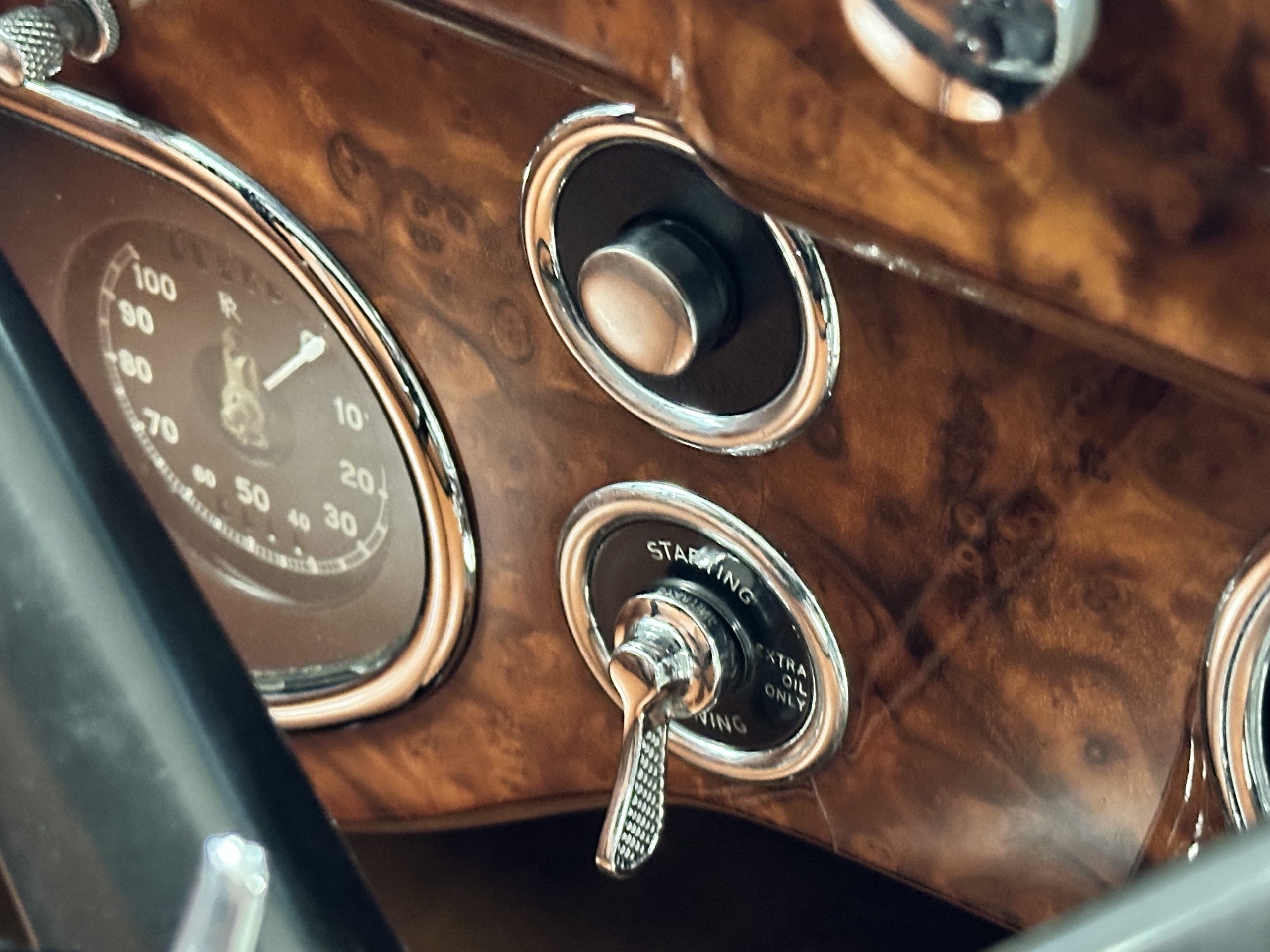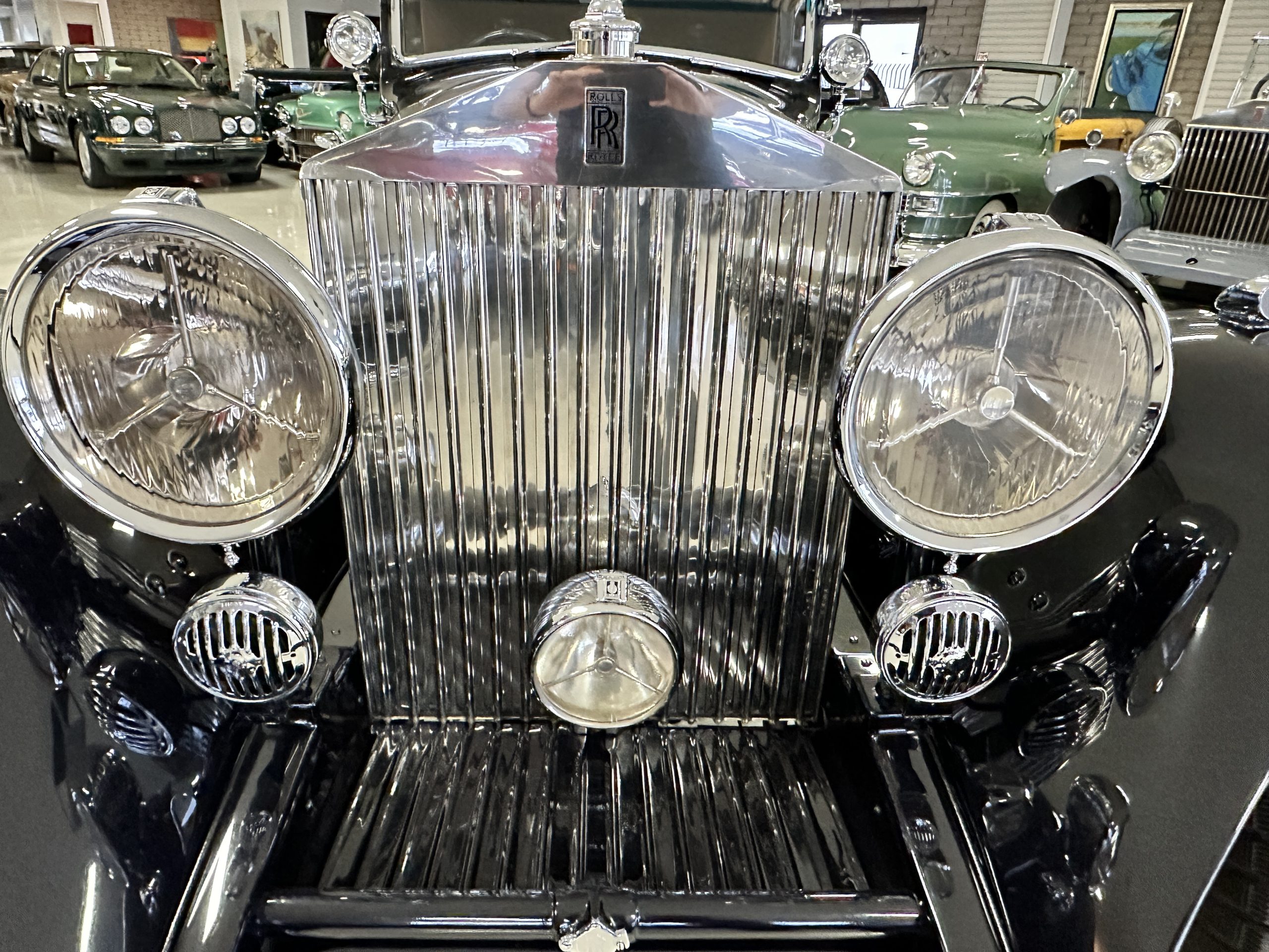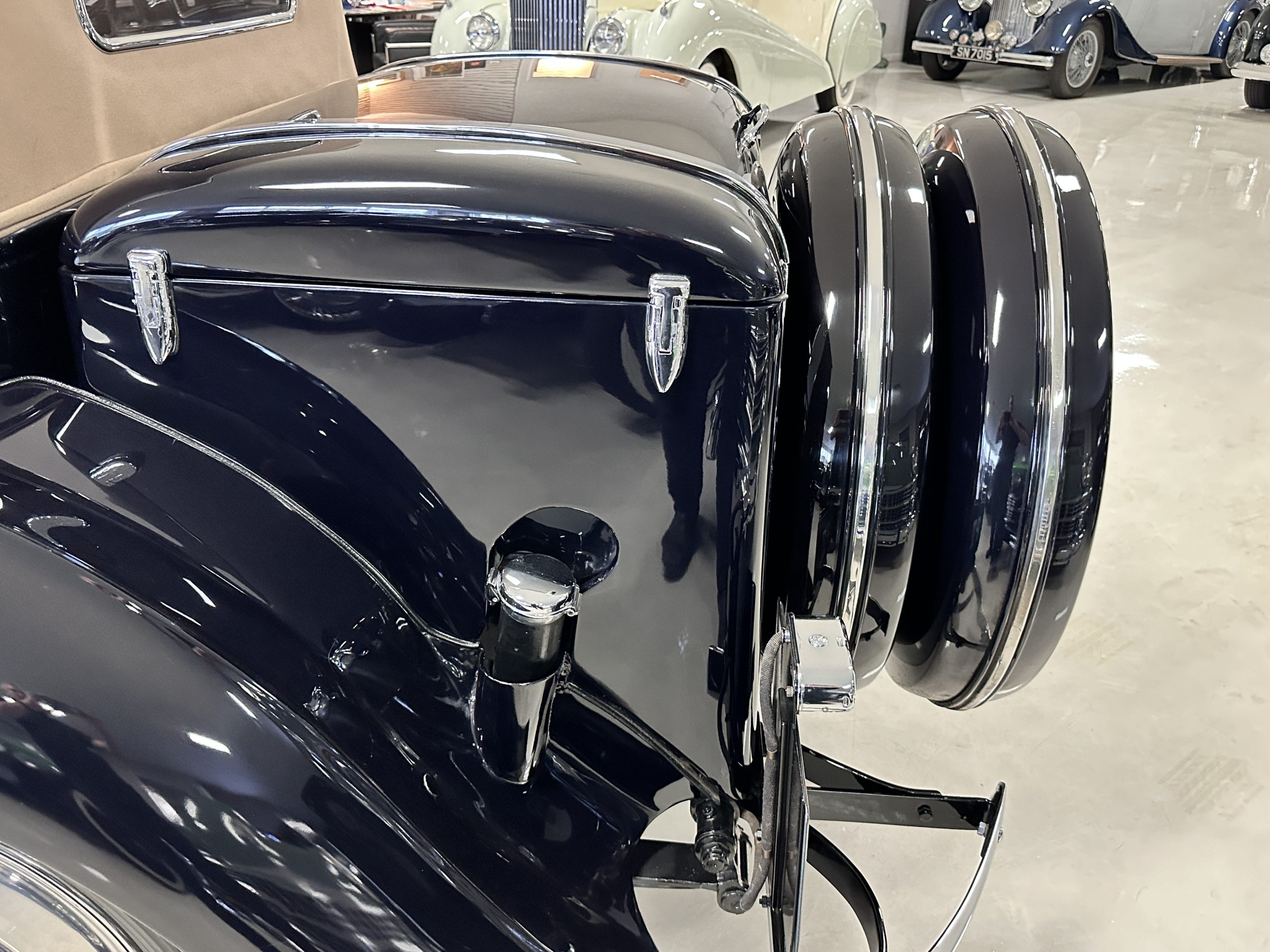 The livery is featured in a beautiful deep blue that appears black except for in the sunlight. The dark blue is complemented by red and royal blue twin pinstripes, polished aluminum ACE wheel discs and the classic tan Haartz canvas three-position convertible top. The paint is in beautiful condition with excellent shine and luster. There is normal slight wear in the high use areas near the hood and door jambs, otherwise the Rolls presents very well. The chrome and stainless-steel trim are in excellent condition. Attached to the short and rakish windshield posts are dual pillar mounted Grebel spotlights a beautiful blue tinted glass sun visor. In front of the iconic and massive Rolls-Royce grill is a Lucas center light. All of the accessories are in as-new condition, reflecting the care 82PY received while in the noted collections. The Dunlap Forte tires are exhibiting some age cracking. Overall, the exterior is in concours condition with few visible deductions only noticeable upon very close inspection.
