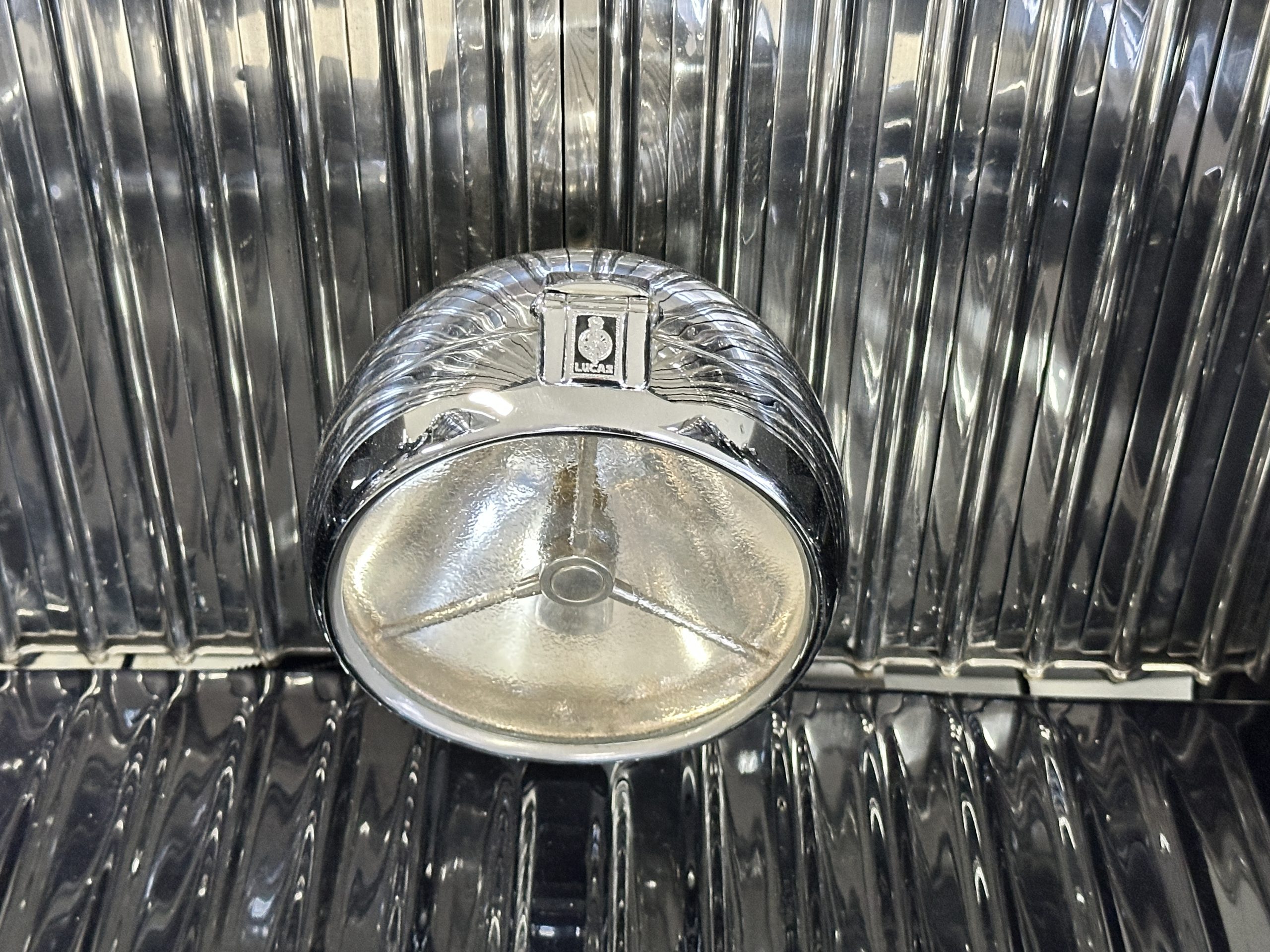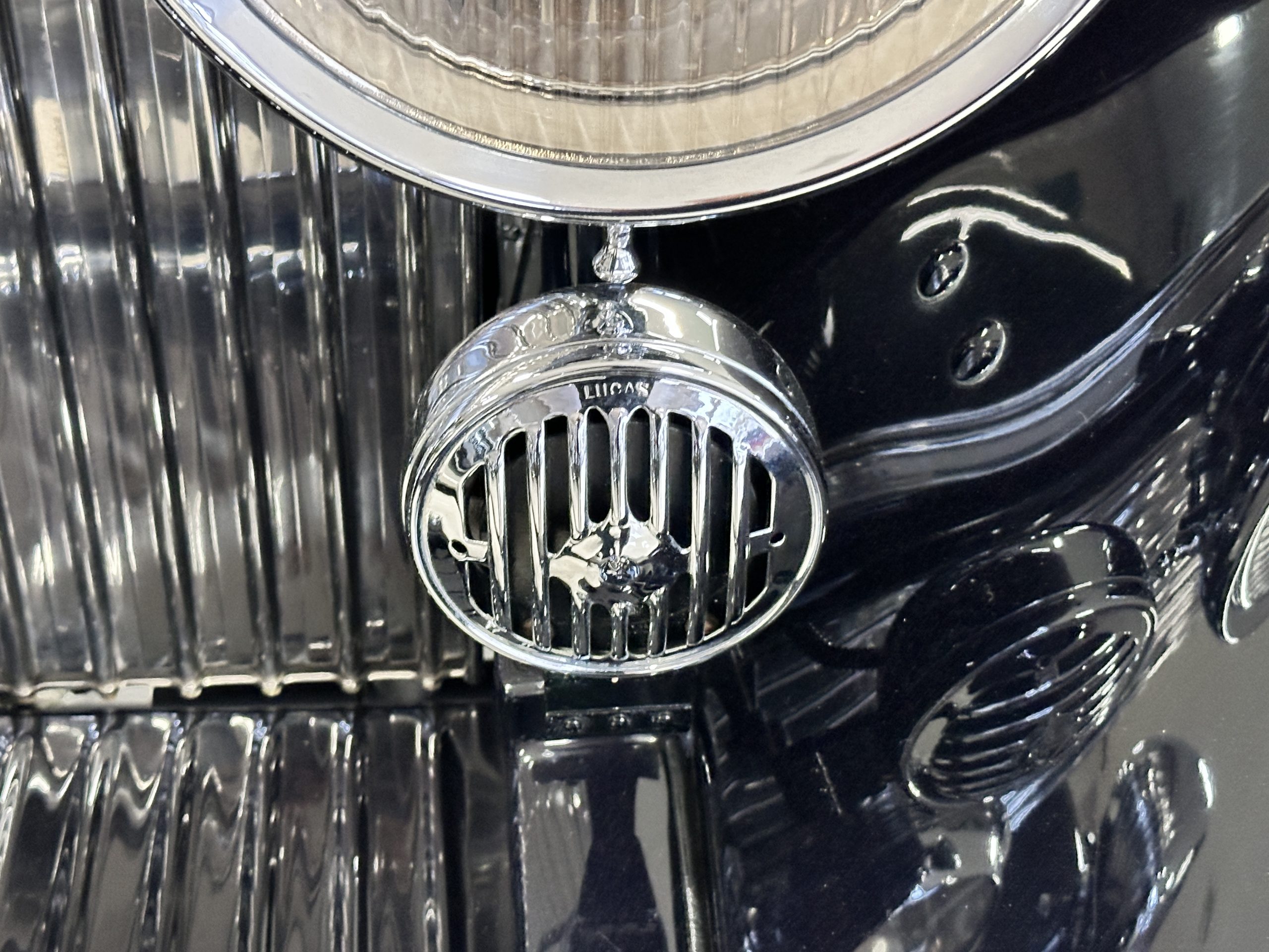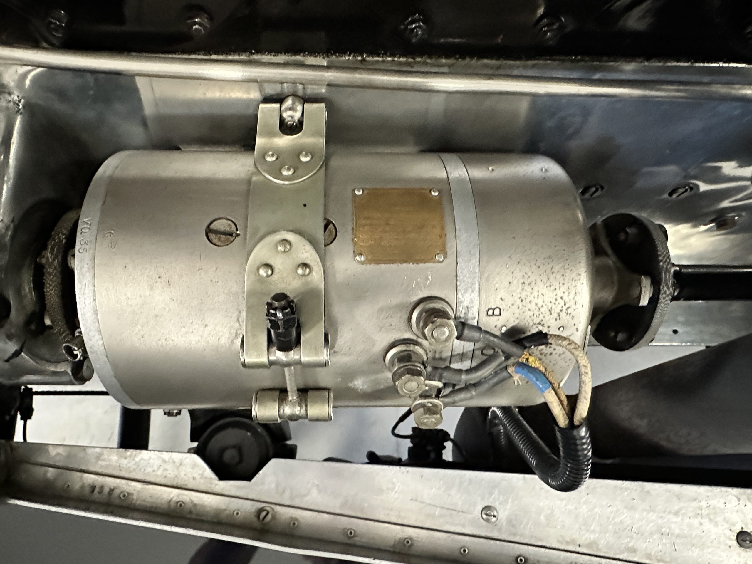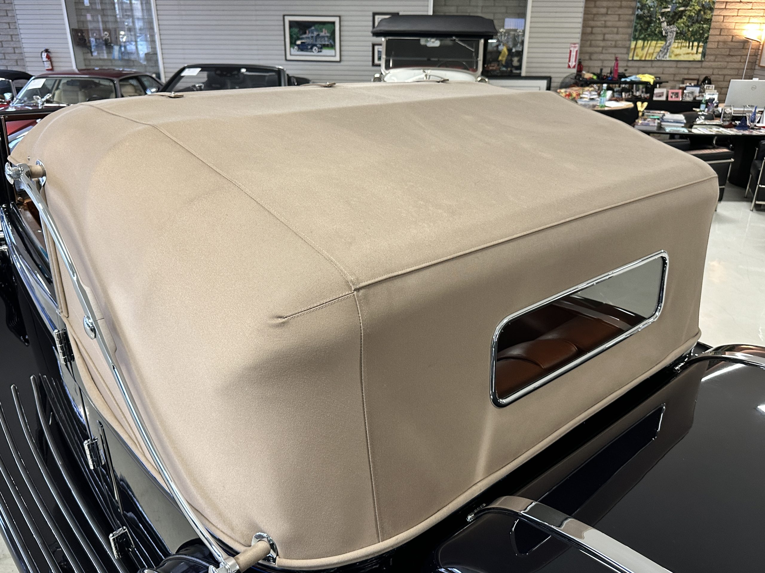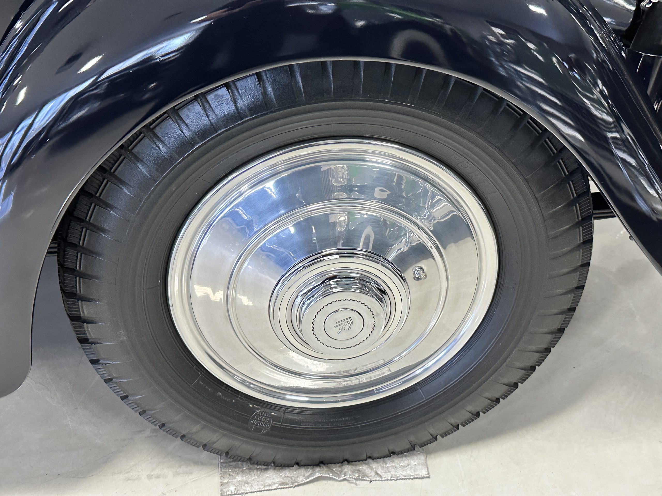 The livery is featured in a beautiful deep blue that appears black except for in the sunlight. The dark blue is complemented by red and royal blue twin pinstripes, polished aluminum ACE wheel discs and the classic tan Haartz canvas three-position convertible top. The paint is in beautiful condition with excellent shine and luster. There is normal slight wear in the high use areas near the hood and door jambs, otherwise the Rolls presents very well. The chrome and stainless-steel trim are in excellent condition. Attached to the short and rakish windshield posts are dual pillar mounted Grebel spotlights a beautiful blue tinted glass sun visor. In front of the iconic and massive Rolls-Royce grill is a Lucas center light. All of the accessories are in as-new condition, reflecting the care 82PY received while in the noted collections. The Dunlap Forte tires are exhibiting some age cracking. Overall, the exterior is in concours condition with few visible deductions only noticeable upon very close inspection.