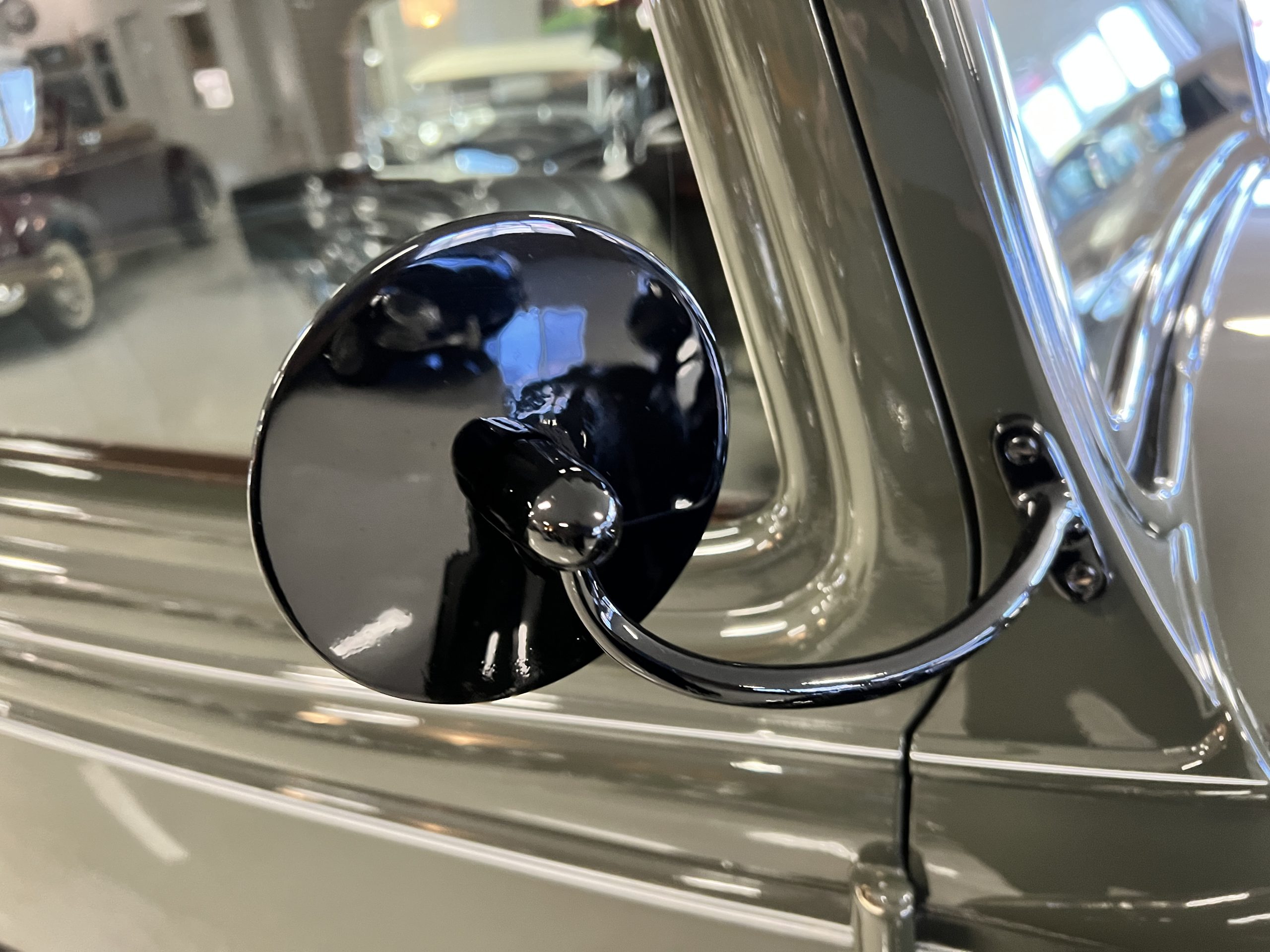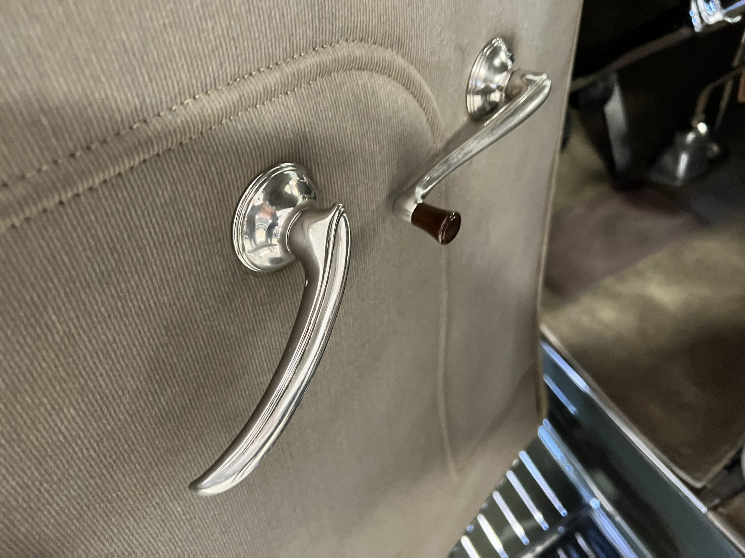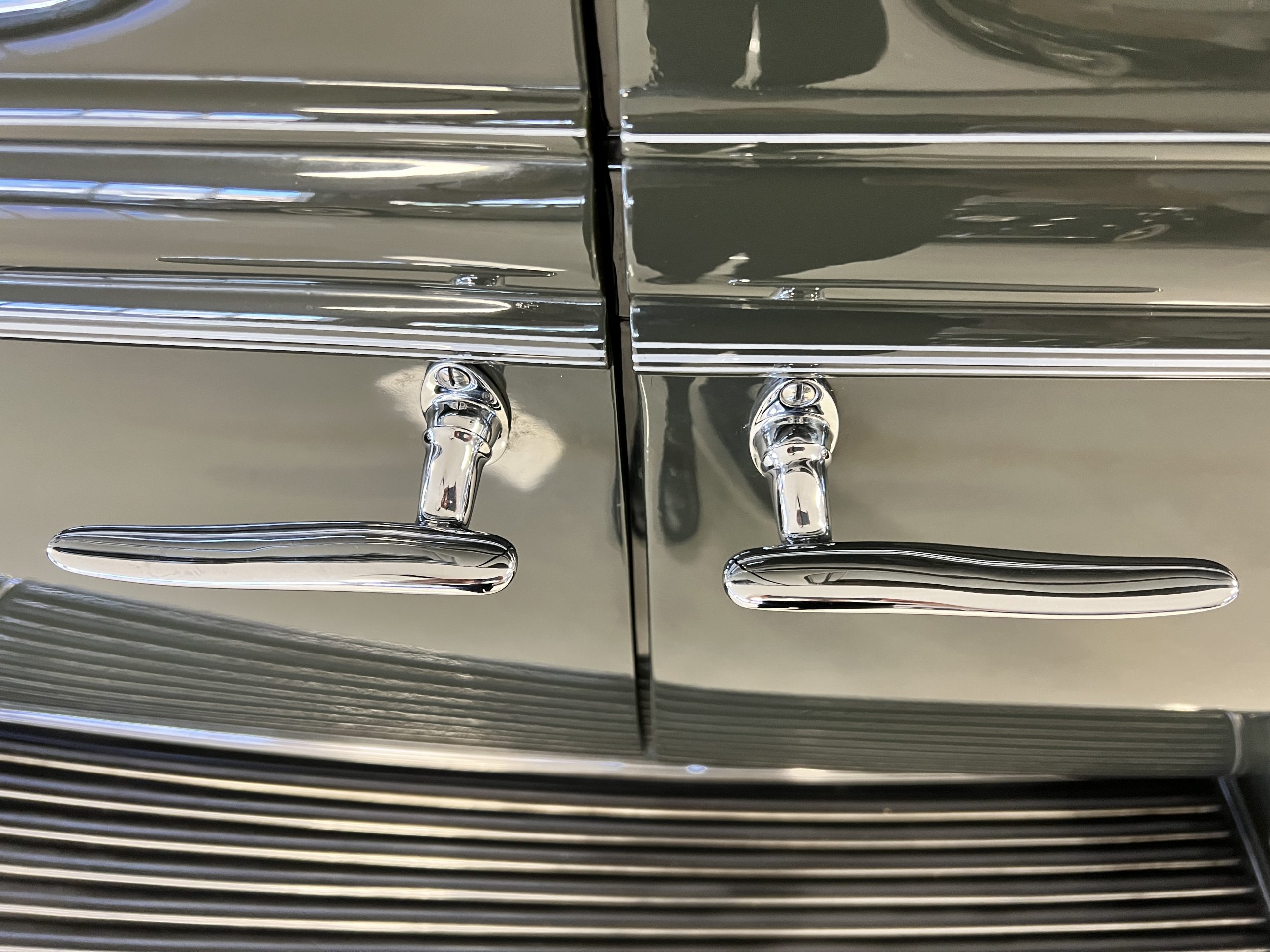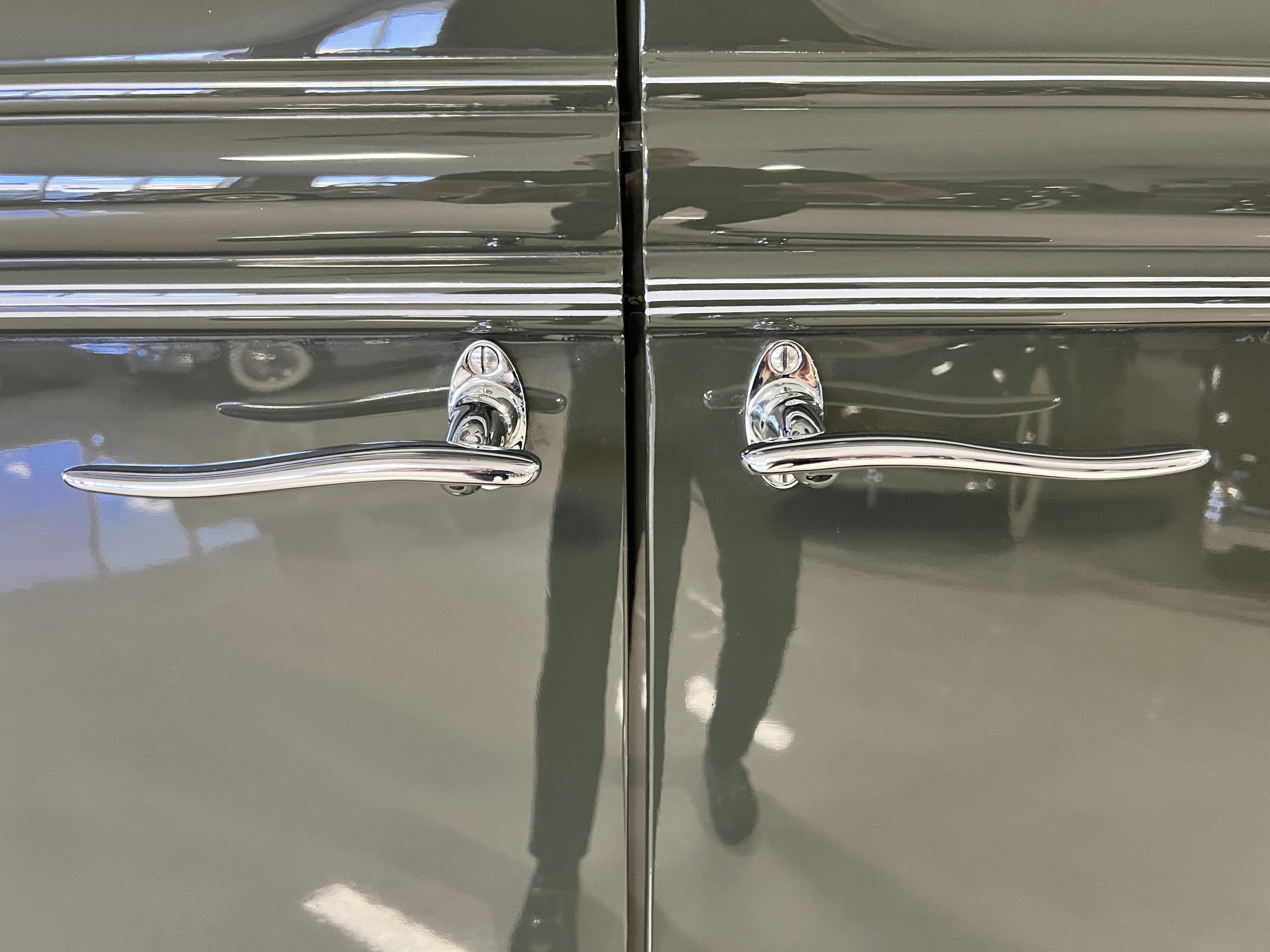 The livery was refinished in its original Slate Green. The paint is fantastic and is complimented by gray coachstripes and beautiful chrome finished throughout. This was accomplished from the thorough restoration with a bare metal respray and all the finishes redone to very high concours standards.