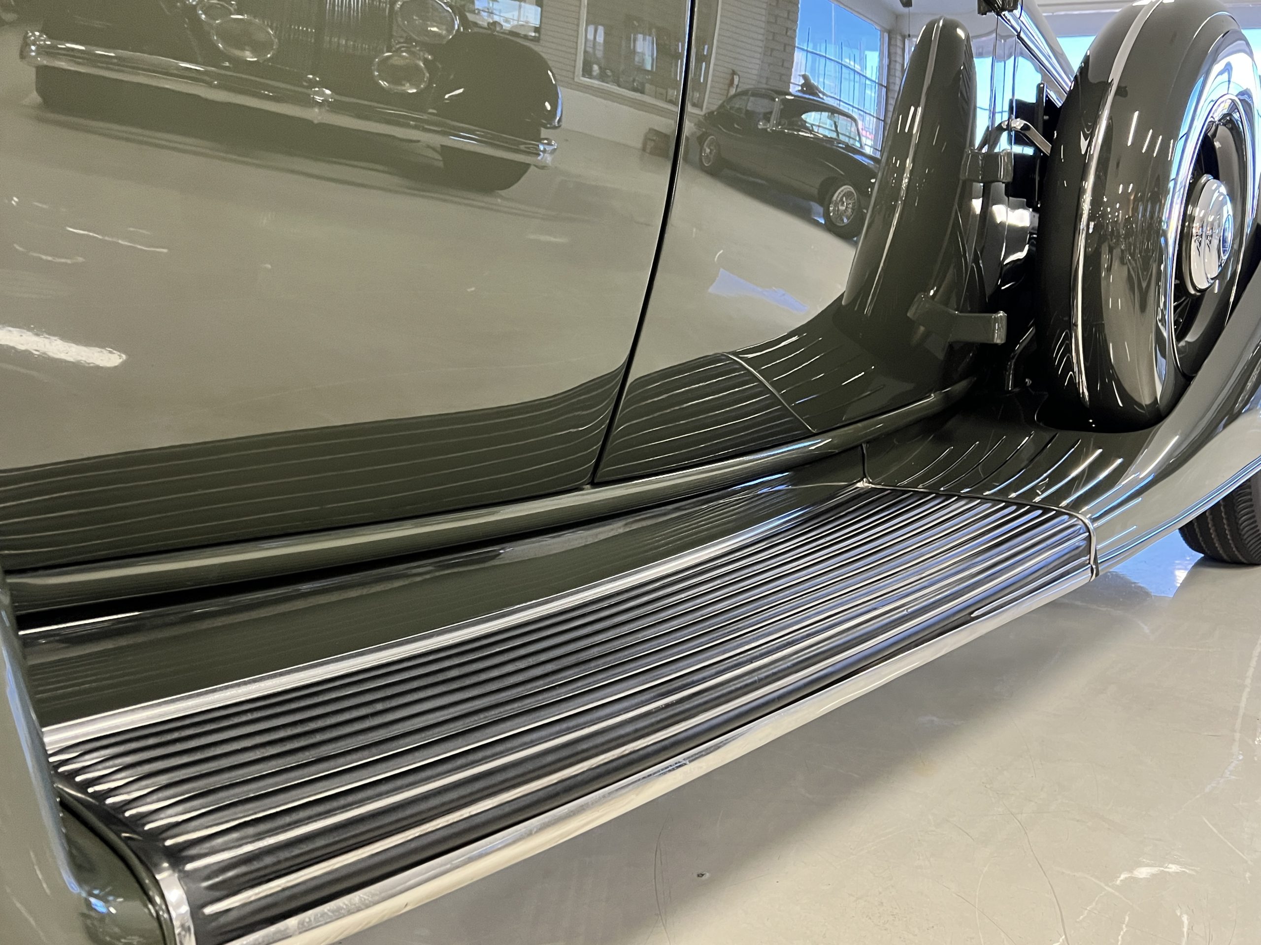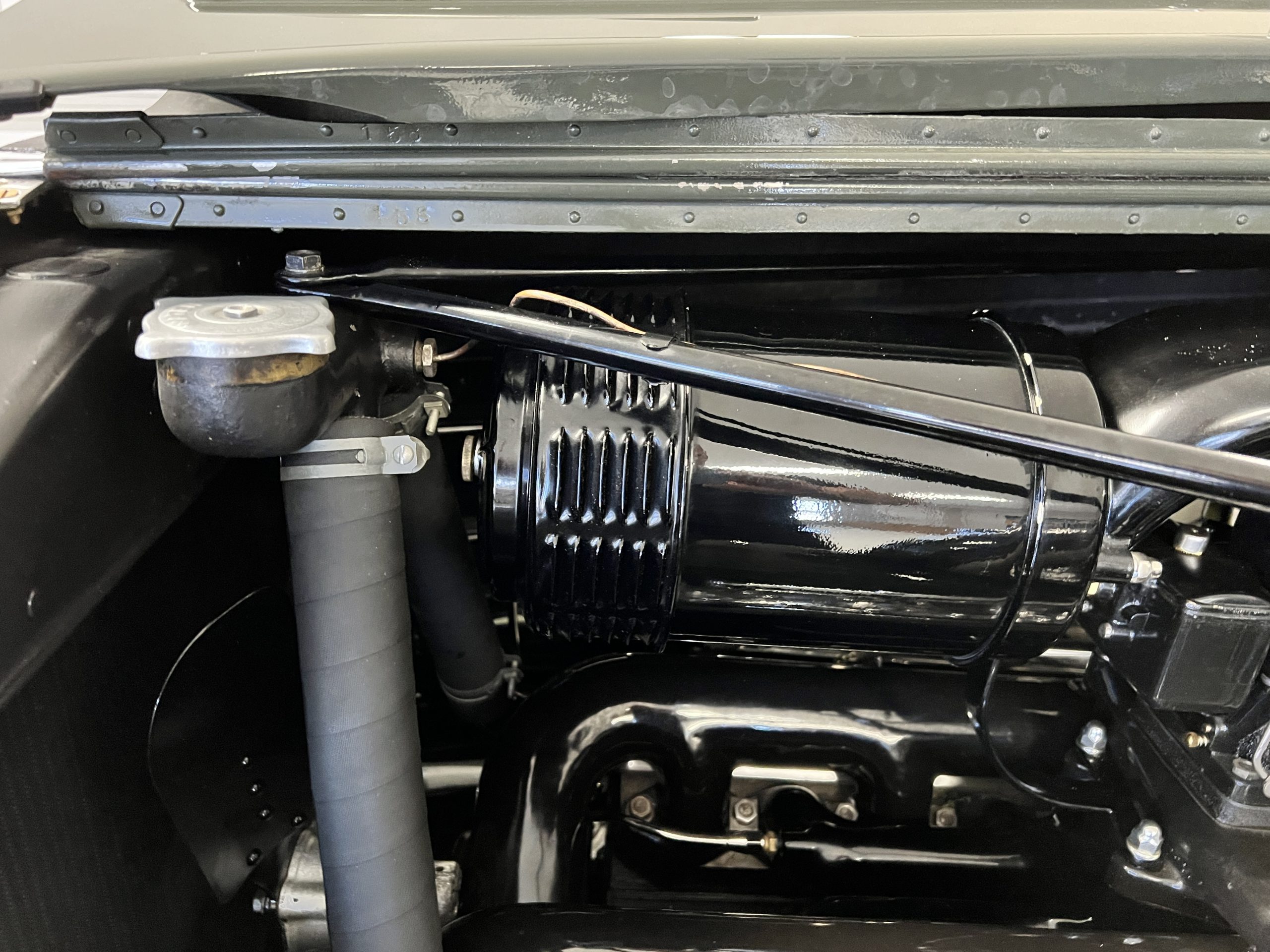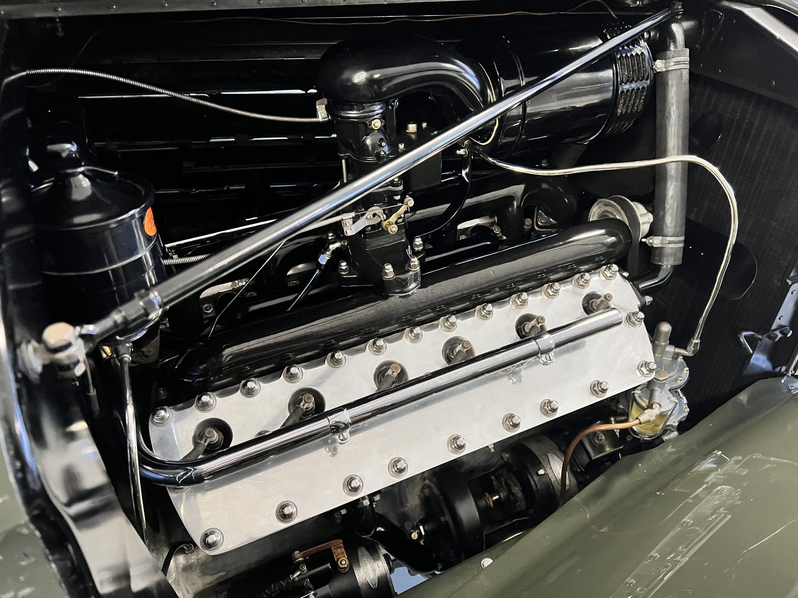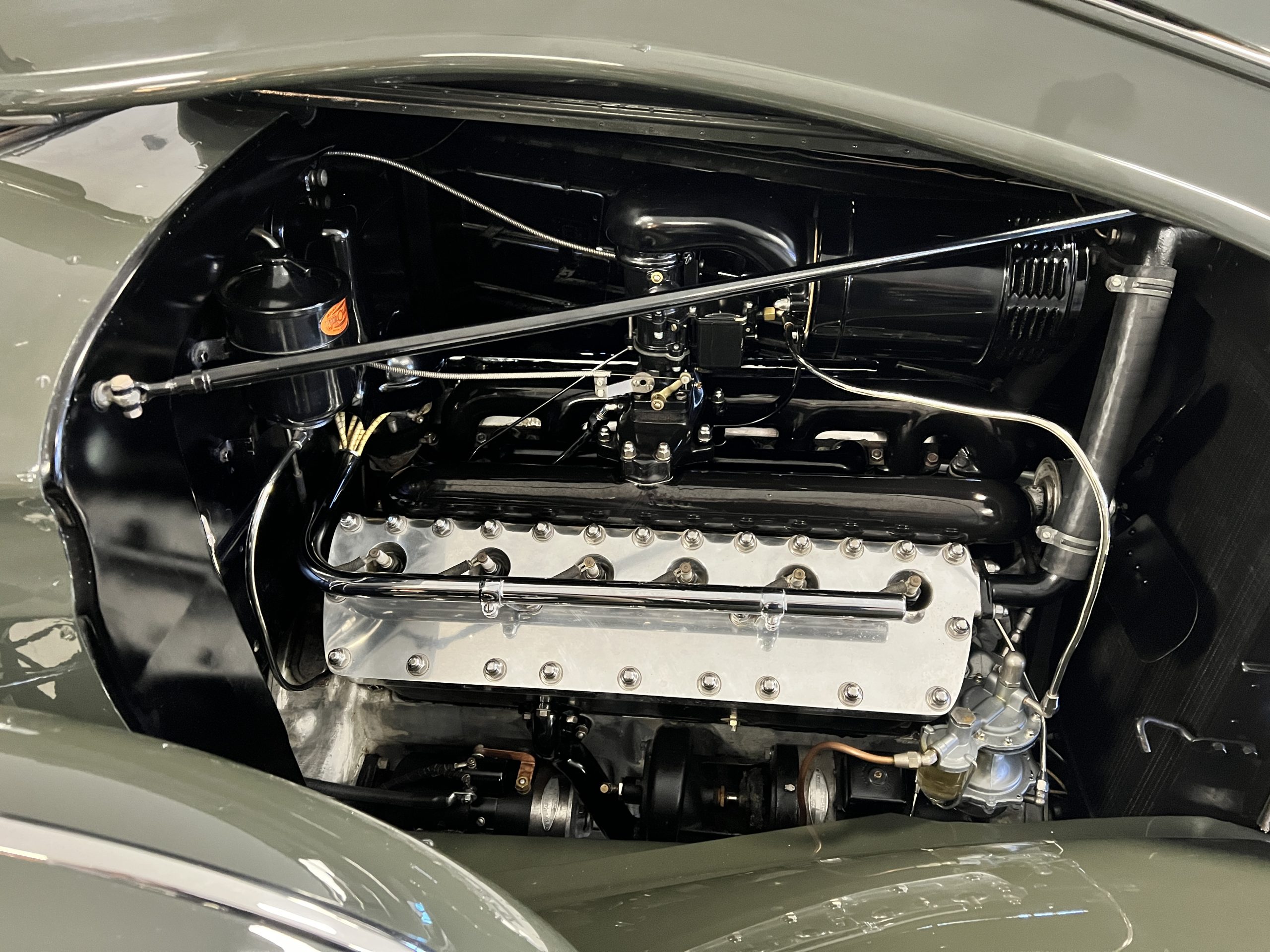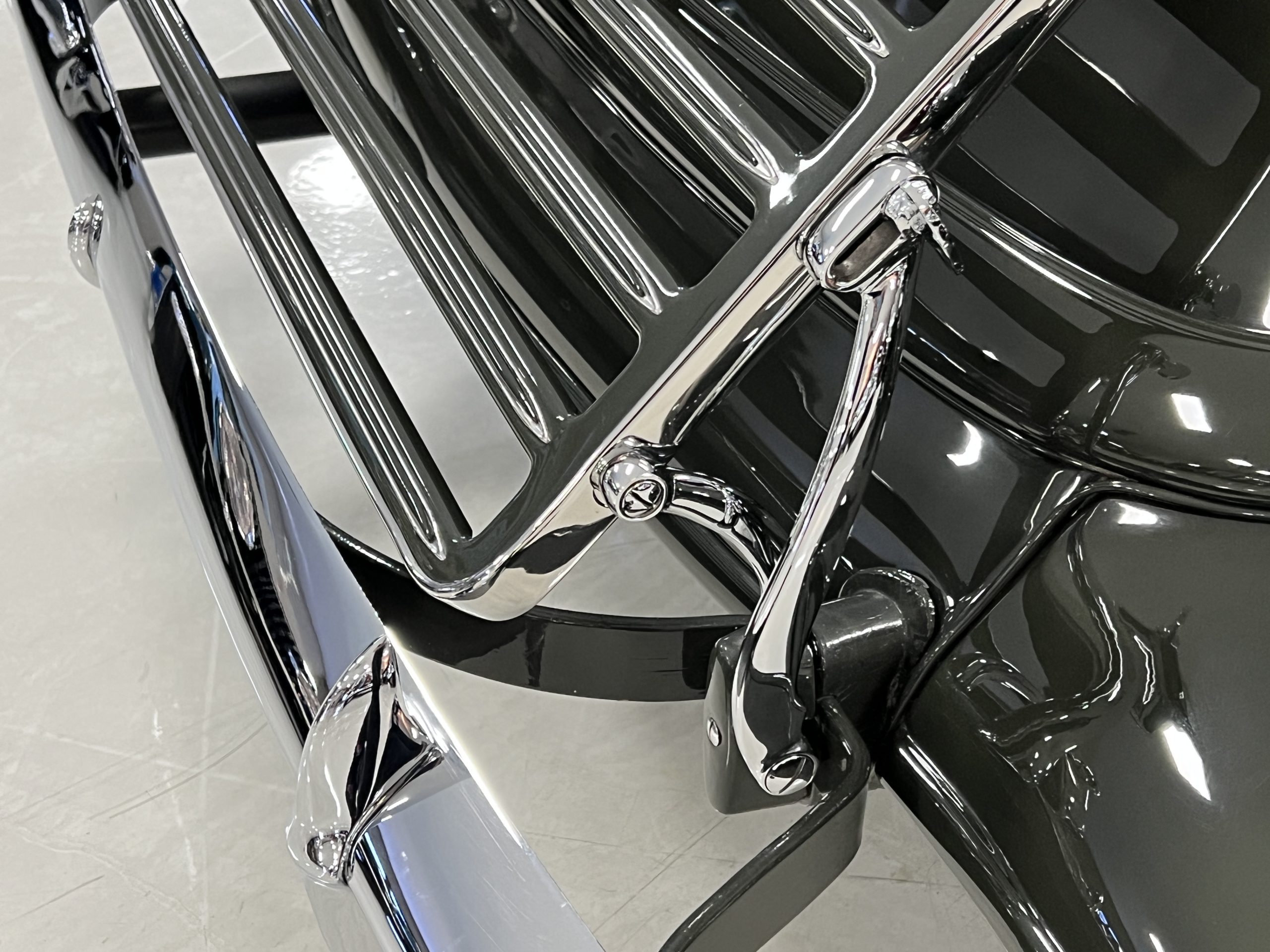 The livery was refinished in its original Slate Green. The paint is fantastic and is complimented by gray coachstripes and beautiful chrome finished throughout. This was accomplished from the thorough restoration with a bare metal respray and all the finishes redone to very high concours standards.