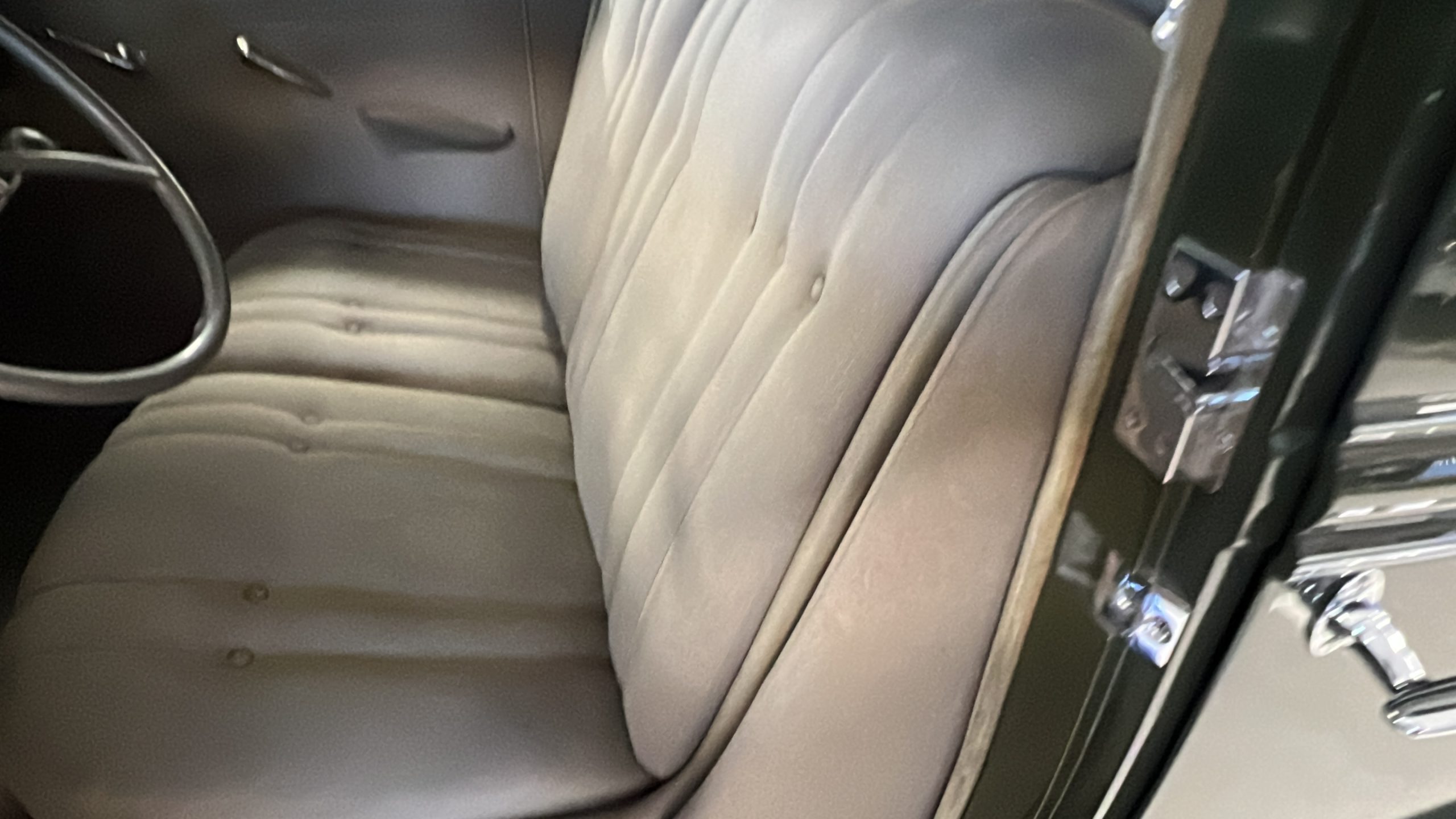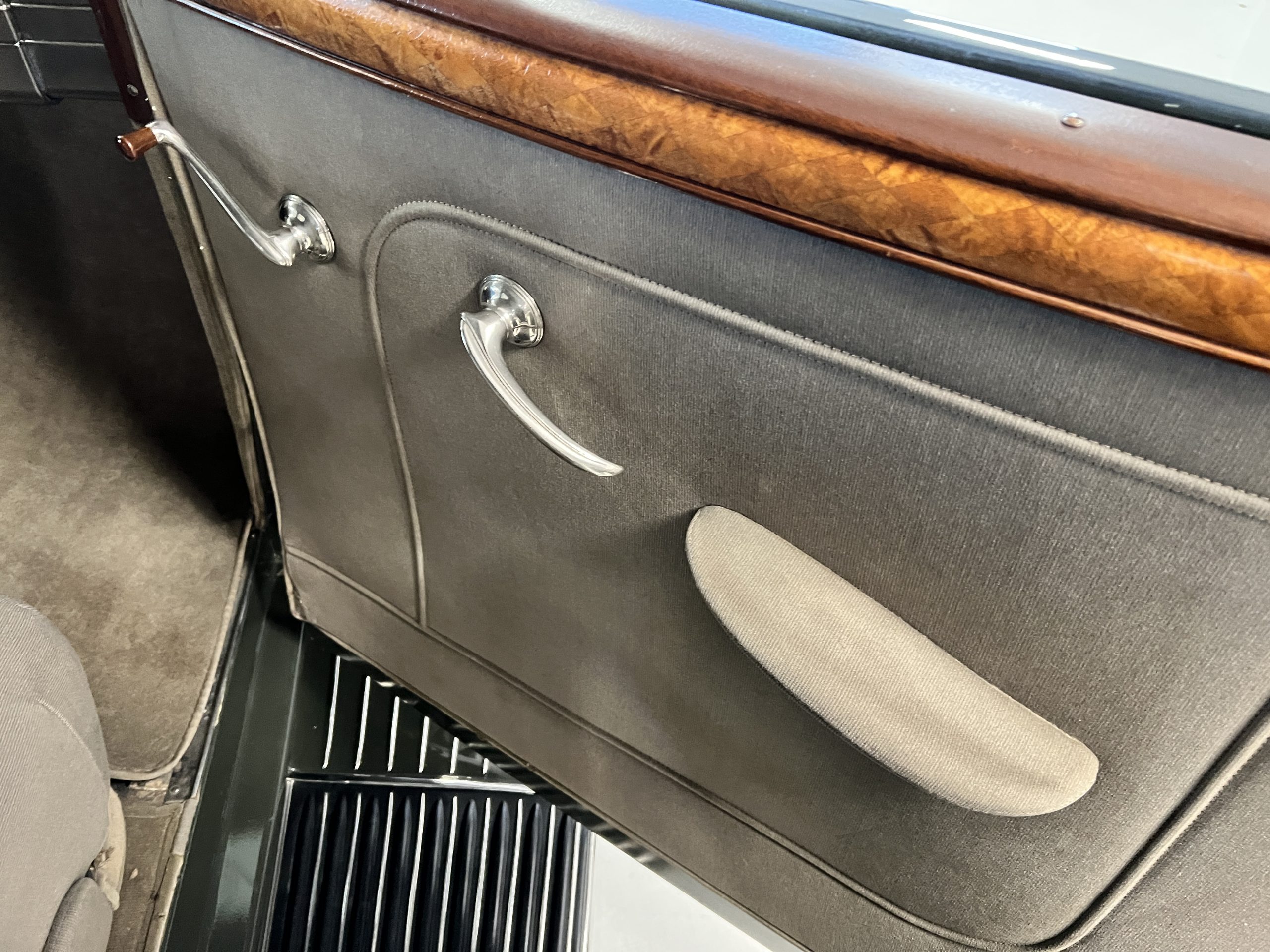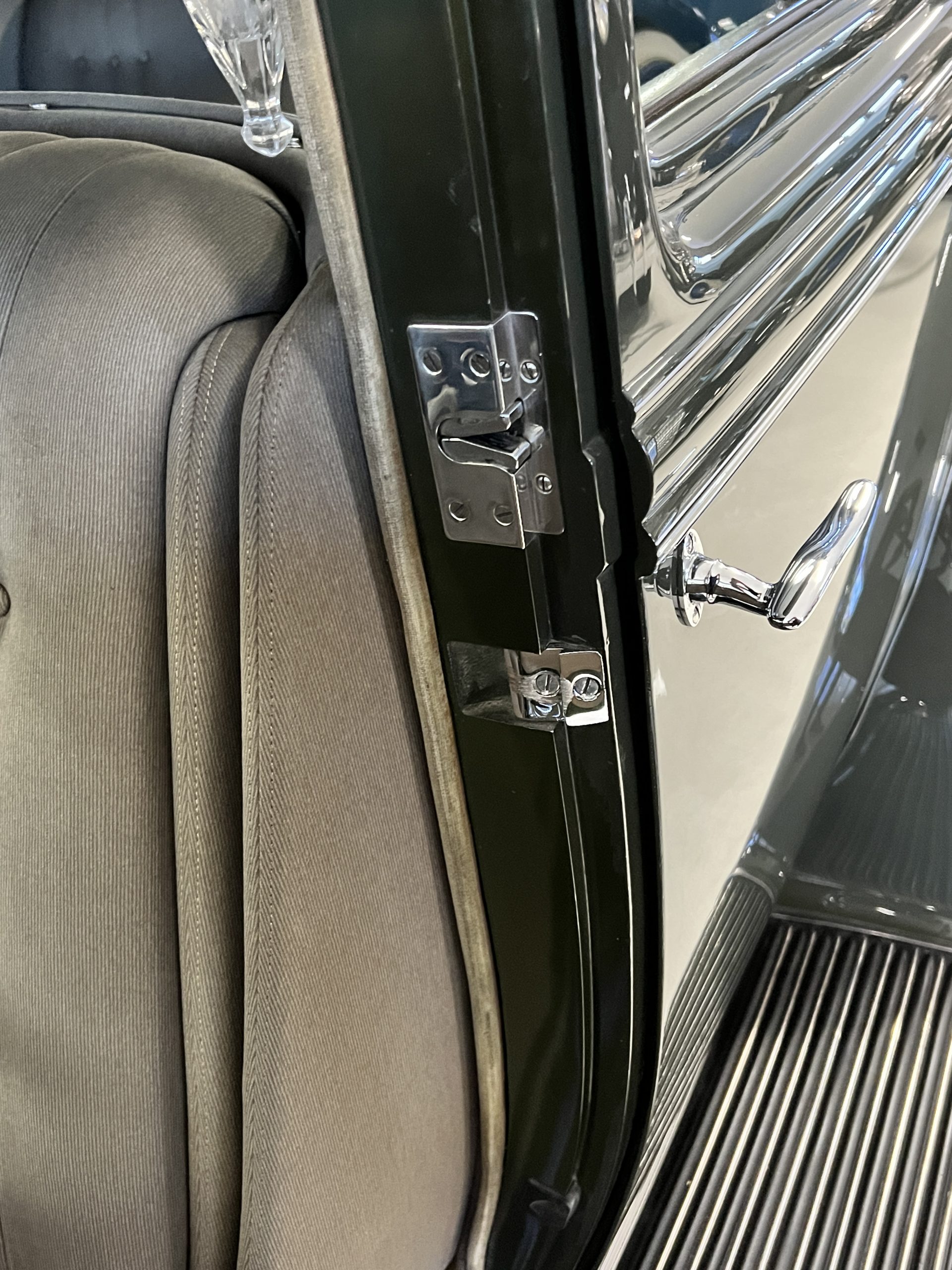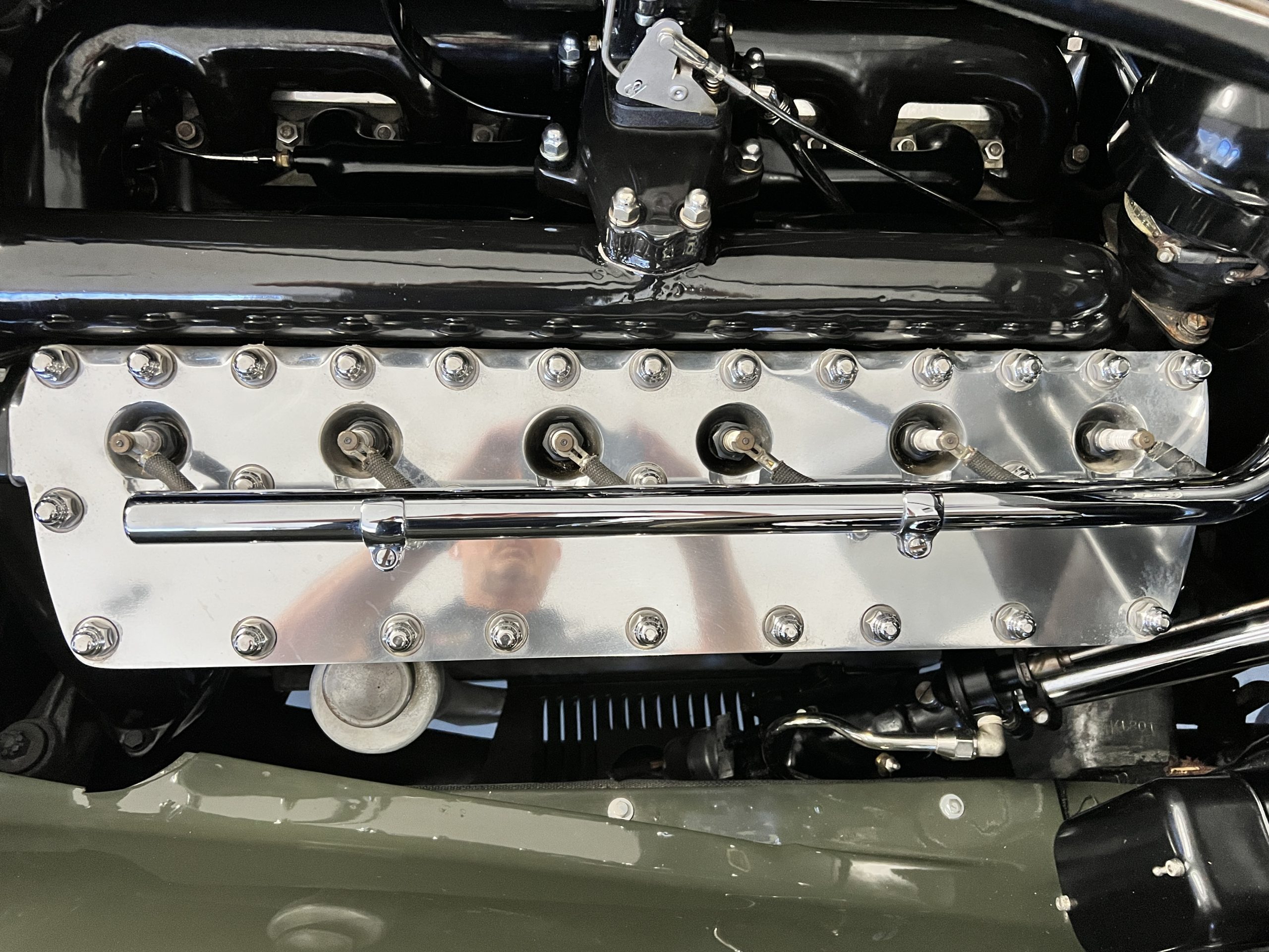 The livery was refinished in its original Slate Green. The paint is fantastic and is complimented by gray coachstripes and beautiful chrome finished throughout. This was accomplished from the thorough restoration with a bare metal respray and all the finishes redone to very high concours standards.
