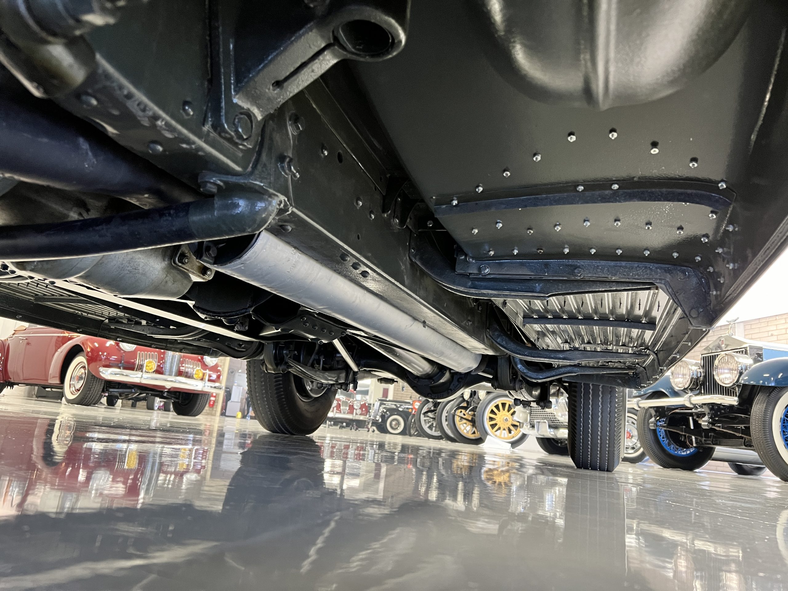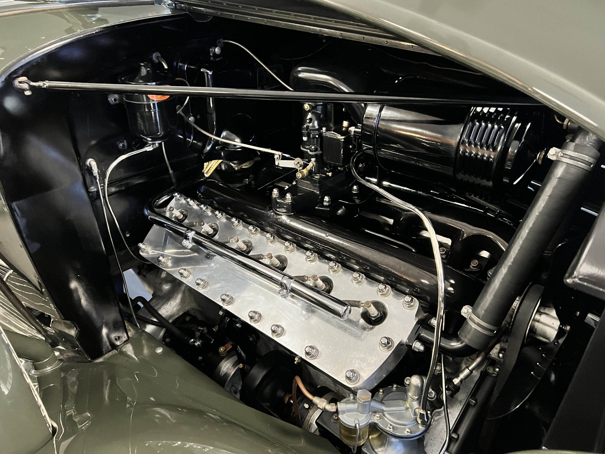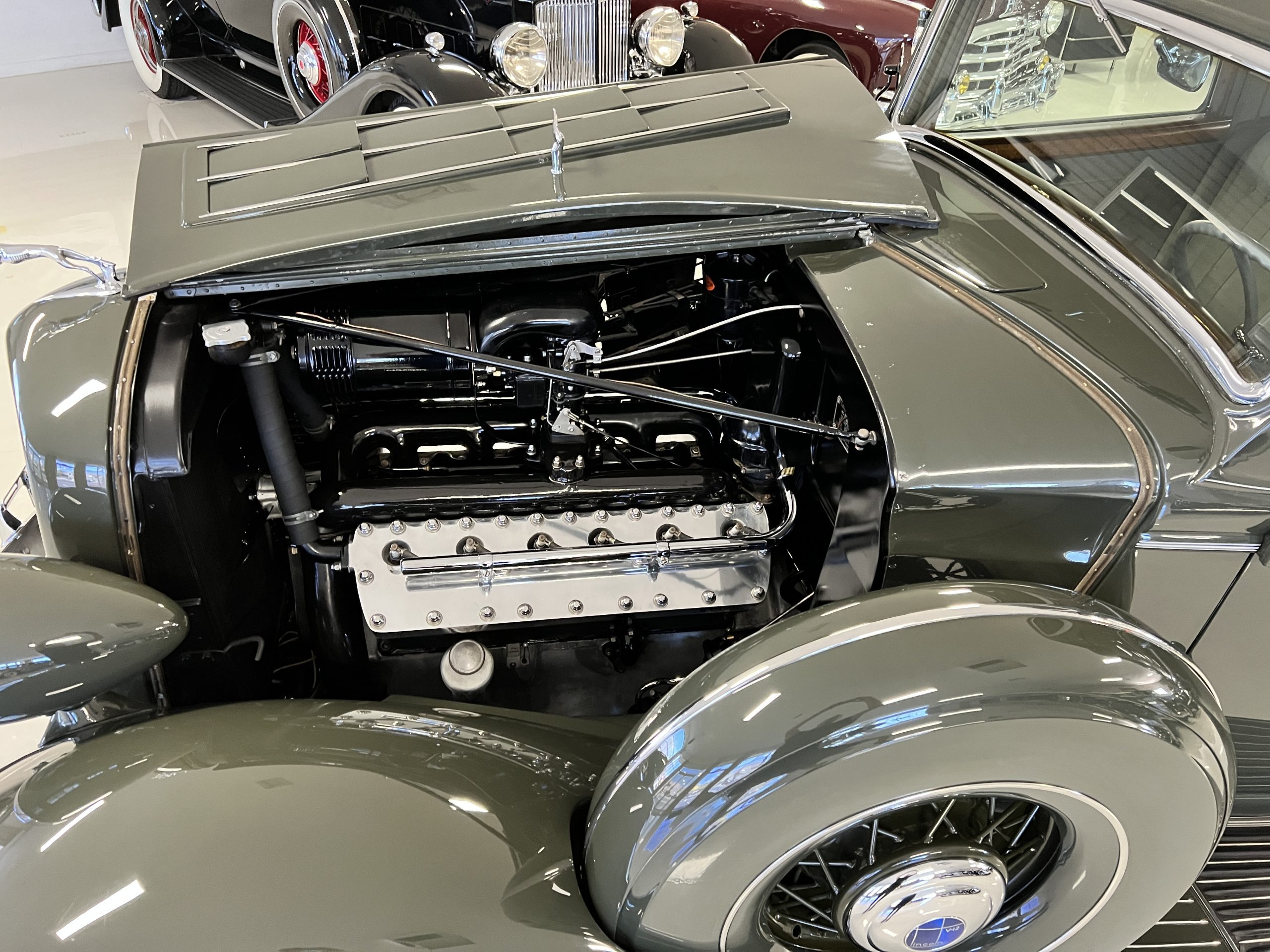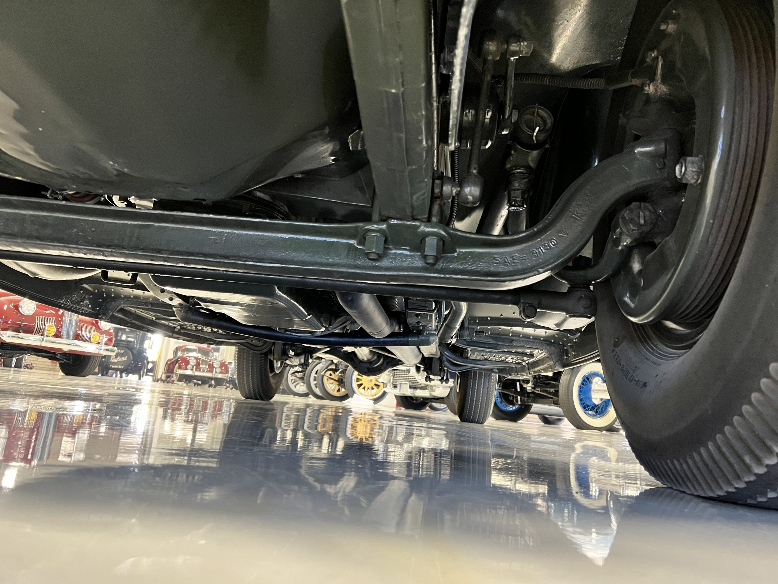 The engine compartment and the venerable 414 CID V12 are all in concours condition today. With 150 bhp, the V12 performs beautifully today, especially on the smaller and lighter shorter wheelbase. The engine was carefully disassembled and carefully inspected. It exhibited almost no wear and was then reassembled and new replacement aluminum heads were installed. It is now running beautifully. The chassis was completely stripped and repainted to concours standards in a matching Slate Green. It is gorgeous!