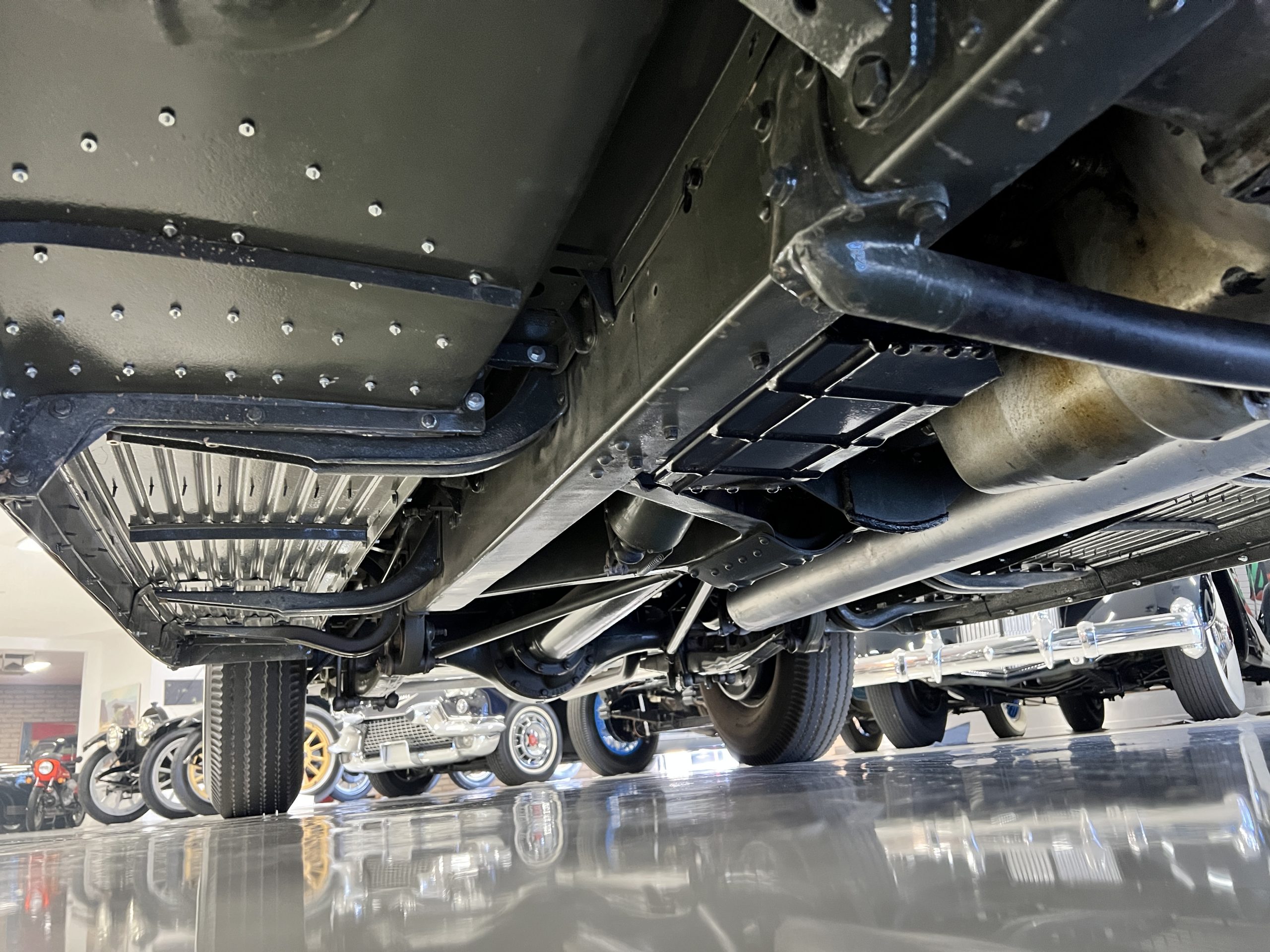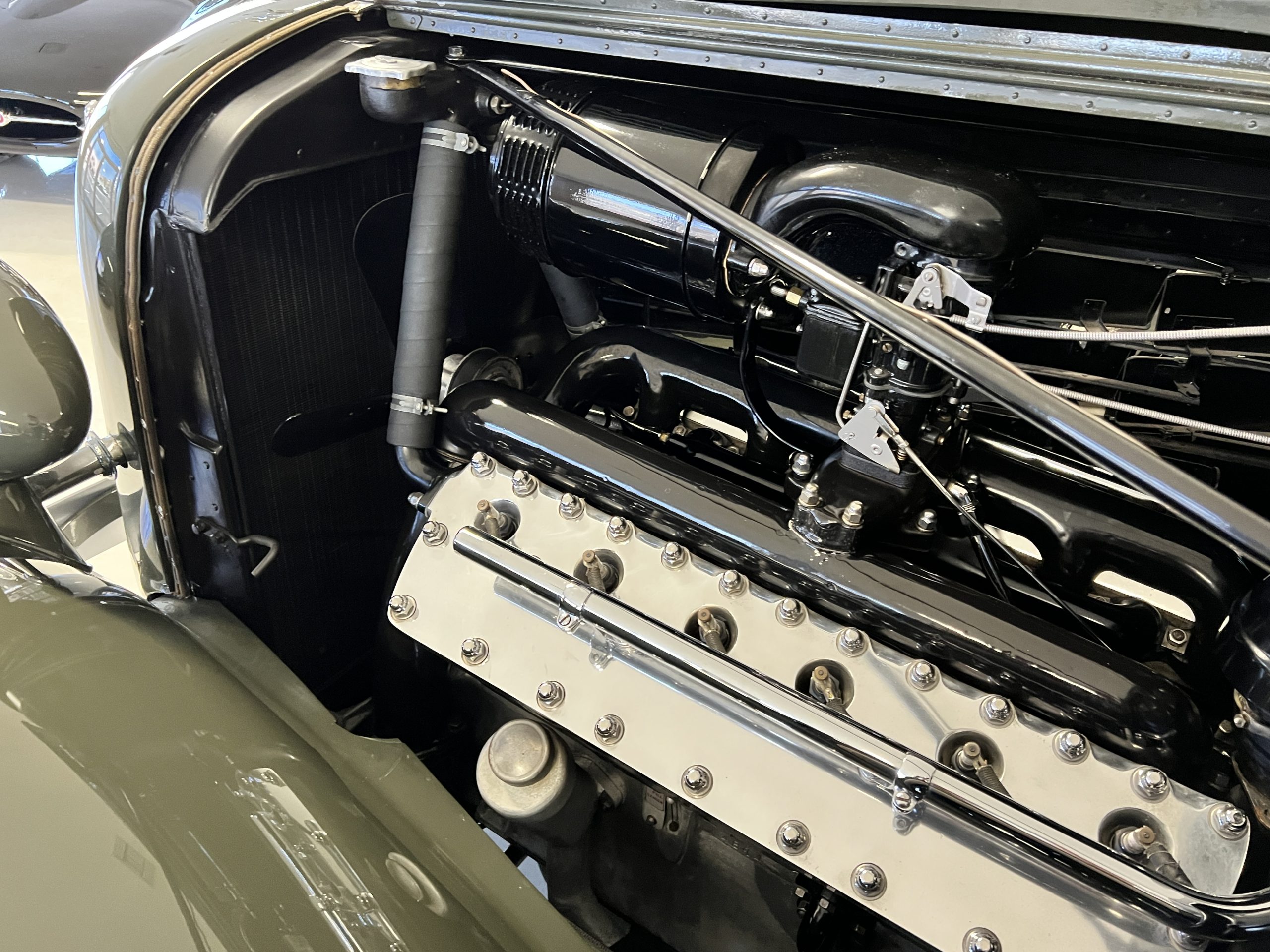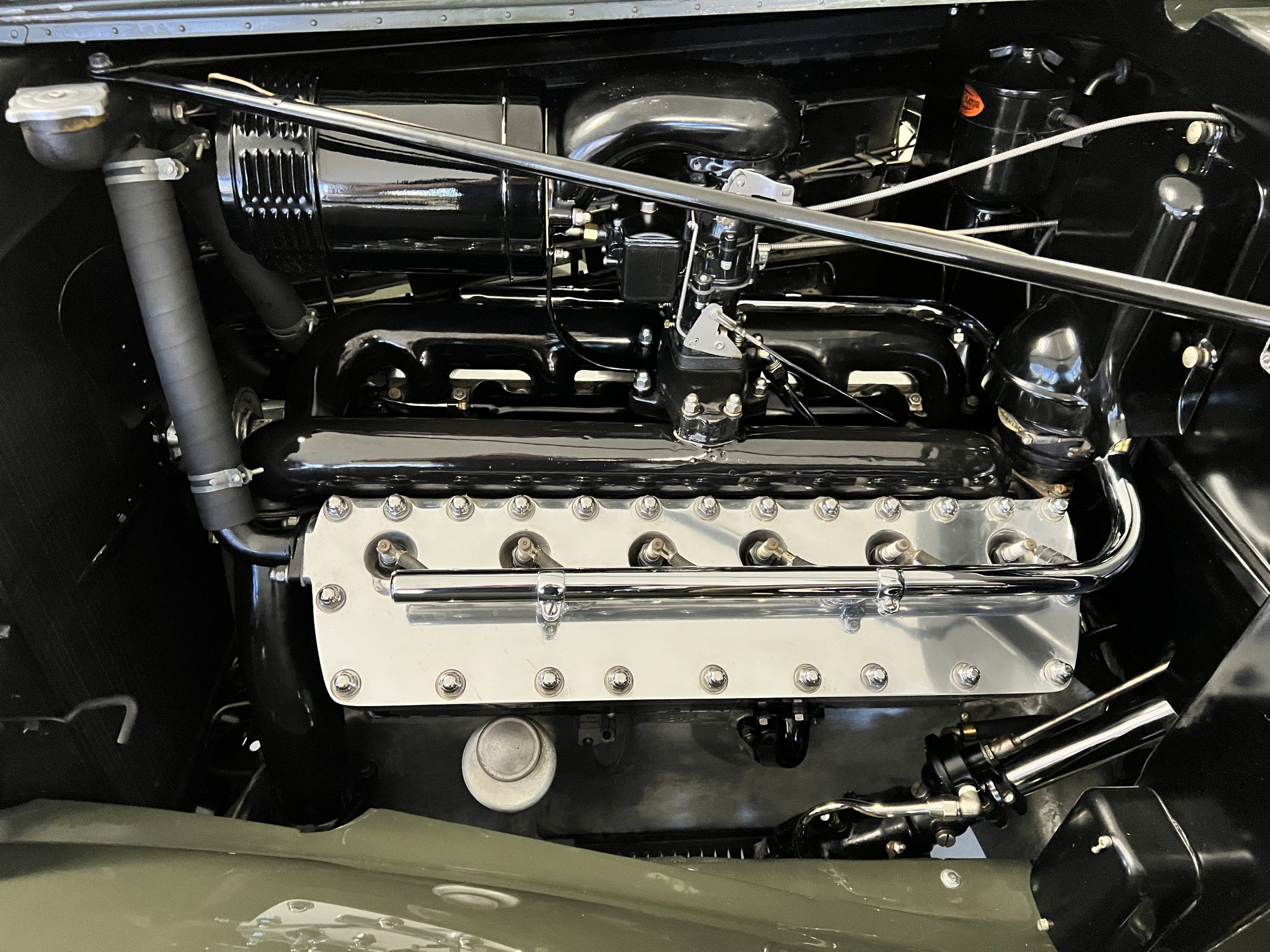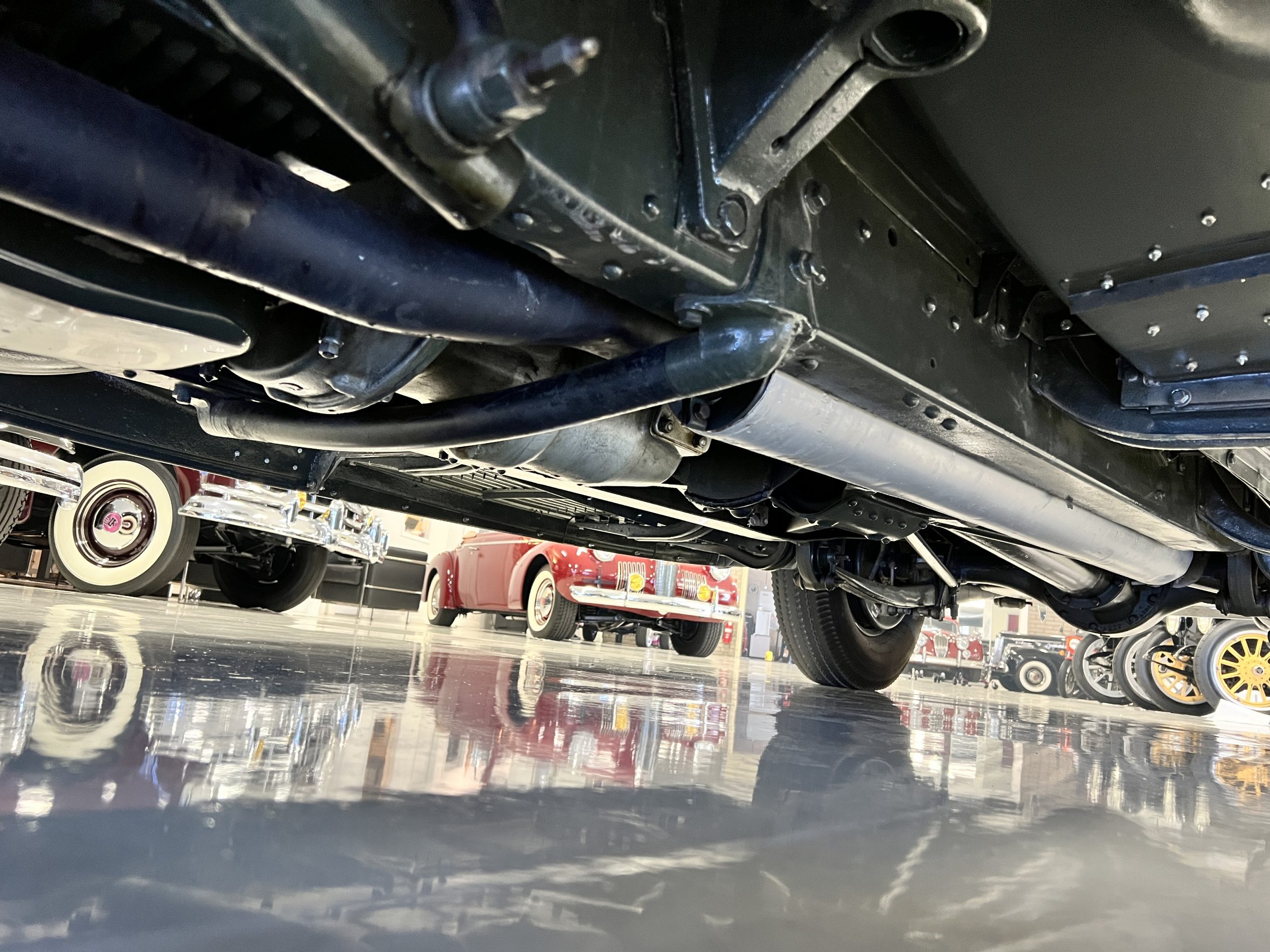 The engine compartment and the venerable 414 CID V12 are all in concours condition today. With 150 bhp, the V12 performs beautifully today, especially on the smaller and lighter shorter wheelbase. The engine was carefully disassembled and carefully inspected. It exhibited almost no wear and was then reassembled and new replacement aluminum heads were installed. It is now running beautifully. The chassis was completely stripped and repainted to concours standards in a matching Slate Green. It is gorgeous!