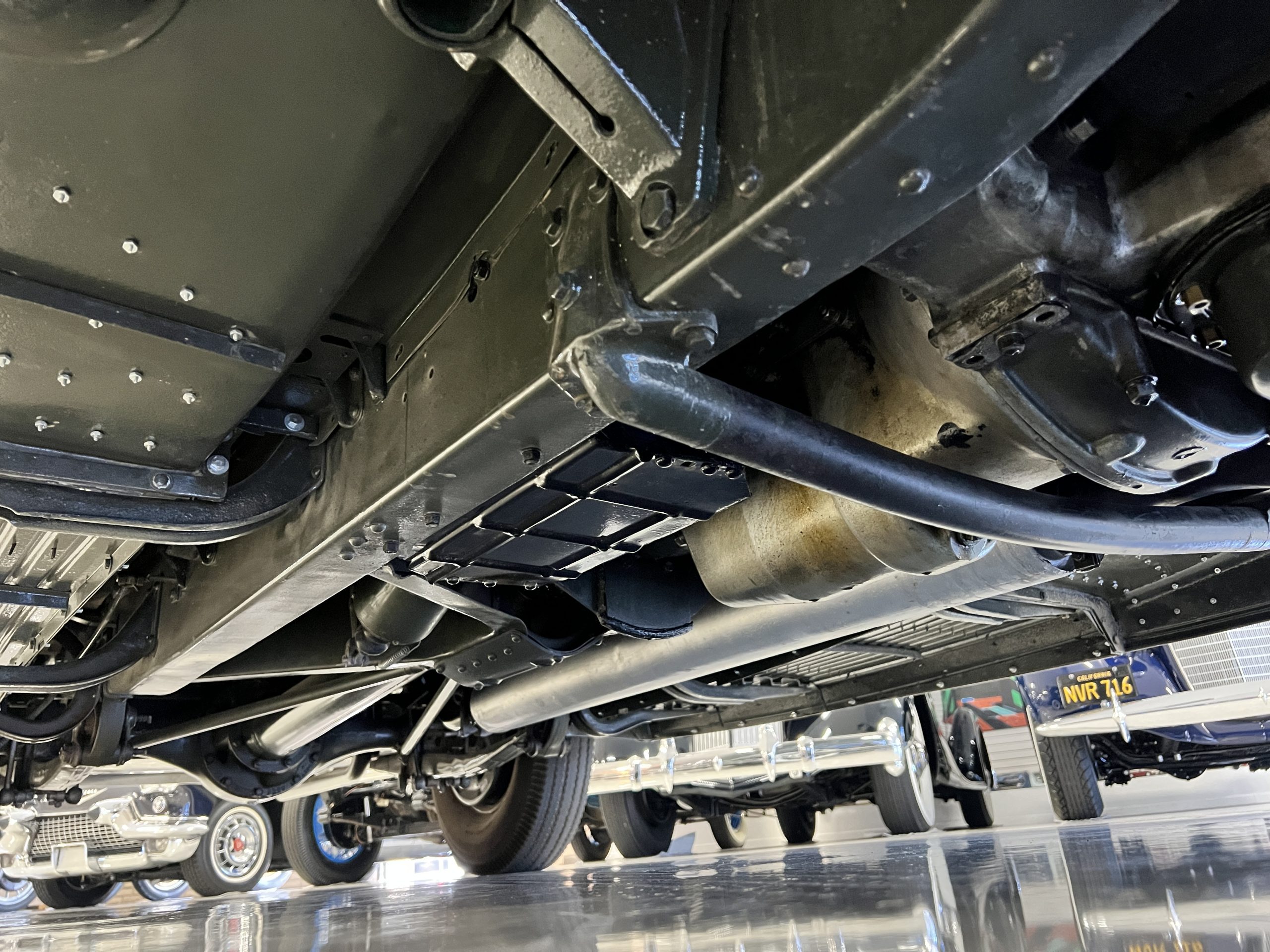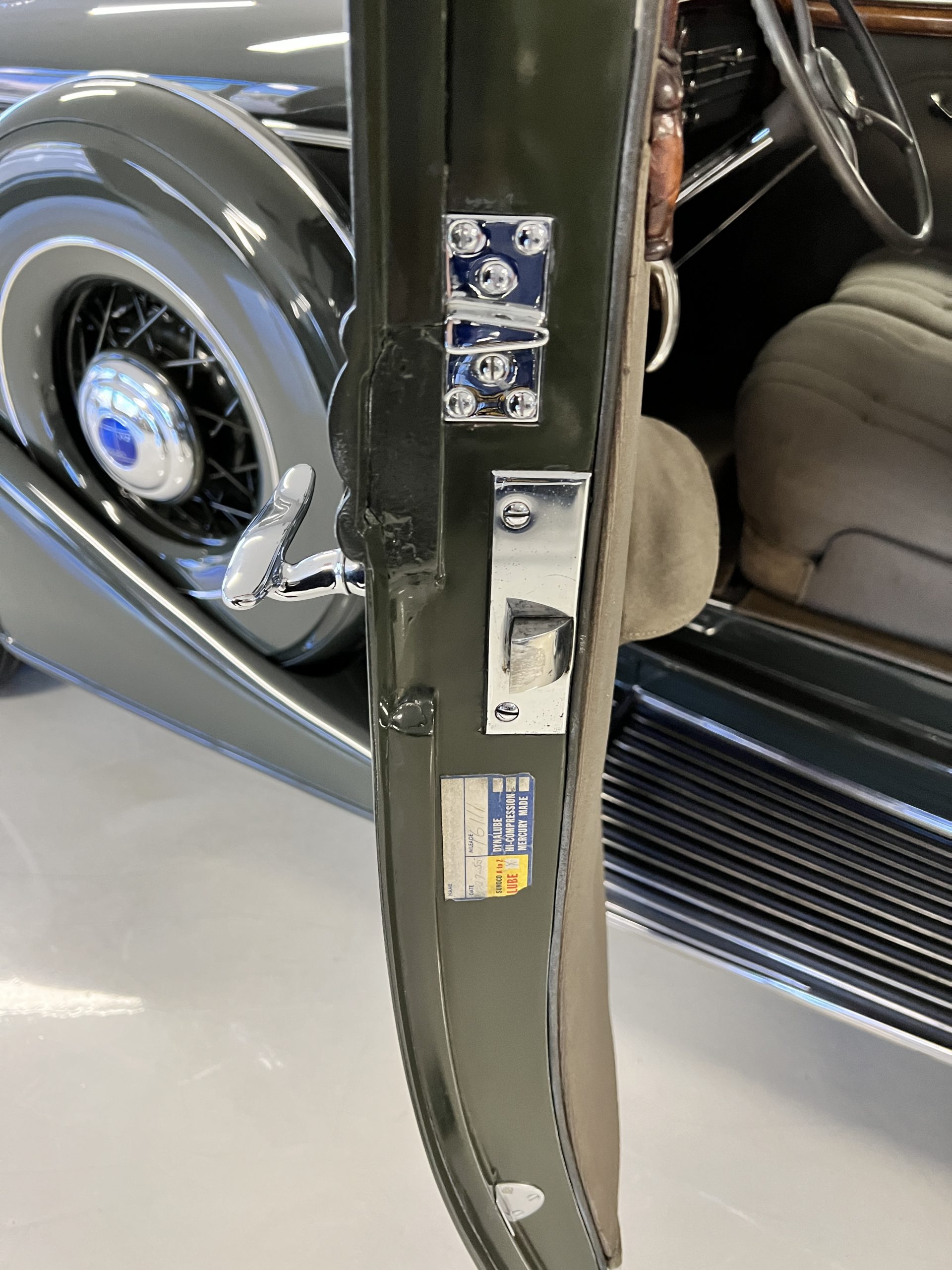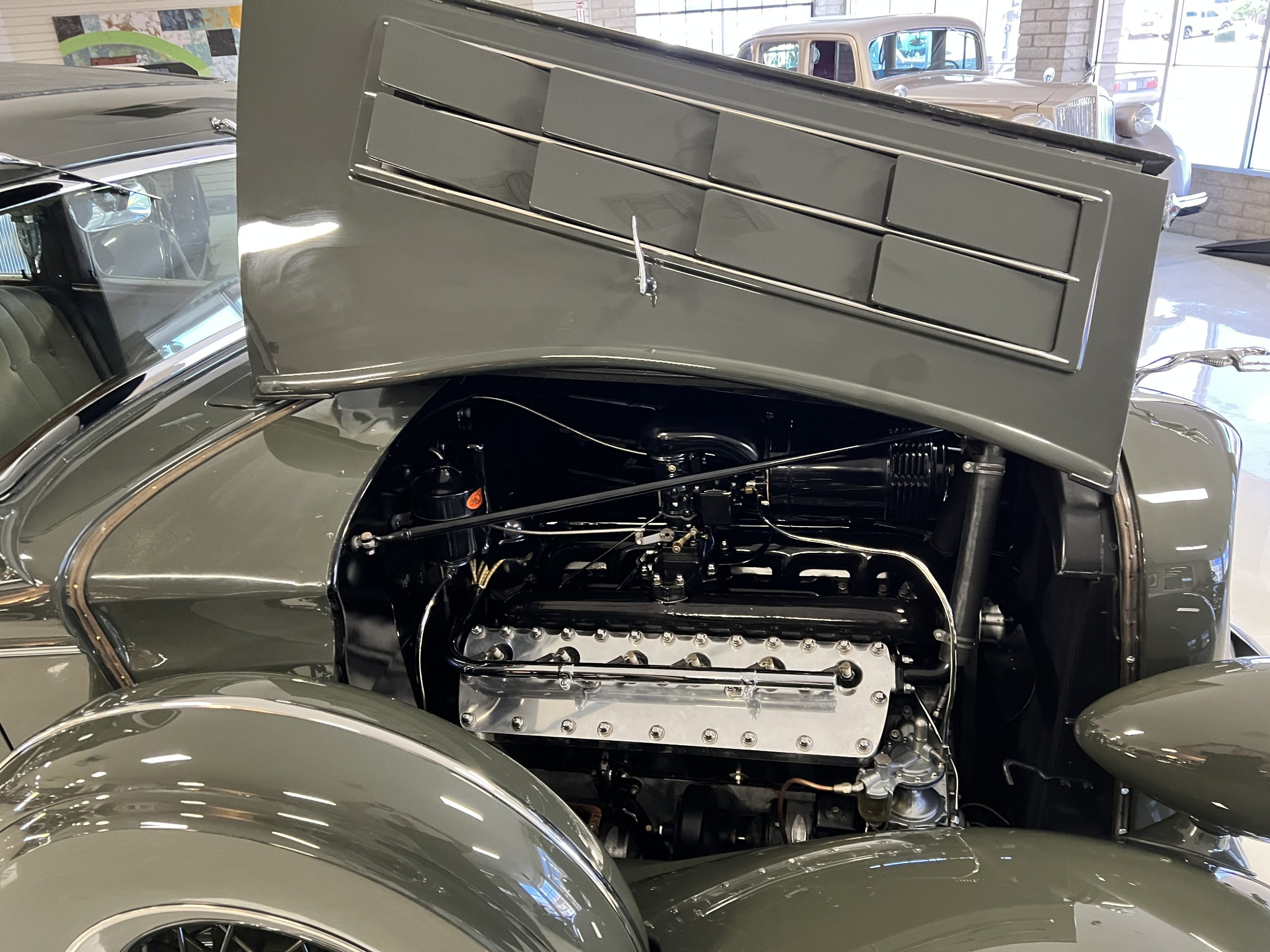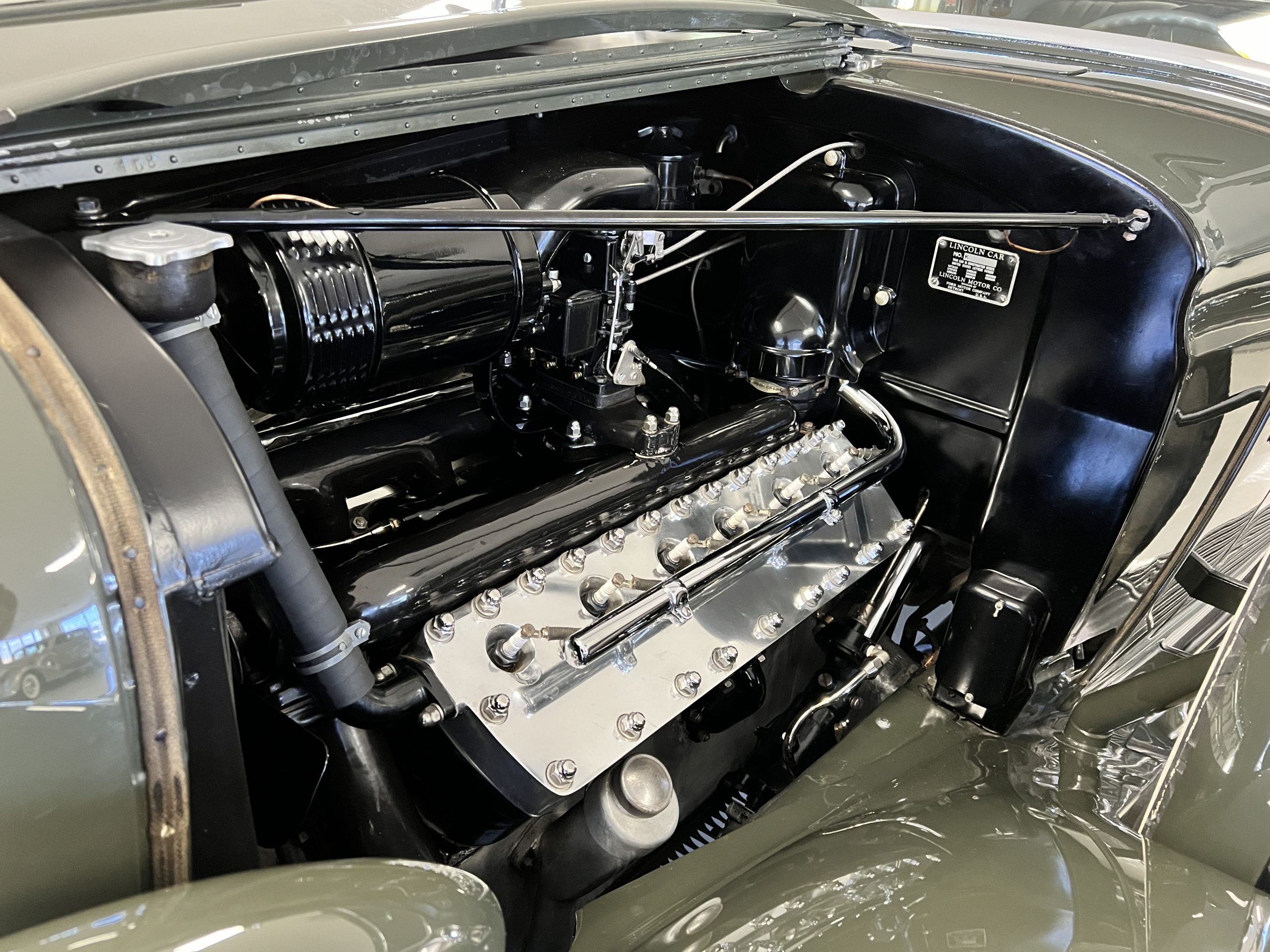 The engine compartment and the venerable 414 CID V12 are all in concours condition today. With 150 bhp, the V12 performs beautifully today, especially on the smaller and lighter shorter wheelbase. The engine was carefully disassembled and carefully inspected. It exhibited almost no wear and was then reassembled and new replacement aluminum heads were installed. It is now running beautifully. The chassis was completely stripped and repainted to concours standards in a matching Slate Green. It is gorgeous!