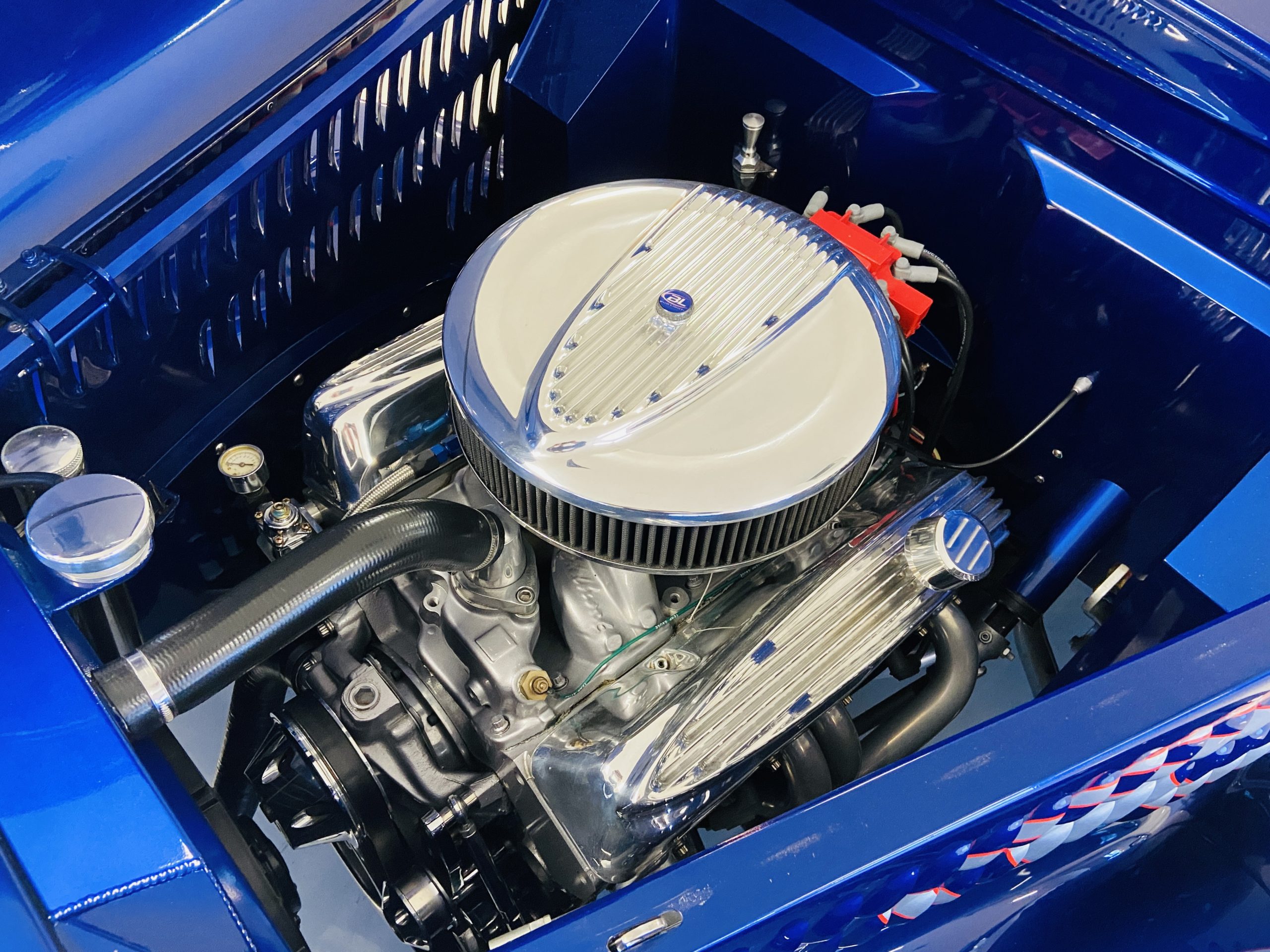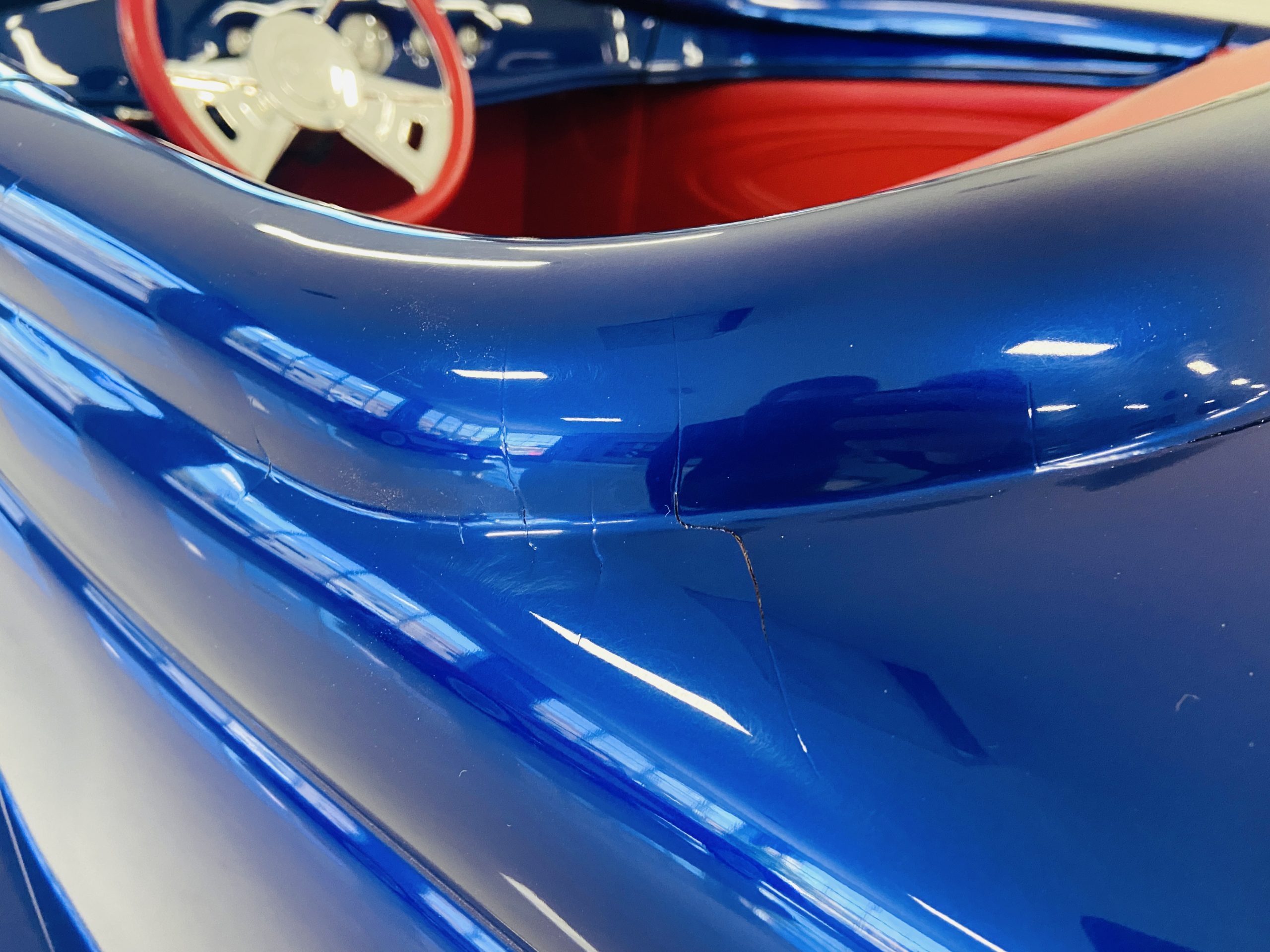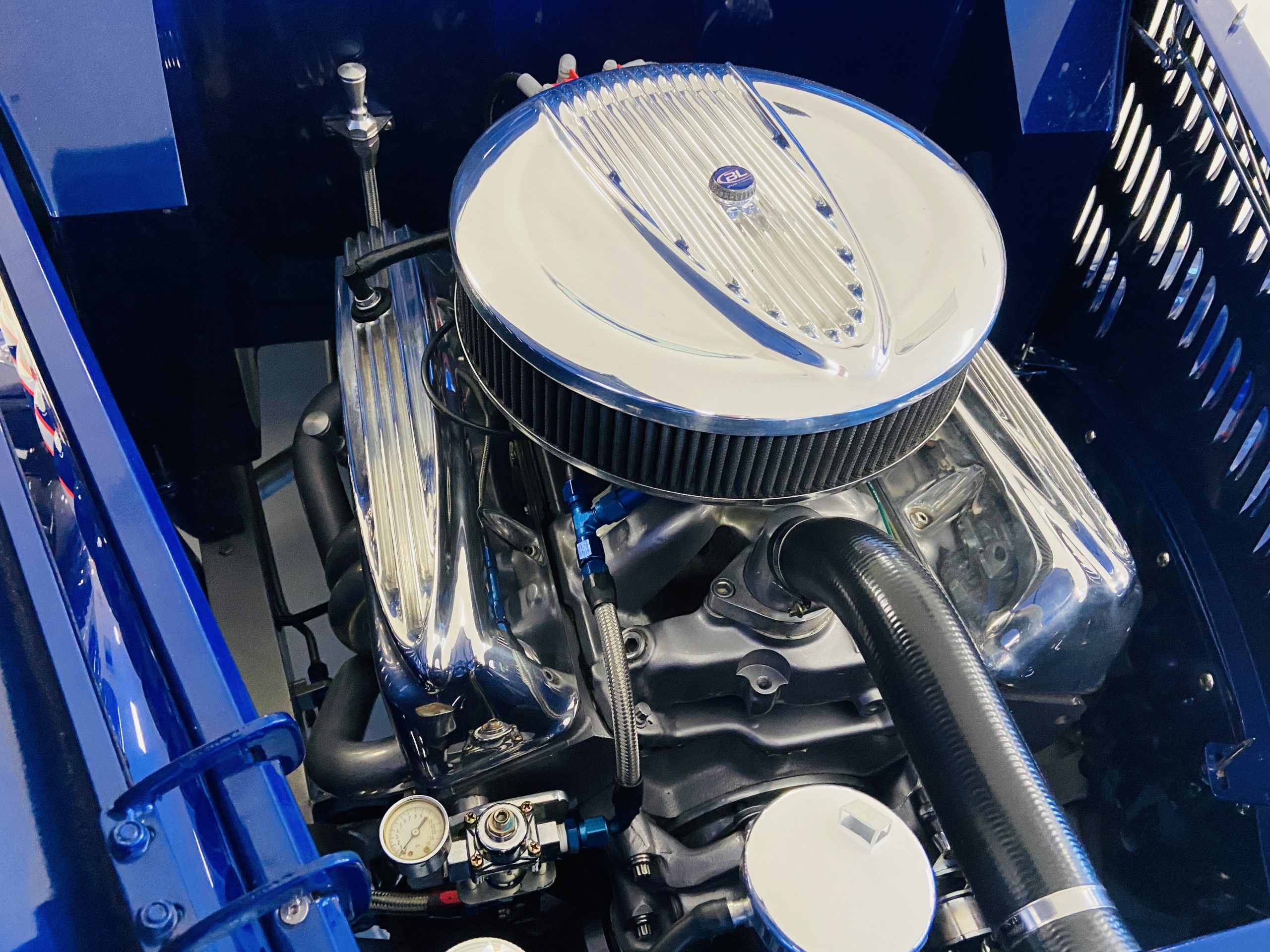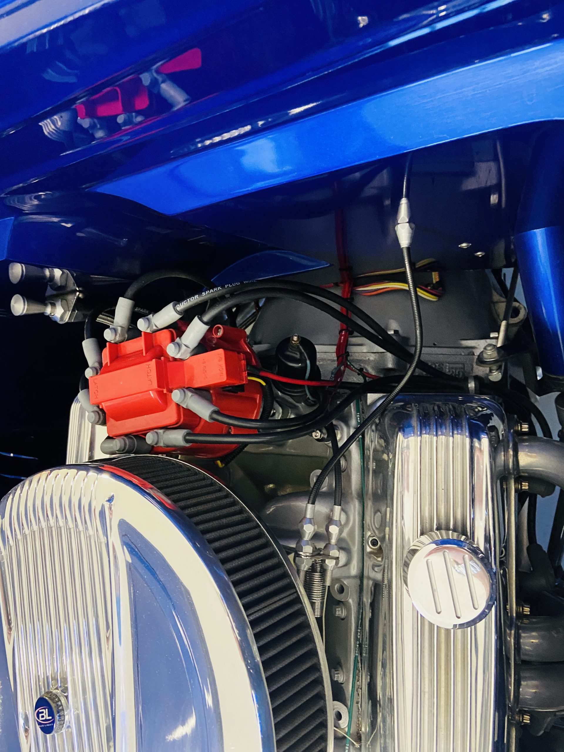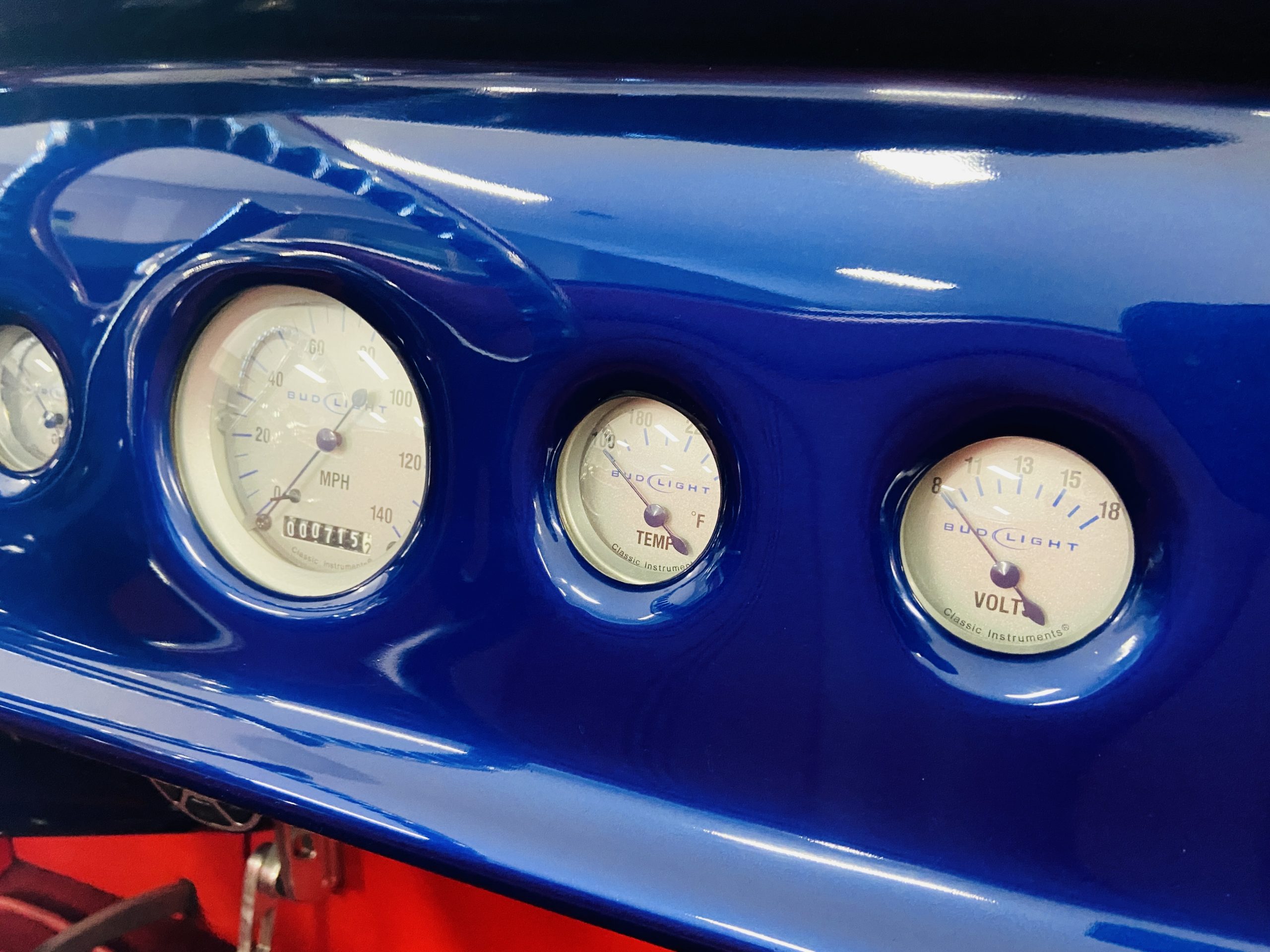 The body of this car is all steel, while the entire undercarriage is polished metal and chrome. The “media-blasted” steel shell was fastened to a chassis jig and its coupe body was transformed with bracing and hand-formed custom sheet metal into a 1936 Ford Roadster. The Candy Blue paint is a custom Dupont color, with six stages and topped with a hand-painted and pinstriped Bud Light graphic swoosh. 16 years later, the paint still, for the most part, shines with lots of depth and luster. As is evident in the photo gallery, there are several areas where cracking has occurred in the paint and body prep.