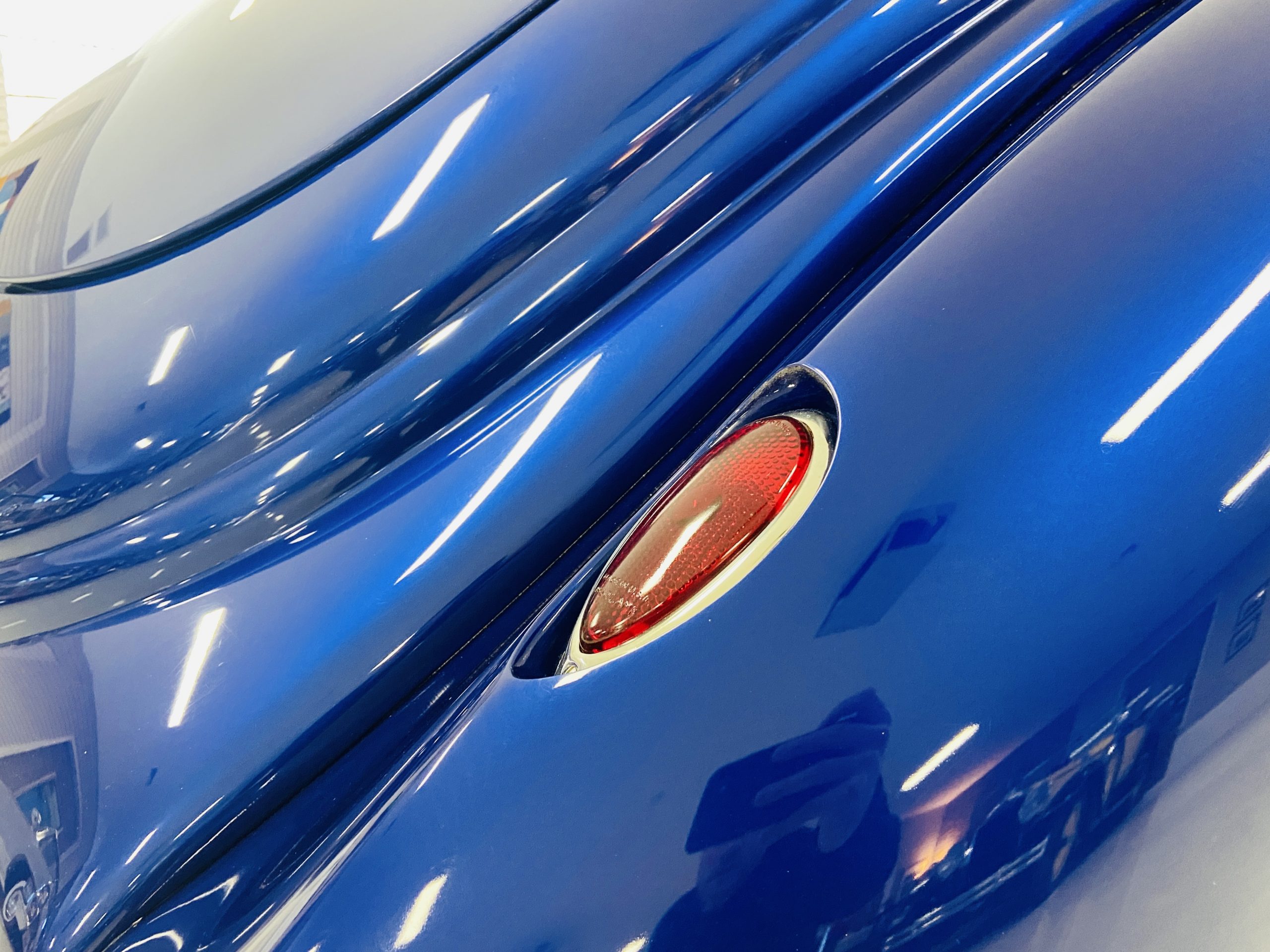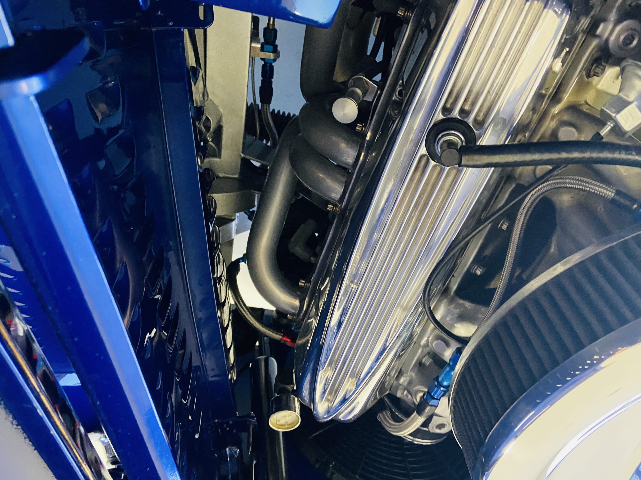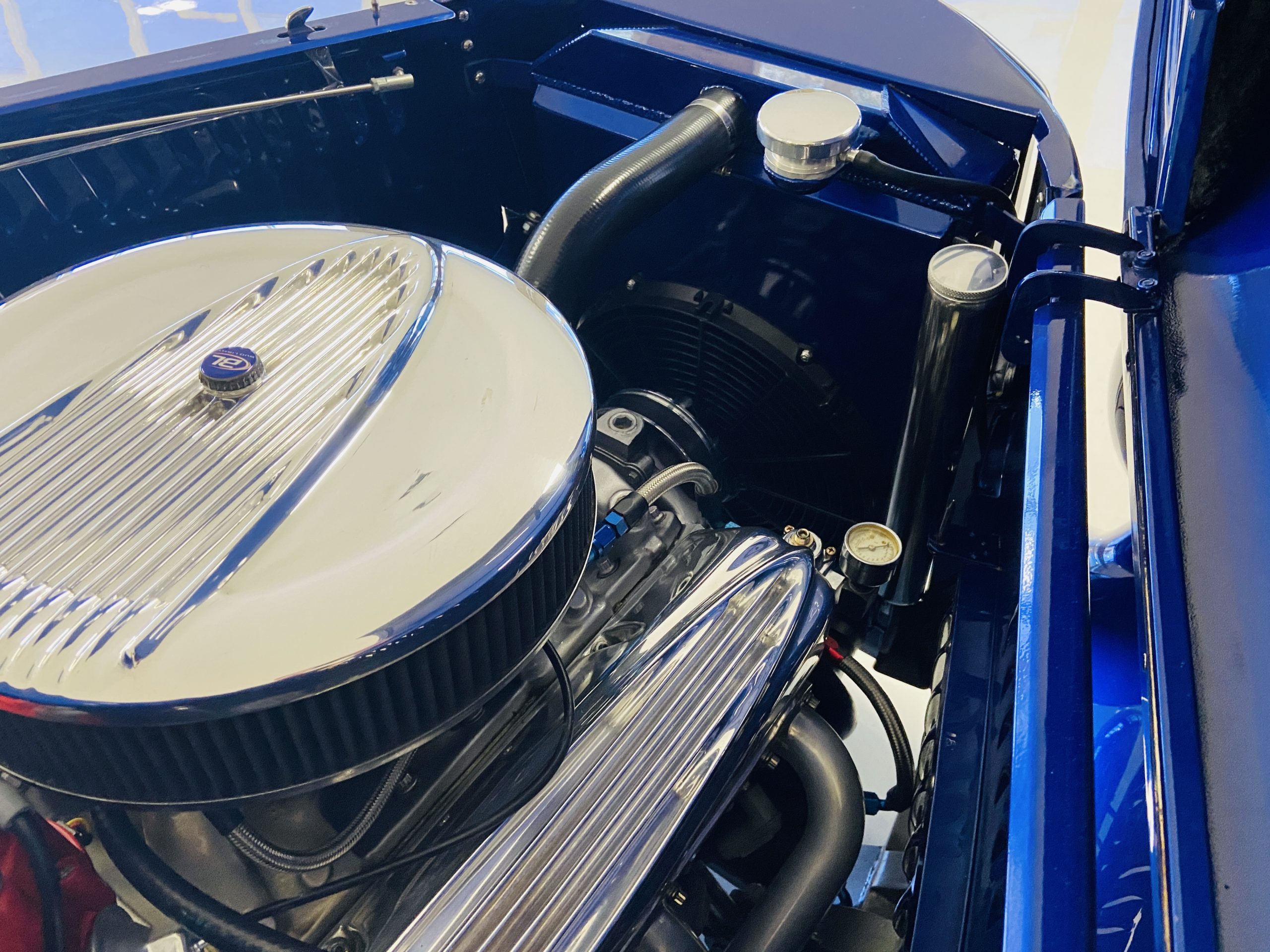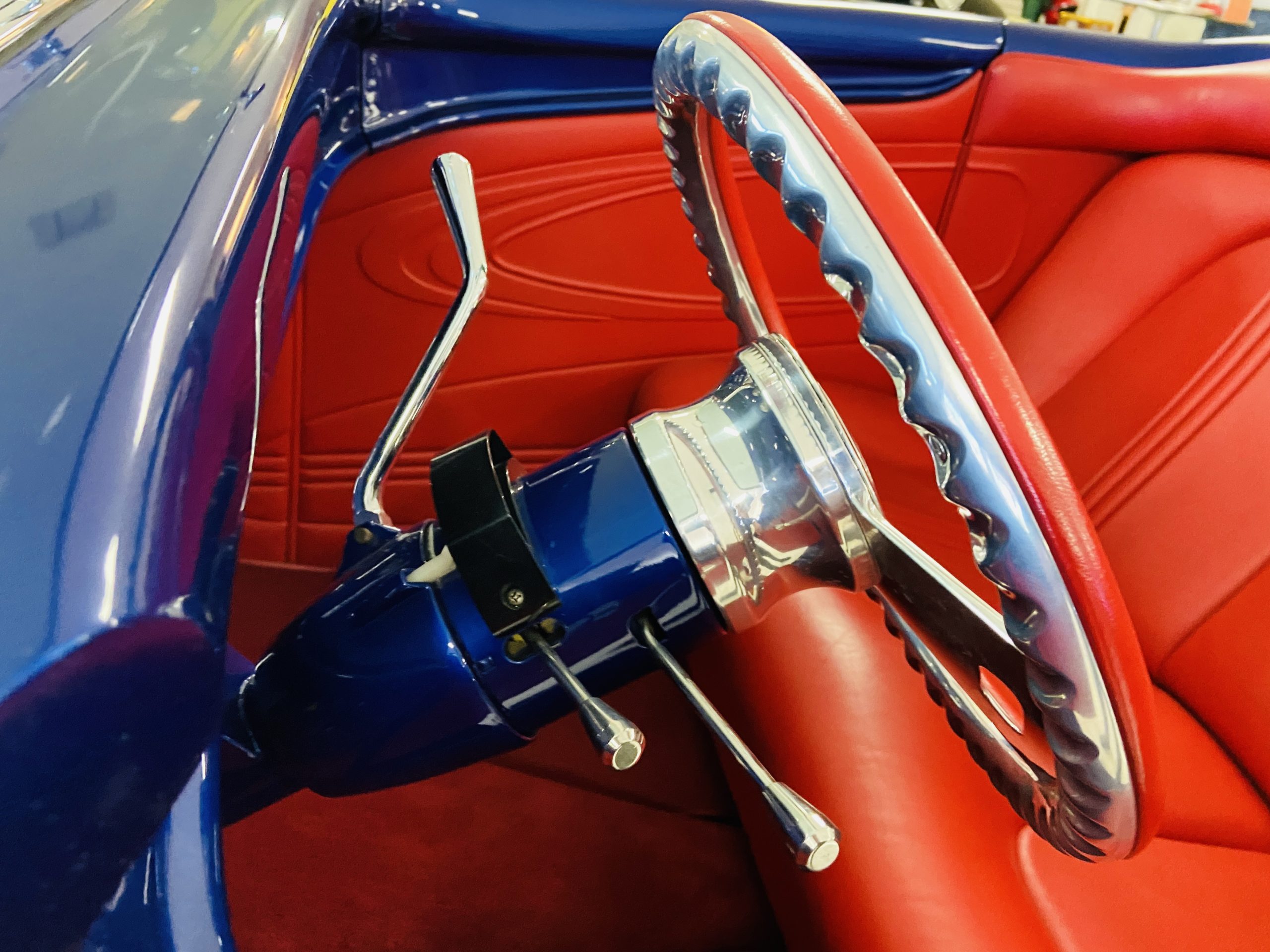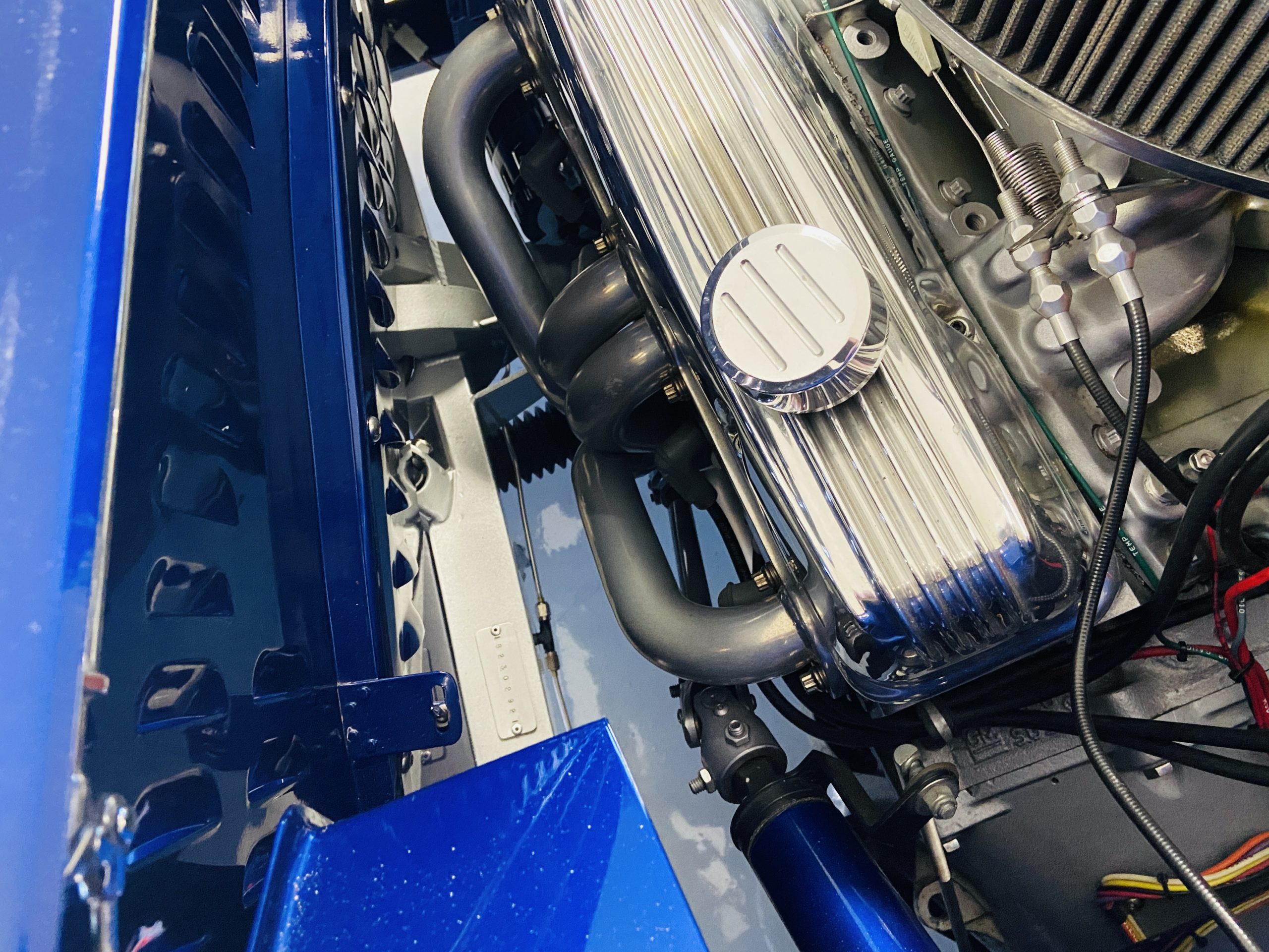 The body of this car is all steel, while the entire undercarriage is polished metal and chrome. The “media-blasted” steel shell was fastened to a chassis jig and its coupe body was transformed with bracing and hand-formed custom sheet metal into a 1936 Ford Roadster. The Candy Blue paint is a custom Dupont color, with six stages and topped with a hand-painted and pinstriped Bud Light graphic swoosh. 16 years later, the paint still, for the most part, shines with lots of depth and luster. As is evident in the photo gallery, there are several areas where cracking has occurred in the paint and body prep.