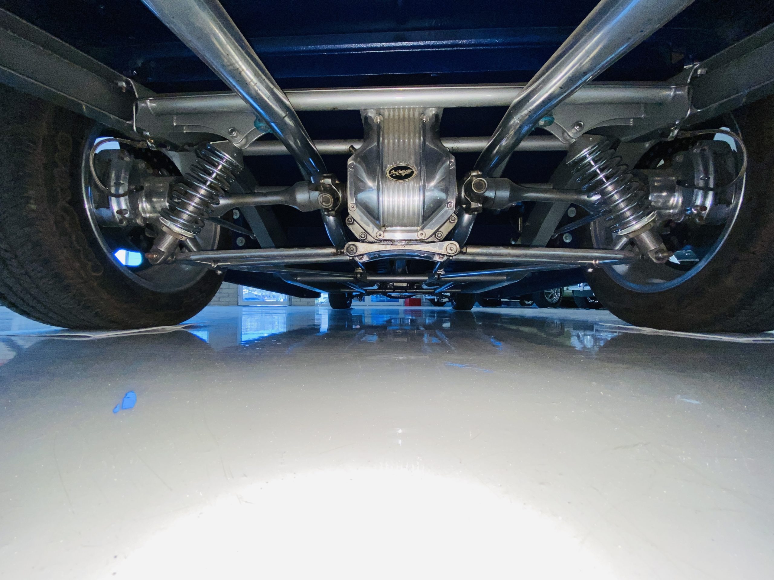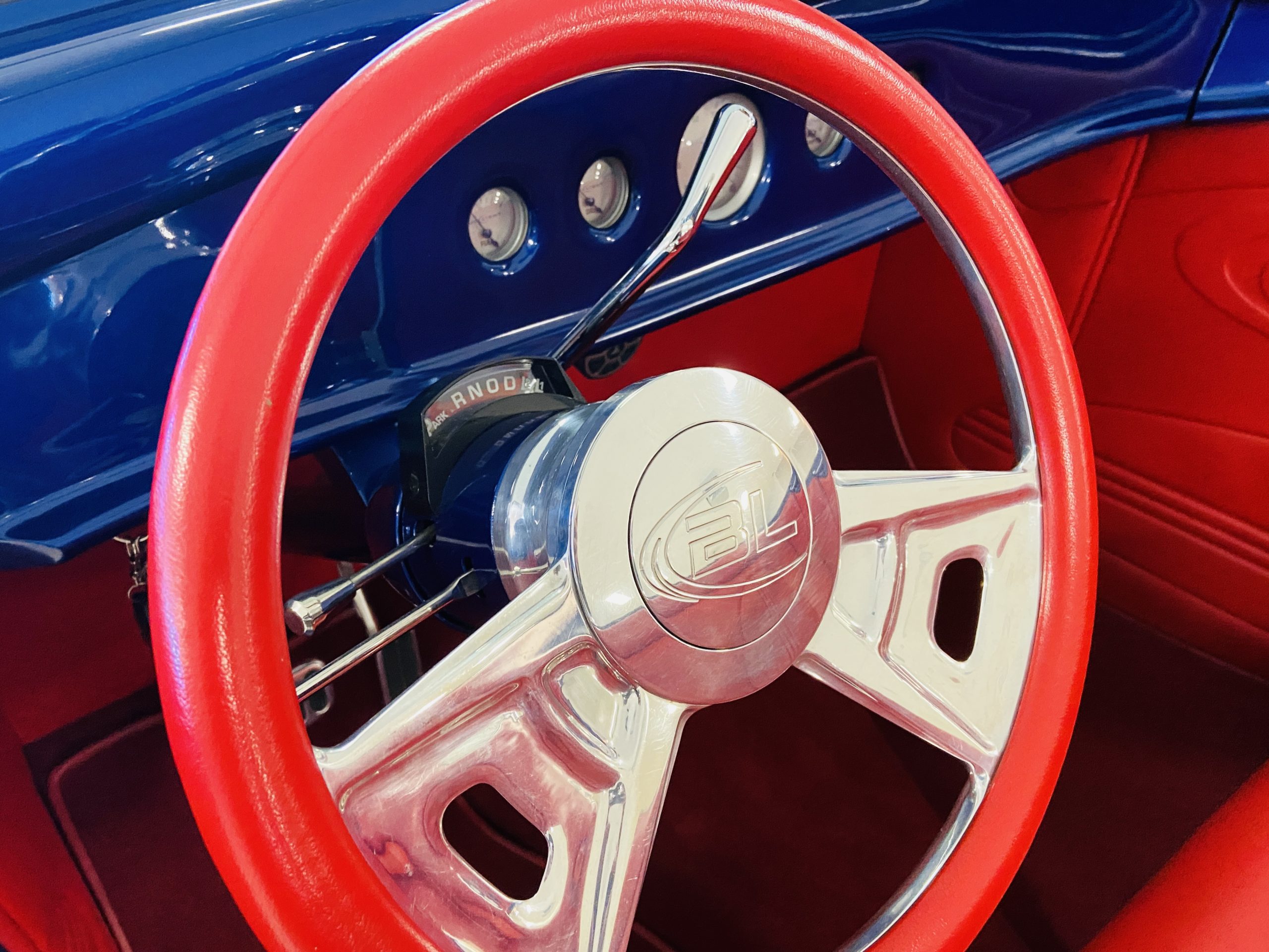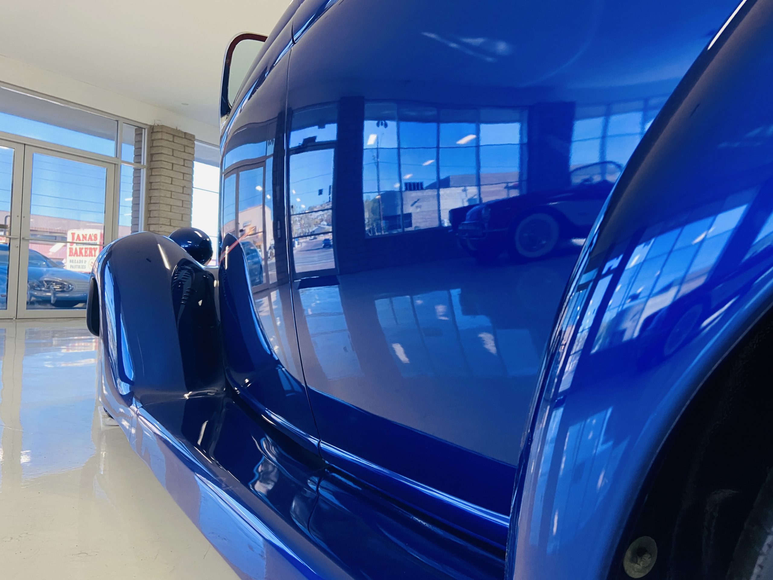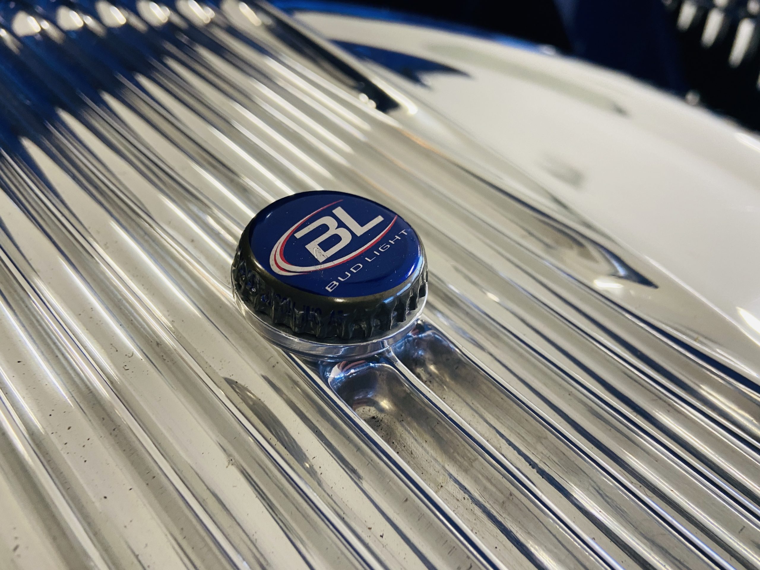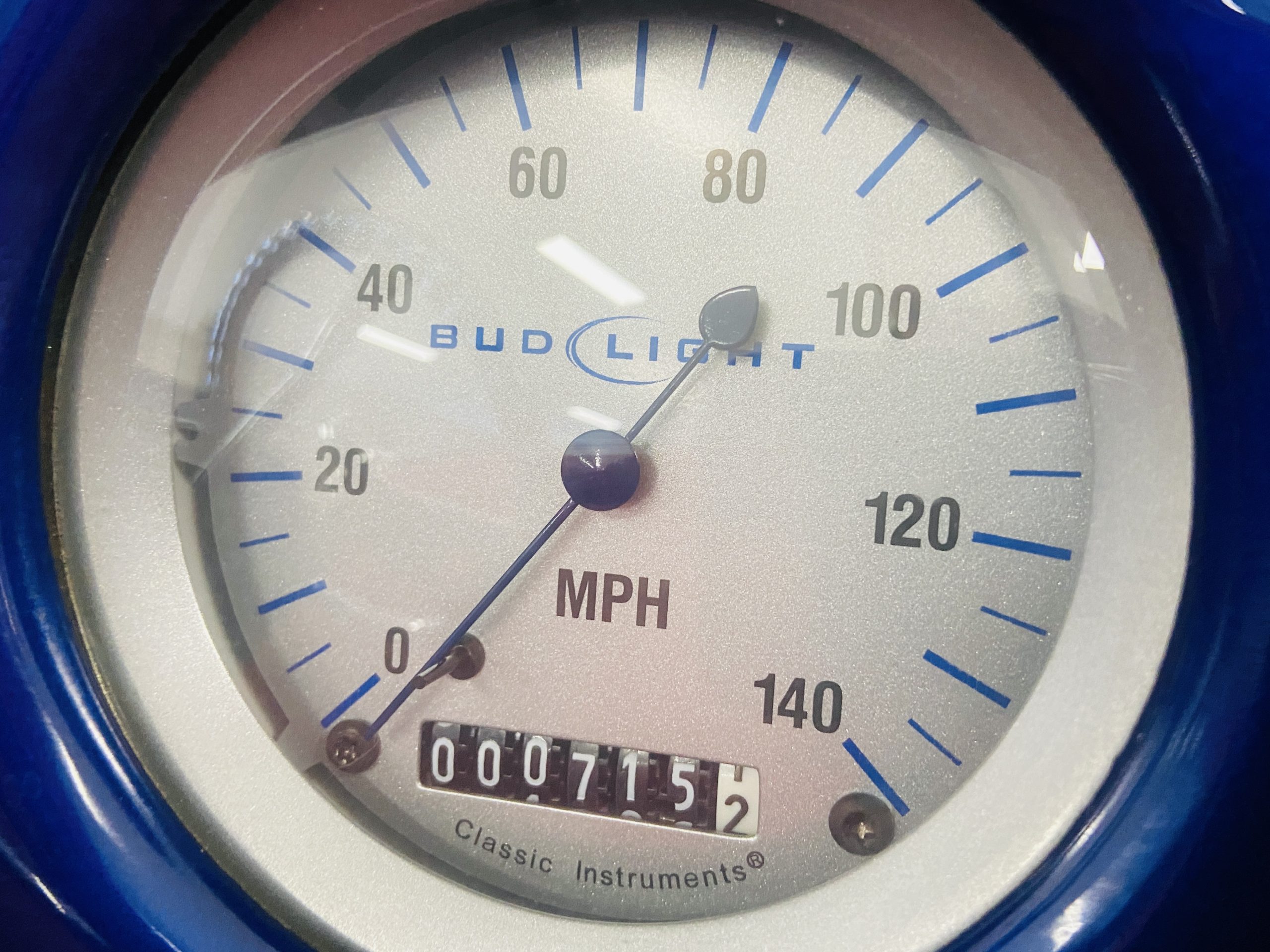 The body of this car is all steel, while the entire undercarriage is polished metal and chrome. The “media-blasted” steel shell was fastened to a chassis jig and its coupe body was transformed with bracing and hand-formed custom sheet metal into a 1936 Ford Roadster. The Candy Blue paint is a custom Dupont color, with six stages and topped with a hand-painted and pinstriped Bud Light graphic swoosh. 16 years later, the paint still, for the most part, shines with lots of depth and luster. As is evident in the photo gallery, there are several areas where cracking has occurred in the paint and body prep.
