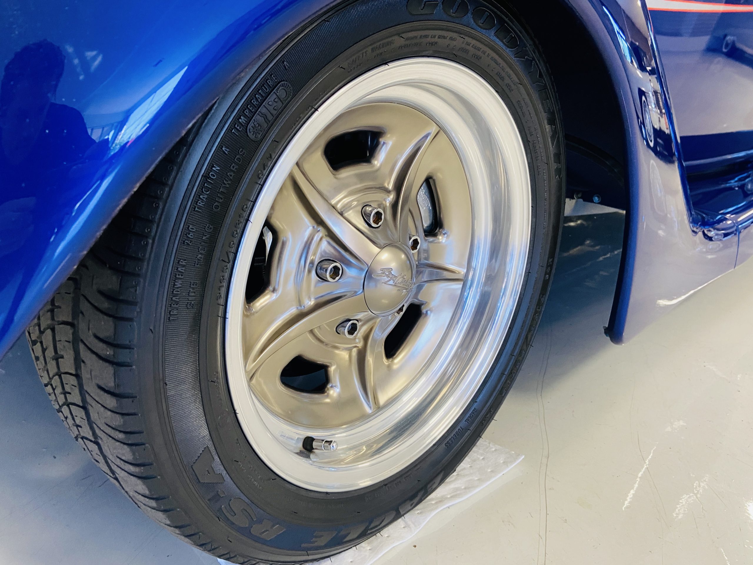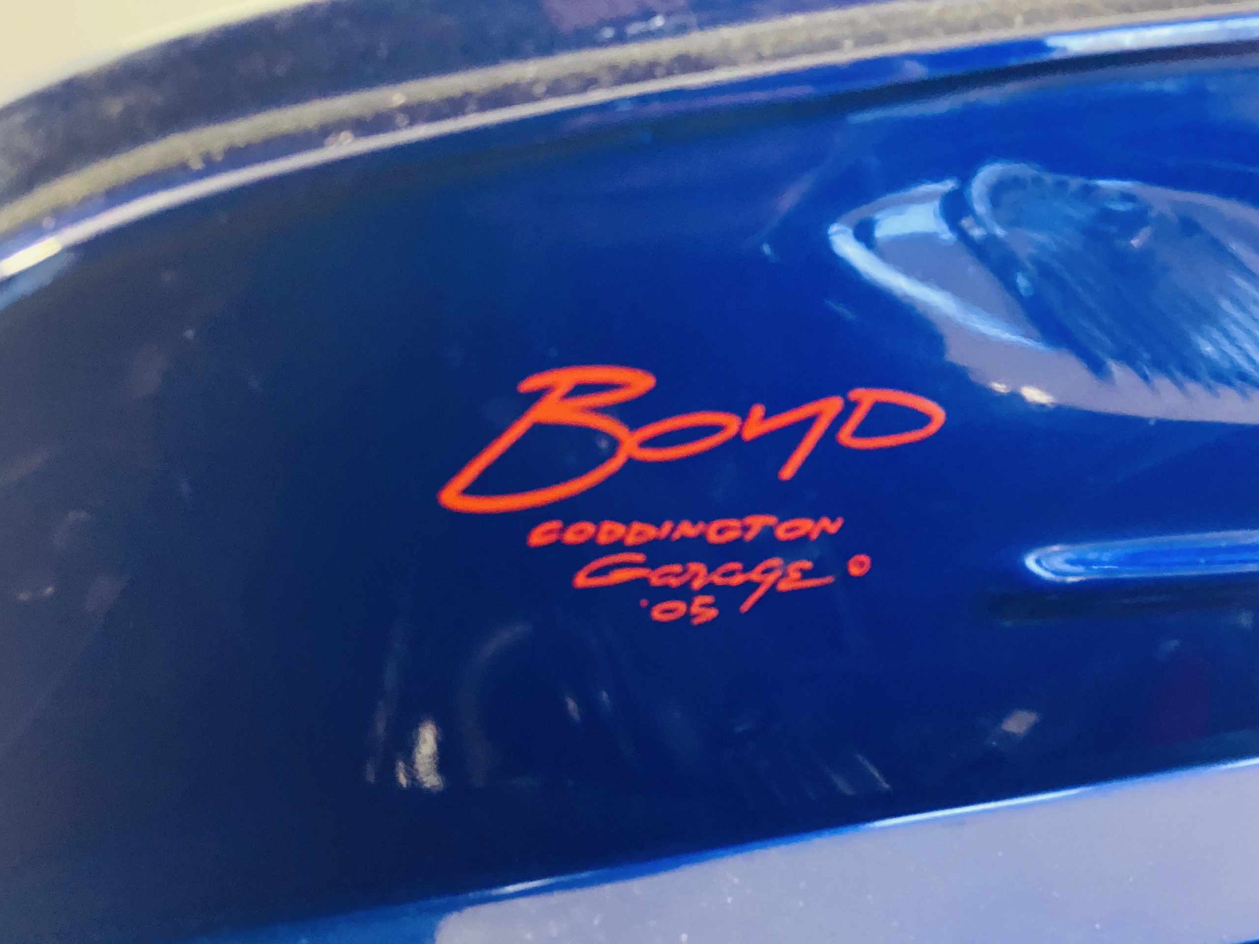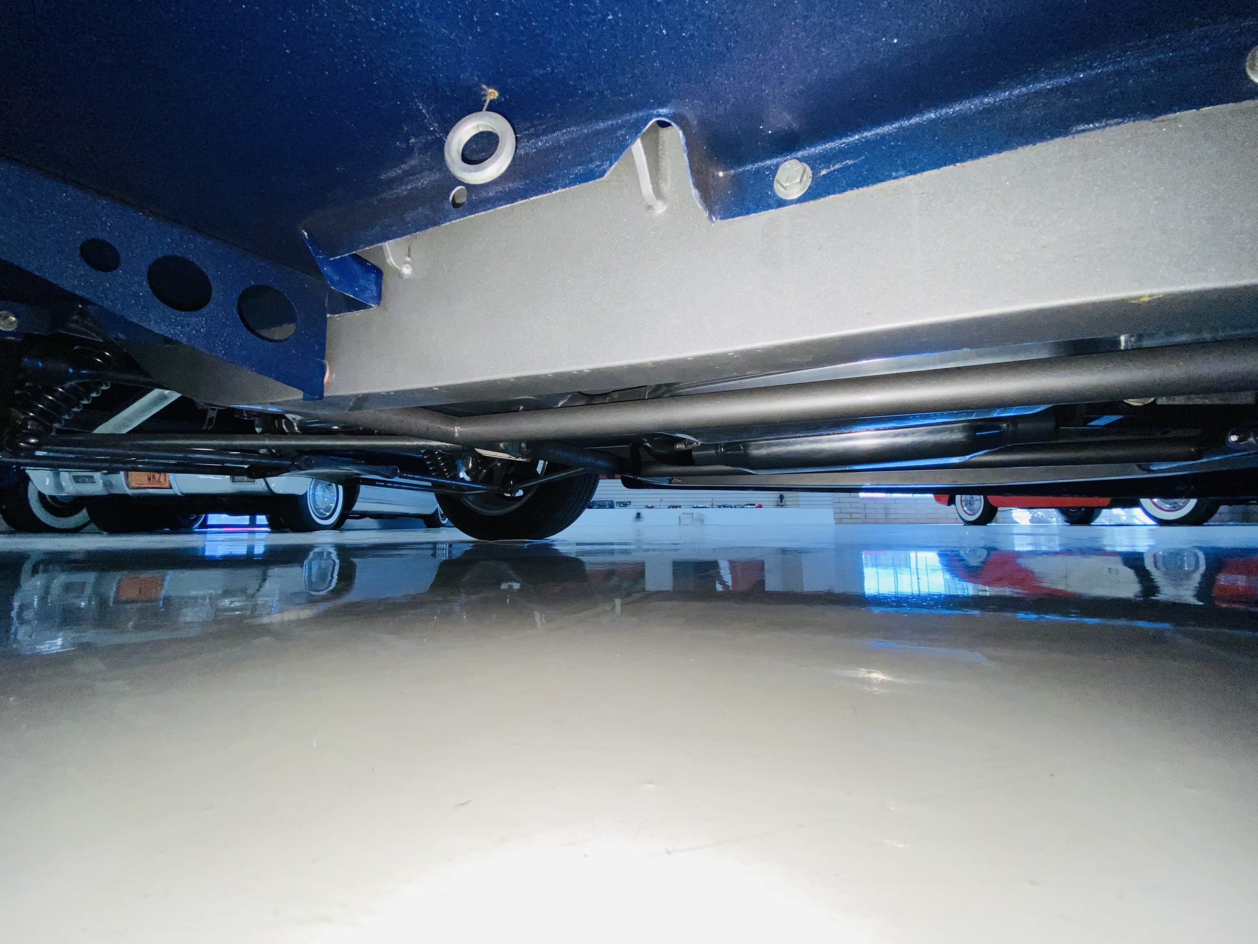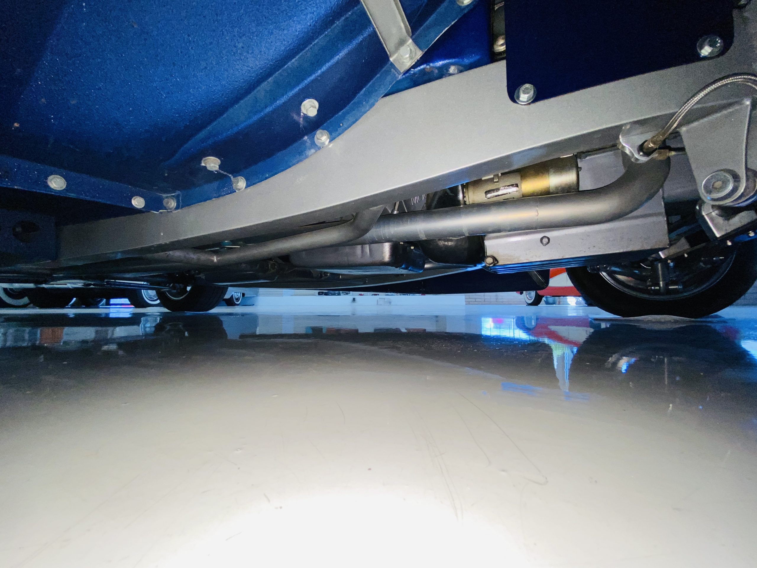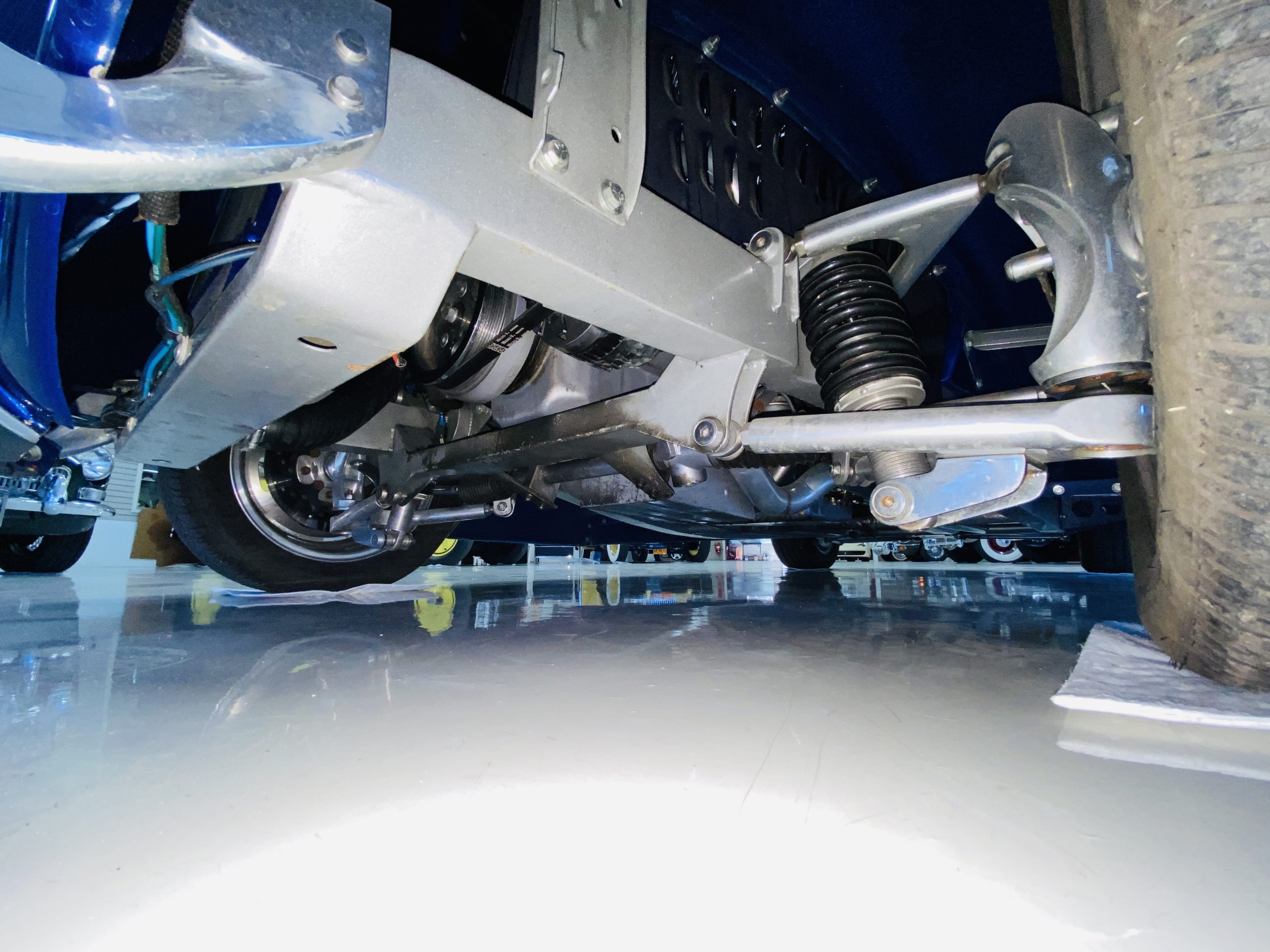 The body of this car is all steel, while the entire undercarriage is polished metal and chrome. The “media-blasted” steel shell was fastened to a chassis jig and its coupe body was transformed with bracing and hand-formed custom sheet metal into a 1936 Ford Roadster. The Candy Blue paint is a custom Dupont color, with six stages and topped with a hand-painted and pinstriped Bud Light graphic swoosh. 16 years later, the paint still, for the most part, shines with lots of depth and luster. As is evident in the photo gallery, there are several areas where cracking has occurred in the paint and body prep.