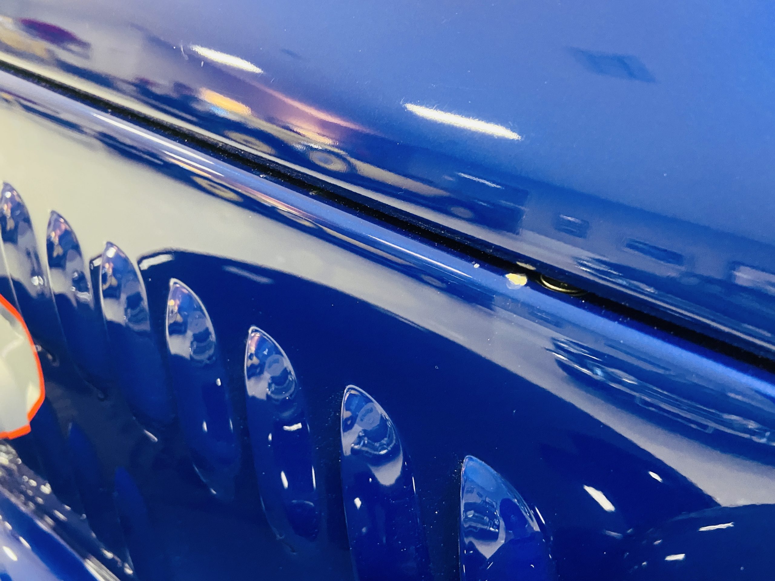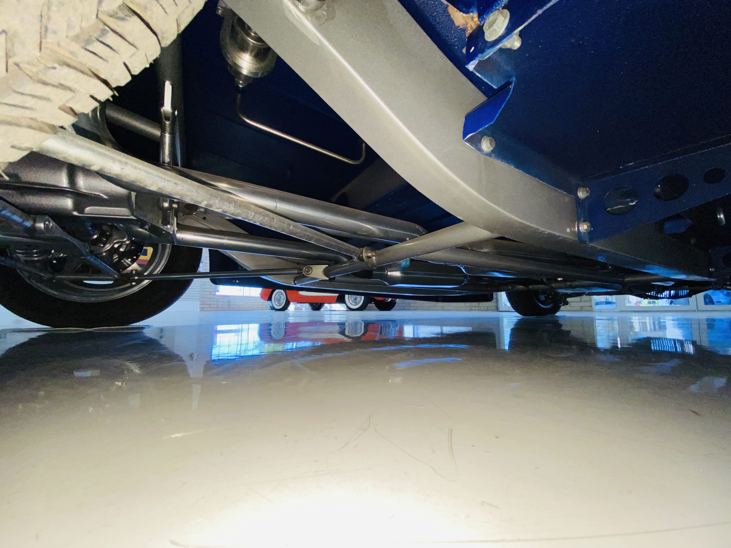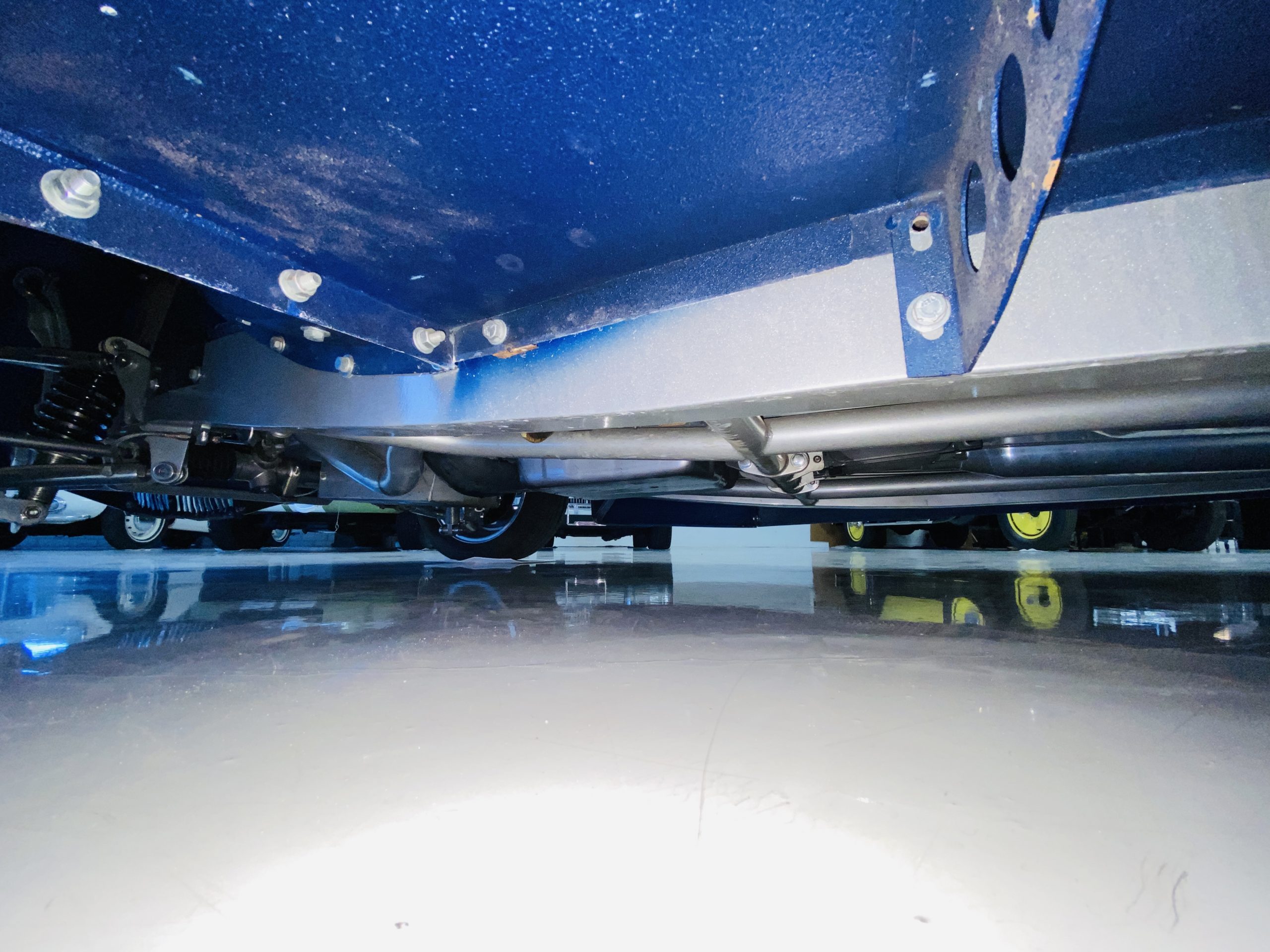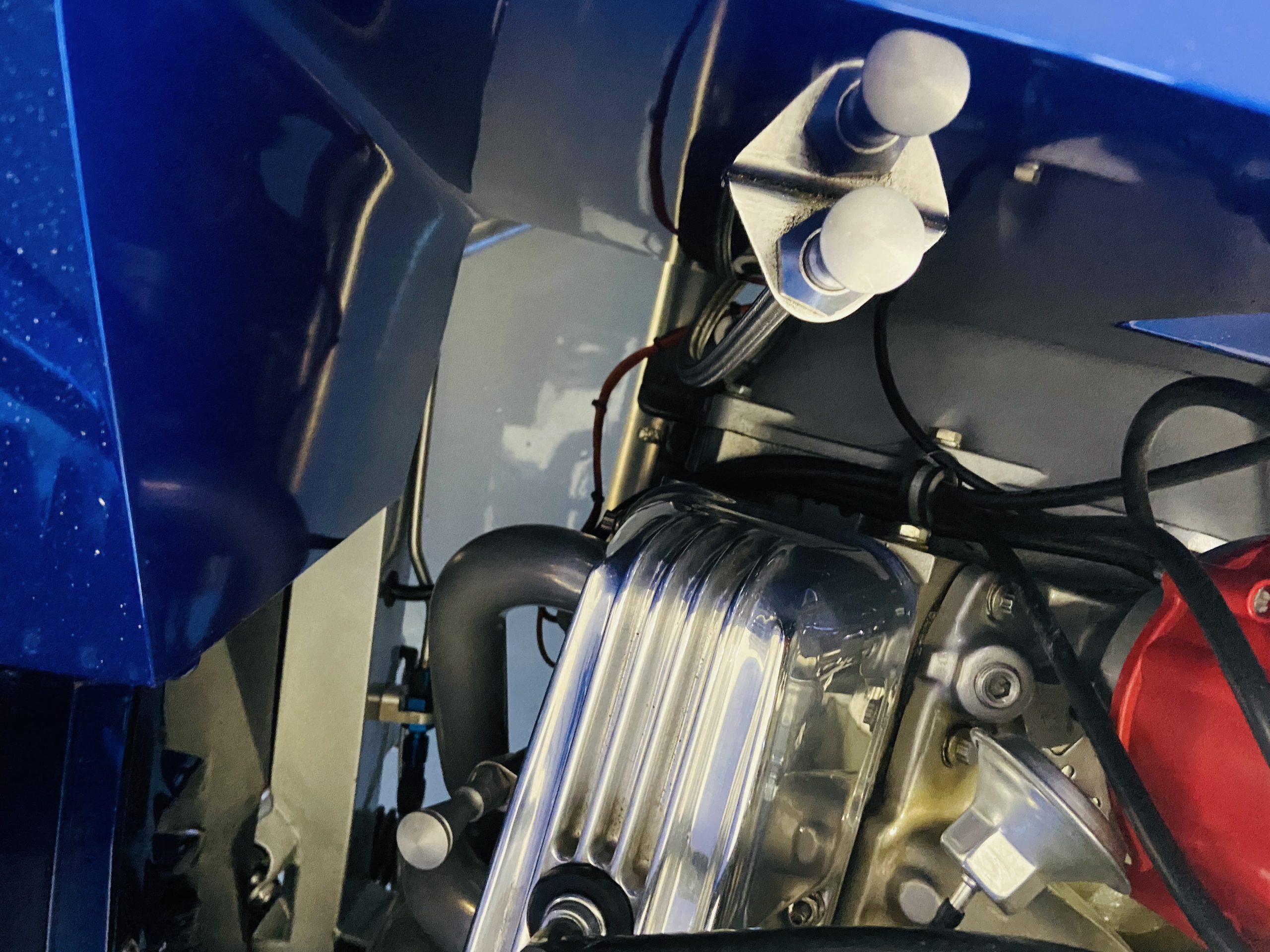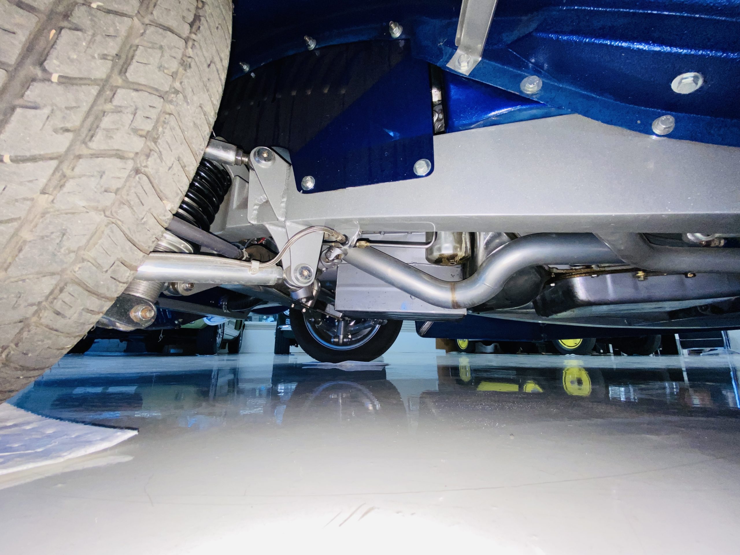 The body of this car is all steel, while the entire undercarriage is polished metal and chrome. The “media-blasted” steel shell was fastened to a chassis jig and its coupe body was transformed with bracing and hand-formed custom sheet metal into a 1936 Ford Roadster. The Candy Blue paint is a custom Dupont color, with six stages and topped with a hand-painted and pinstriped Bud Light graphic swoosh. 16 years later, the paint still, for the most part, shines with lots of depth and luster. As is evident in the photo gallery, there are several areas where cracking has occurred in the paint and body prep.