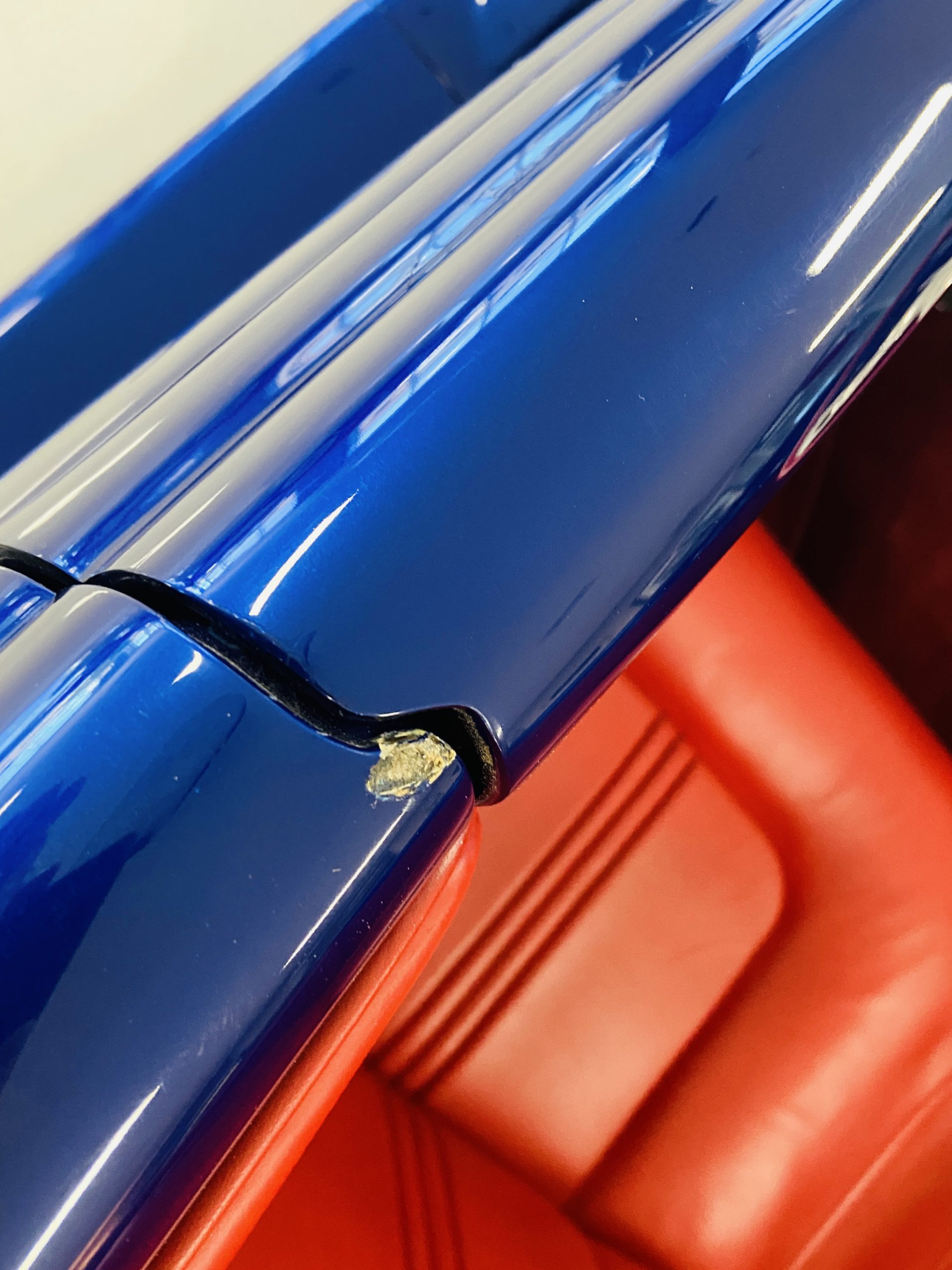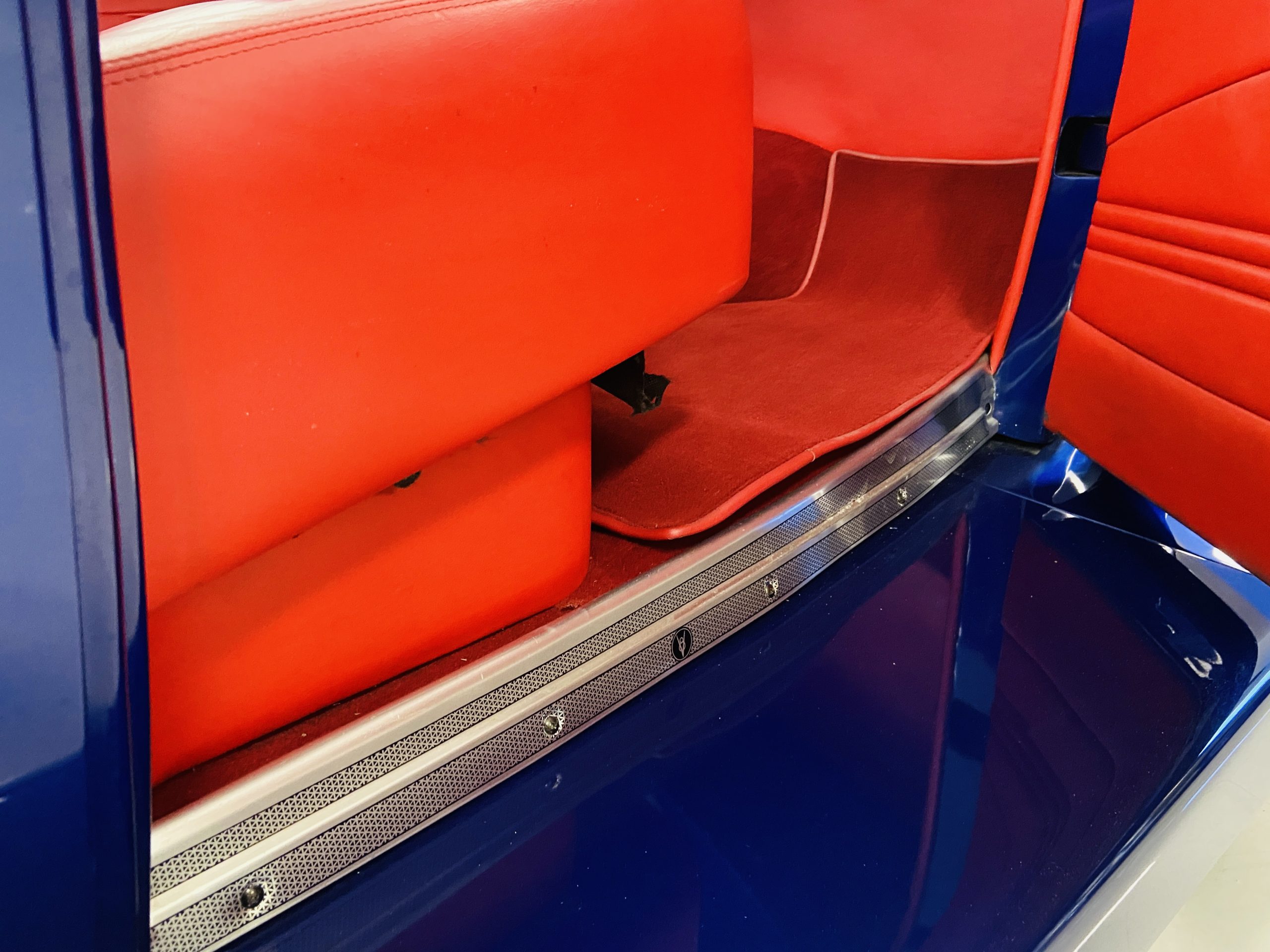 Moving to the interior, the ultra minimal dash, bright red leather, and “Bud Light” branded white gauges complete the look. In fact, this interior is completely custom designed and built by Gabe Lopez. With such a minimal design, there is not much to report other than a very, very small scratch in the cushion of the driver’s seat. For those who were curious, the doors are opened and closed by an electronic button placed on the underside of the dashboard (note the little orange buttons in the photos).