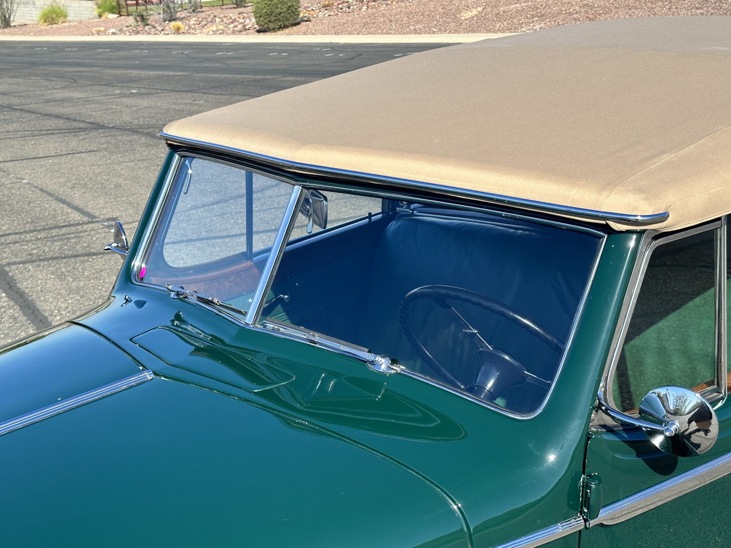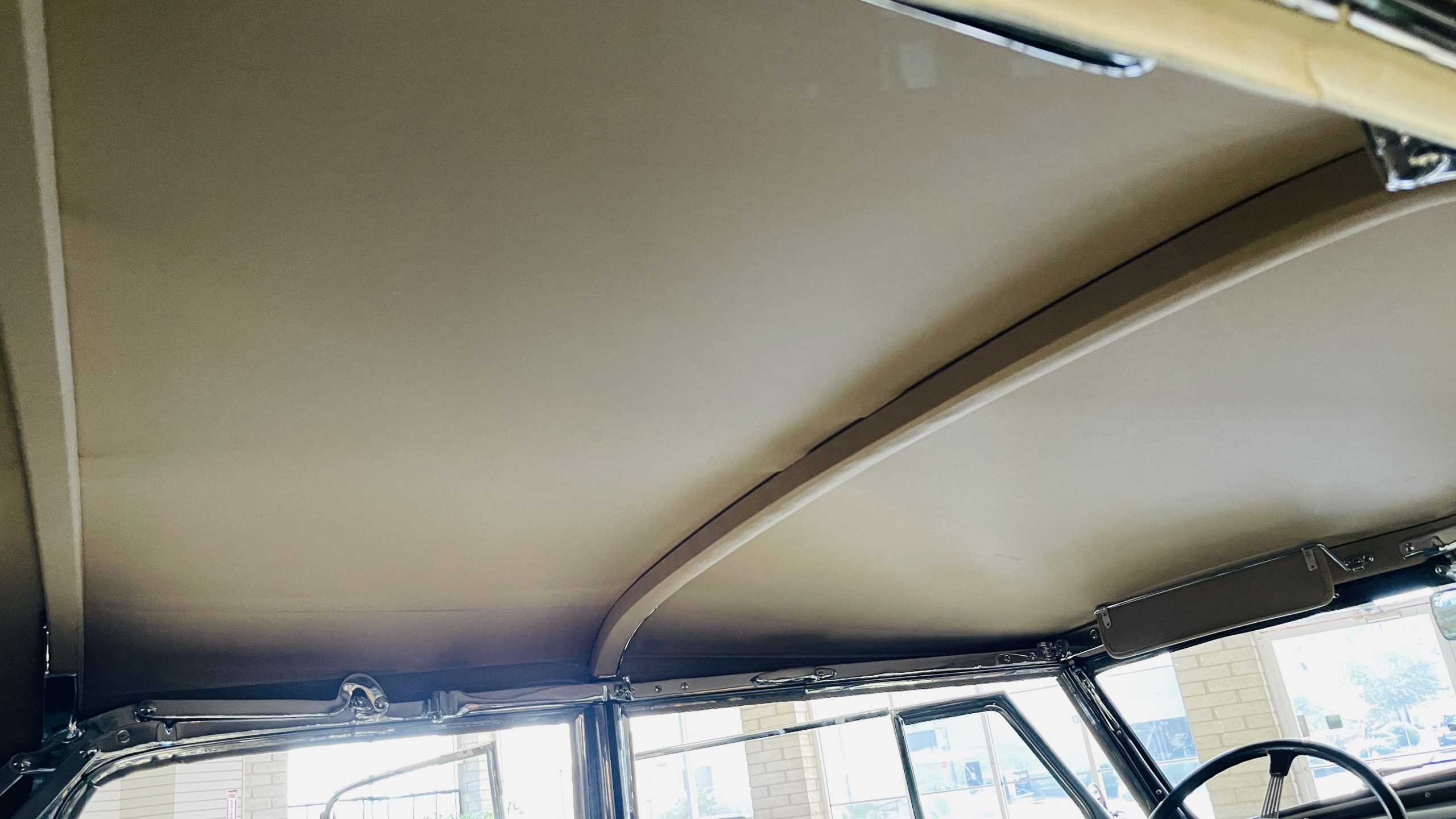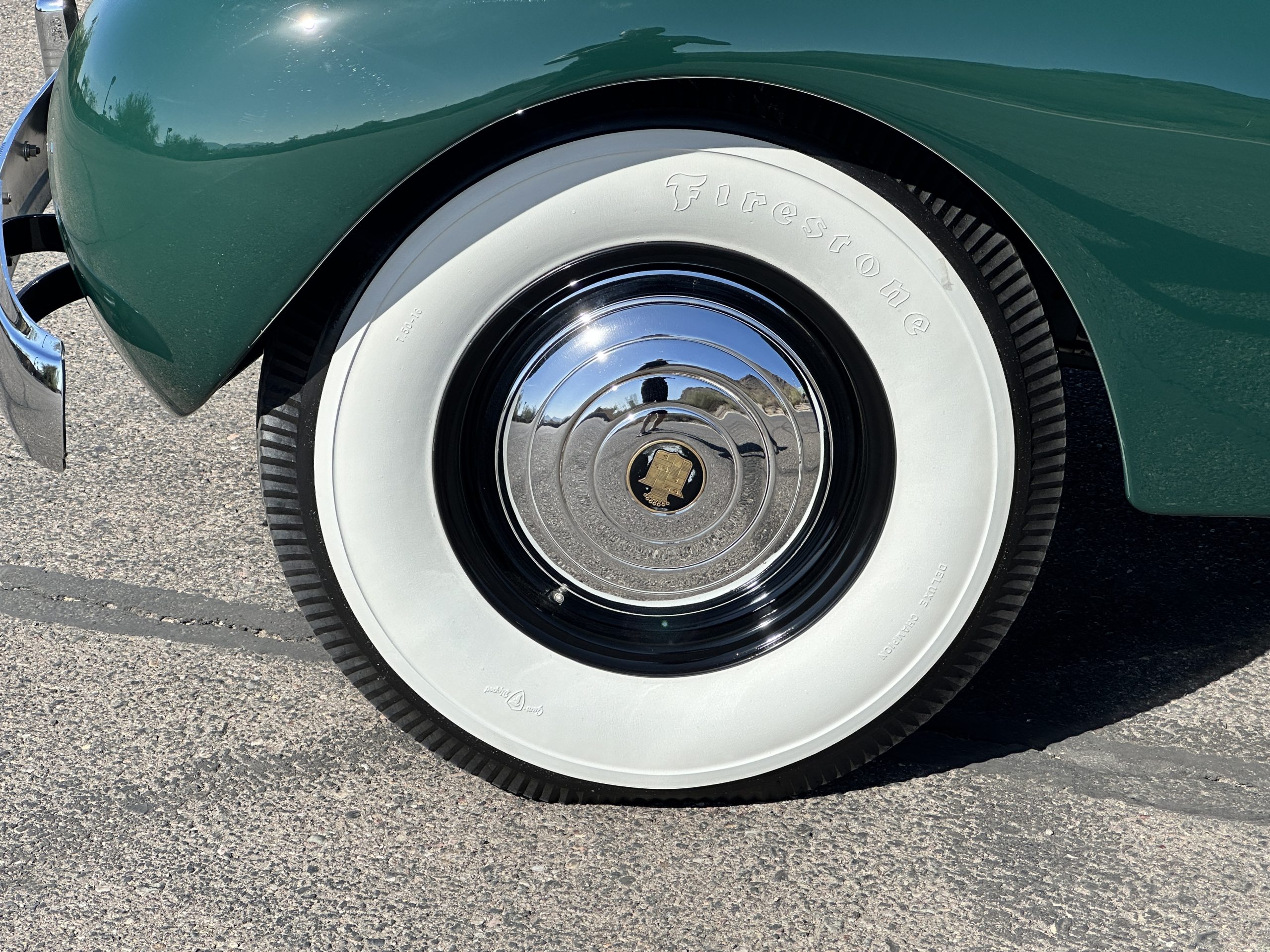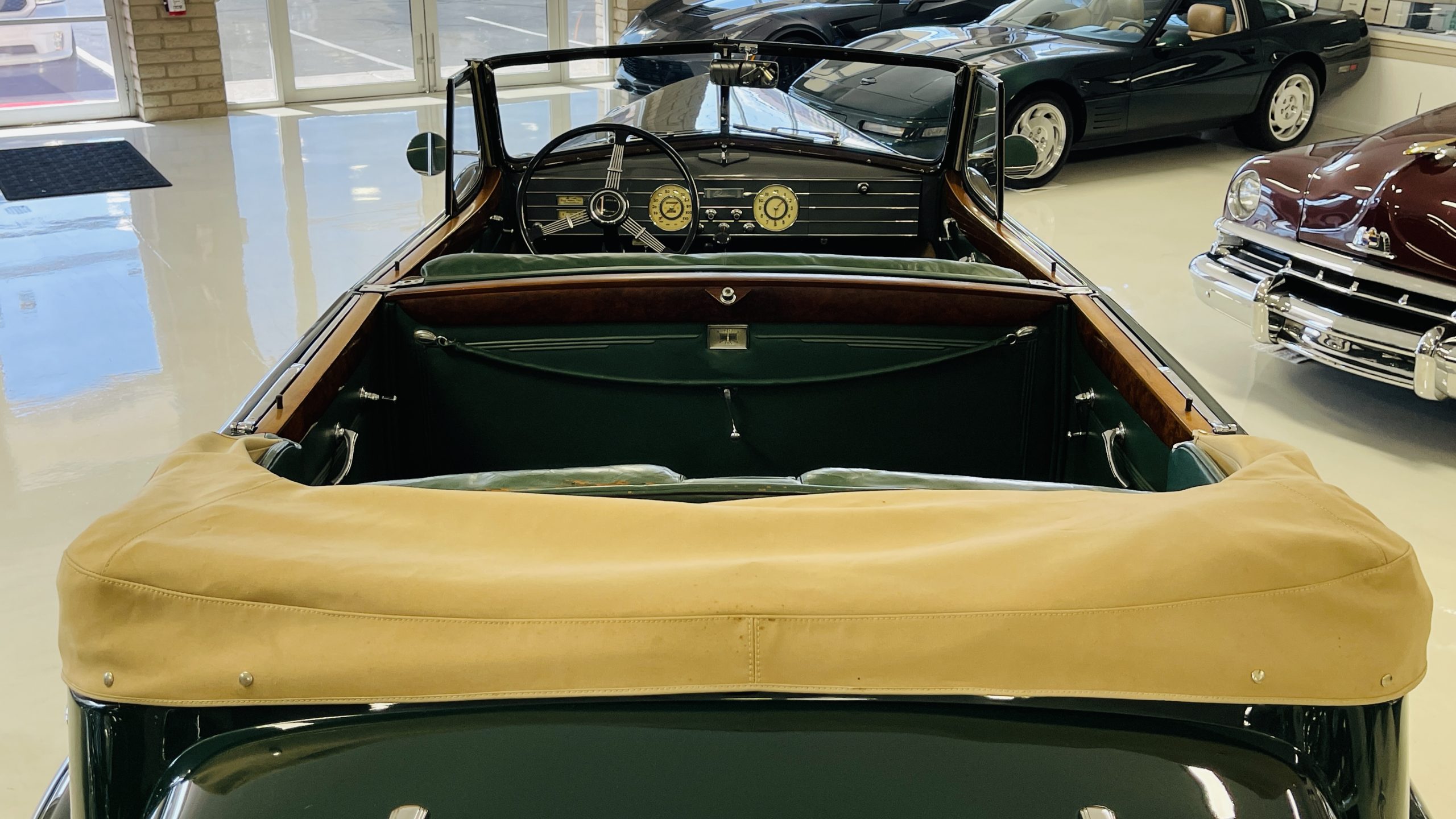 The exterior of this Cadillac was refinished in its original Thessalon Green livery in 2011 and still appears showroom new. The chrome and brightwork are in excellent condition with only a few minor imperfections. The tan Haartz cloth convertible top was replaced three years ago along with the inner lining and a replating of the convertible top frame. It is still in concours condition today. The dual side mounts look great and give the Cadillac a more commanding presence. The chrome wheel covers are in fine shape and are wrapped with Firestone wide white wall bias ply tires. With the convertible top down, the Cadillac looks more like a sporty phaeton than a convertible sedan.