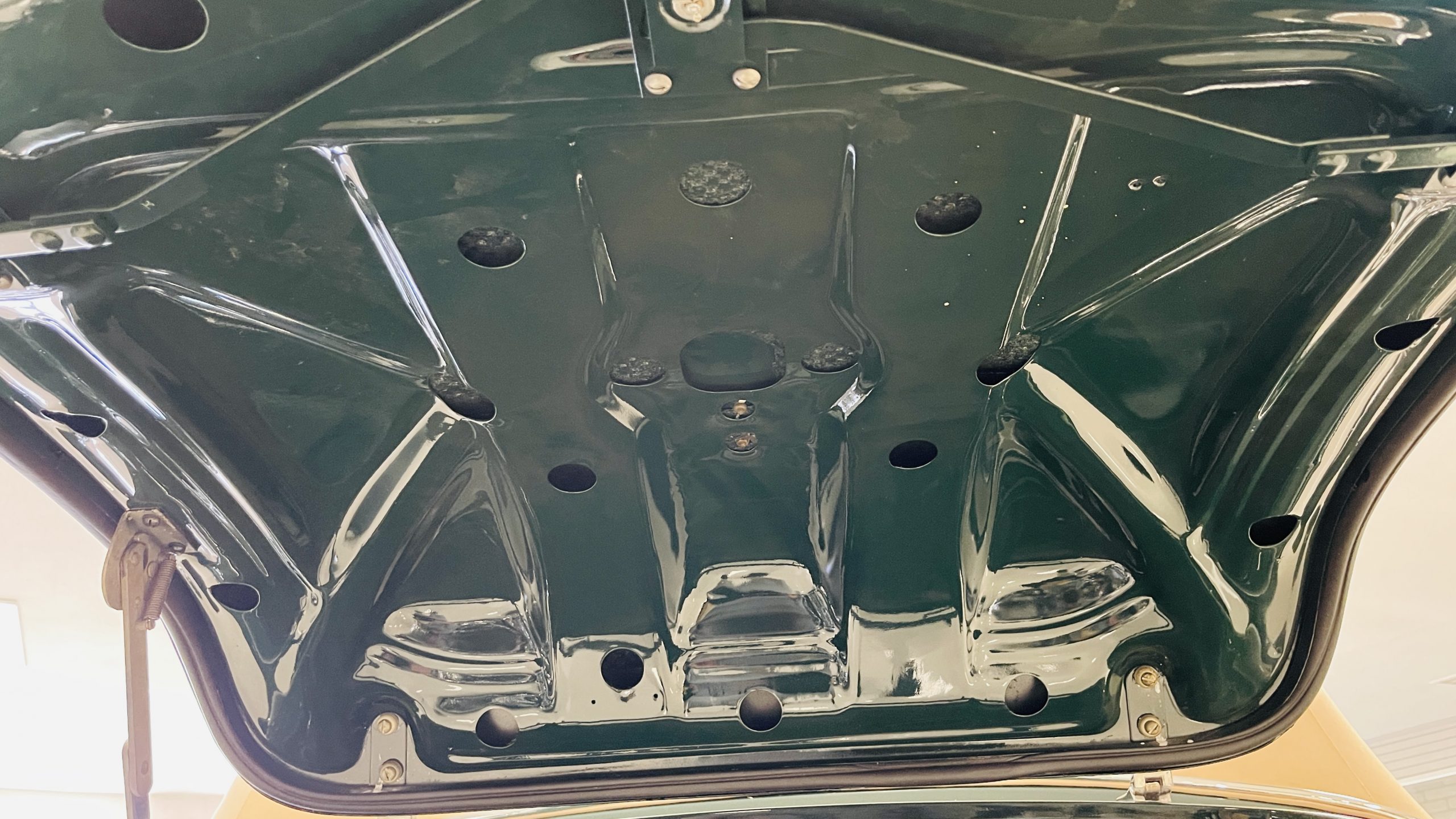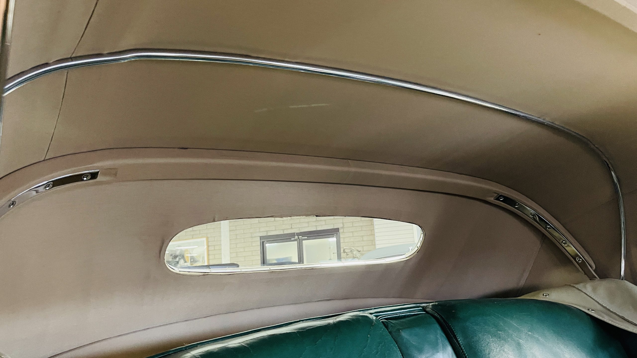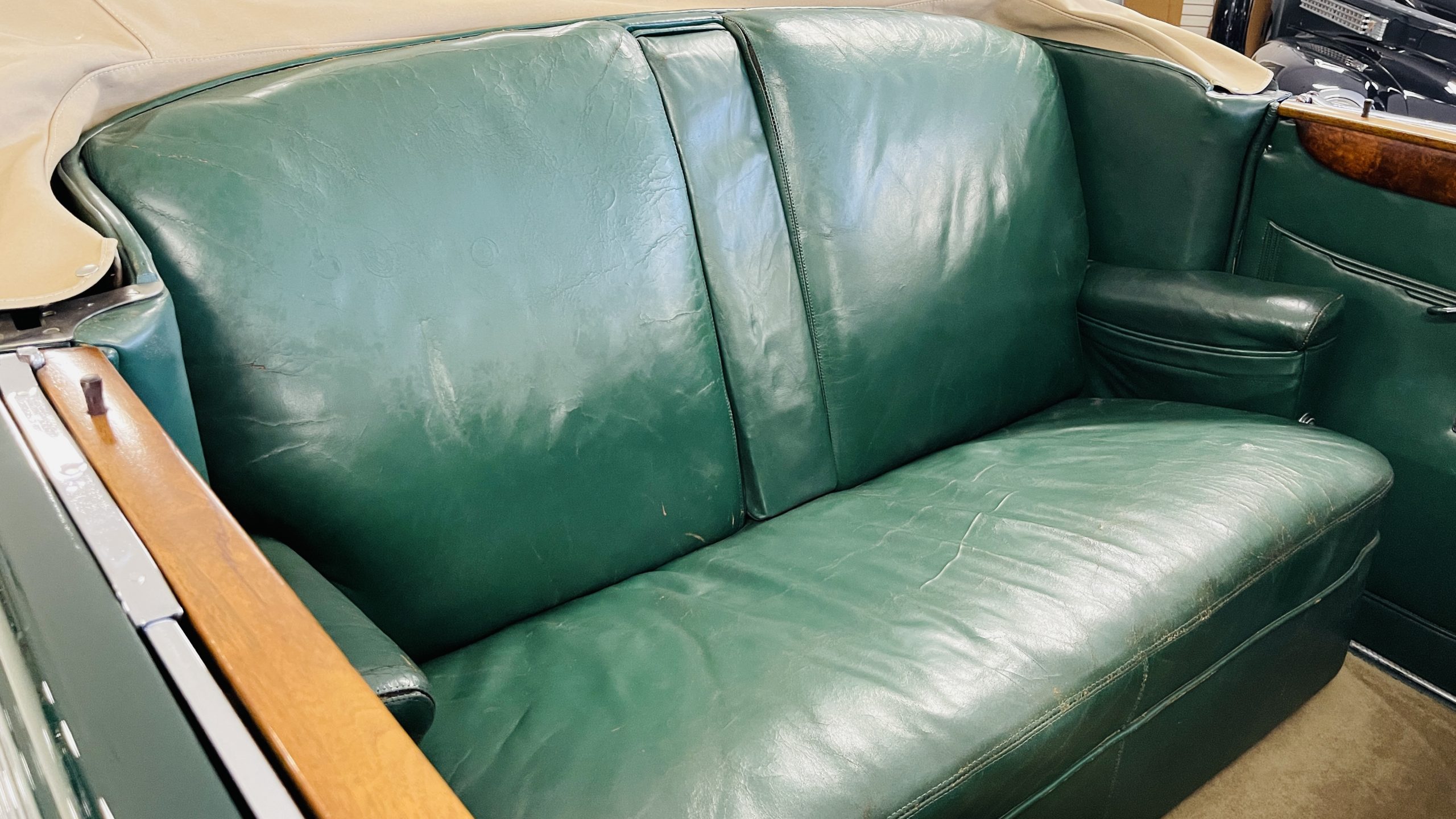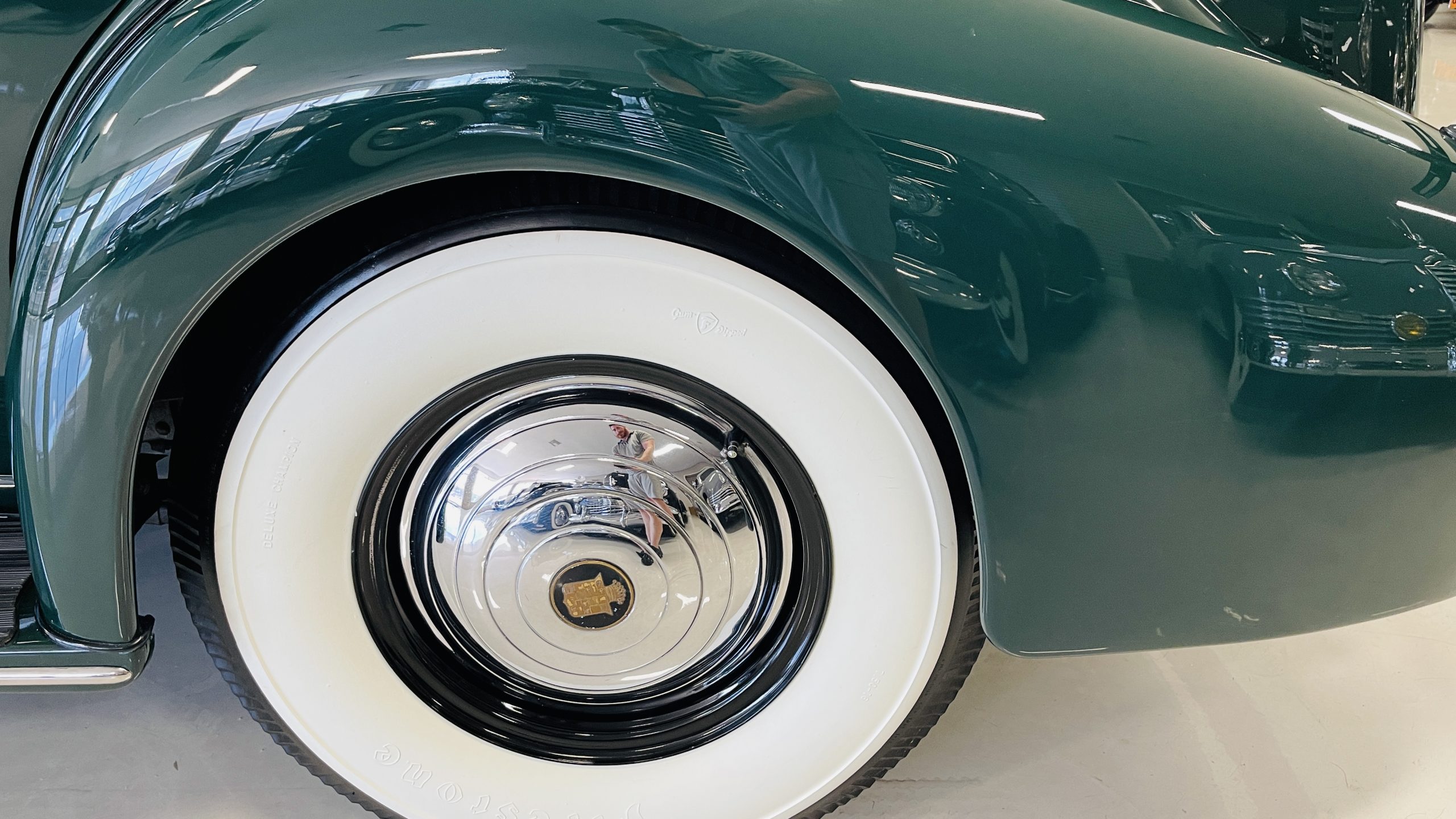 The exterior of this Cadillac was refinished in its original Thessalon Green livery in 2011 and still appears showroom new. The chrome and brightwork are in excellent condition with only a few minor imperfections. The tan Haartz cloth convertible top was replaced three years ago along with the inner lining and a replating of the convertible top frame. It is still in concours condition today. The dual side mounts look great and give the Cadillac a more commanding presence. The chrome wheel covers are in fine shape and are wrapped with Firestone wide white wall bias ply tires. With the convertible top down, the Cadillac looks more like a sporty phaeton than a convertible sedan.