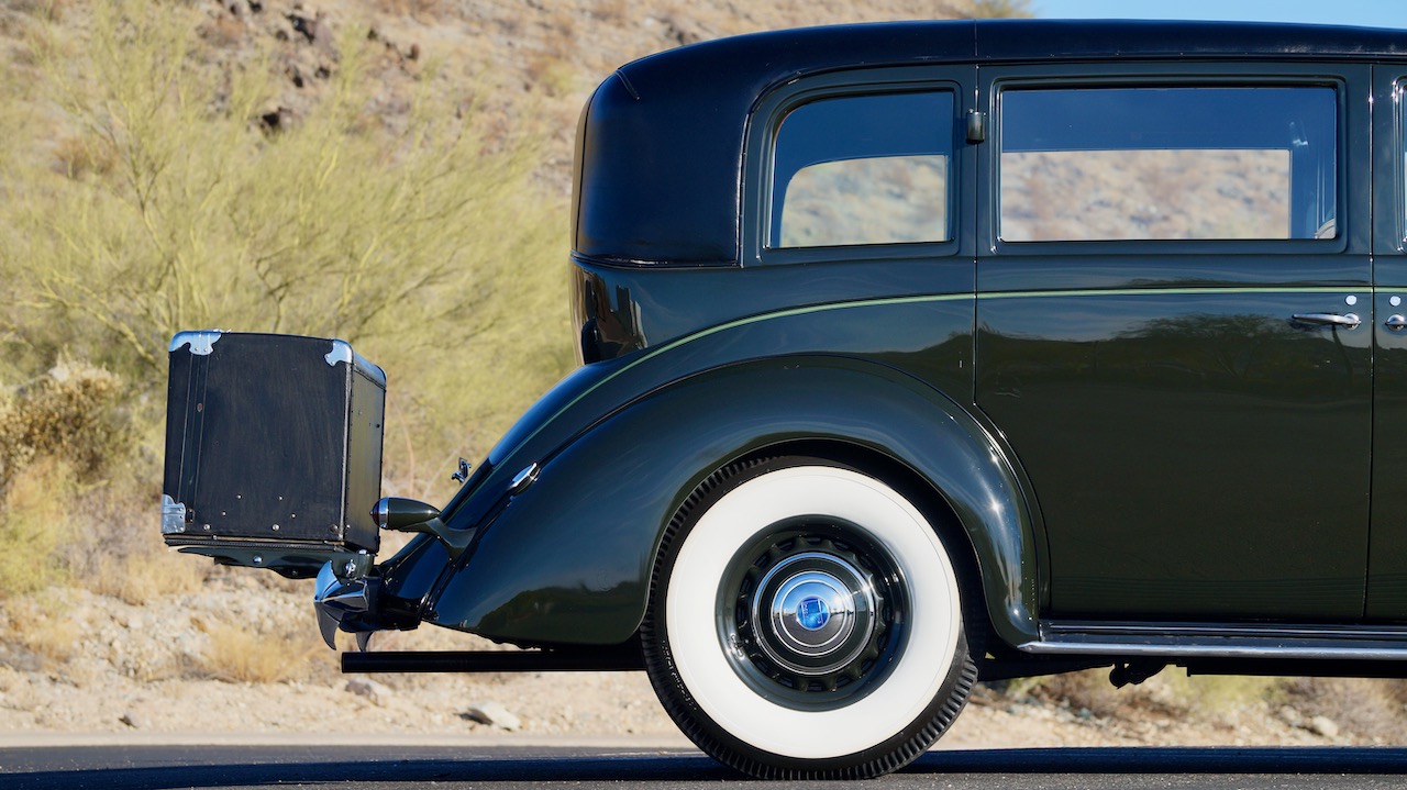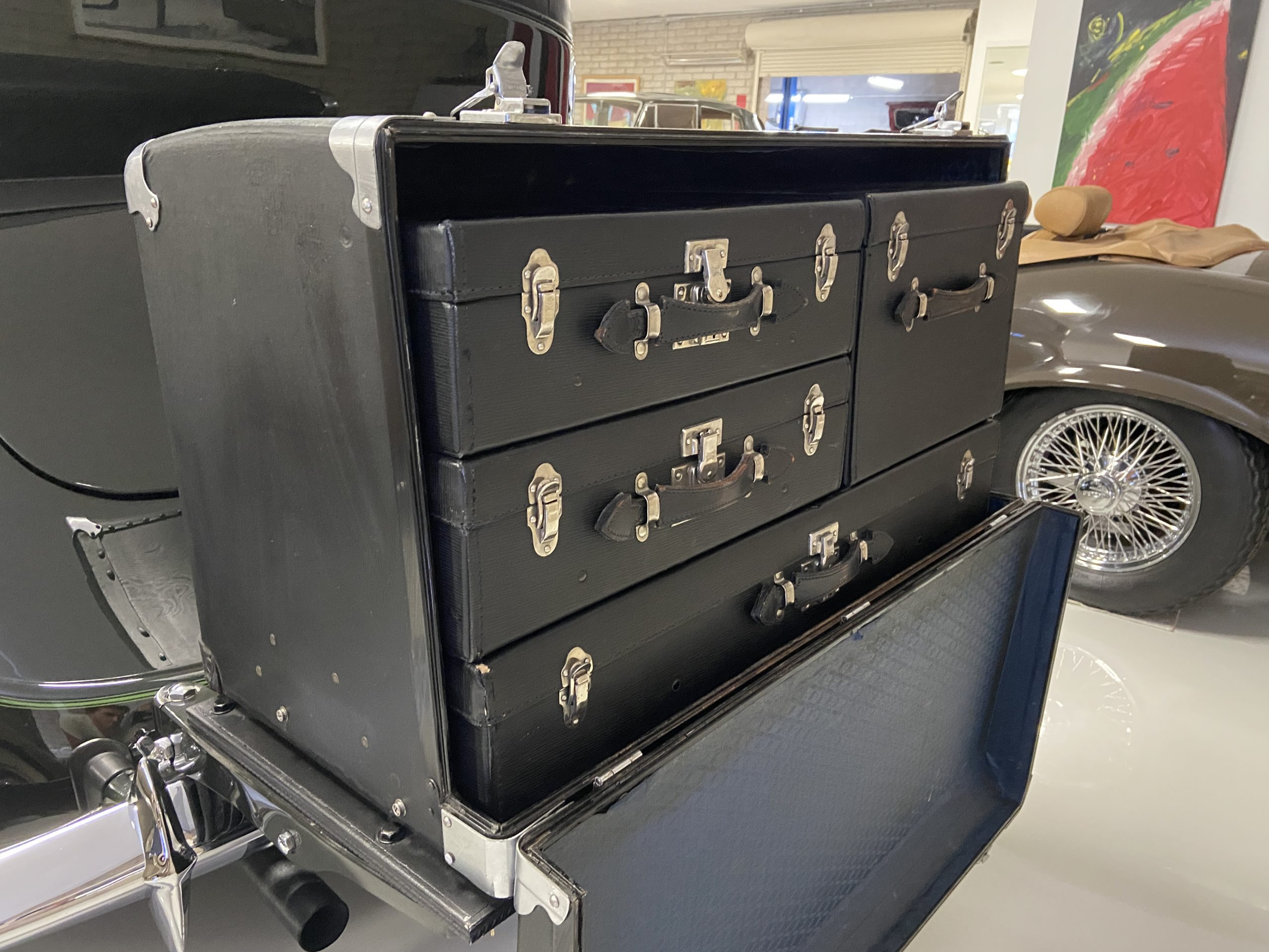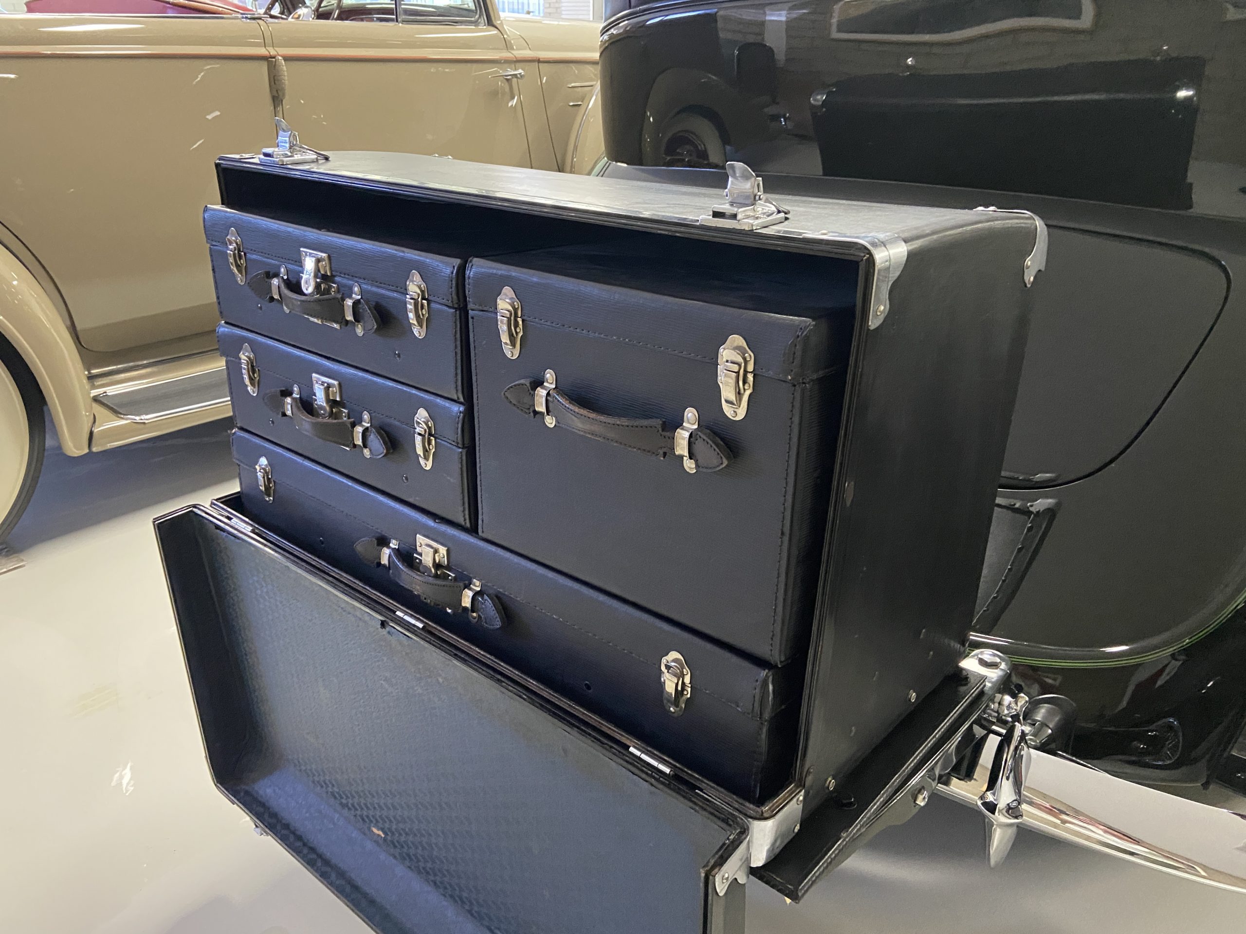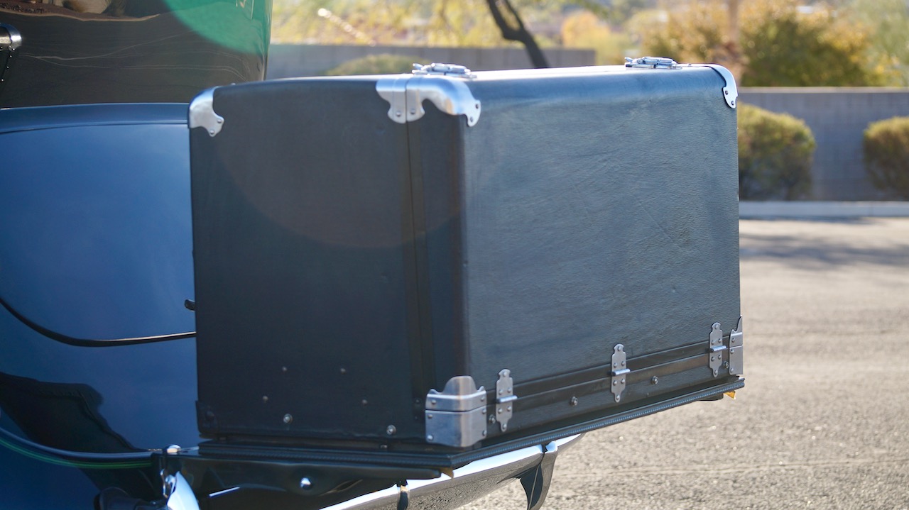 The Lincoln is accessorized with a correct black leather luggage trunk with four fitted pieces of luggage inside. This is all in beautiful show condition today.