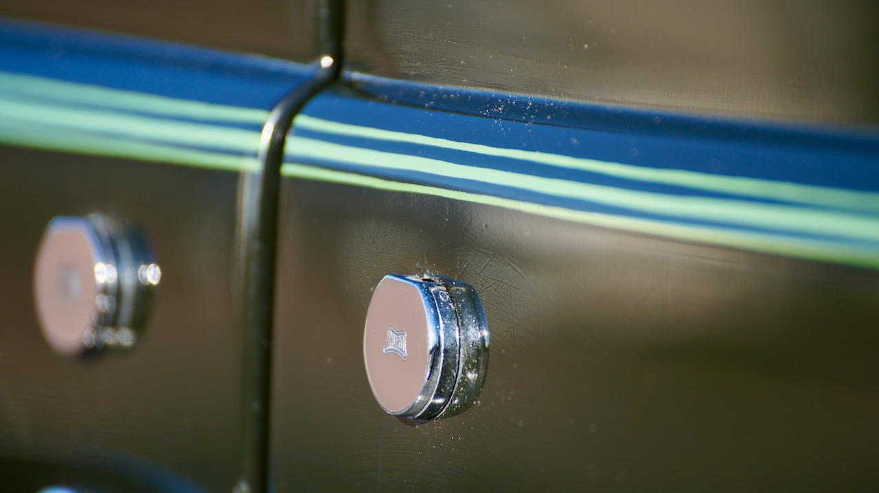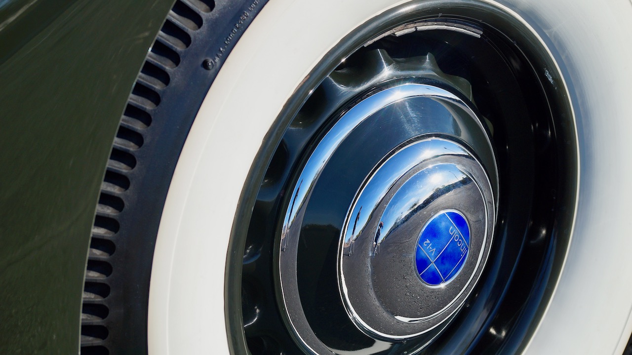 The livery is in very nice condition today, finished in Brewster Green complimented by triple light green coachstripes, beautiful chrome and a formal black padded top. There are a few areas of scratches around the engine compartment from normal use. These would be fairly simple to have repaired to help make the Lincoln more competitive for show once again. The chrome and stainless trim are in beautiful condition today. The dual side mounts have the correct covers and the cloisonné Lincoln V12 badges are beautiful in their blue enamel.