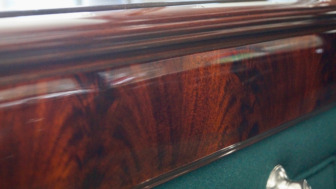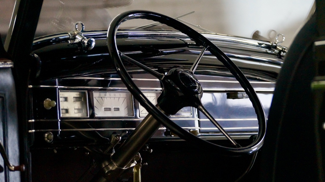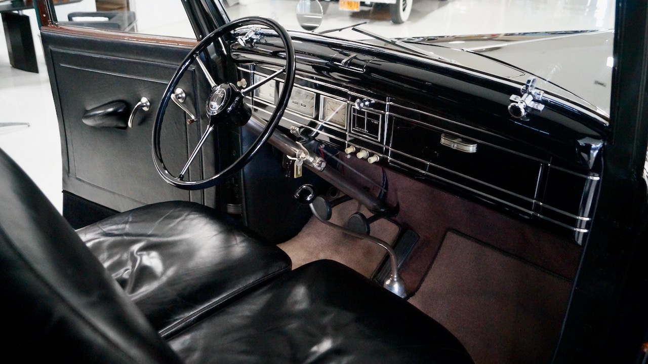 The interior has beautiful and correct black leather for the chauffeur’s compartment. The leather is soft and supple and shows minimal wear, commensurate with the 8,000 miles added since the restoration. The dashboard was fully restored and is well done with several light scratches near the top of the steering wheel where rings or nails hit the painted surface while touring.