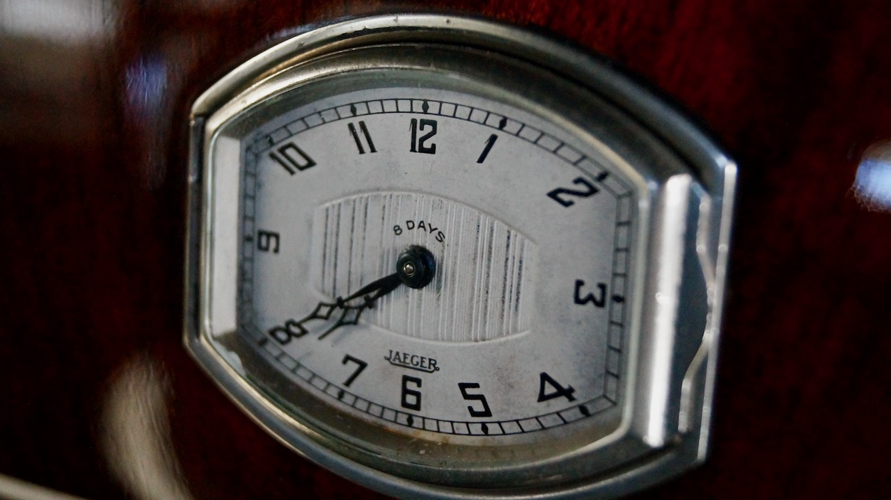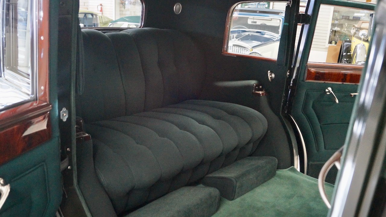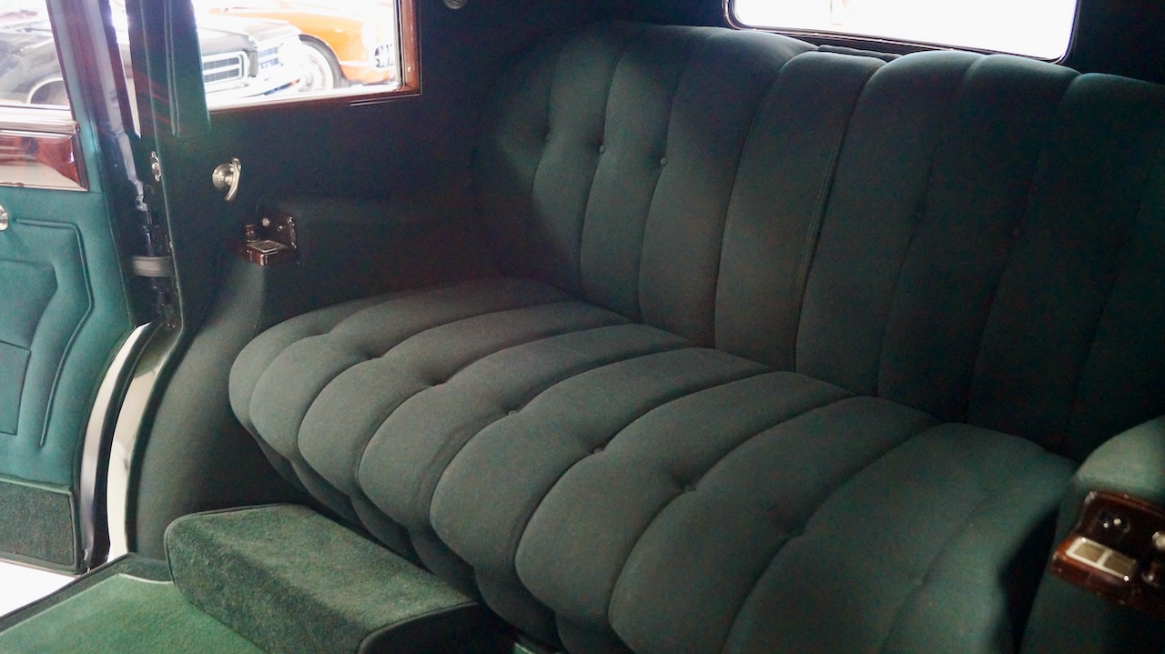 The rear passenger compartment is a beautiful dark green wool broadcloth with green wool carpeting. The wood is beautifully refinished and looks great today. The gold silk privacy shades are all functional and add to the sense of luxury and elegance. The two jump seats are completed in matching dark green wool broadcloth and are also in excellent condition. The elegant German silver door handles and window cranks are all in excellent condition and the delicate Jaeger clock is functioning and is mounted in the center of the divider wood panel. Mother of pearl buttons and tigers eye cigar lighters finish the accessories.