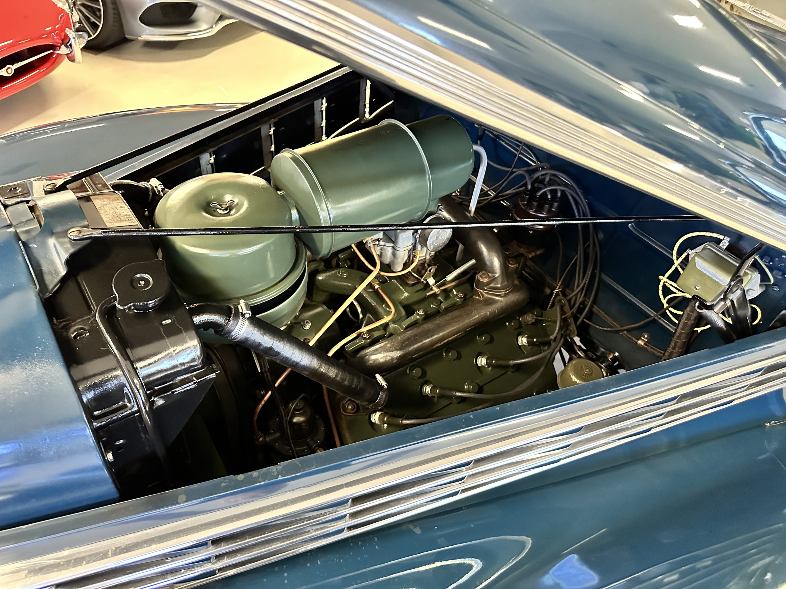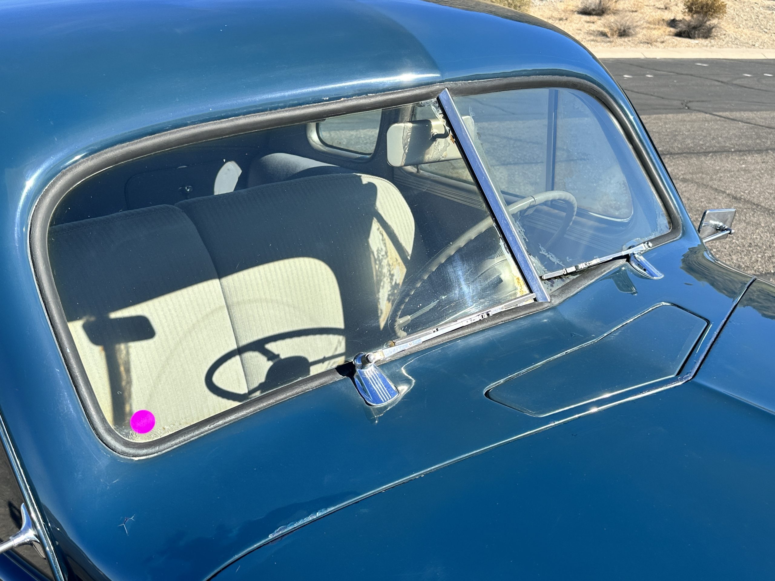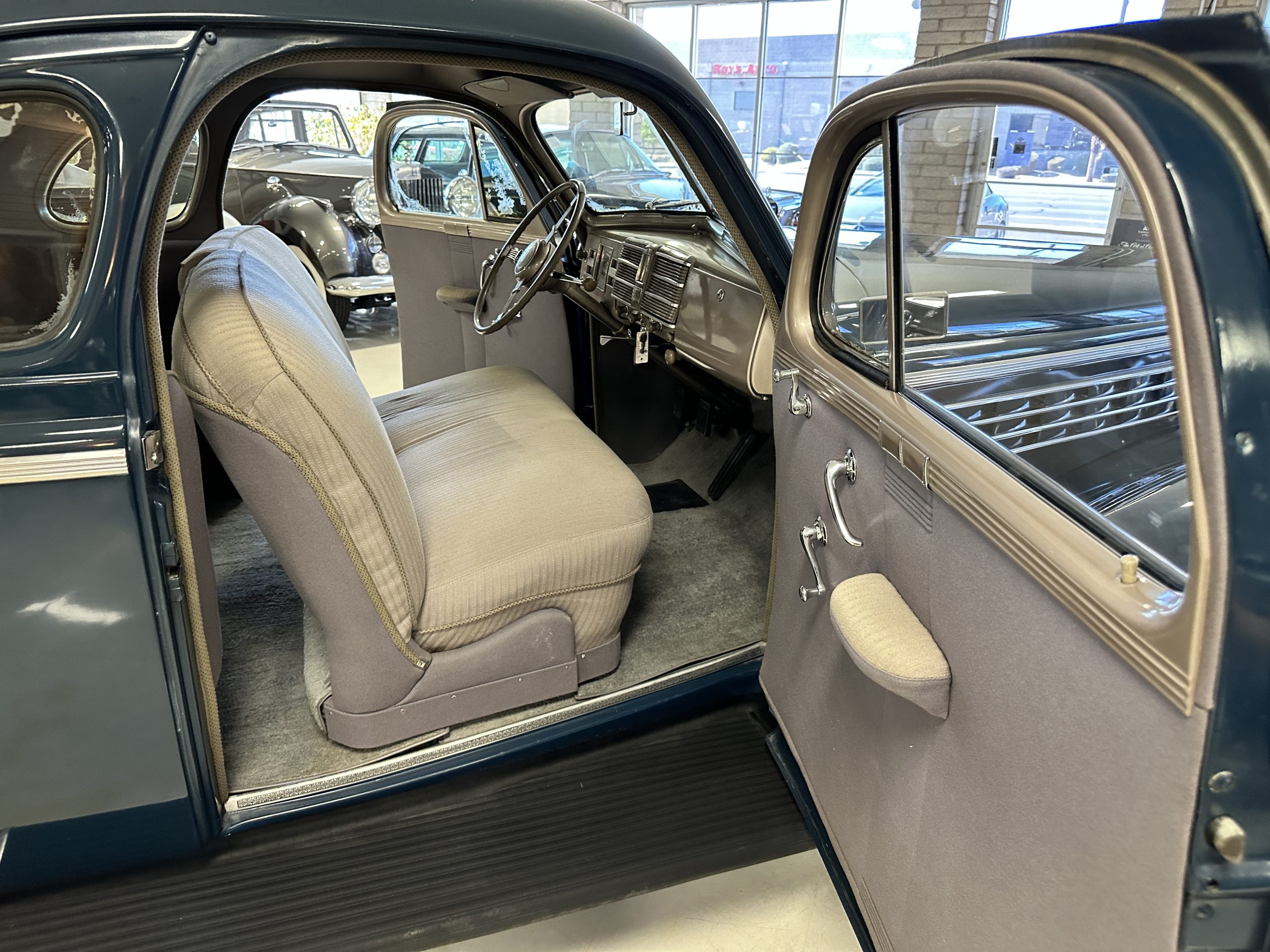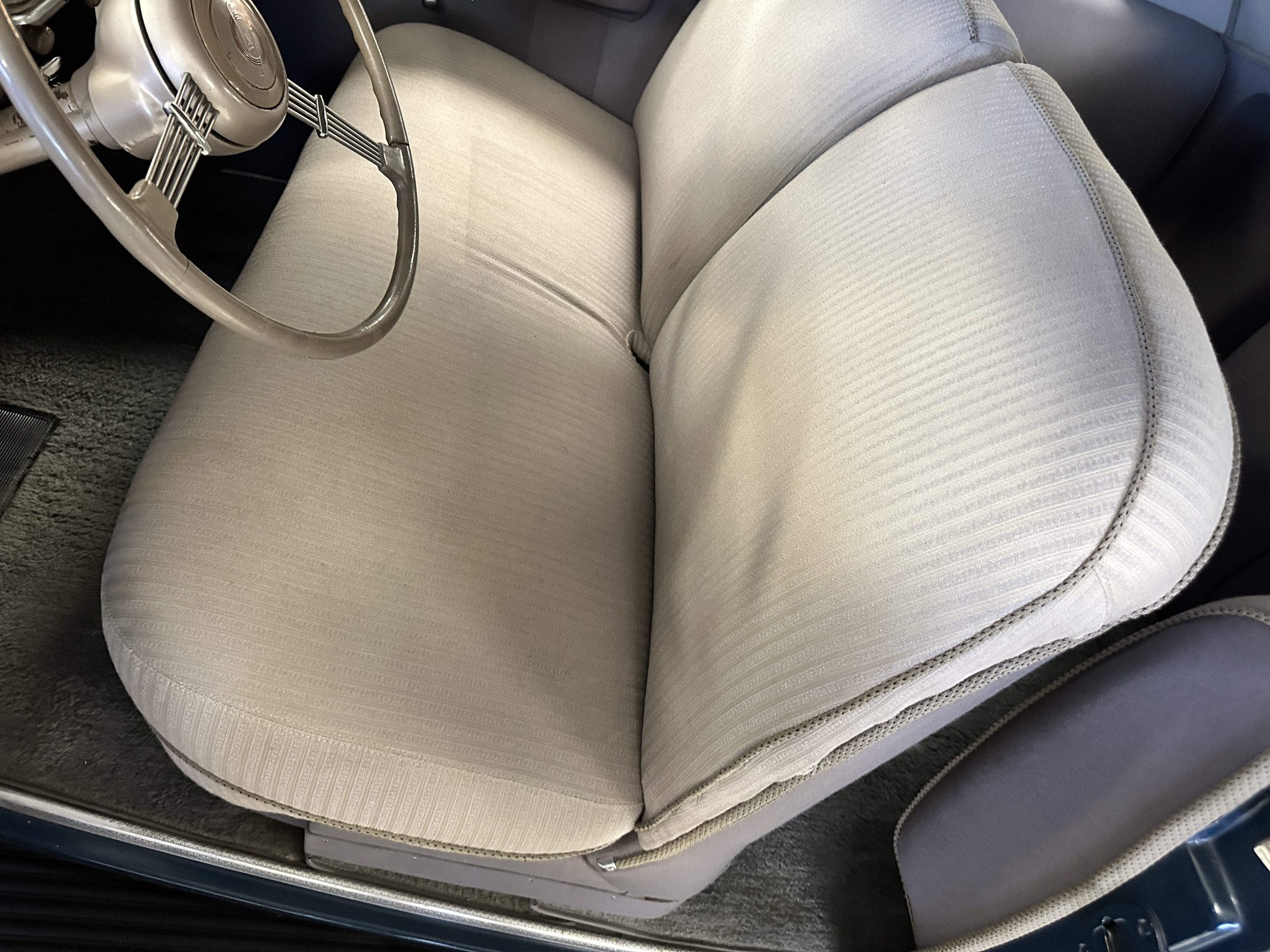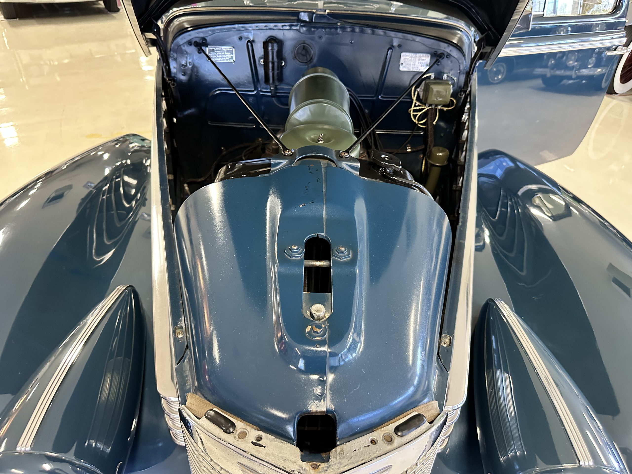 The livery is presented in Fairhaven Blue (Paint Code 11) and was repainted years ago in lacquer. There are areas of the paint where there is the normal lacquer cracking and a few small areas where the paint has peeled away. Most of the chrome is original and has light pitting. The bumpers and door handles have been re-chromed and look nice. We love the long front end devoid of side mounted tires. This makes the front end appear much longer and gives it a very sexy profile. The split windshield also gives it a fast look. Overall, the exterior is in tour quality condition enabling it to be shown at local car shows.