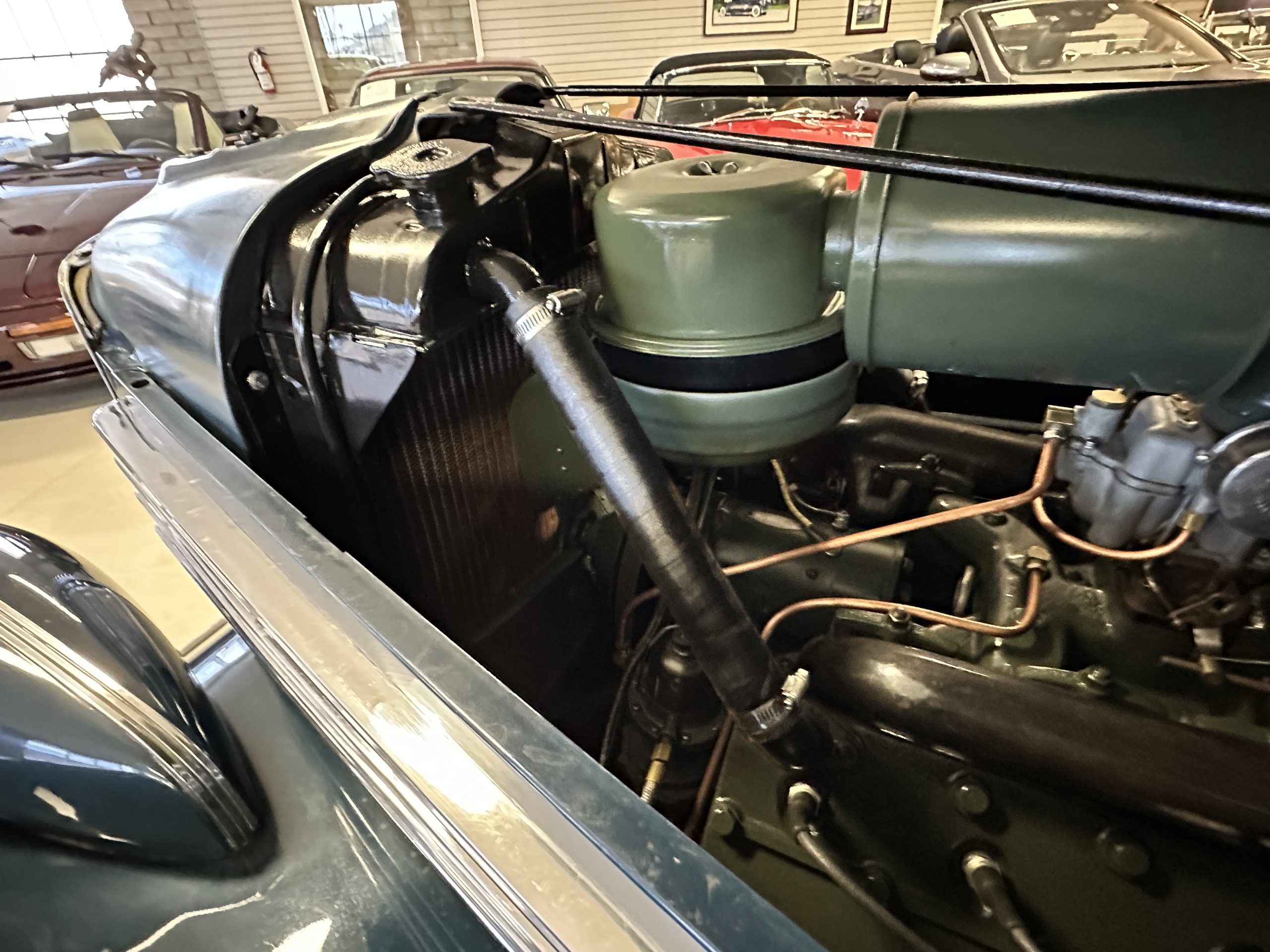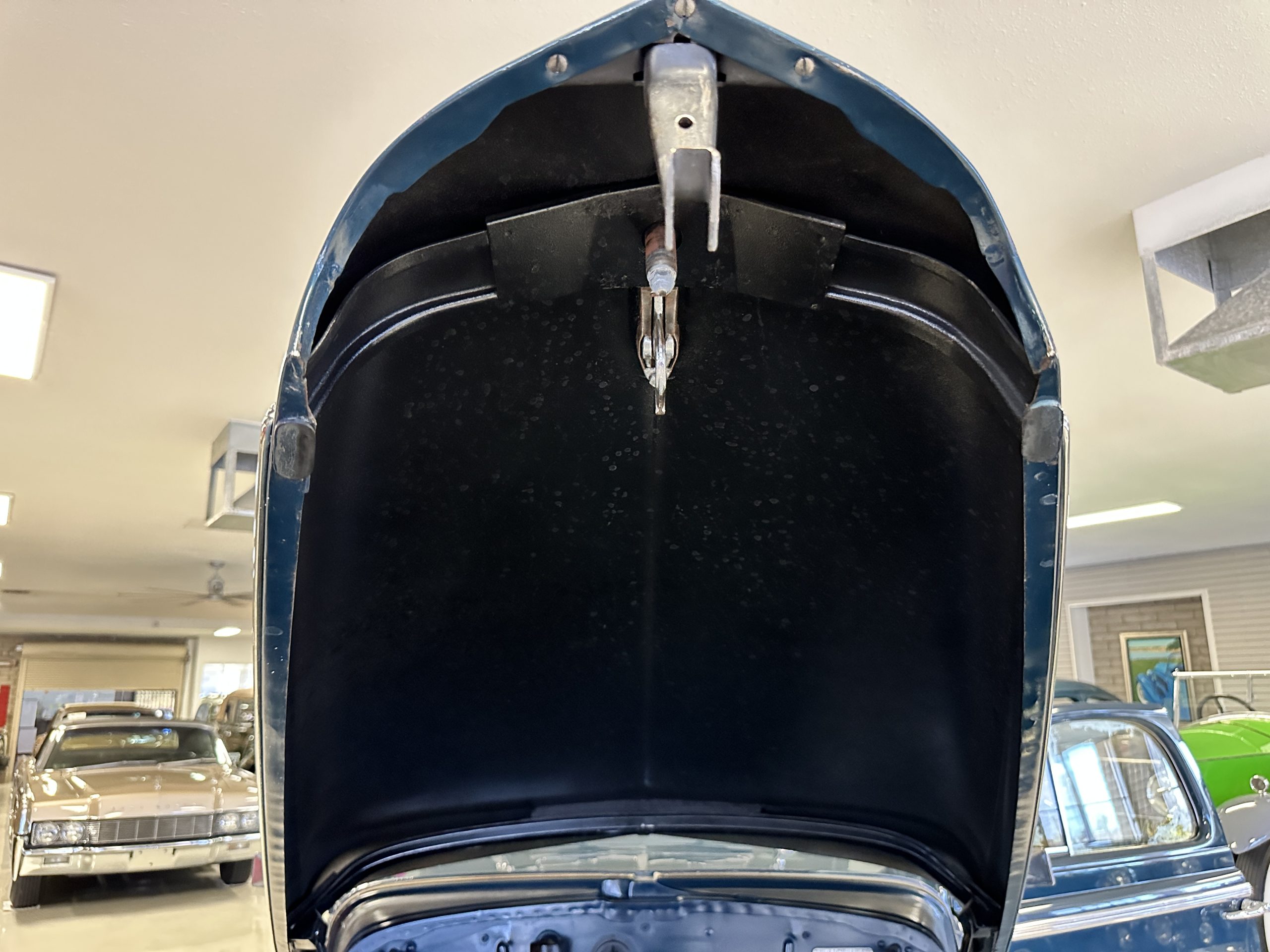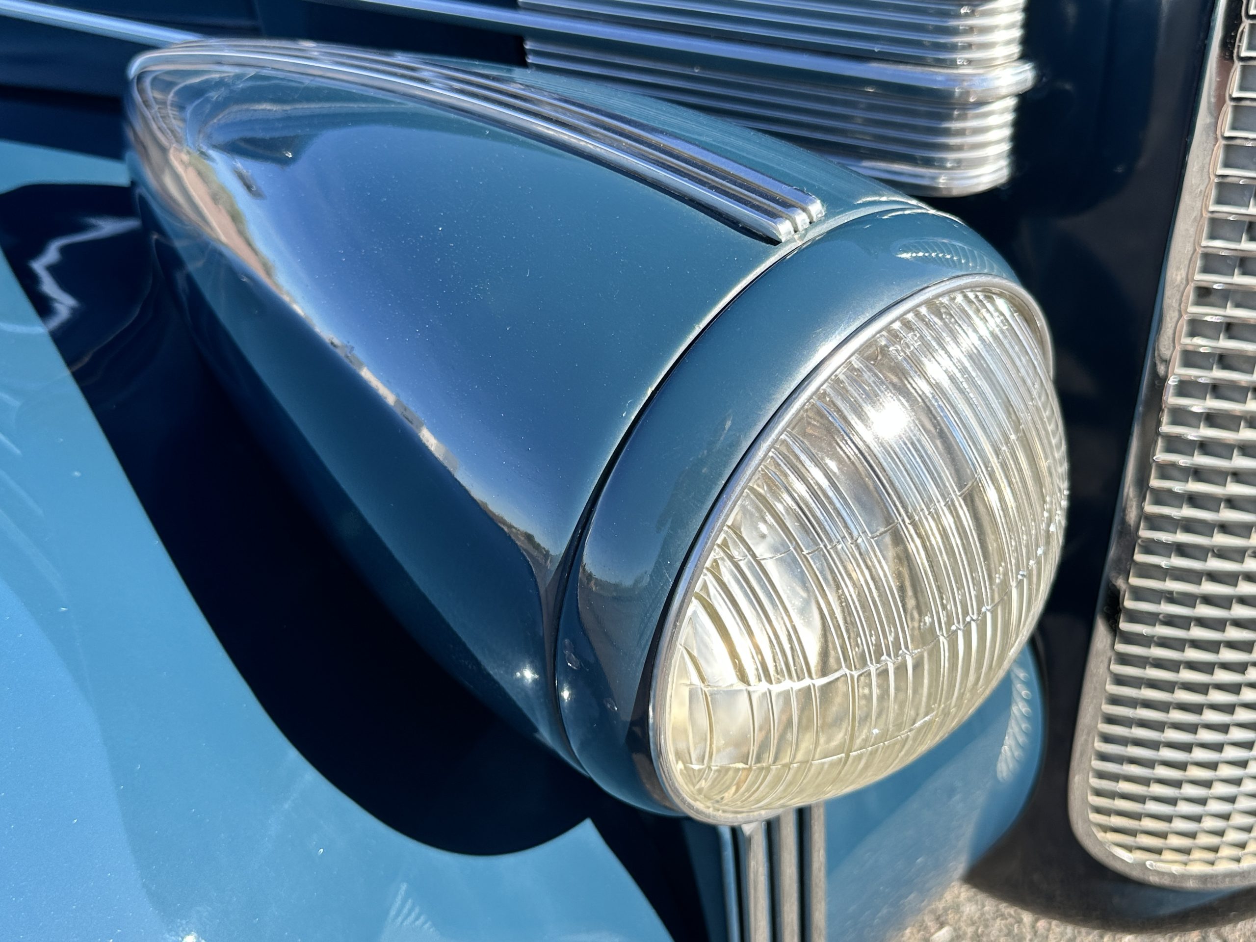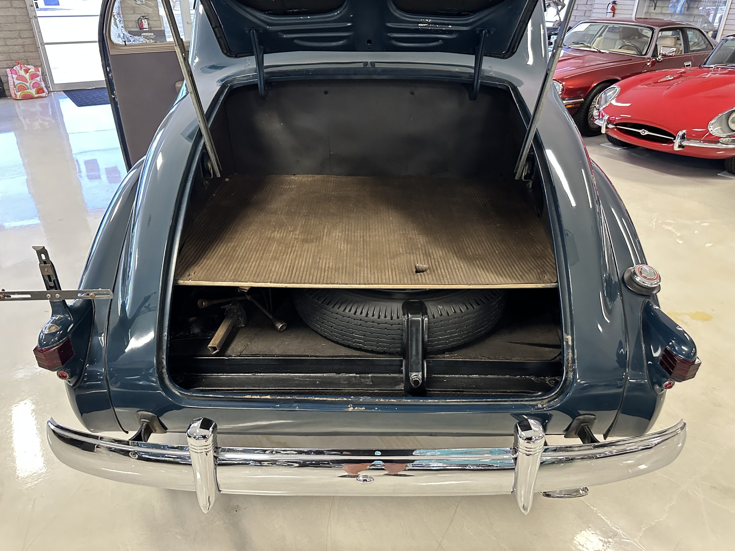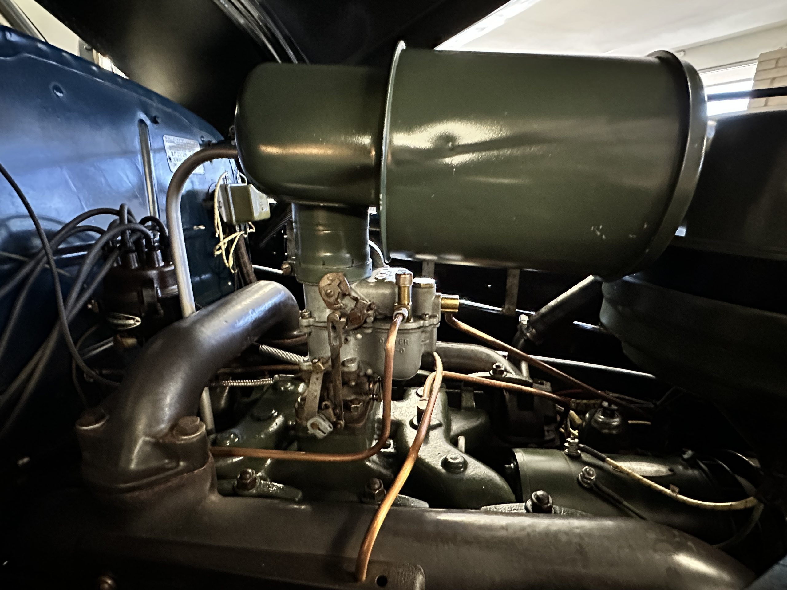The livery is presented in Fairhaven Blue (Paint Code 11) and was repainted years ago in lacquer. There are areas of the paint where there is the normal lacquer cracking and a few small areas where the paint has peeled away. Most of the chrome is original and has light pitting. The bumpers and door handles have been re-chromed and look nice. We love the long front end devoid of side mounted tires. This makes the front end appear much longer and gives it a very sexy profile. The split windshield also gives it a fast look. Overall, the exterior is in tour quality condition enabling it to be shown at local car shows.