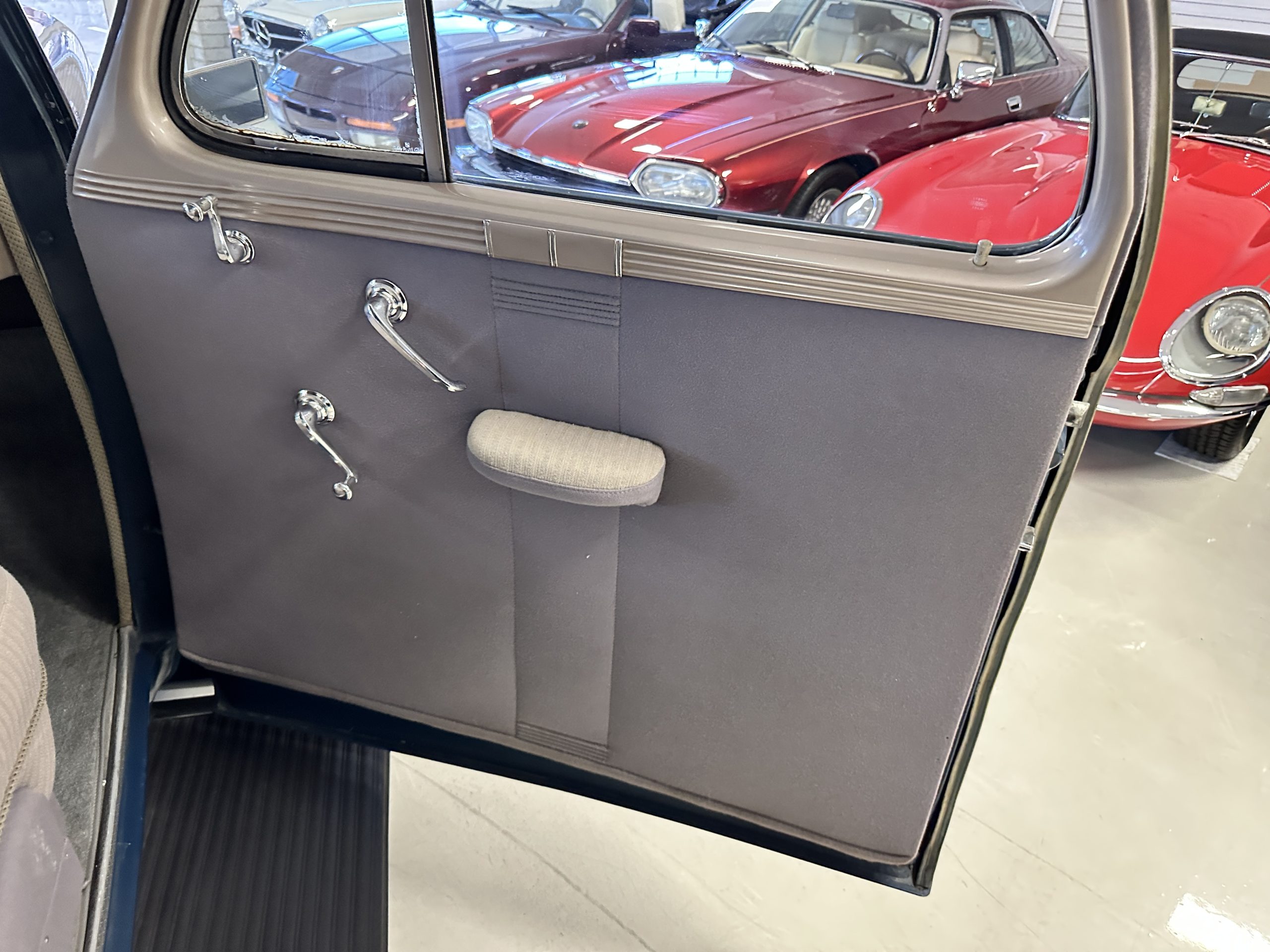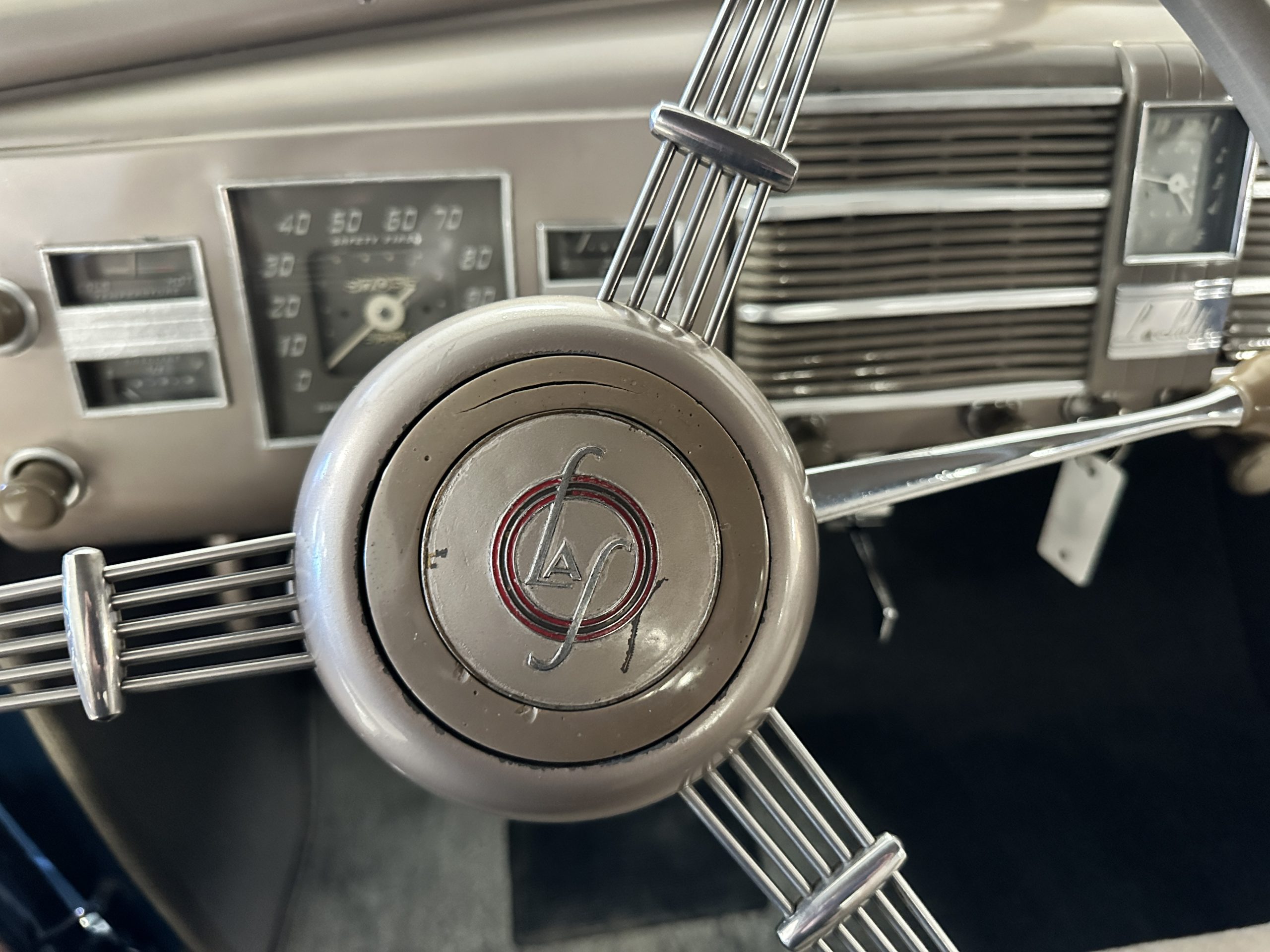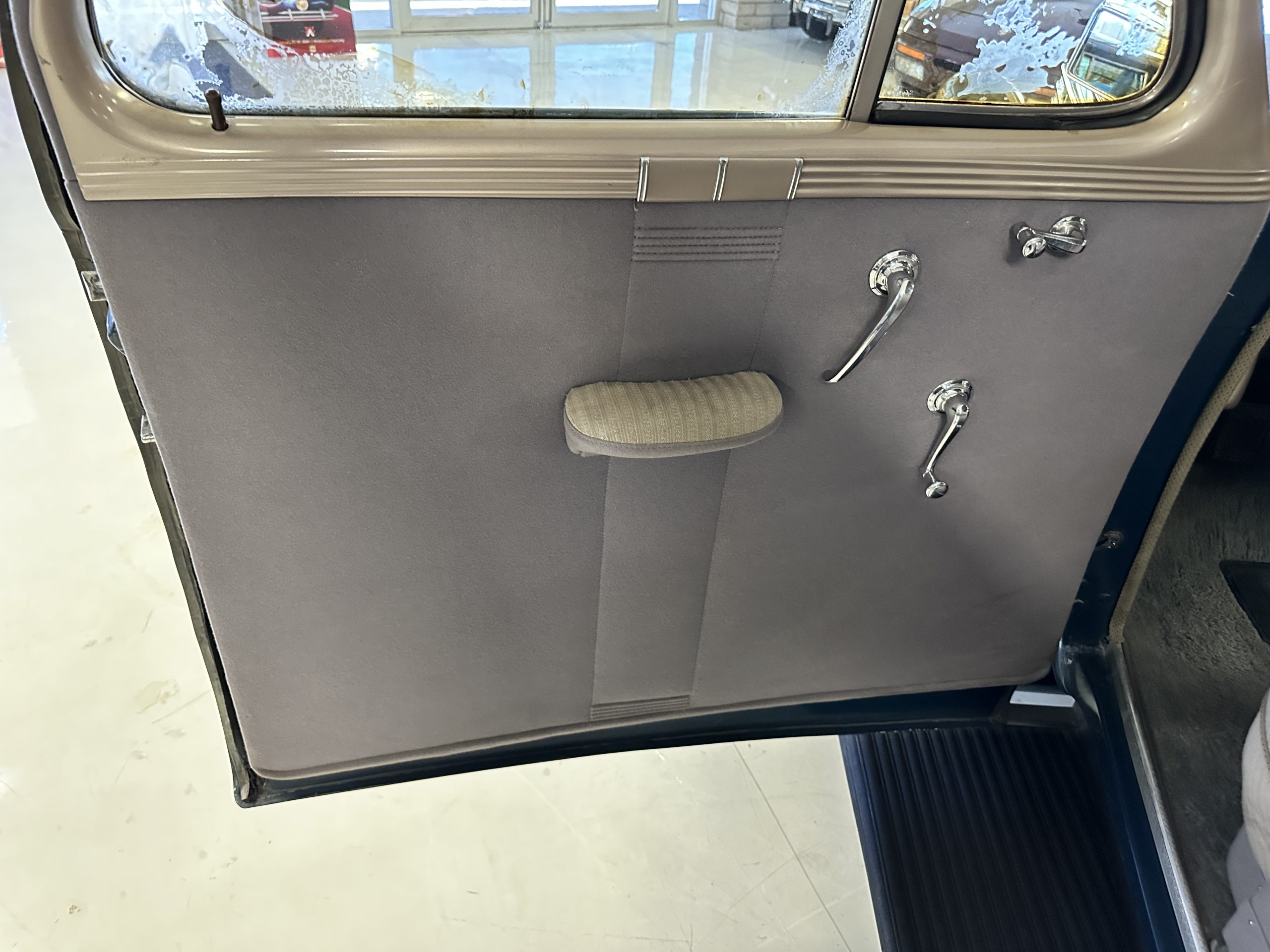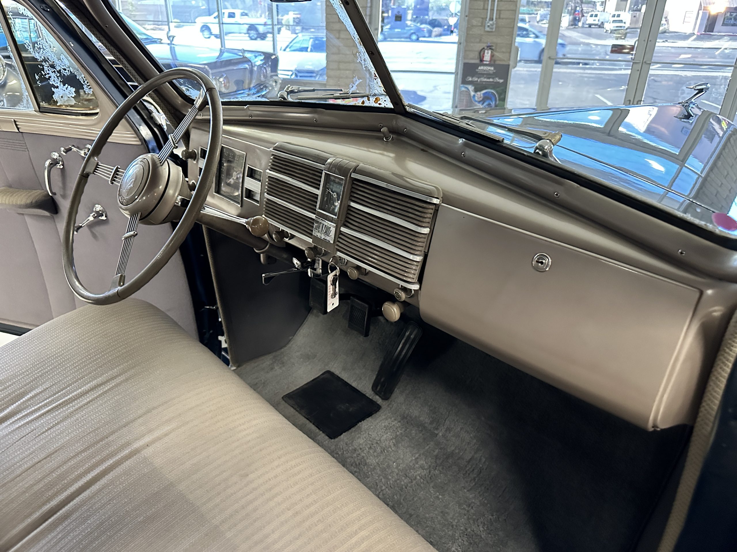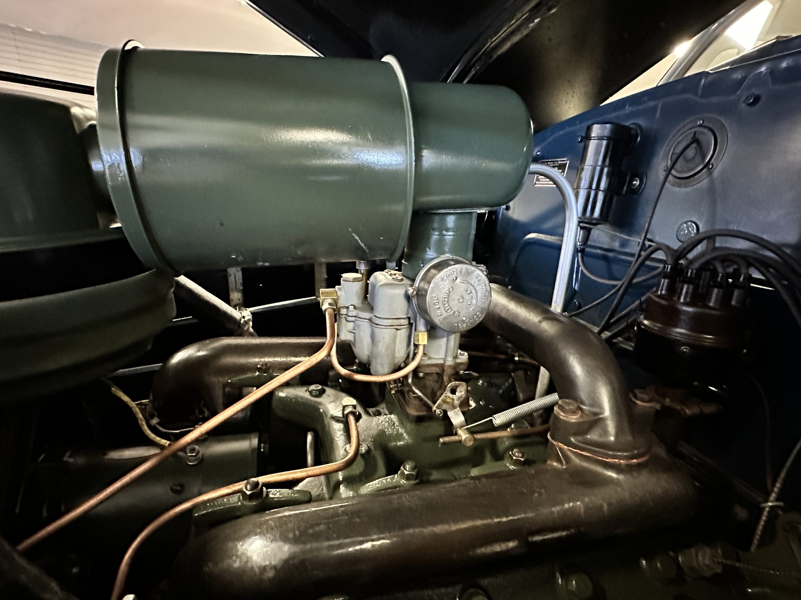 The livery is presented in Fairhaven Blue (Paint Code 11) and was repainted years ago in lacquer. There are areas of the paint where there is the normal lacquer cracking and a few small areas where the paint has peeled away. Most of the chrome is original and has light pitting. The bumpers and door handles have been re-chromed and look nice. We love the long front end devoid of side mounted tires. This makes the front end appear much longer and gives it a very sexy profile. The split windshield also gives it a fast look. Overall, the exterior is in tour quality condition enabling it to be shown at local car shows.